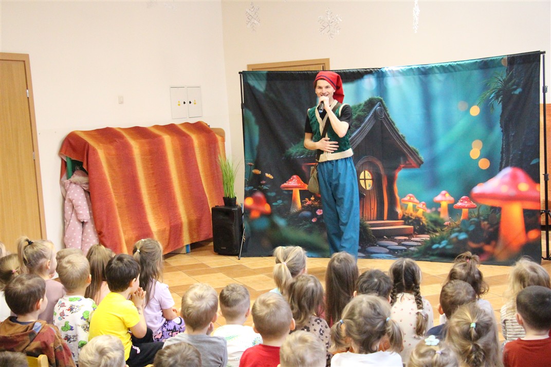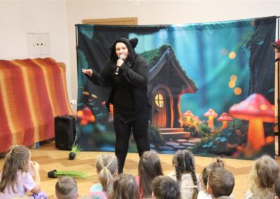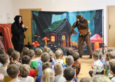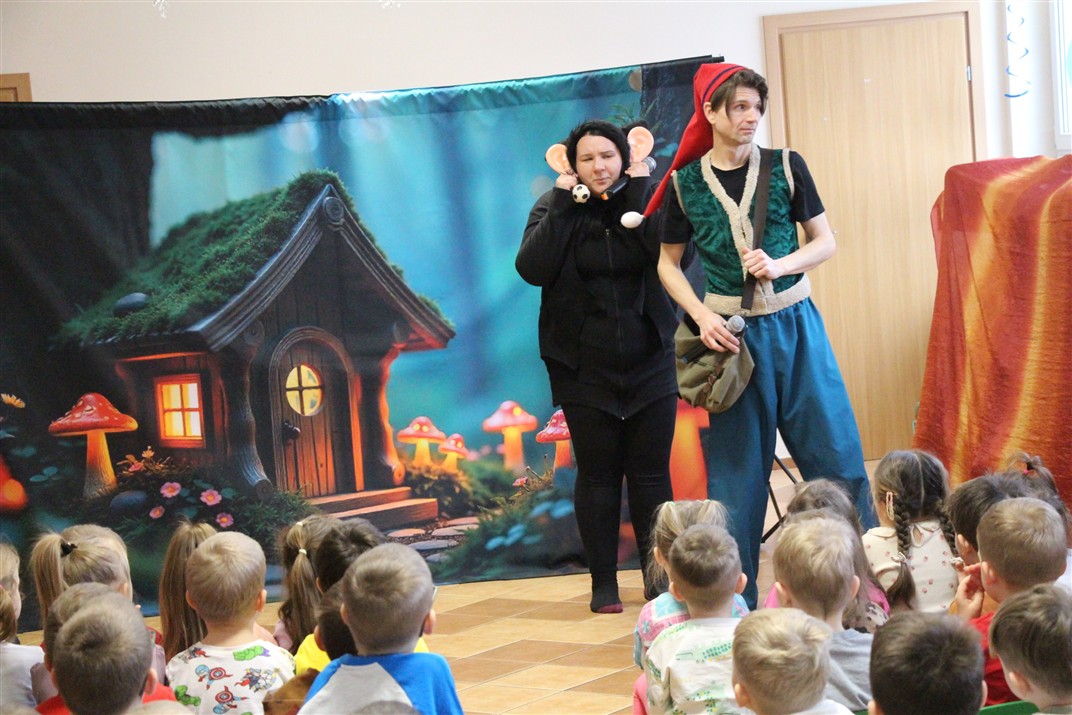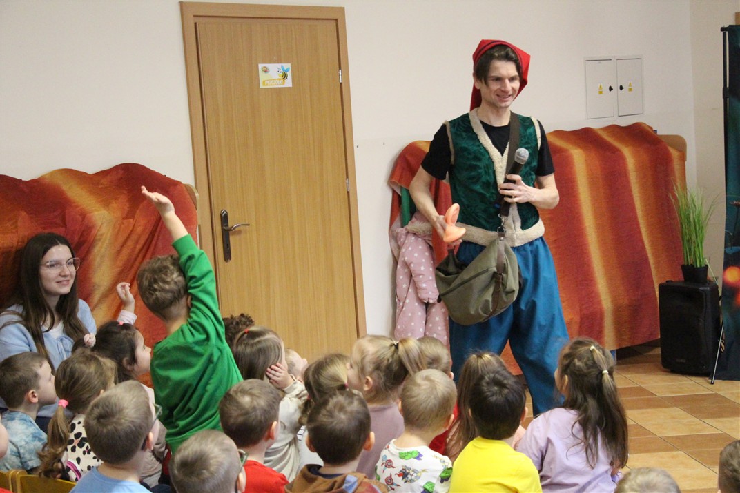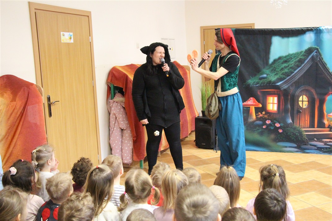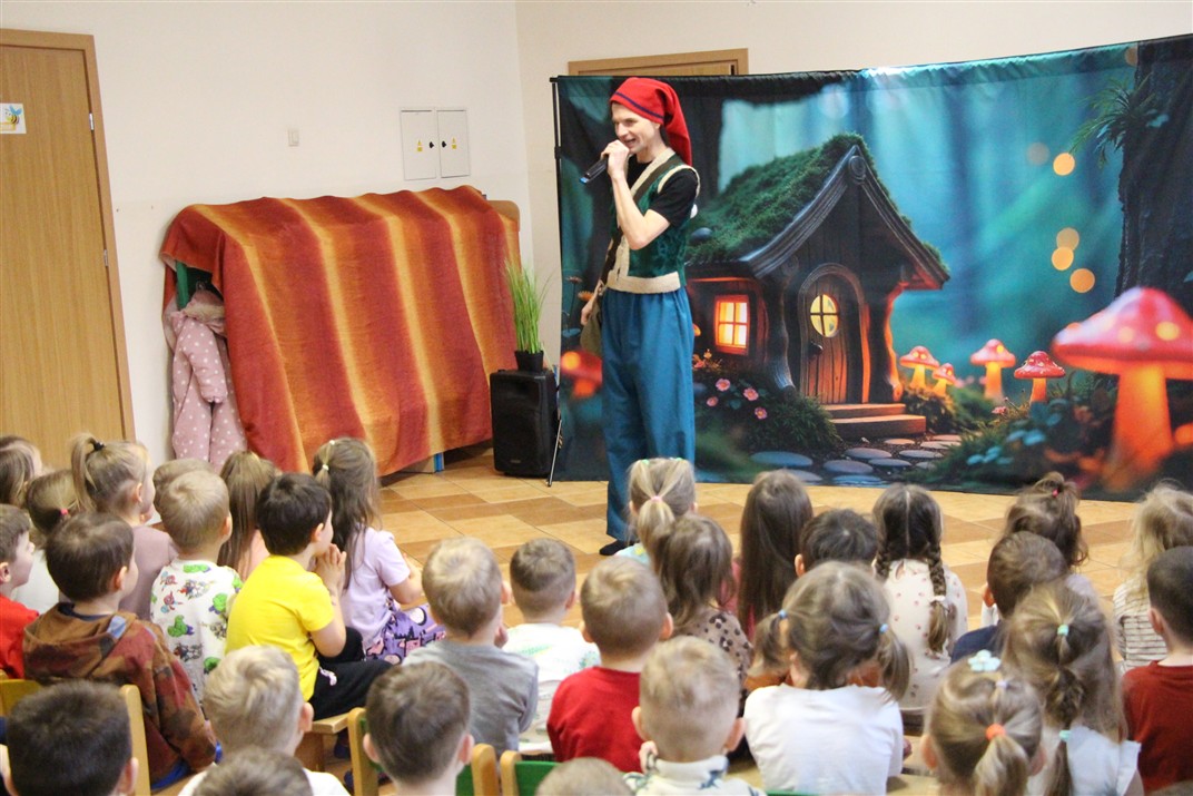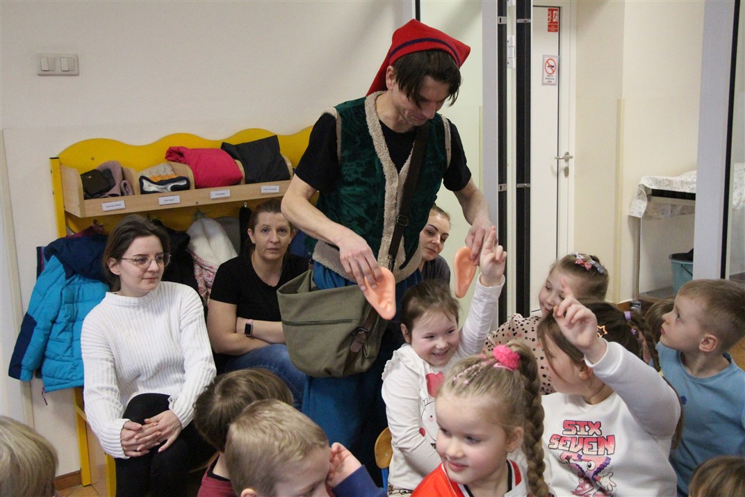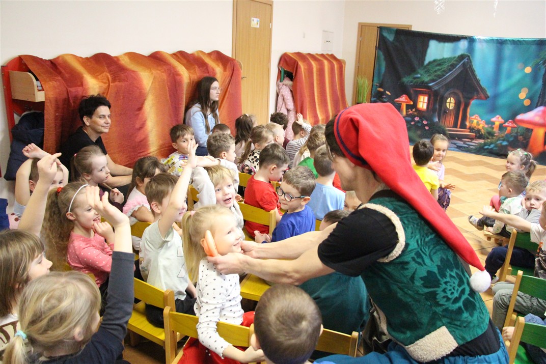 W piątek, 6 lutego nasze przedszkole odwiedziła Grupa T. z przedstawieniem pod tytułem „Co nam w uszach gra” Dzieci zostały zabrane do fantastycznego świata Krasnoludka Niezabudka i Nietoperzycy Topci, którzy dzięki magicznym uszom uczyli się słuchać nie tylko słów, ale także emocji. Spektakl w przystępny i pełen humoru sposób poruszał ważne tematy, takie jak rozpoznawanie i nazywanie emocji, radzenie sobie z trudnymi uczuciami, empatia oraz zdrowe odżywianie. Dużym zainteresowaniem najmłodszych cieszyła się również zabawna i energiczna Wróżka Zębuszka. Kolorowe stroje, piękne dekoracje, aktywny udział publiczności oraz wspólny taniec sprawiły, że dzieci z ogromnym zaangażowaniem śledziły przebieg przedstawienia. Była to nie tylko świetna zabawa, ale także wartościowa lekcja, która na długo pozostanie w pamięci naszych Smyków.