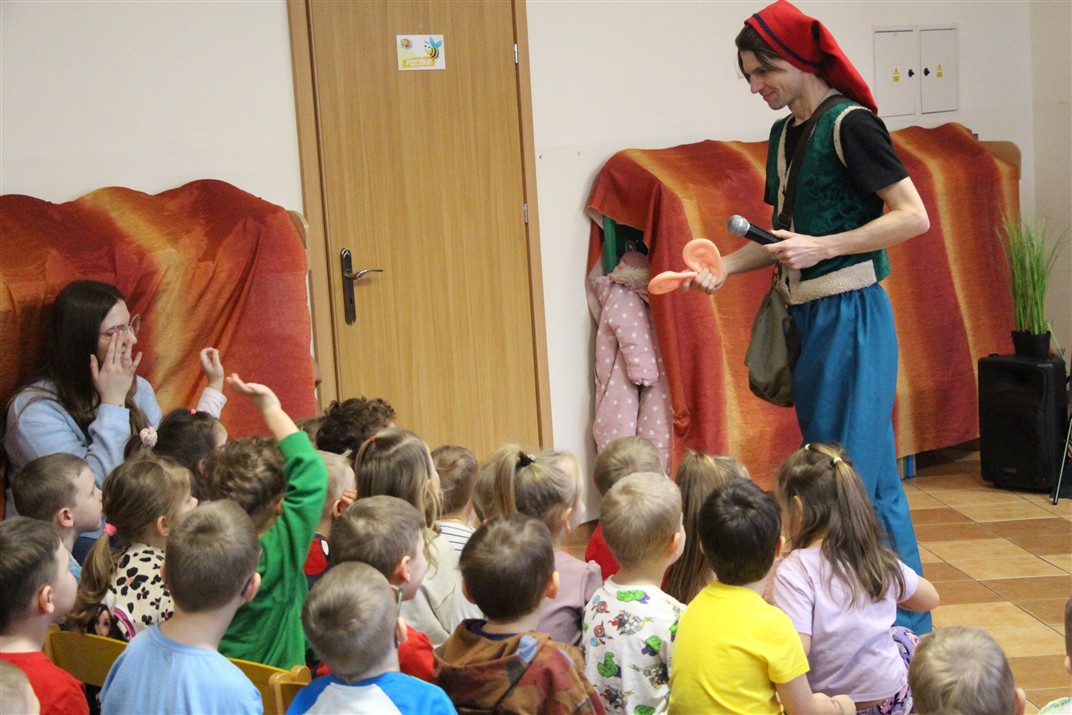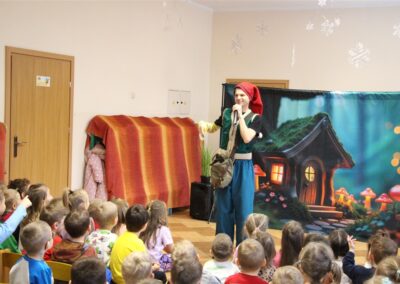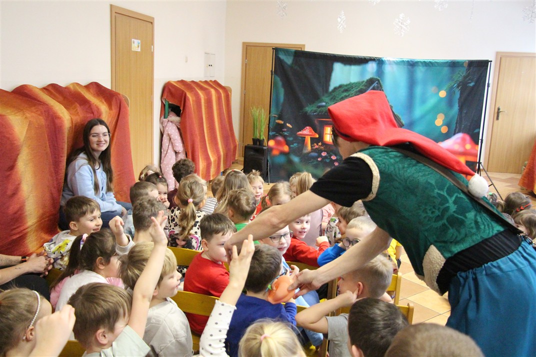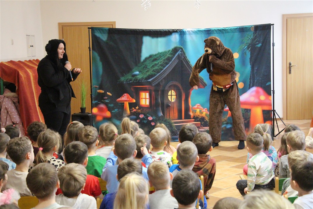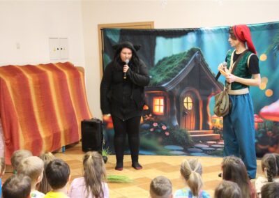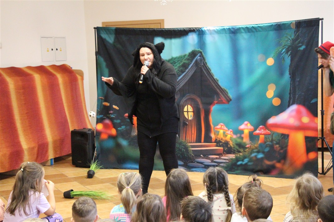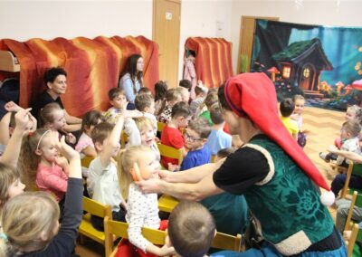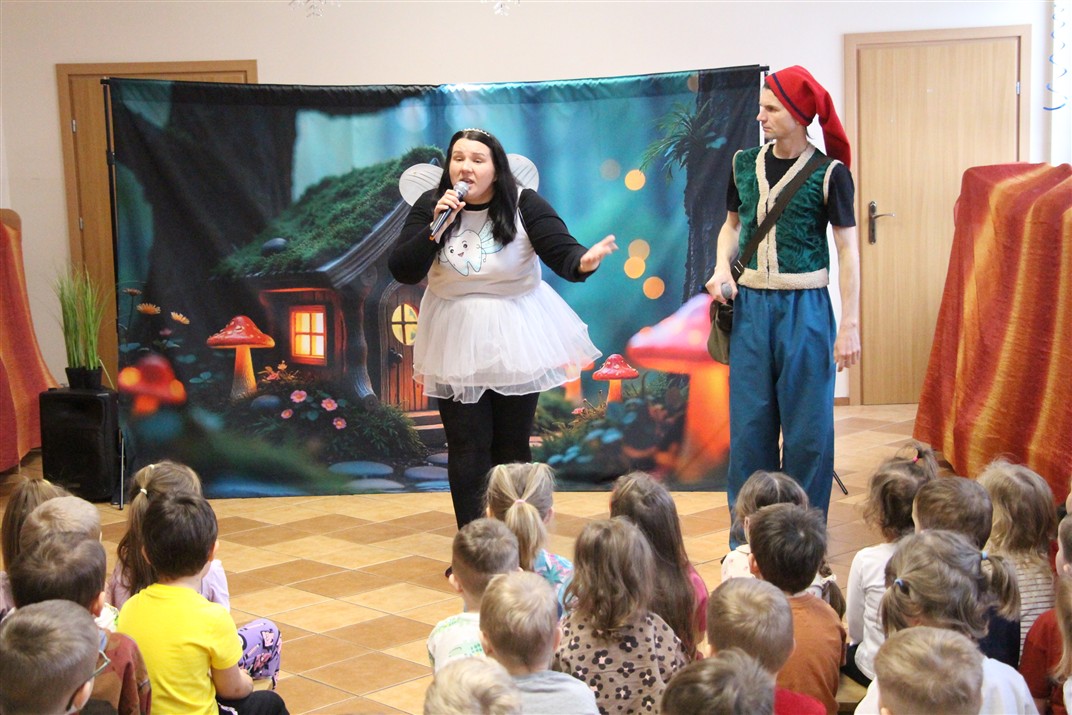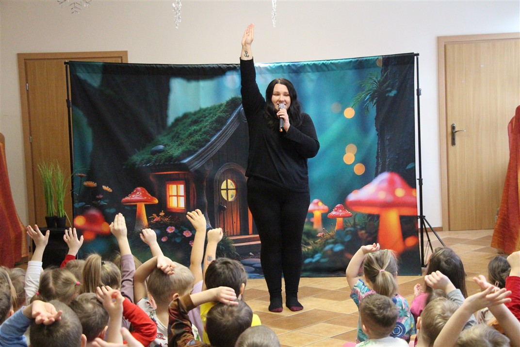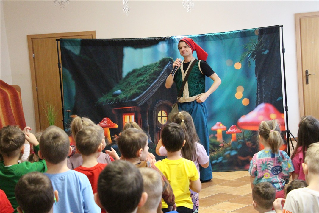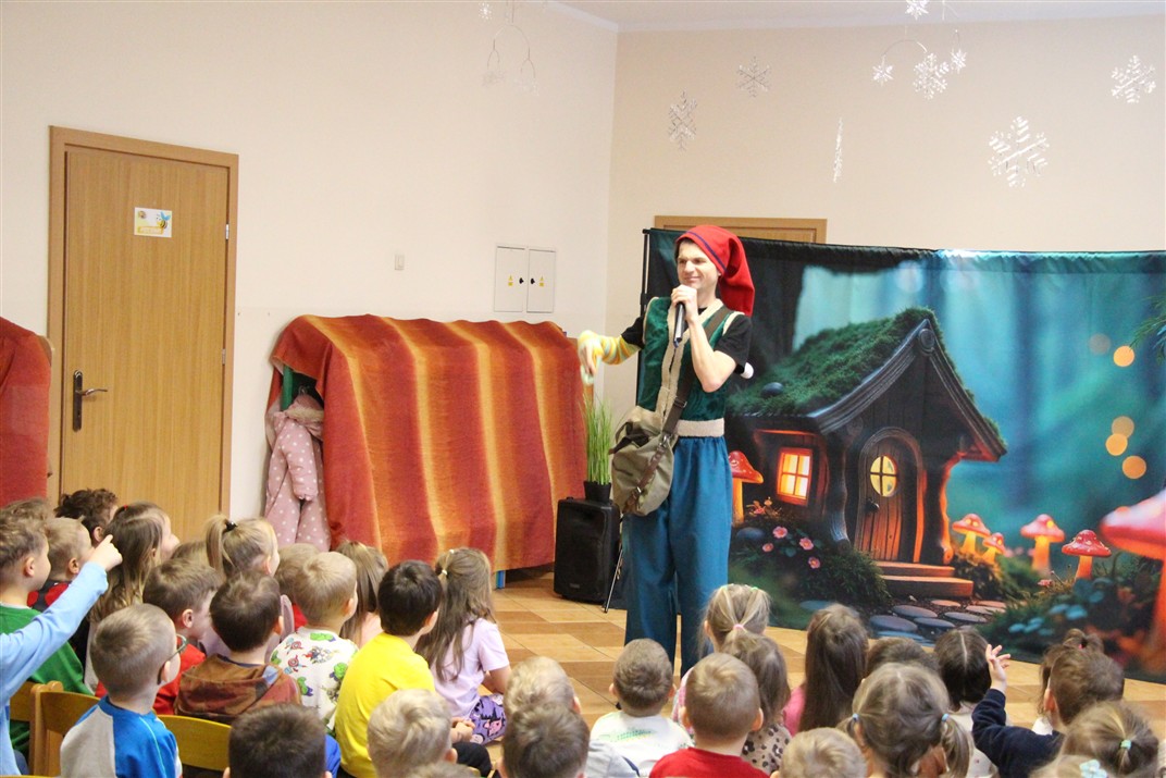 W piątek, 6 lutego nasze przedszkole odwiedziła Grupa T. z przedstawieniem pod tytułem „Co nam w uszach gra” Dzieci zostały zabrane do fantastycznego świata Krasnoludka Niezabudka i Nietoperzycy Topci, którzy dzięki magicznym uszom uczyli się słuchać nie tylko słów, ale także emocji. Spektakl w przystępny i pełen humoru sposób poruszał ważne tematy, takie jak rozpoznawanie i nazywanie emocji, radzenie sobie z trudnymi uczuciami, empatia oraz zdrowe odżywianie. Dużym zainteresowaniem najmłodszych cieszyła się również zabawna i energiczna Wróżka Zębuszka. Kolorowe stroje, piękne dekoracje, aktywny udział publiczności oraz wspólny taniec sprawiły, że dzieci z ogromnym zaangażowaniem śledziły przebieg przedstawienia. Była to nie tylko świetna zabawa, ale także wartościowa lekcja, która na długo pozostanie w pamięci naszych Smyków.