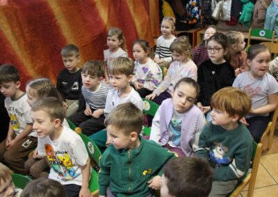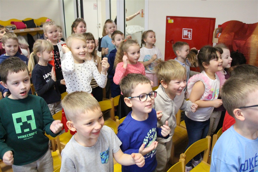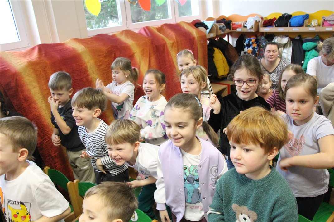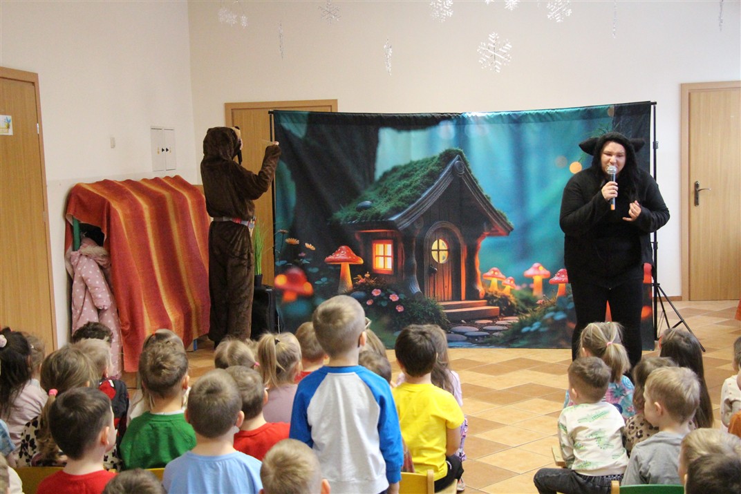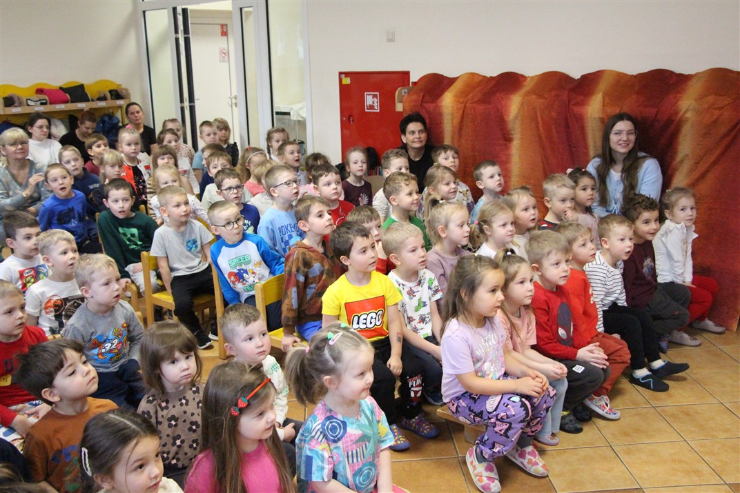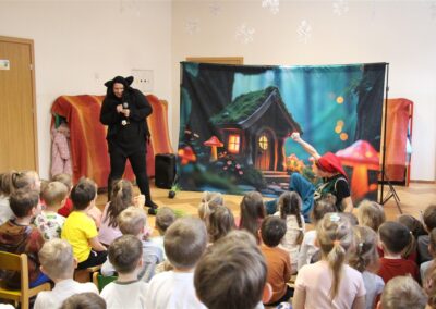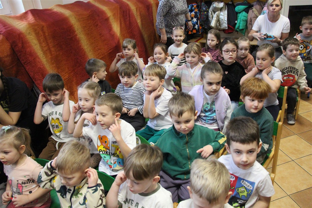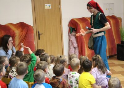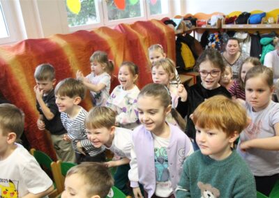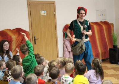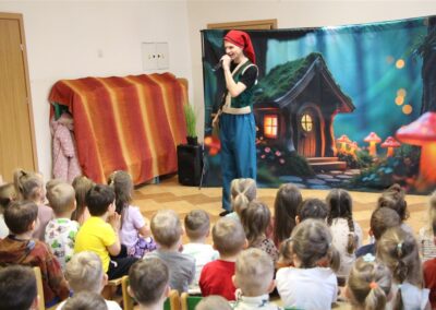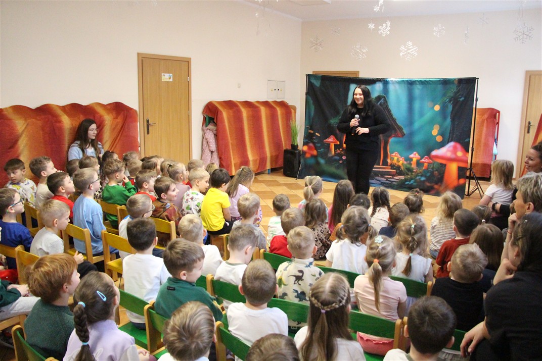 W piątek, 6 lutego nasze przedszkole odwiedziła Grupa T. z przedstawieniem pod tytułem „Co nam w uszach gra” Dzieci zostały zabrane do fantastycznego świata Krasnoludka Niezabudka i Nietoperzycy Topci, którzy dzięki magicznym uszom uczyli się słuchać nie tylko słów, ale także emocji. Spektakl w przystępny i pełen humoru sposób poruszał ważne tematy, takie jak rozpoznawanie i nazywanie emocji, radzenie sobie z trudnymi uczuciami, empatia oraz zdrowe odżywianie. Dużym zainteresowaniem najmłodszych cieszyła się również zabawna i energiczna Wróżka Zębuszka. Kolorowe stroje, piękne dekoracje, aktywny udział publiczności oraz wspólny taniec sprawiły, że dzieci z ogromnym zaangażowaniem śledziły przebieg przedstawienia. Była to nie tylko świetna zabawa, ale także wartościowa lekcja, która na długo pozostanie w pamięci naszych Smyków.