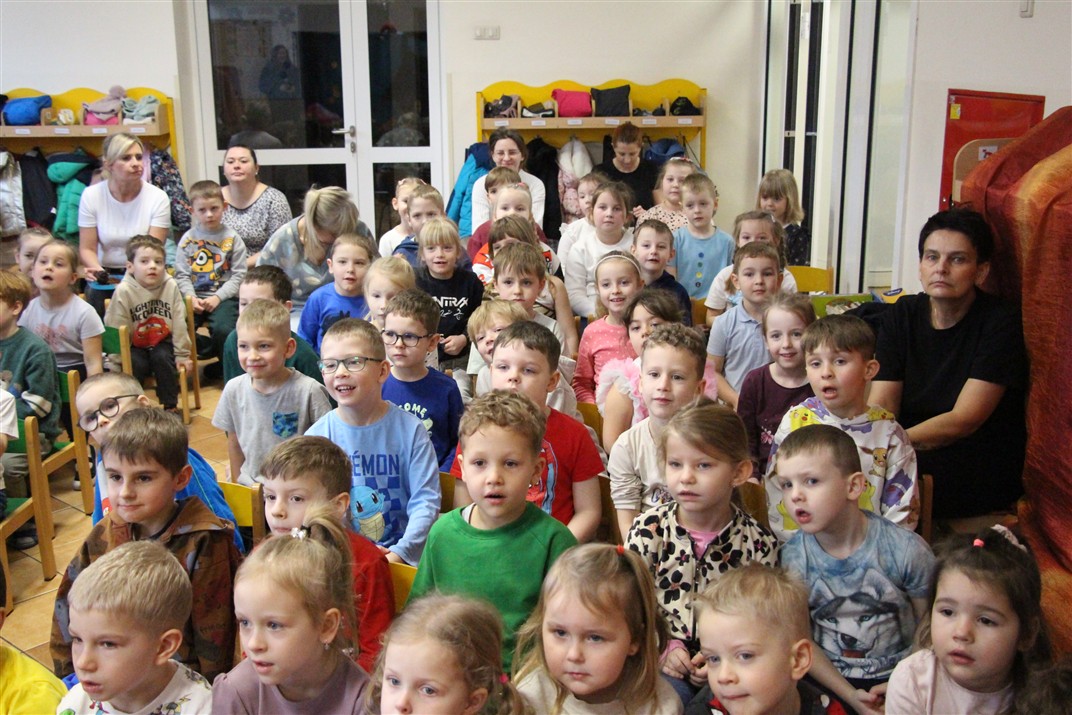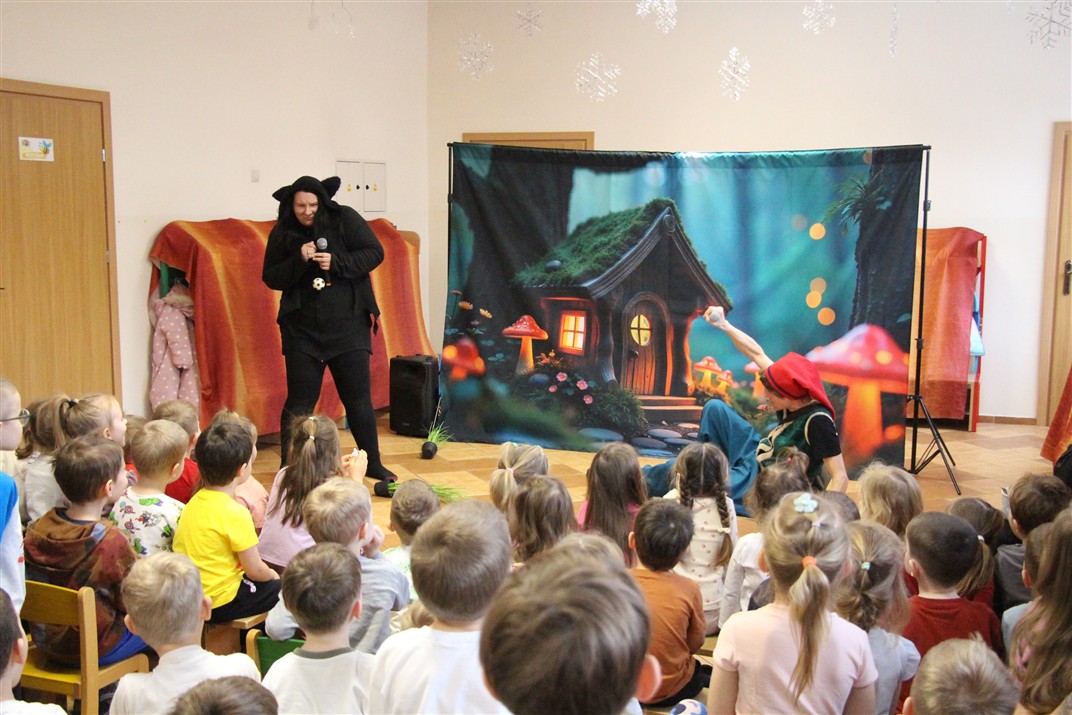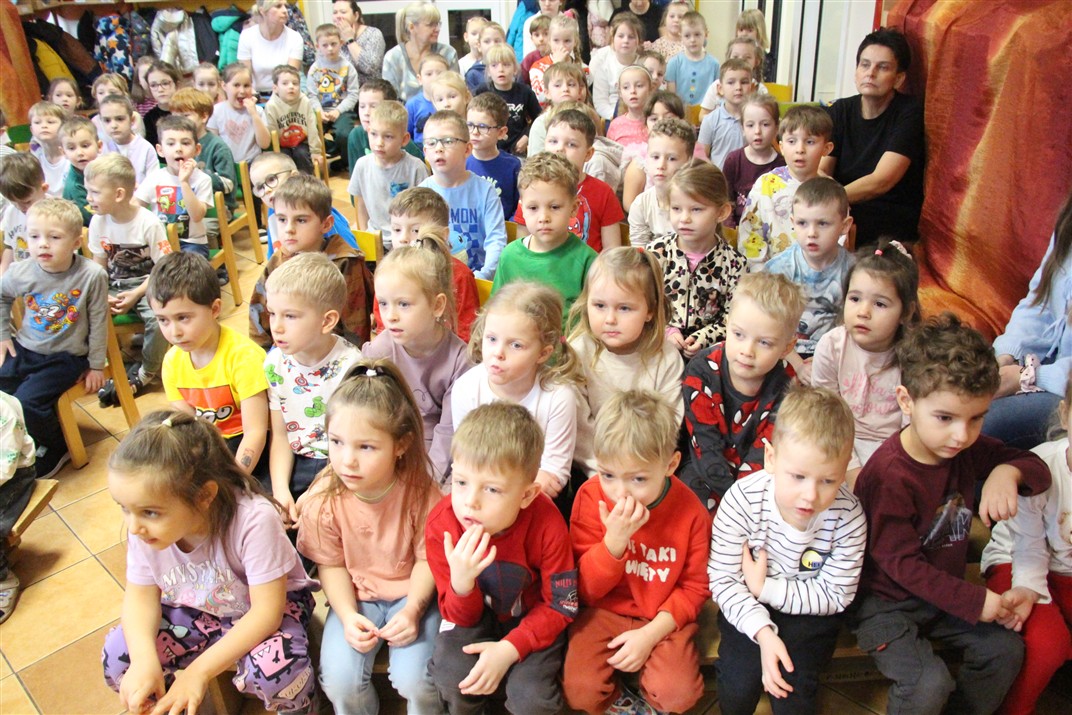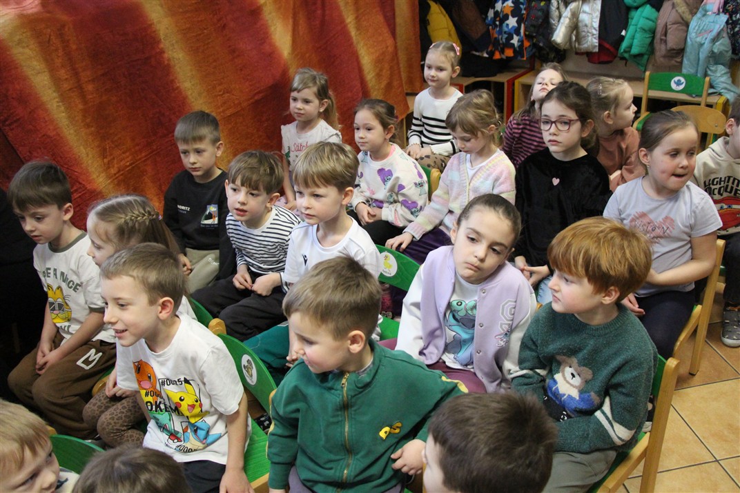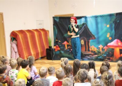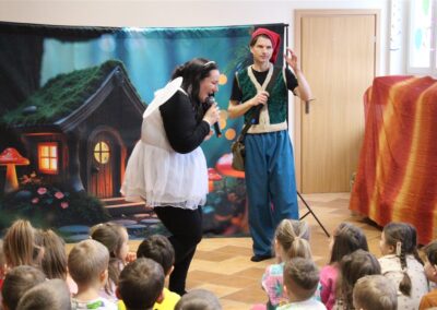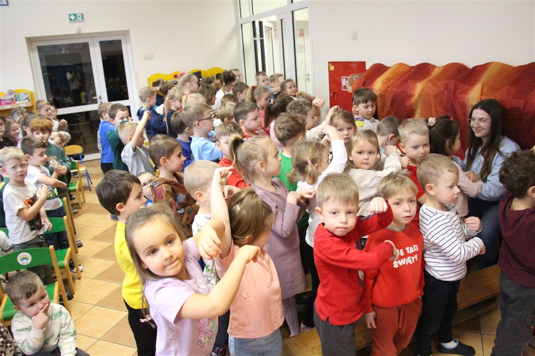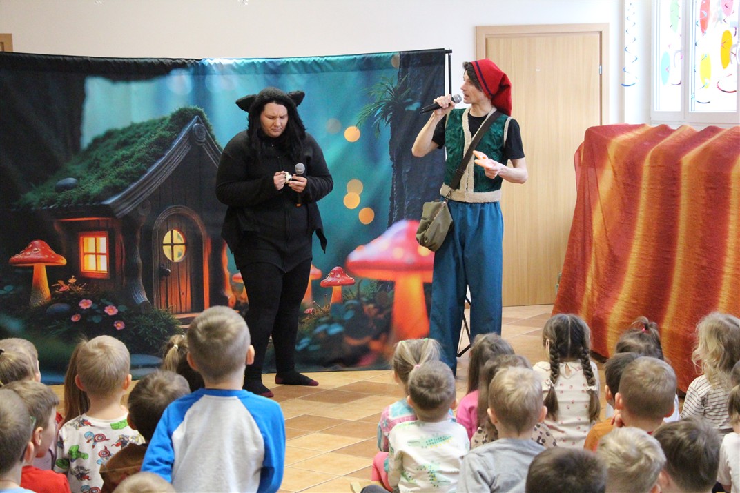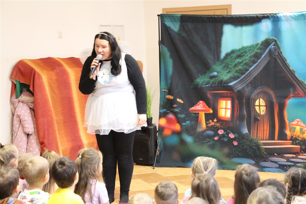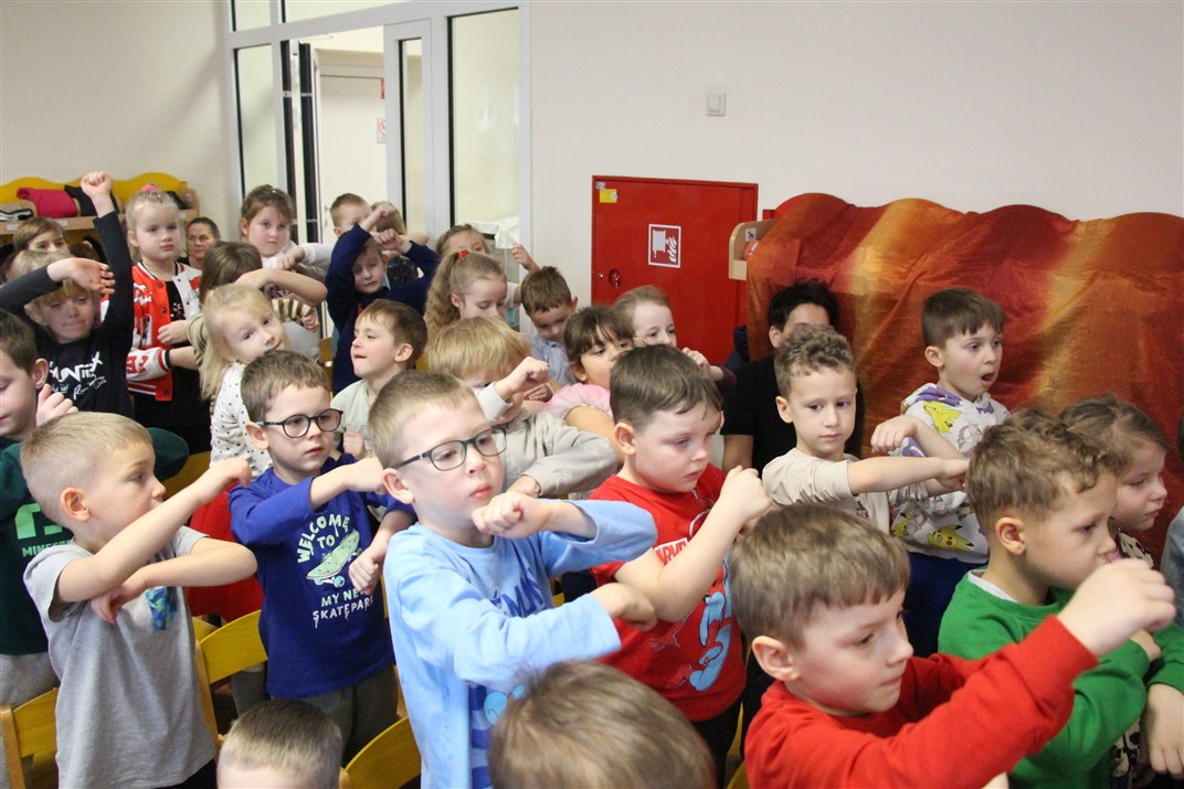 W piątek, 6 lutego nasze przedszkole odwiedziła Grupa T. z przedstawieniem pod tytułem „Co nam w uszach gra” Dzieci zostały zabrane do fantastycznego świata Krasnoludka Niezabudka i Nietoperzycy Topci, którzy dzięki magicznym uszom uczyli się słuchać nie tylko słów, ale także emocji. Spektakl w przystępny i pełen humoru sposób poruszał ważne tematy, takie jak rozpoznawanie i nazywanie emocji, radzenie sobie z trudnymi uczuciami, empatia oraz zdrowe odżywianie. Dużym zainteresowaniem najmłodszych cieszyła się również zabawna i energiczna Wróżka Zębuszka. Kolorowe stroje, piękne dekoracje, aktywny udział publiczności oraz wspólny taniec sprawiły, że dzieci z ogromnym zaangażowaniem śledziły przebieg przedstawienia. Była to nie tylko świetna zabawa, ale także wartościowa lekcja, która na długo pozostanie w pamięci naszych Smyków.