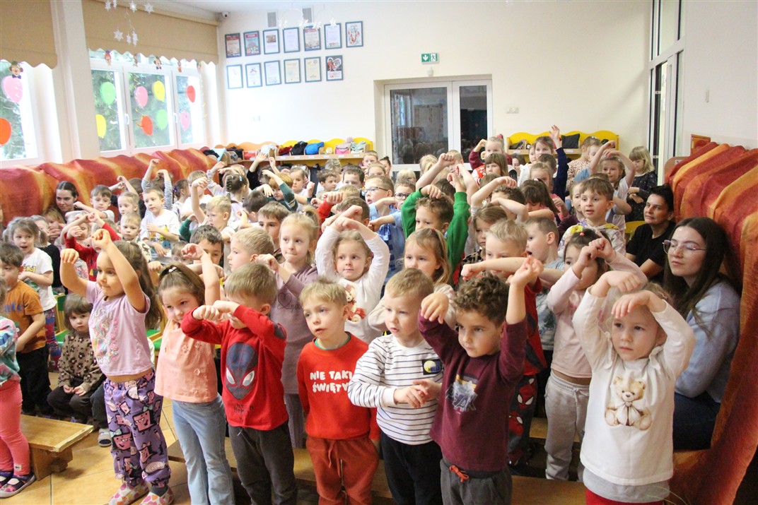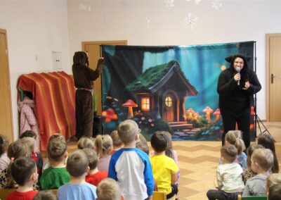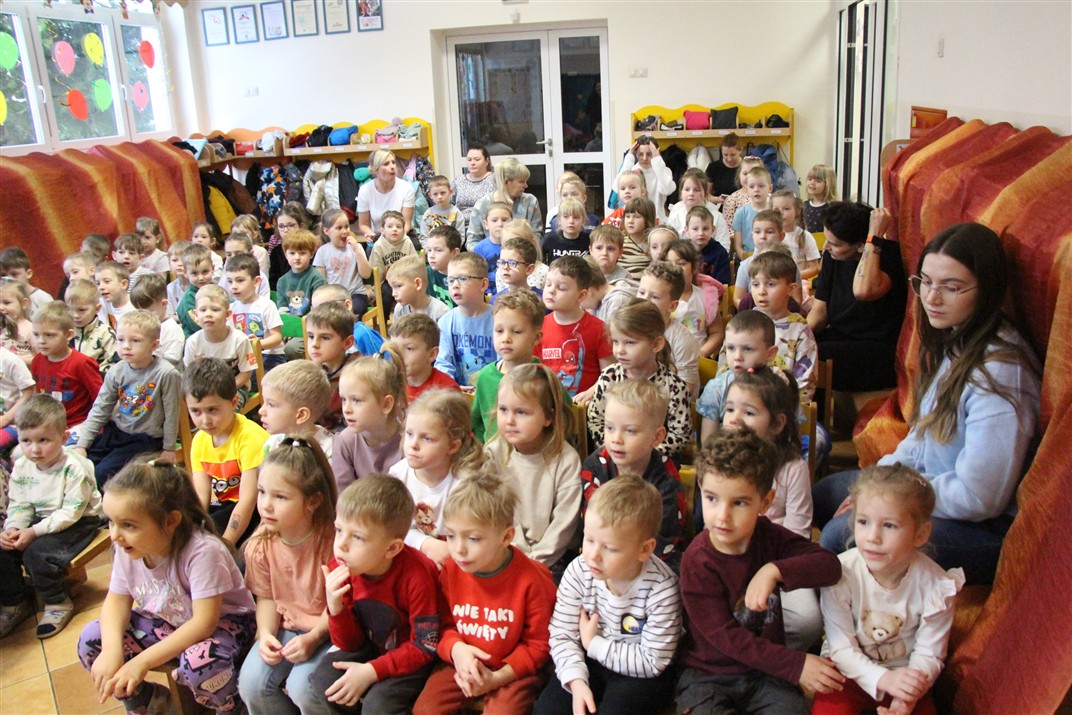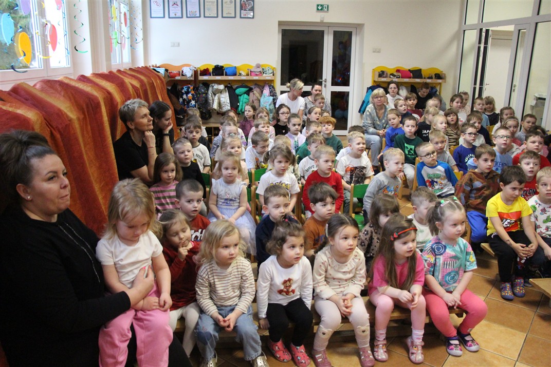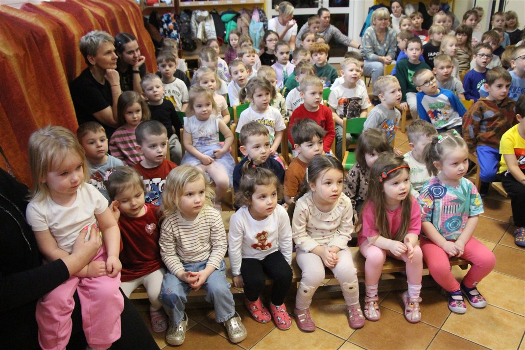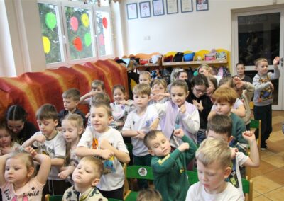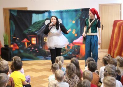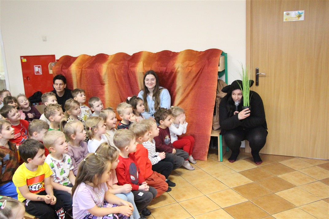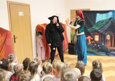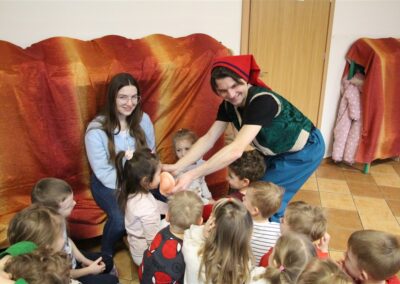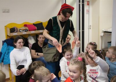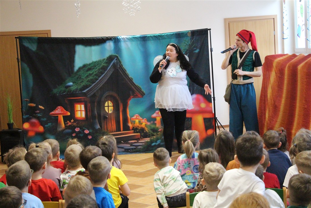 W piątek, 6 lutego nasze przedszkole odwiedziła Grupa T. z przedstawieniem pod tytułem „Co nam w uszach gra” Dzieci zostały zabrane do fantastycznego świata Krasnoludka Niezabudka i Nietoperzycy Topci, którzy dzięki magicznym uszom uczyli się słuchać nie tylko słów, ale także emocji. Spektakl w przystępny i pełen humoru sposób poruszał ważne tematy, takie jak rozpoznawanie i nazywanie emocji, radzenie sobie z trudnymi uczuciami, empatia oraz zdrowe odżywianie. Dużym zainteresowaniem najmłodszych cieszyła się również zabawna i energiczna Wróżka Zębuszka. Kolorowe stroje, piękne dekoracje, aktywny udział publiczności oraz wspólny taniec sprawiły, że dzieci z ogromnym zaangażowaniem śledziły przebieg przedstawienia. Była to nie tylko świetna zabawa, ale także wartościowa lekcja, która na długo pozostanie w pamięci naszych Smyków.