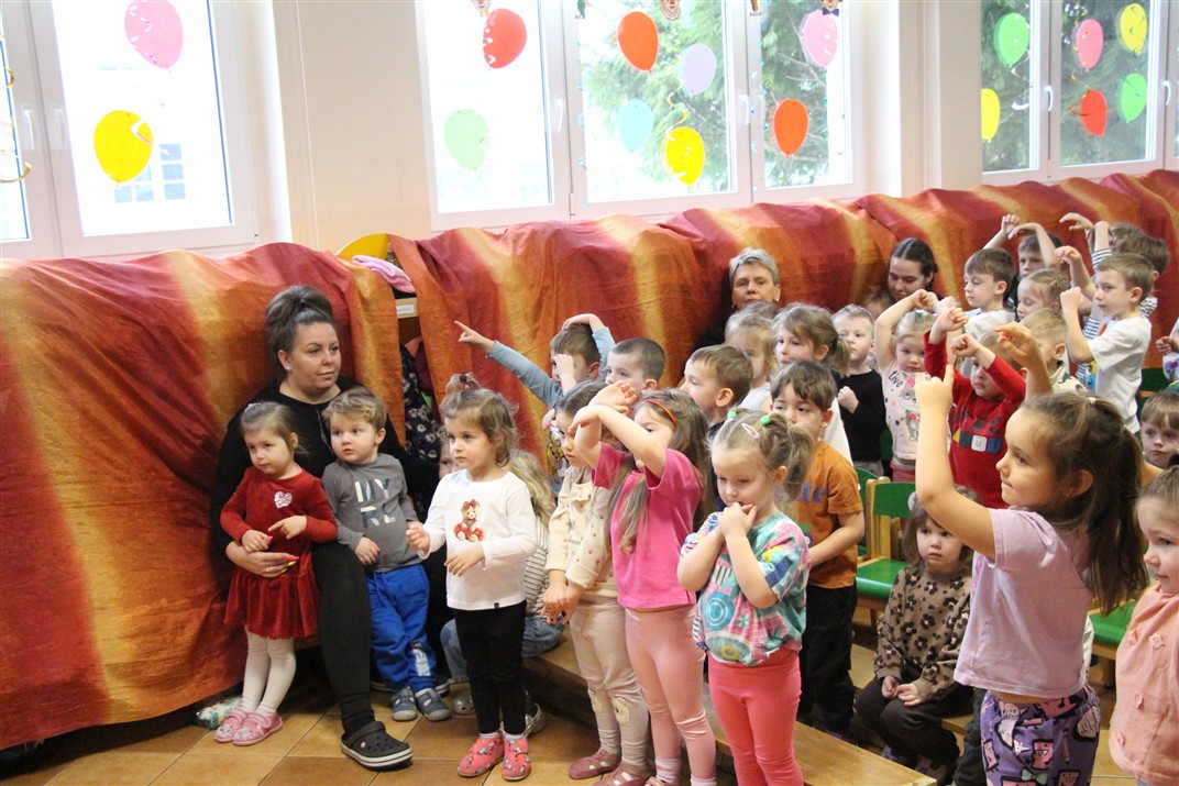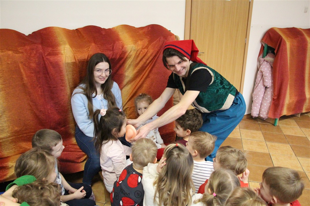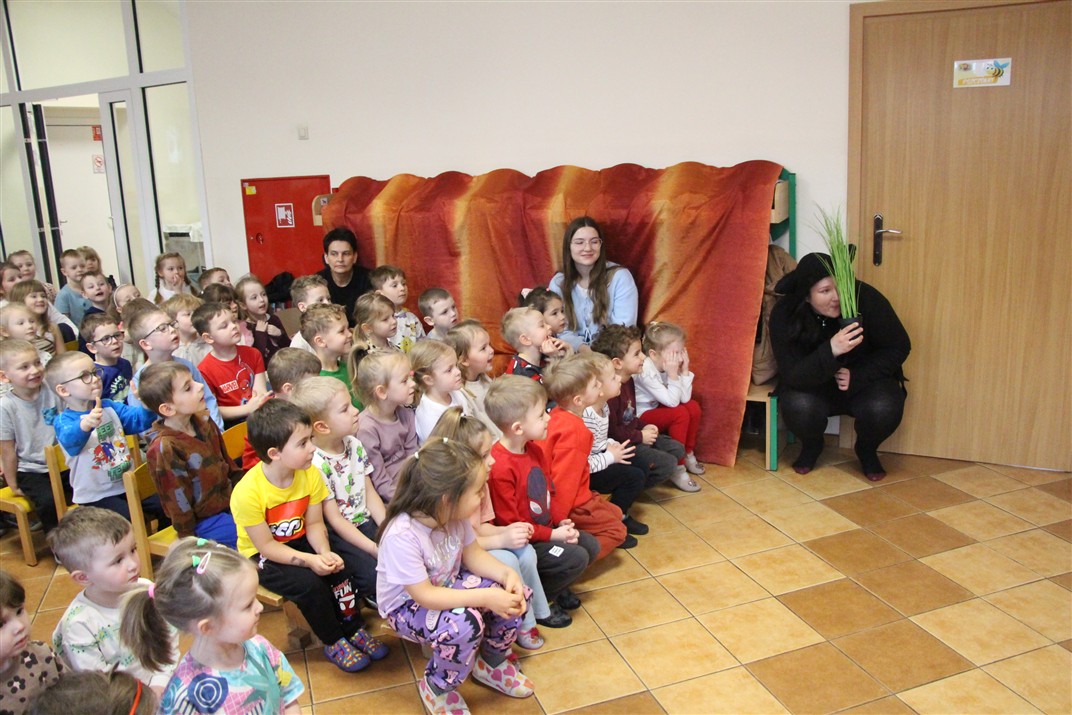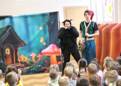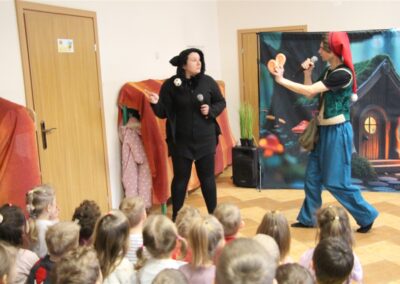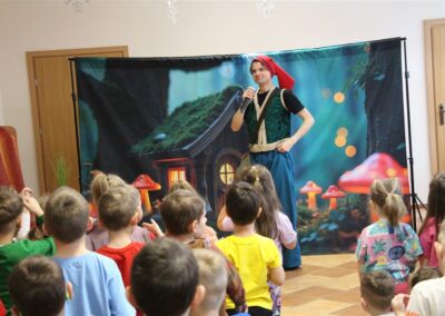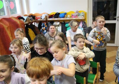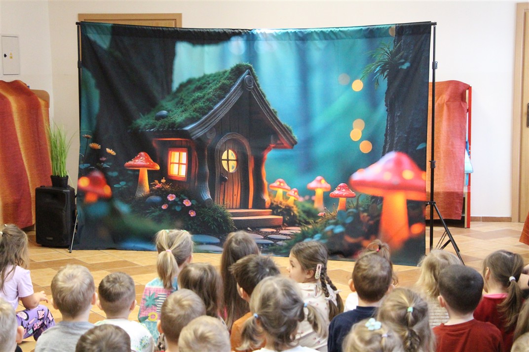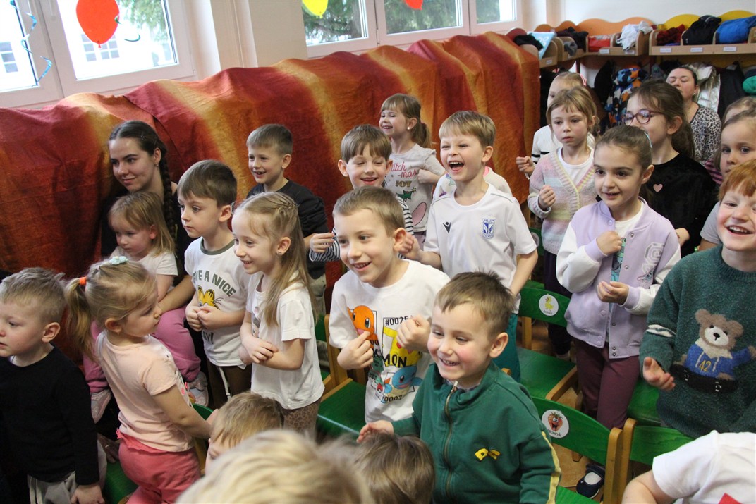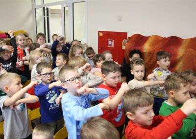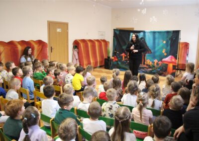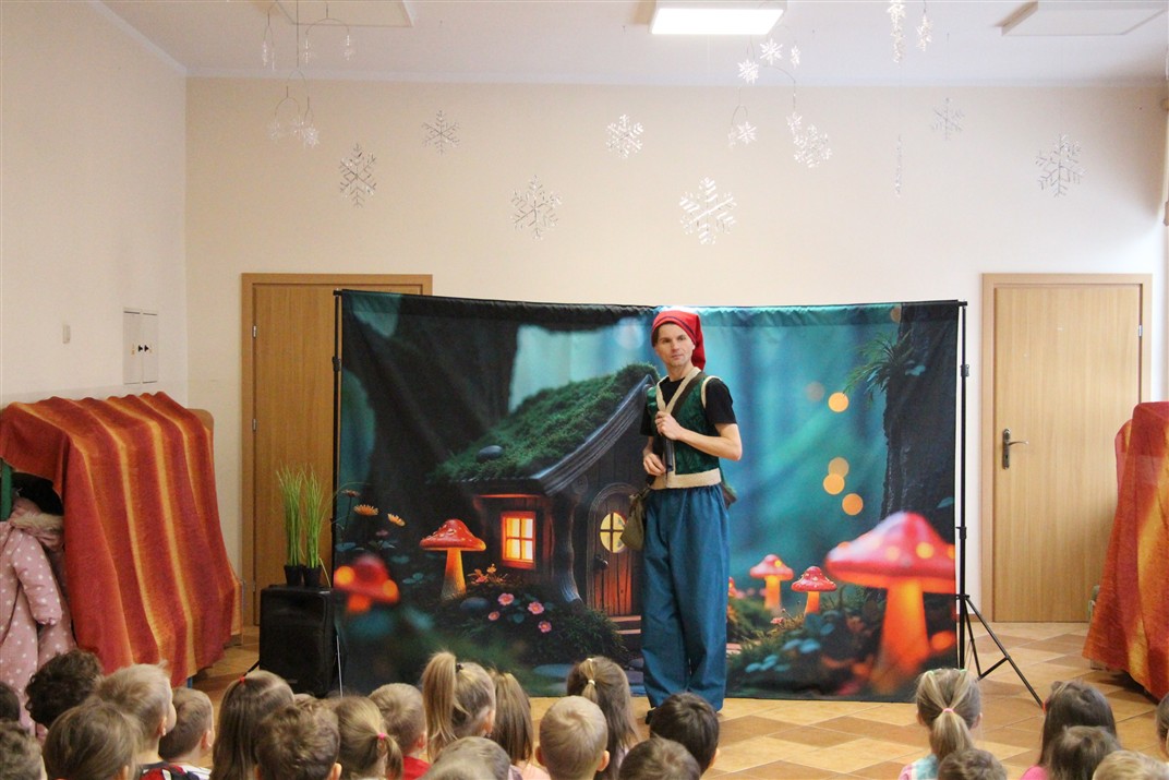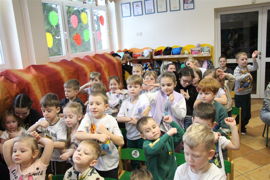 W piątek, 6 lutego nasze przedszkole odwiedziła Grupa T. z przedstawieniem pod tytułem „Co nam w uszach gra” Dzieci zostały zabrane do fantastycznego świata Krasnoludka Niezabudka i Nietoperzycy Topci, którzy dzięki magicznym uszom uczyli się słuchać nie tylko słów, ale także emocji. Spektakl w przystępny i pełen humoru sposób poruszał ważne tematy, takie jak rozpoznawanie i nazywanie emocji, radzenie sobie z trudnymi uczuciami, empatia oraz zdrowe odżywianie. Dużym zainteresowaniem najmłodszych cieszyła się również zabawna i energiczna Wróżka Zębuszka. Kolorowe stroje, piękne dekoracje, aktywny udział publiczności oraz wspólny taniec sprawiły, że dzieci z ogromnym zaangażowaniem śledziły przebieg przedstawienia. Była to nie tylko świetna zabawa, ale także wartościowa lekcja, która na długo pozostanie w pamięci naszych Smyków.