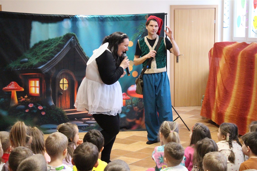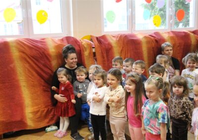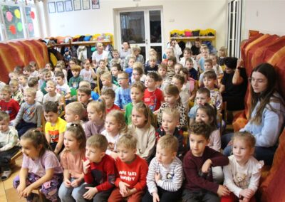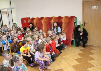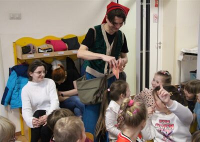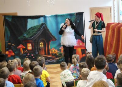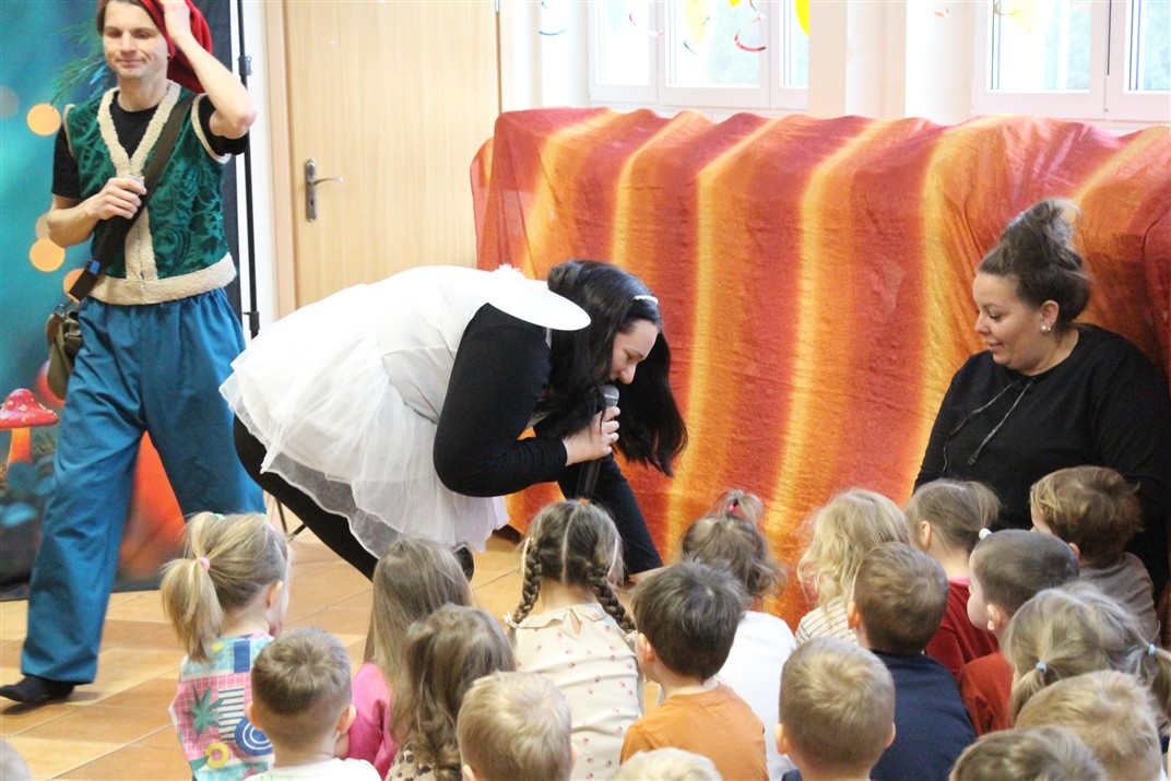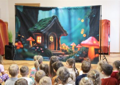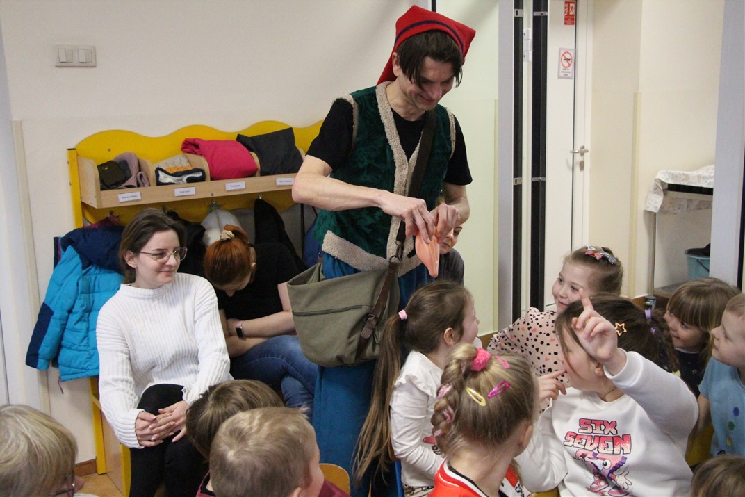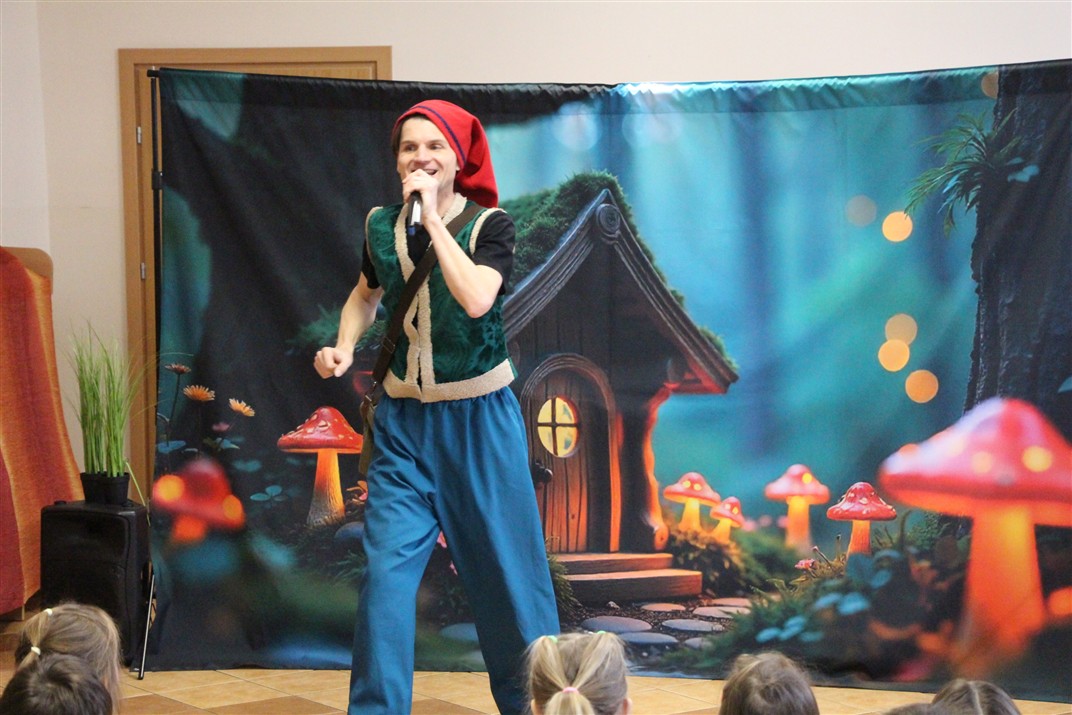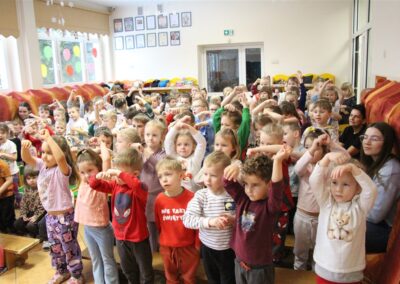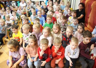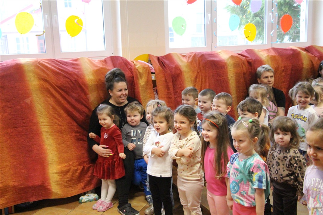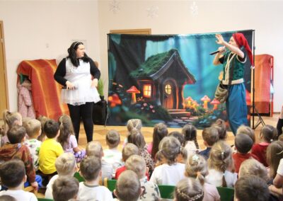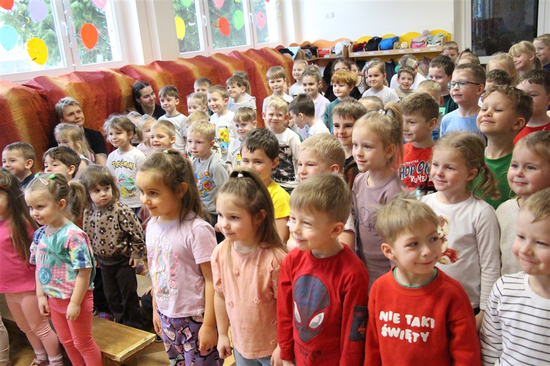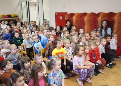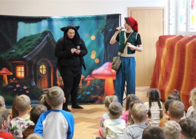 W piątek, 6 lutego nasze przedszkole odwiedziła Grupa T. z przedstawieniem pod tytułem „Co nam w uszach gra” Dzieci zostały zabrane do fantastycznego świata Krasnoludka Niezabudka i Nietoperzycy Topci, którzy dzięki magicznym uszom uczyli się słuchać nie tylko słów, ale także emocji. Spektakl w przystępny i pełen humoru sposób poruszał ważne tematy, takie jak rozpoznawanie i nazywanie emocji, radzenie sobie z trudnymi uczuciami, empatia oraz zdrowe odżywianie. Dużym zainteresowaniem najmłodszych cieszyła się również zabawna i energiczna Wróżka Zębuszka. Kolorowe stroje, piękne dekoracje, aktywny udział publiczności oraz wspólny taniec sprawiły, że dzieci z ogromnym zaangażowaniem śledziły przebieg przedstawienia. Była to nie tylko świetna zabawa, ale także wartościowa lekcja, która na długo pozostanie w pamięci naszych Smyków.