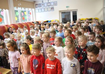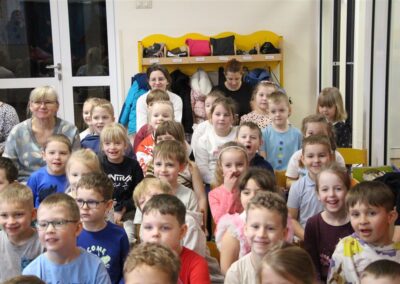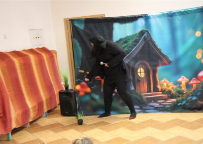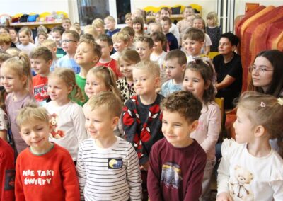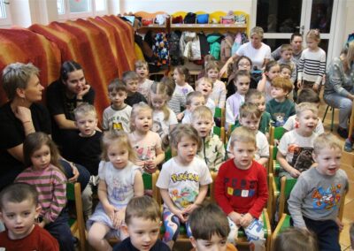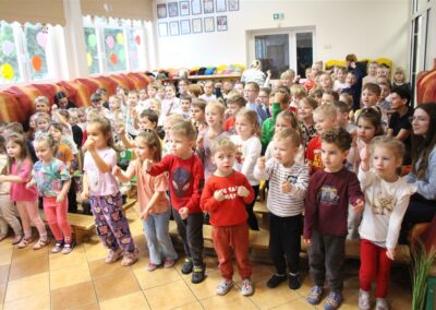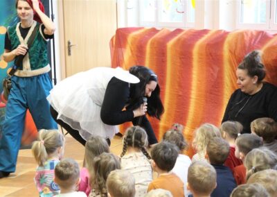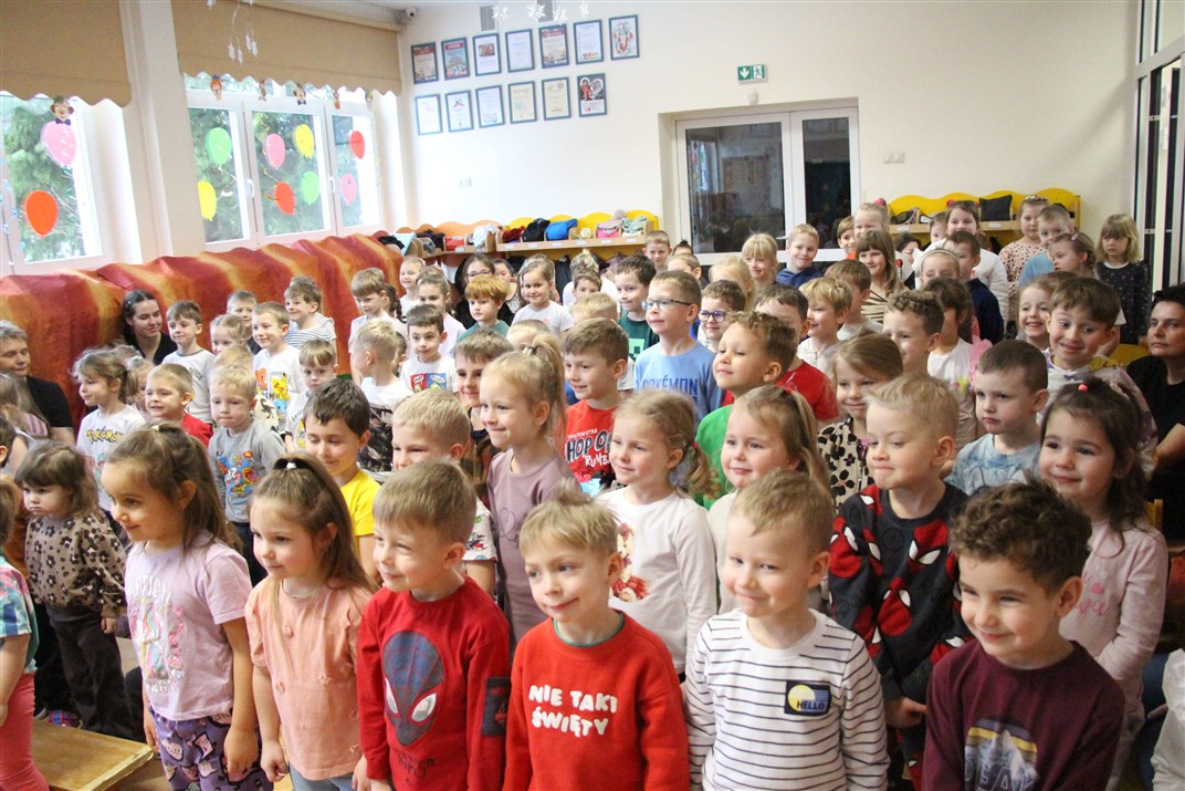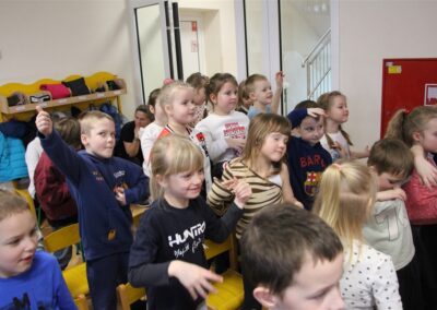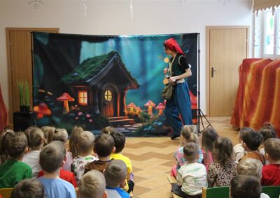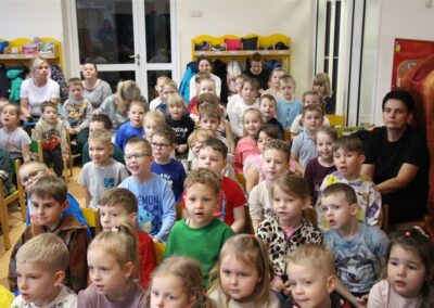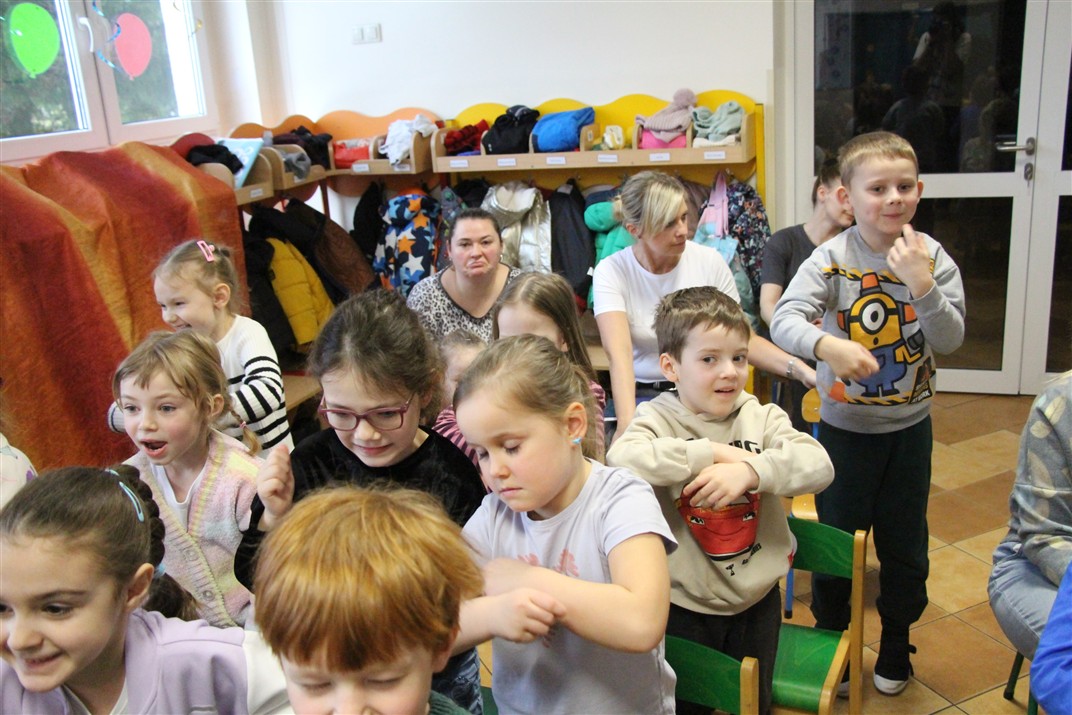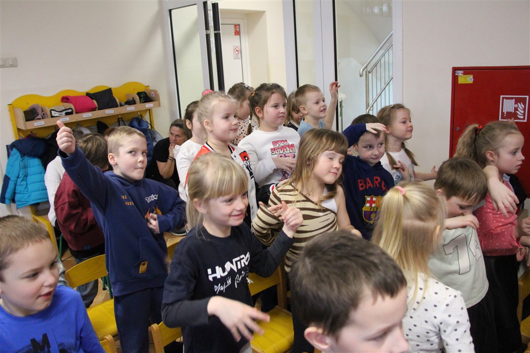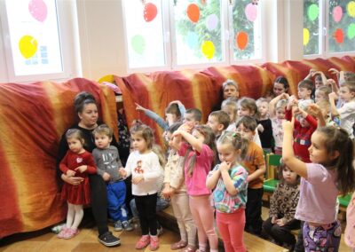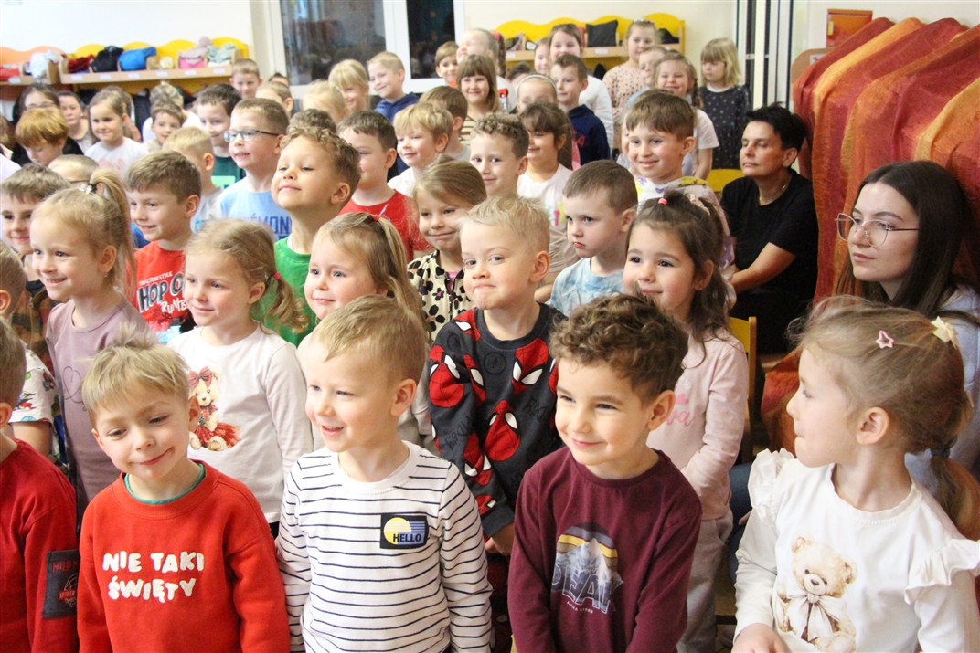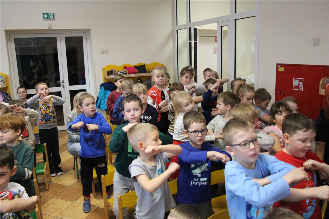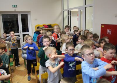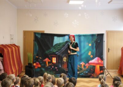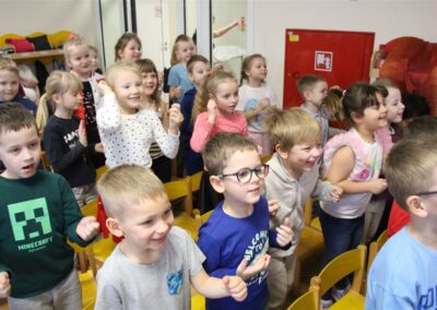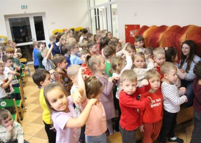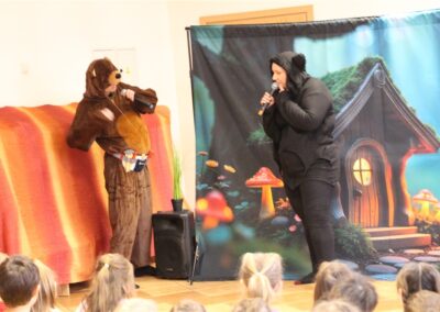 W piątek, 6 lutego nasze przedszkole odwiedziła Grupa T. z przedstawieniem pod tytułem „Co nam w uszach gra” Dzieci zostały zabrane do fantastycznego świata Krasnoludka Niezabudka i Nietoperzycy Topci, którzy dzięki magicznym uszom uczyli się słuchać nie tylko słów, ale także emocji. Spektakl w przystępny i pełen humoru sposób poruszał ważne tematy, takie jak rozpoznawanie i nazywanie emocji, radzenie sobie z trudnymi uczuciami, empatia oraz zdrowe odżywianie. Dużym zainteresowaniem najmłodszych cieszyła się również zabawna i energiczna Wróżka Zębuszka. Kolorowe stroje, piękne dekoracje, aktywny udział publiczności oraz wspólny taniec sprawiły, że dzieci z ogromnym zaangażowaniem śledziły przebieg przedstawienia. Była to nie tylko świetna zabawa, ale także wartościowa lekcja, która na długo pozostanie w pamięci naszych Smyków.