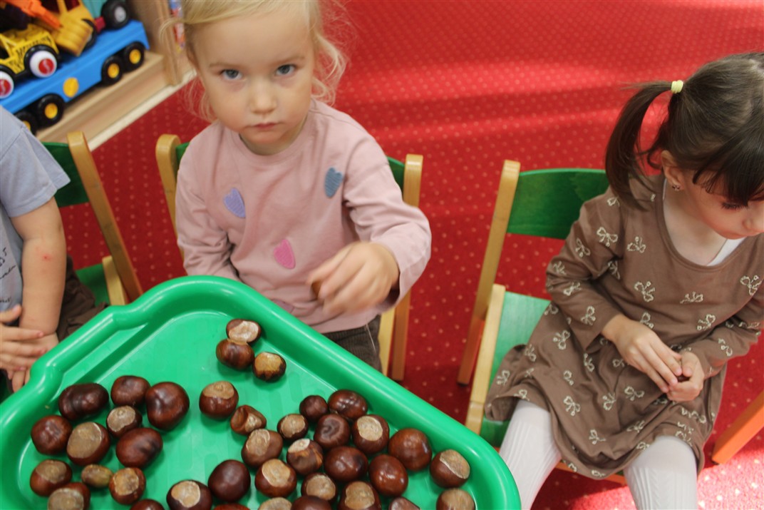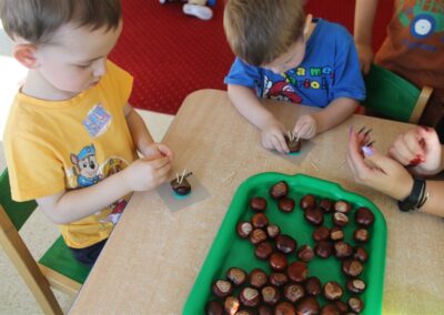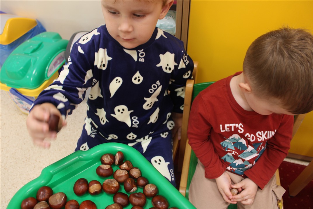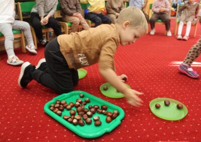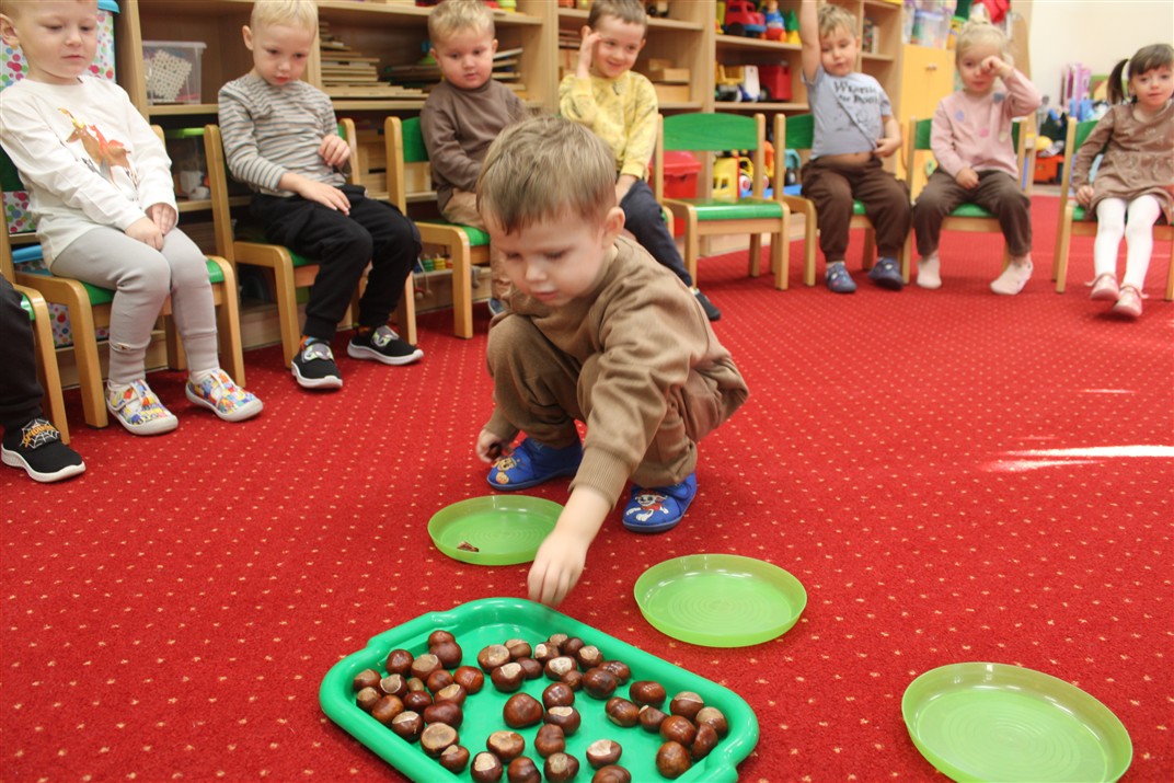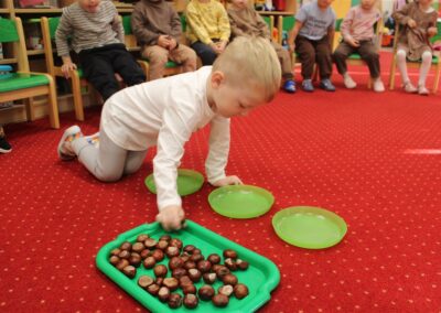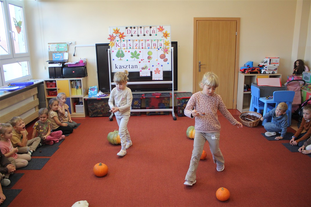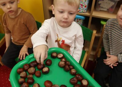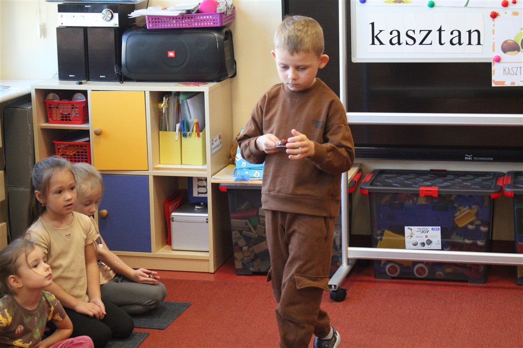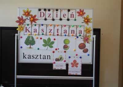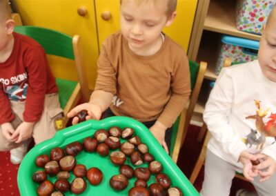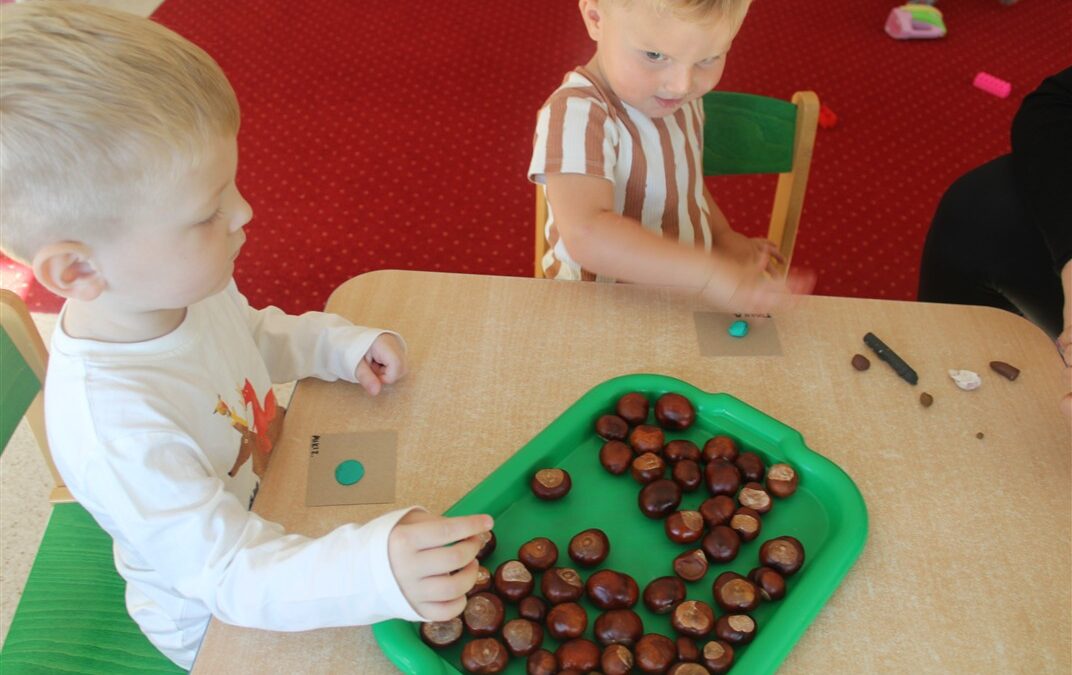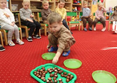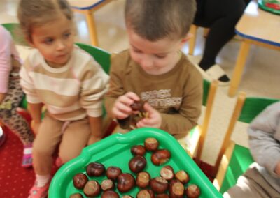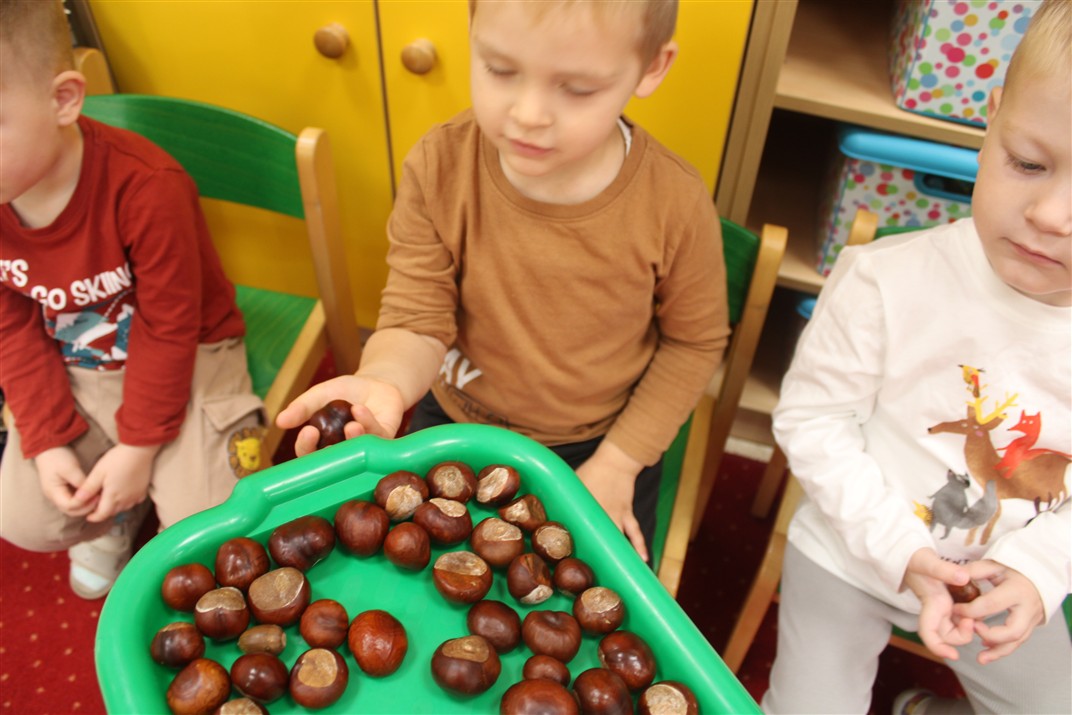 W naszym przedszkolu w piątek 3 października dzieci z grupy Myszek i Żabek obchodziły wyjątkowe święto – Dzień Kasztana. Już od rana w salach pojawiły się dekoracje w kolorach jesieni: brązowe, złote i pomarańczowe liście, a także kosze pełne kasztanów. Dzieci przyszły ubrane w odcieniach brązu, dzięki czemu wyglądały jak małe kasztanki. Świętowanie rozpoczęliśmy od wspólnych rozmów o tym, skąd biorą się kasztany i jak wyglądają drzewa kasztanowca. Następnie dzieci mogły dotykać, przesypywać i układać kasztany – ćwicząc spostrzegawczość oraz zdolności manualne. Nie zabrakło także zabaw ruchowych, takich jak: przenoszenie kasztanów łyżeczką na czas, turlanie kasztanków po wyznaczonej trasie. Podczas zajęć dzieci dowiedziały się także, że kasztany to nie tylko piękne dary jesieni, ale i pomoc w zabawach, ćwiczeniach oraz tworzeniu dekoracji. Dzień Kasztana był pełen uśmiechów, radości i jesiennej atmosfery, a kasztany na pewno jeszcze długo będą towarzyszyć dzieciom w zabawach.