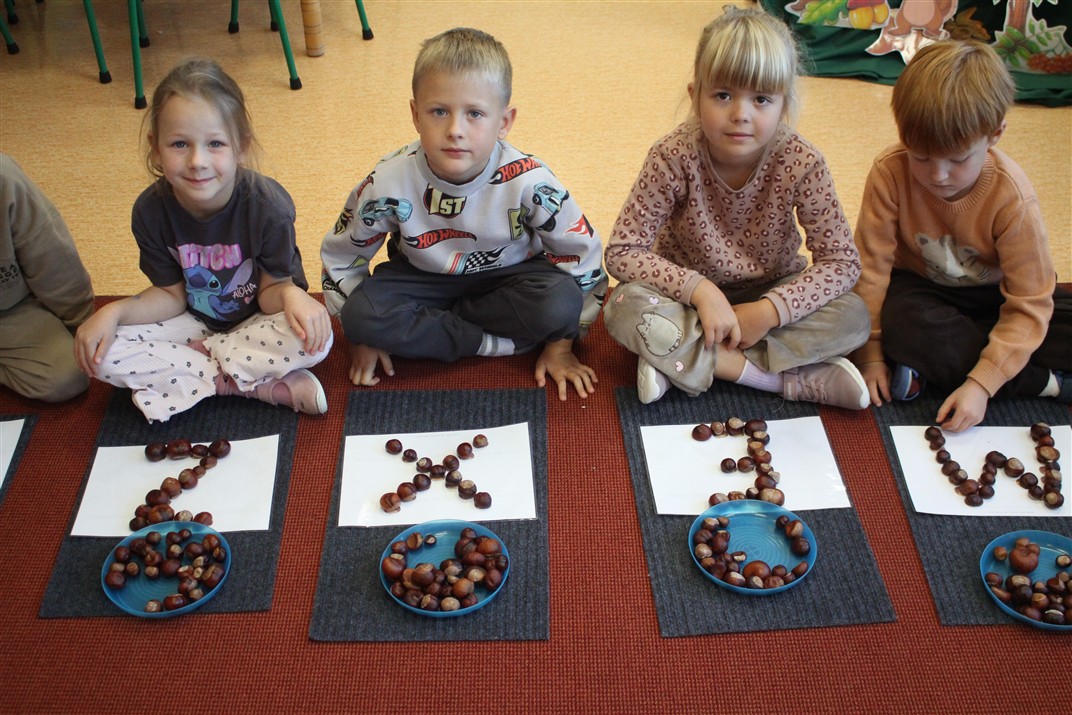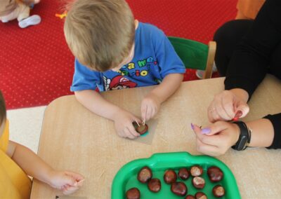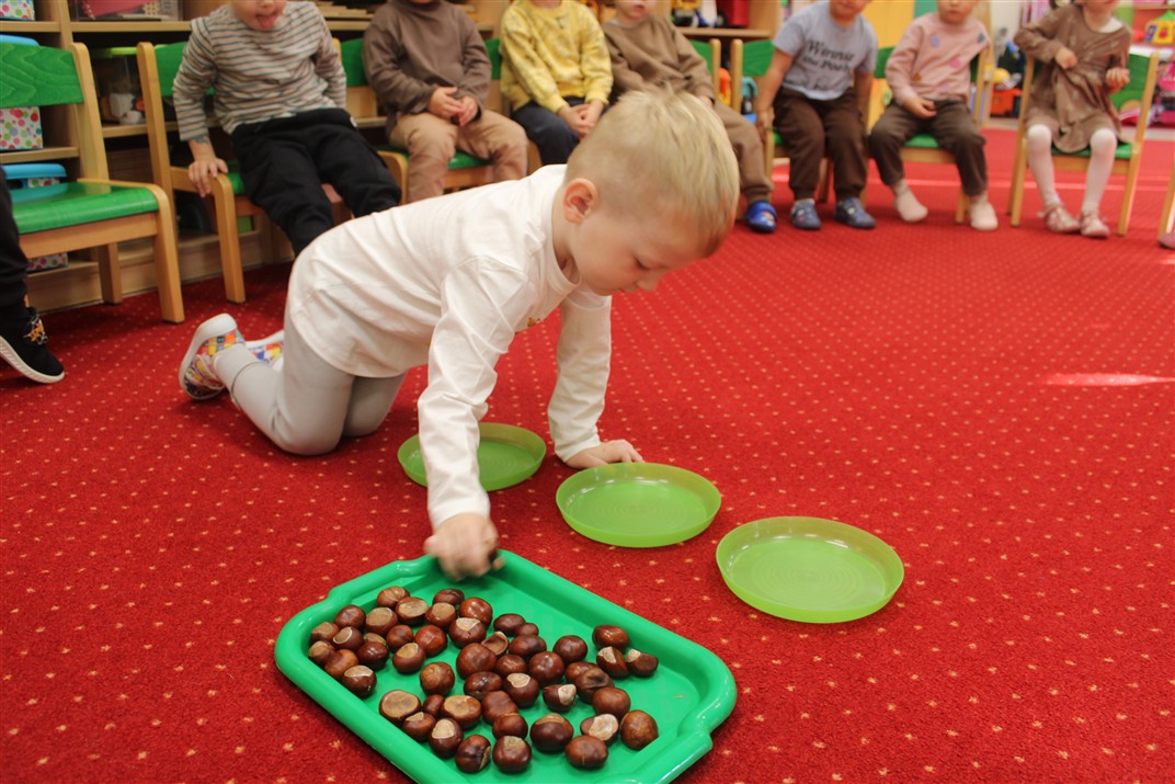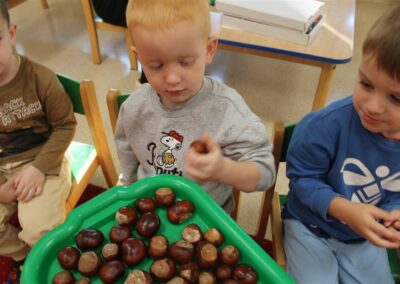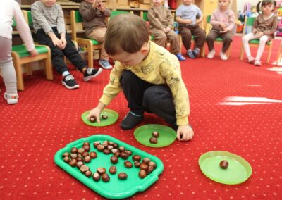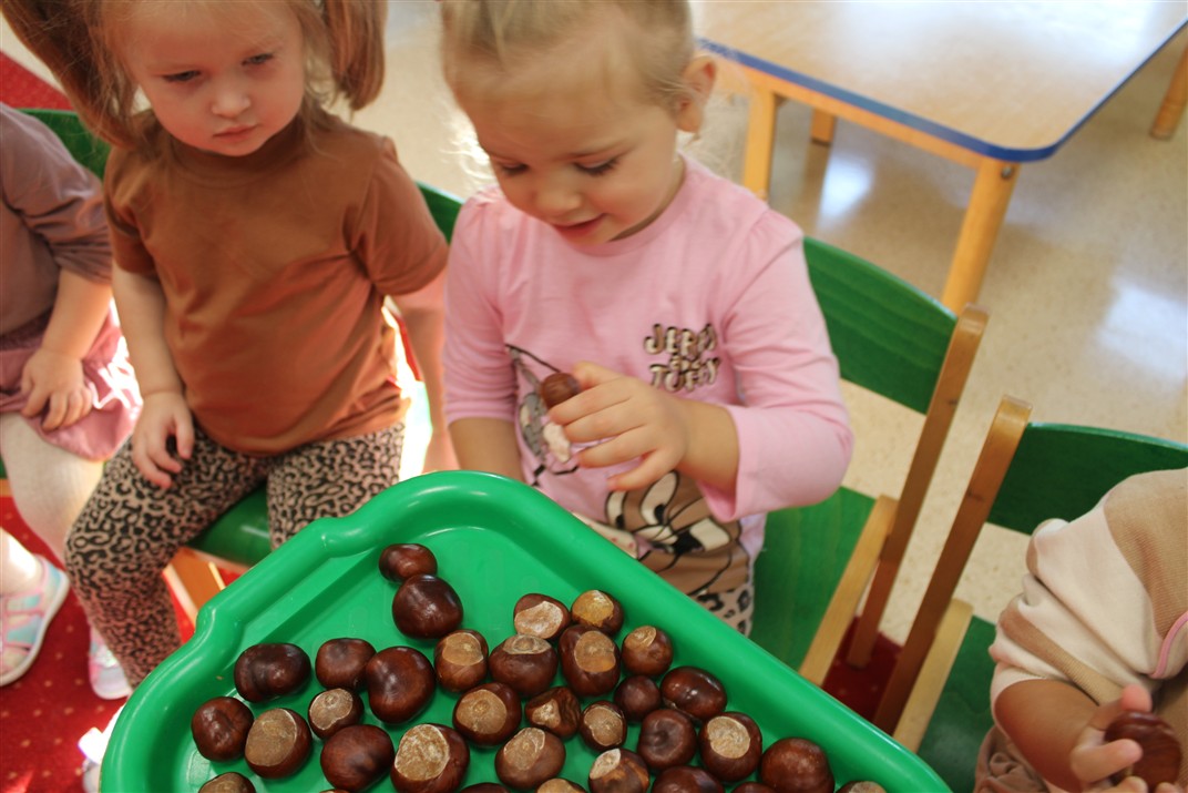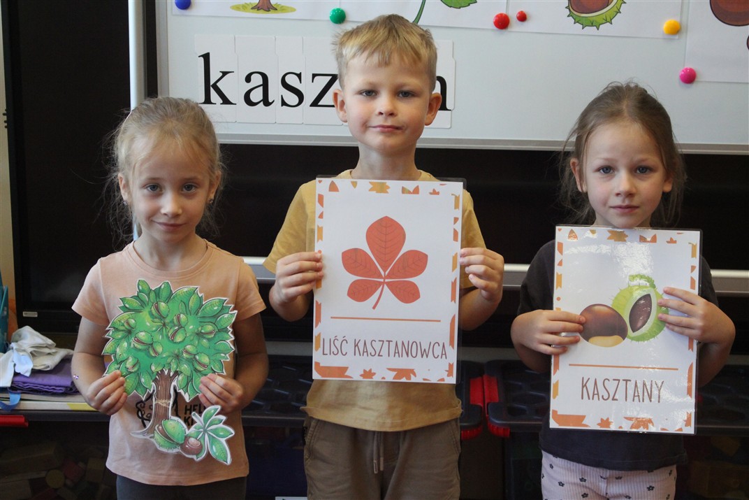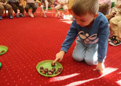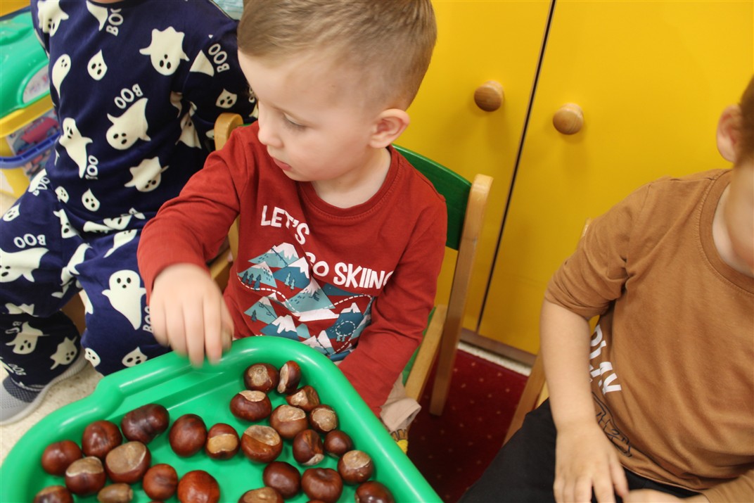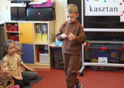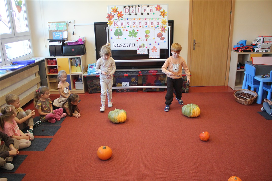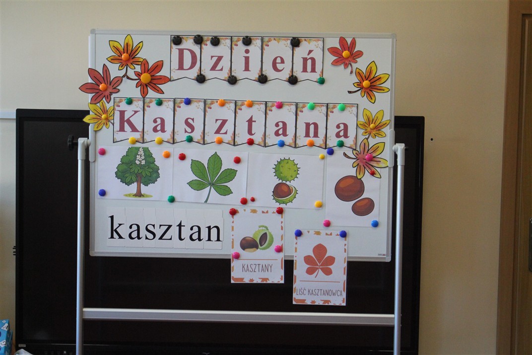 W naszym przedszkolu w piątek 3 października dzieci z grupy Myszek i Żabek obchodziły wyjątkowe święto – Dzień Kasztana. Już od rana w salach pojawiły się dekoracje w kolorach jesieni: brązowe, złote i pomarańczowe liście, a także kosze pełne kasztanów. Dzieci przyszły ubrane w odcieniach brązu, dzięki czemu wyglądały jak małe kasztanki. Świętowanie rozpoczęliśmy od wspólnych rozmów o tym, skąd biorą się kasztany i jak wyglądają drzewa kasztanowca. Następnie dzieci mogły dotykać, przesypywać i układać kasztany – ćwicząc spostrzegawczość oraz zdolności manualne. Nie zabrakło także zabaw ruchowych, takich jak: przenoszenie kasztanów łyżeczką na czas, turlanie kasztanków po wyznaczonej trasie. Podczas zajęć dzieci dowiedziały się także, że kasztany to nie tylko piękne dary jesieni, ale i pomoc w zabawach, ćwiczeniach oraz tworzeniu dekoracji. Dzień Kasztana był pełen uśmiechów, radości i jesiennej atmosfery, a kasztany na pewno jeszcze długo będą towarzyszyć dzieciom w zabawach.