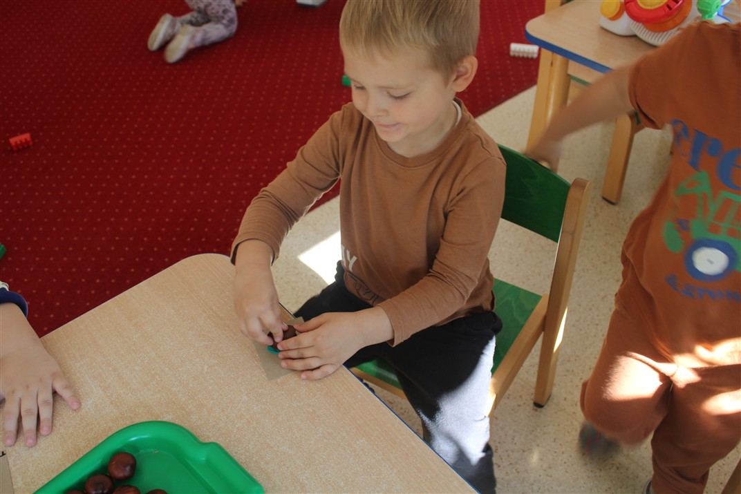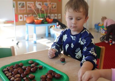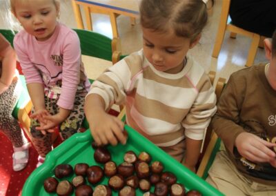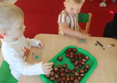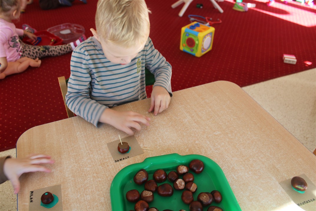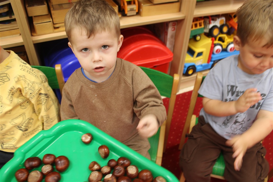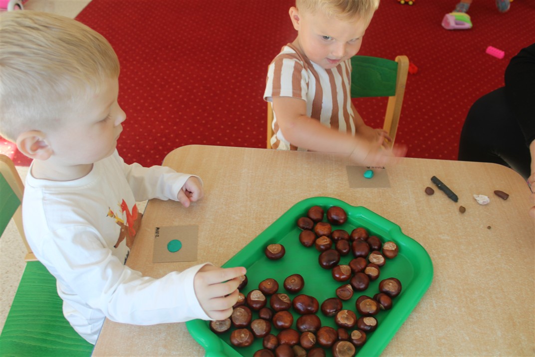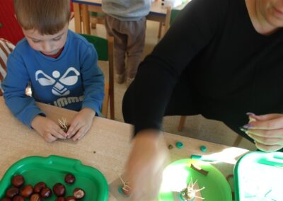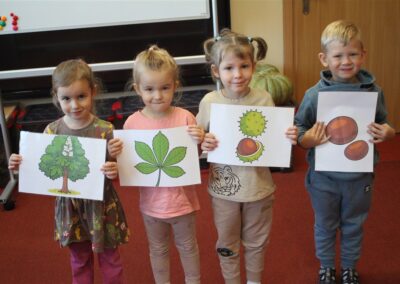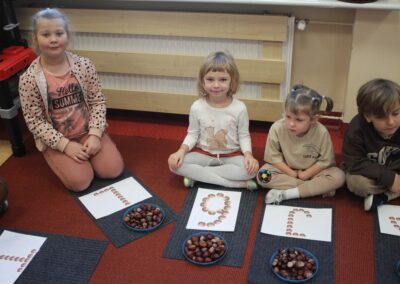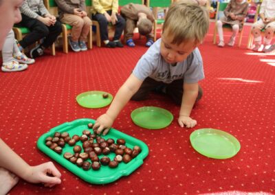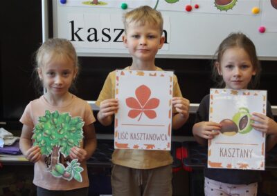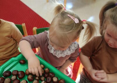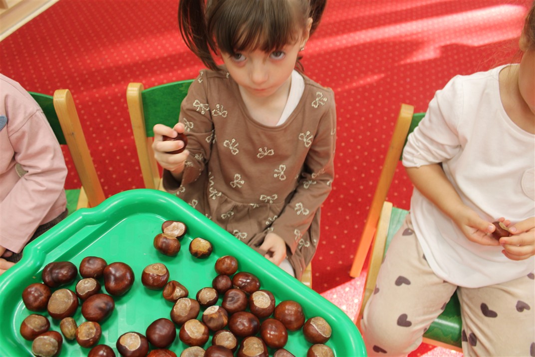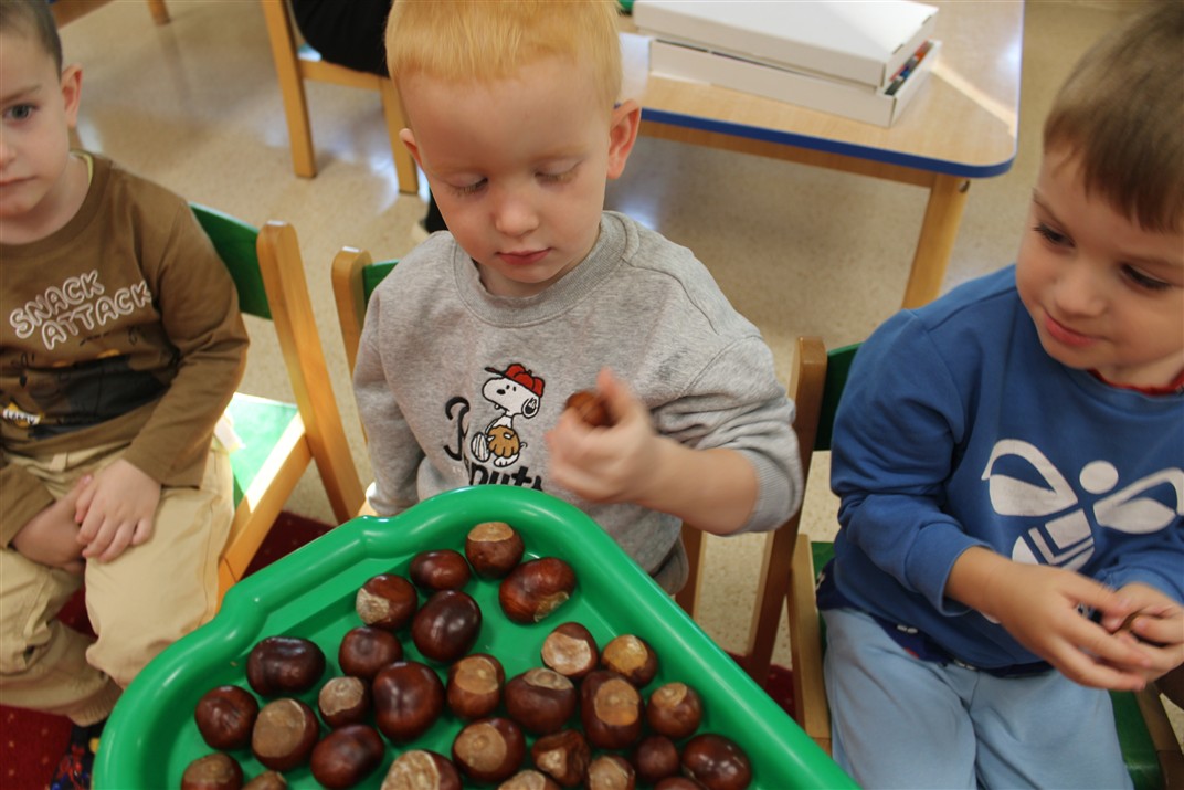 W naszym przedszkolu w piątek 3 października dzieci z grupy Myszek i Żabek obchodziły wyjątkowe święto – Dzień Kasztana. Już od rana w salach pojawiły się dekoracje w kolorach jesieni: brązowe, złote i pomarańczowe liście, a także kosze pełne kasztanów. Dzieci przyszły ubrane w odcieniach brązu, dzięki czemu wyglądały jak małe kasztanki. Świętowanie rozpoczęliśmy od wspólnych rozmów o tym, skąd biorą się kasztany i jak wyglądają drzewa kasztanowca. Następnie dzieci mogły dotykać, przesypywać i układać kasztany – ćwicząc spostrzegawczość oraz zdolności manualne. Nie zabrakło także zabaw ruchowych, takich jak: przenoszenie kasztanów łyżeczką na czas, turlanie kasztanków po wyznaczonej trasie. Podczas zajęć dzieci dowiedziały się także, że kasztany to nie tylko piękne dary jesieni, ale i pomoc w zabawach, ćwiczeniach oraz tworzeniu dekoracji. Dzień Kasztana był pełen uśmiechów, radości i jesiennej atmosfery, a kasztany na pewno jeszcze długo będą towarzyszyć dzieciom w zabawach.