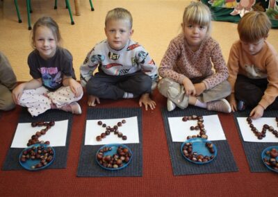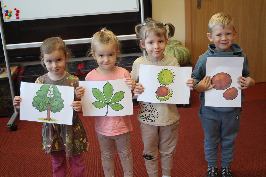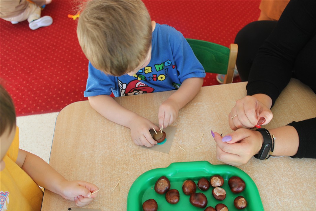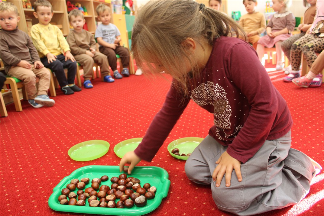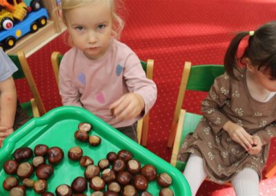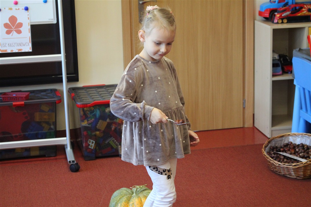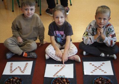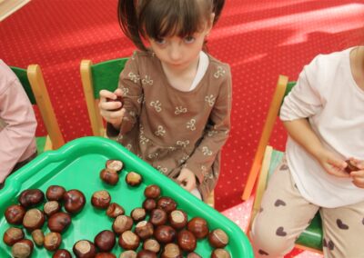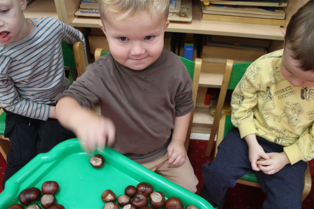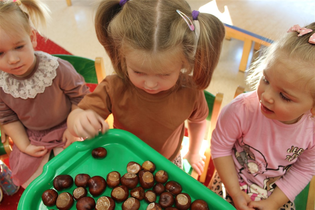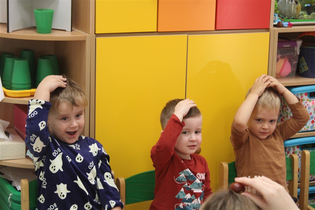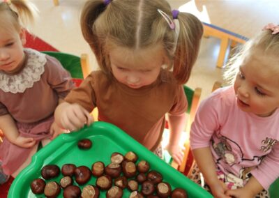 W naszym przedszkolu w piątek 3 października dzieci z grupy Myszek i Żabek obchodziły wyjątkowe święto – Dzień Kasztana. Już od rana w salach pojawiły się dekoracje w kolorach jesieni: brązowe, złote i pomarańczowe liście, a także kosze pełne kasztanów. Dzieci przyszły ubrane w odcieniach brązu, dzięki czemu wyglądały jak małe kasztanki. Świętowanie rozpoczęliśmy od wspólnych rozmów o tym, skąd biorą się kasztany i jak wyglądają drzewa kasztanowca. Następnie dzieci mogły dotykać, przesypywać i układać kasztany – ćwicząc spostrzegawczość oraz zdolności manualne. Nie zabrakło także zabaw ruchowych, takich jak: przenoszenie kasztanów łyżeczką na czas, turlanie kasztanków po wyznaczonej trasie. Podczas zajęć dzieci dowiedziały się także, że kasztany to nie tylko piękne dary jesieni, ale i pomoc w zabawach, ćwiczeniach oraz tworzeniu dekoracji. Dzień Kasztana był pełen uśmiechów, radości i jesiennej atmosfery, a kasztany na pewno jeszcze długo będą towarzyszyć dzieciom w zabawach.