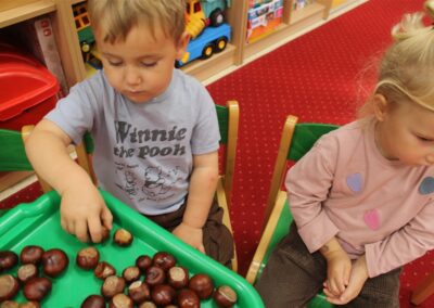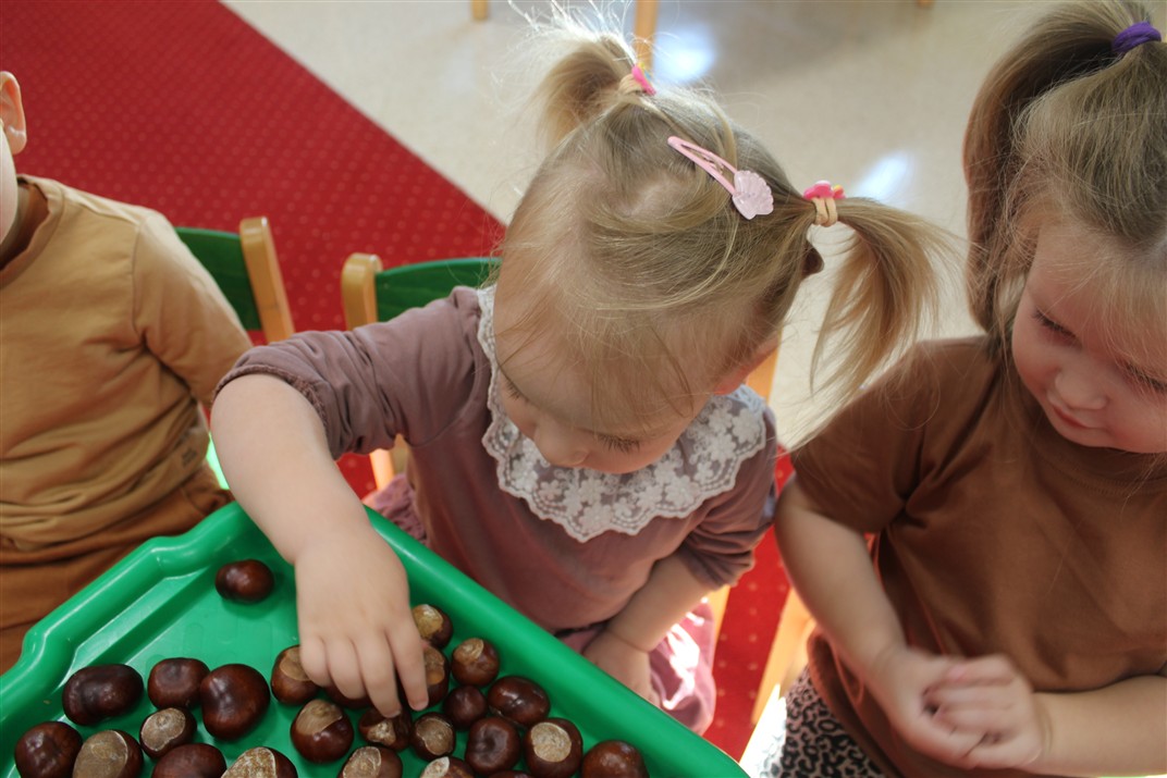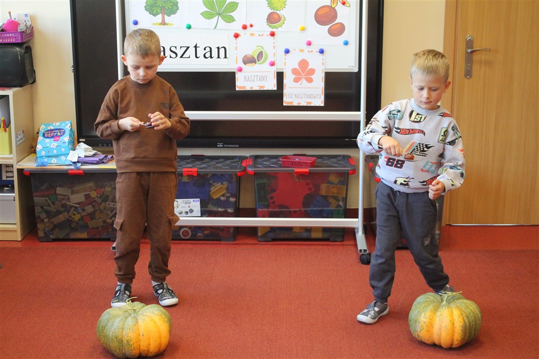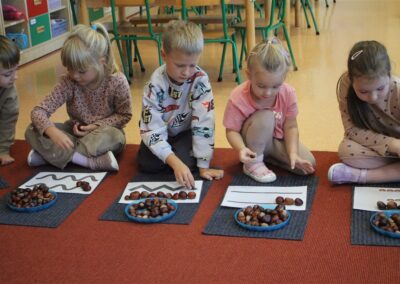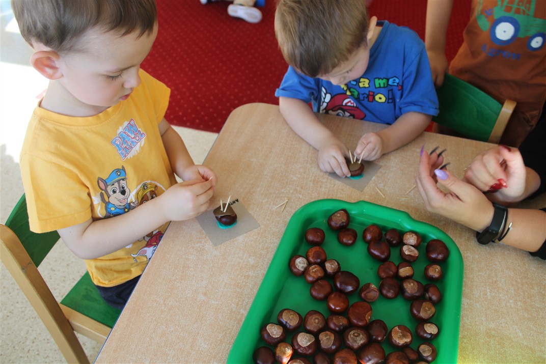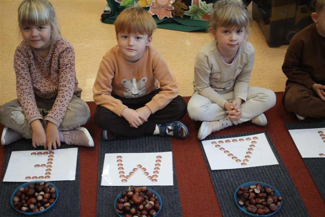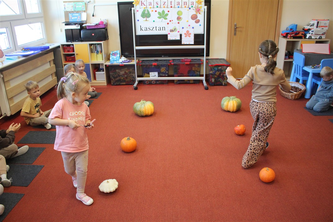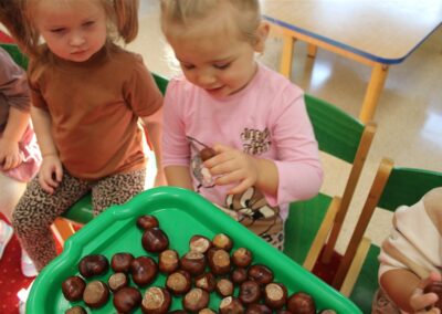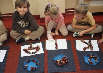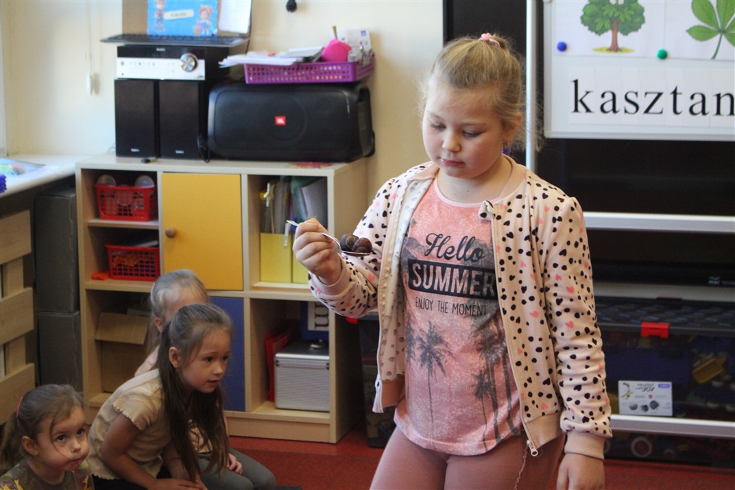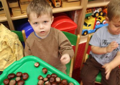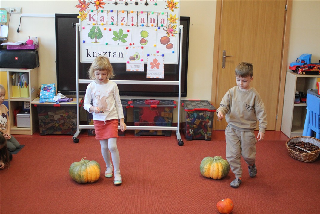 W naszym przedszkolu w piątek 3 października dzieci z grupy Myszek i Żabek obchodziły wyjątkowe święto – Dzień Kasztana. Już od rana w salach pojawiły się dekoracje w kolorach jesieni: brązowe, złote i pomarańczowe liście, a także kosze pełne kasztanów. Dzieci przyszły ubrane w odcieniach brązu, dzięki czemu wyglądały jak małe kasztanki. Świętowanie rozpoczęliśmy od wspólnych rozmów o tym, skąd biorą się kasztany i jak wyglądają drzewa kasztanowca. Następnie dzieci mogły dotykać, przesypywać i układać kasztany – ćwicząc spostrzegawczość oraz zdolności manualne. Nie zabrakło także zabaw ruchowych, takich jak: przenoszenie kasztanów łyżeczką na czas, turlanie kasztanków po wyznaczonej trasie. Podczas zajęć dzieci dowiedziały się także, że kasztany to nie tylko piękne dary jesieni, ale i pomoc w zabawach, ćwiczeniach oraz tworzeniu dekoracji. Dzień Kasztana był pełen uśmiechów, radości i jesiennej atmosfery, a kasztany na pewno jeszcze długo będą towarzyszyć dzieciom w zabawach.