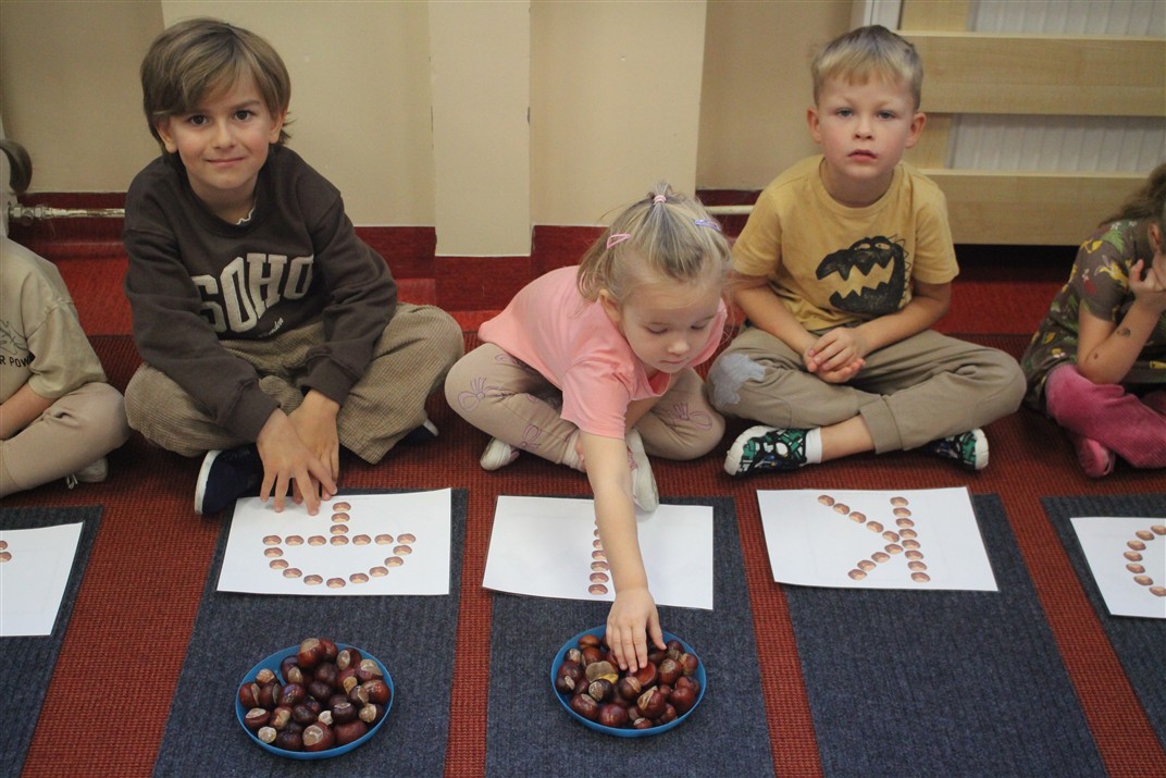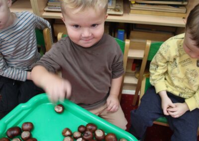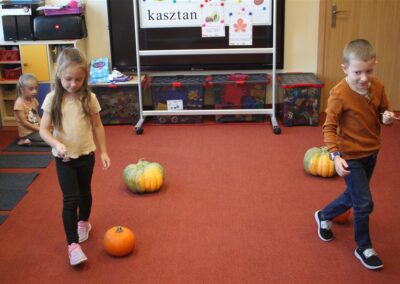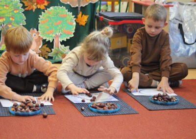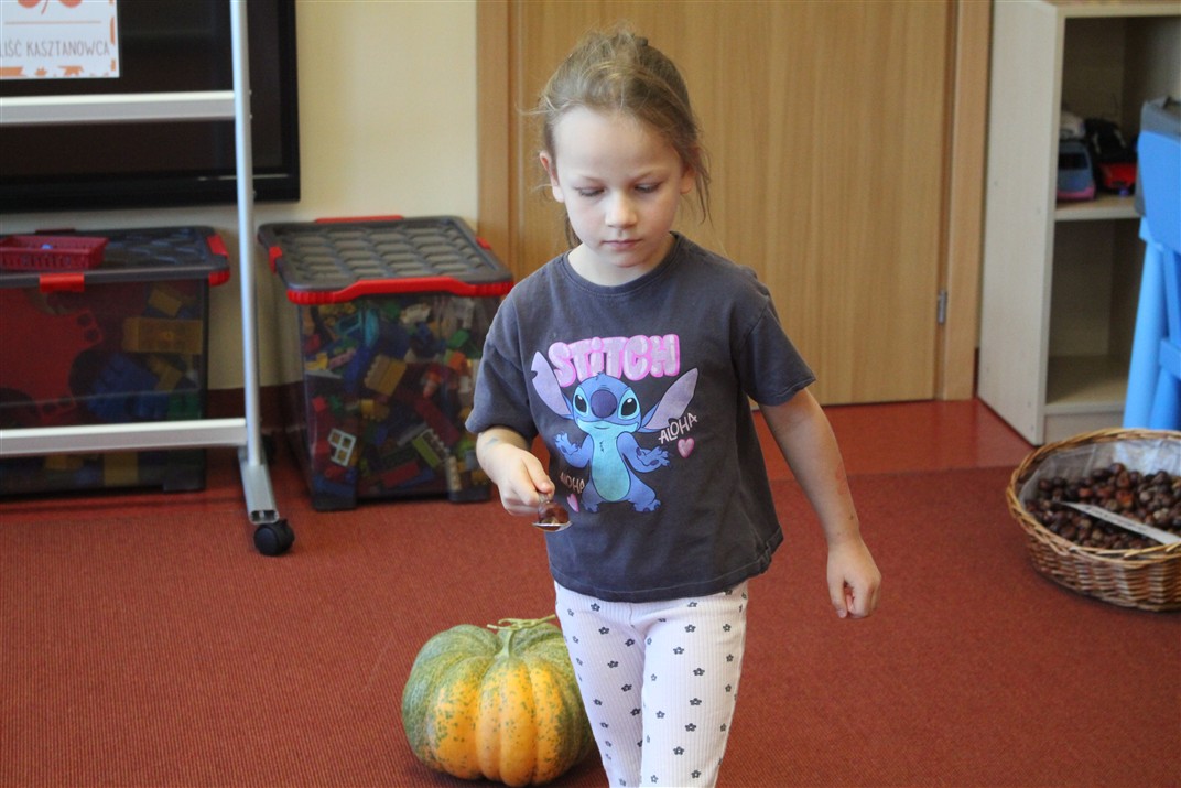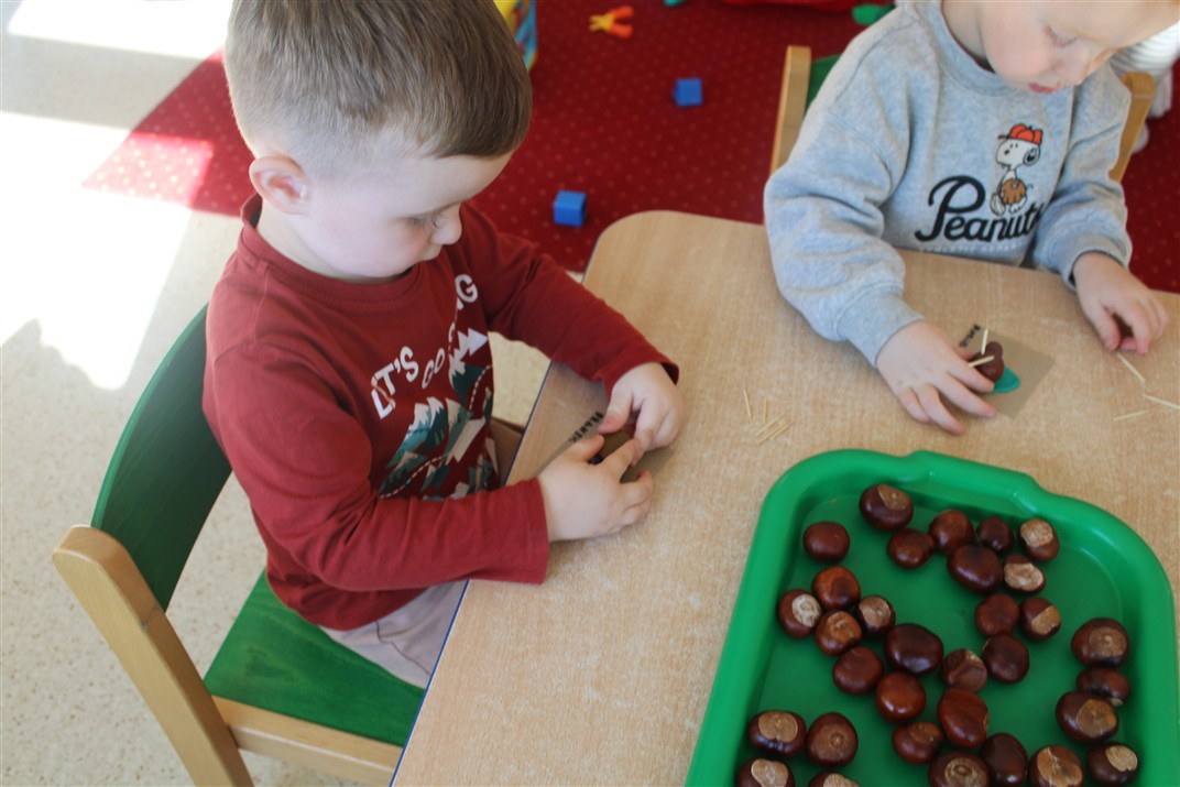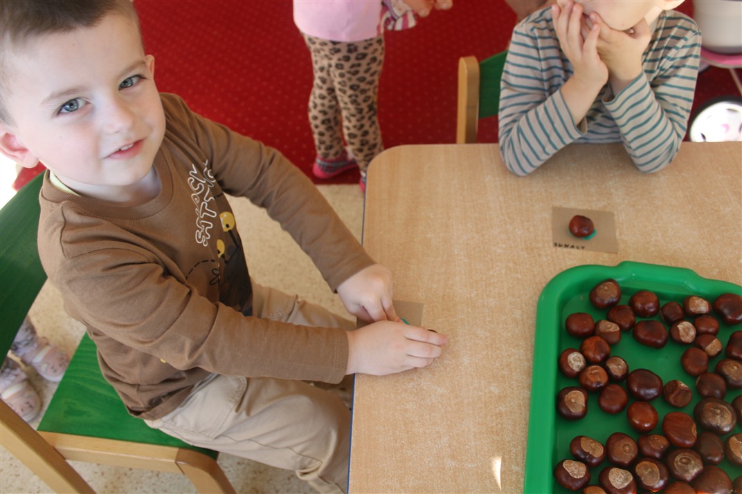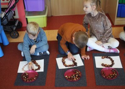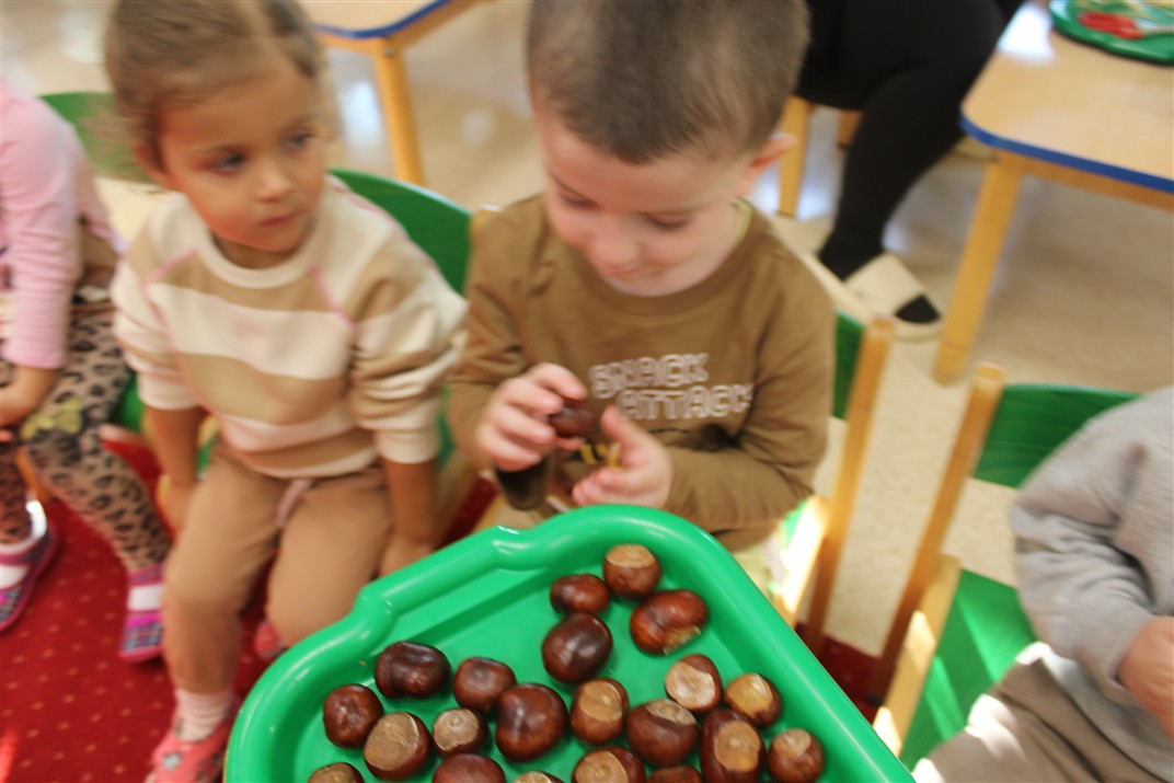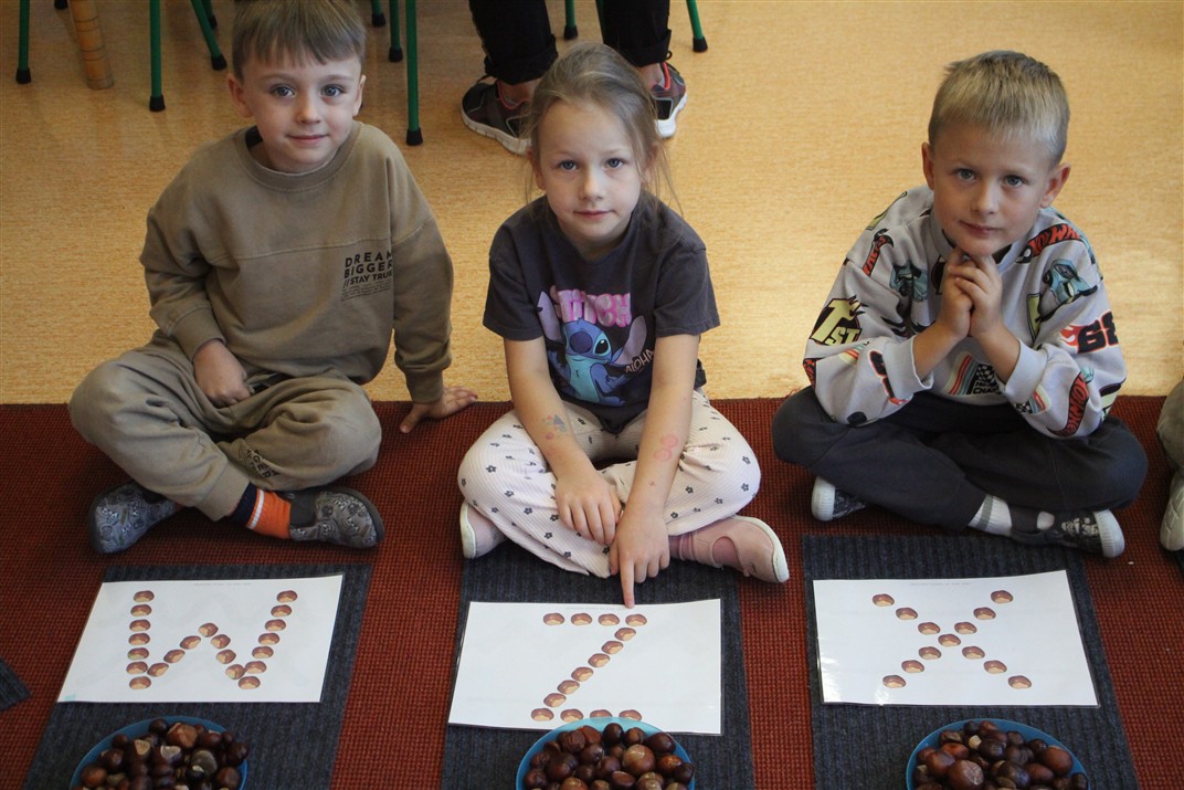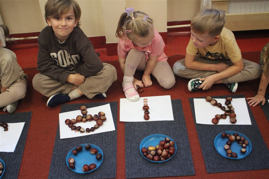 W naszym przedszkolu w piątek 3 października dzieci z grupy Myszek i Żabek obchodziły wyjątkowe święto – Dzień Kasztana. Już od rana w salach pojawiły się dekoracje w kolorach jesieni: brązowe, złote i pomarańczowe liście, a także kosze pełne kasztanów. Dzieci przyszły ubrane w odcieniach brązu, dzięki czemu wyglądały jak małe kasztanki. Świętowanie rozpoczęliśmy od wspólnych rozmów o tym, skąd biorą się kasztany i jak wyglądają drzewa kasztanowca. Następnie dzieci mogły dotykać, przesypywać i układać kasztany – ćwicząc spostrzegawczość oraz zdolności manualne. Nie zabrakło także zabaw ruchowych, takich jak: przenoszenie kasztanów łyżeczką na czas, turlanie kasztanków po wyznaczonej trasie. Podczas zajęć dzieci dowiedziały się także, że kasztany to nie tylko piękne dary jesieni, ale i pomoc w zabawach, ćwiczeniach oraz tworzeniu dekoracji. Dzień Kasztana był pełen uśmiechów, radości i jesiennej atmosfery, a kasztany na pewno jeszcze długo będą towarzyszyć dzieciom w zabawach.