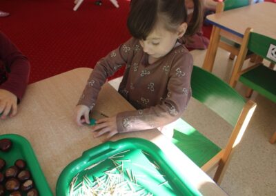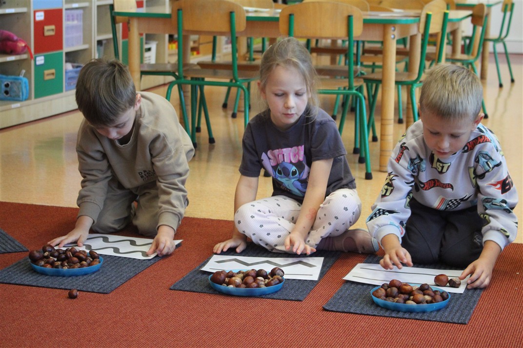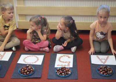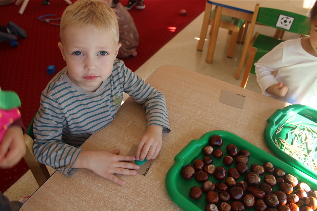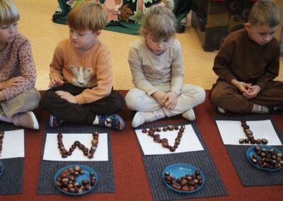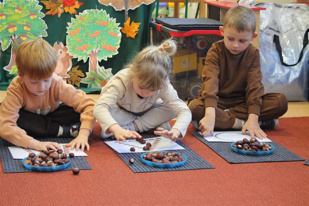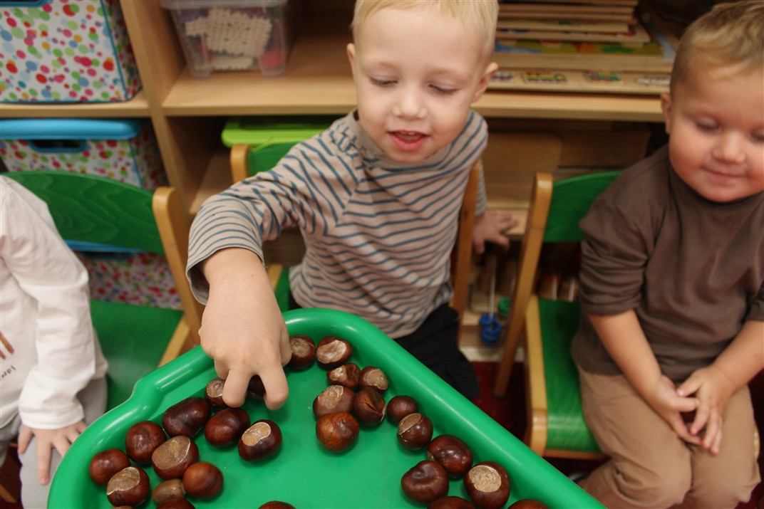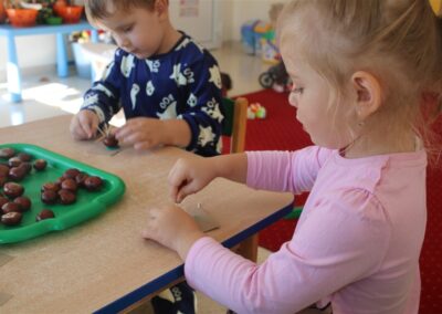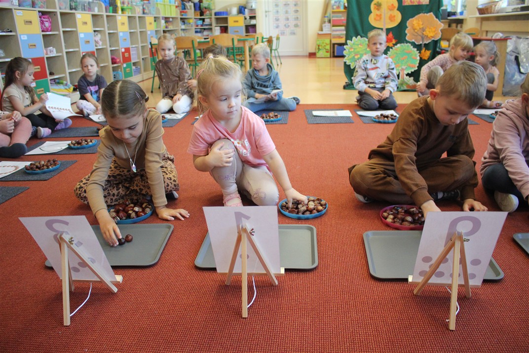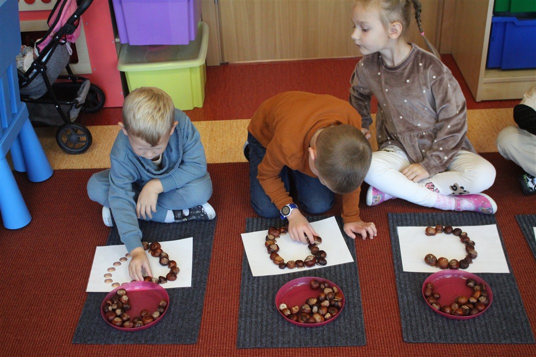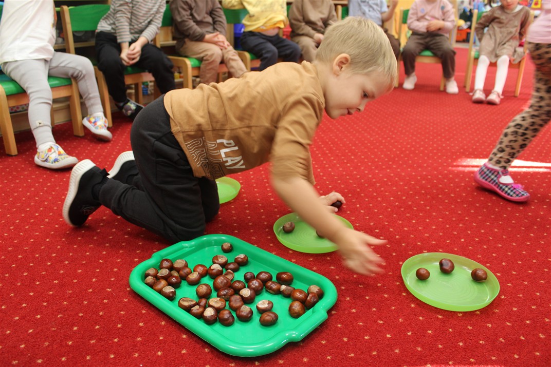 W naszym przedszkolu w piątek 3 października dzieci z grupy Myszek i Żabek obchodziły wyjątkowe święto – Dzień Kasztana. Już od rana w salach pojawiły się dekoracje w kolorach jesieni: brązowe, złote i pomarańczowe liście, a także kosze pełne kasztanów. Dzieci przyszły ubrane w odcieniach brązu, dzięki czemu wyglądały jak małe kasztanki. Świętowanie rozpoczęliśmy od wspólnych rozmów o tym, skąd biorą się kasztany i jak wyglądają drzewa kasztanowca. Następnie dzieci mogły dotykać, przesypywać i układać kasztany – ćwicząc spostrzegawczość oraz zdolności manualne. Nie zabrakło także zabaw ruchowych, takich jak: przenoszenie kasztanów łyżeczką na czas, turlanie kasztanków po wyznaczonej trasie. Podczas zajęć dzieci dowiedziały się także, że kasztany to nie tylko piękne dary jesieni, ale i pomoc w zabawach, ćwiczeniach oraz tworzeniu dekoracji. Dzień Kasztana był pełen uśmiechów, radości i jesiennej atmosfery, a kasztany na pewno jeszcze długo będą towarzyszyć dzieciom w zabawach.