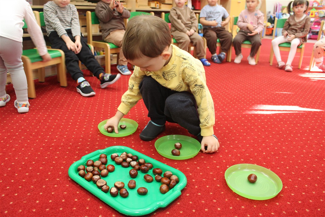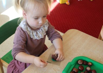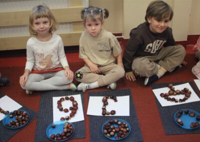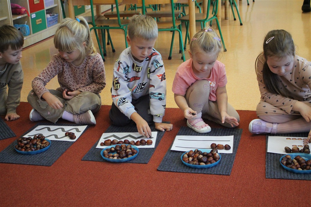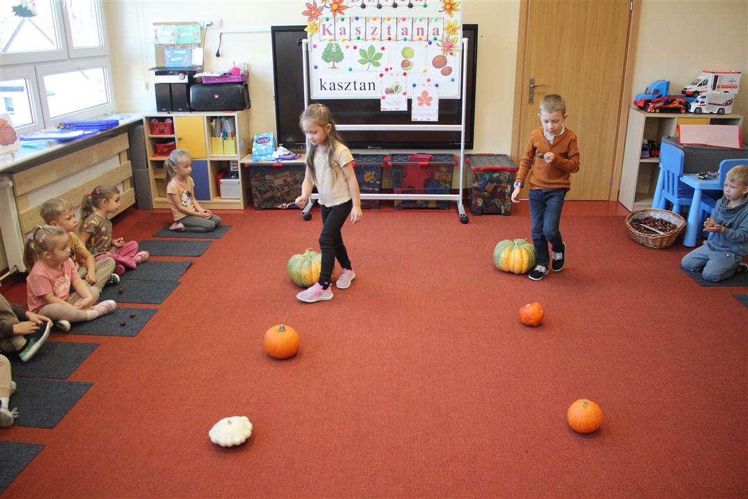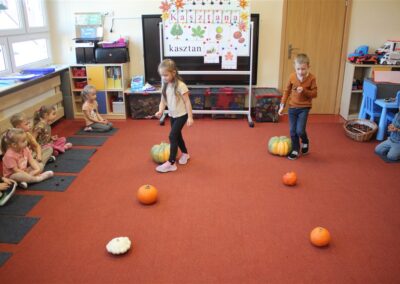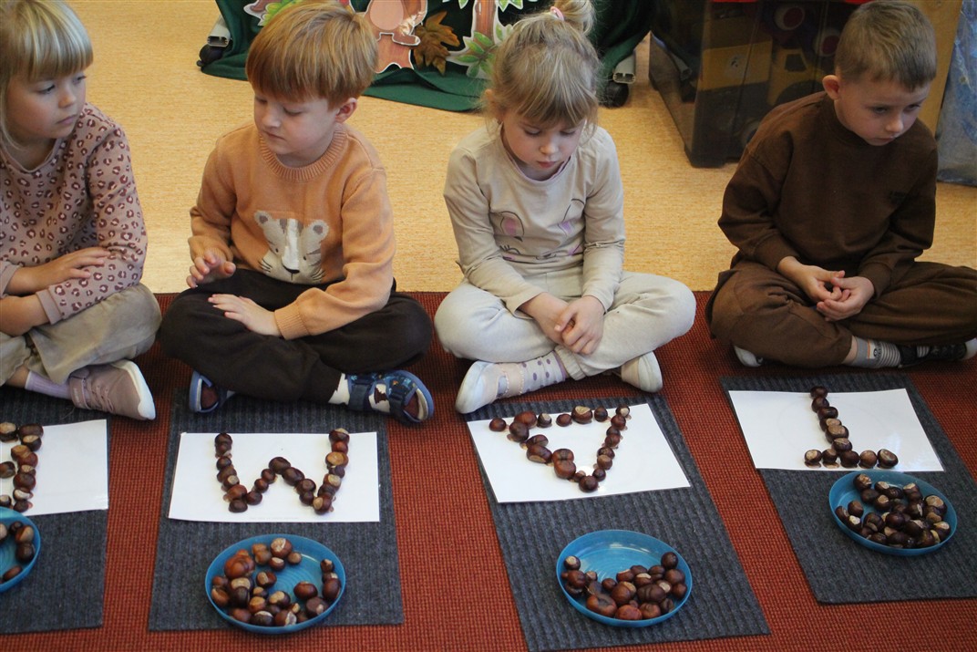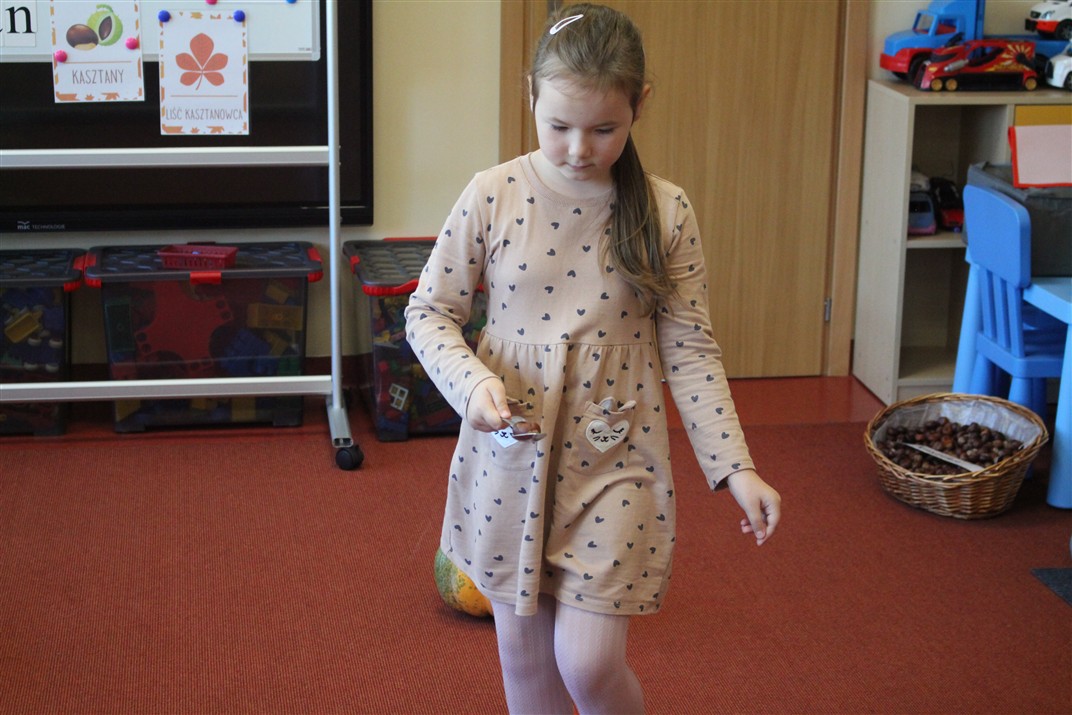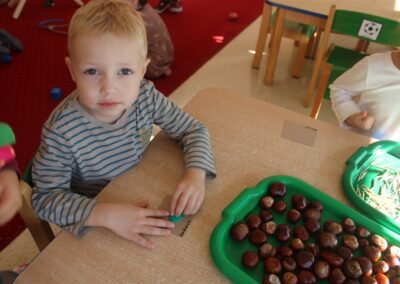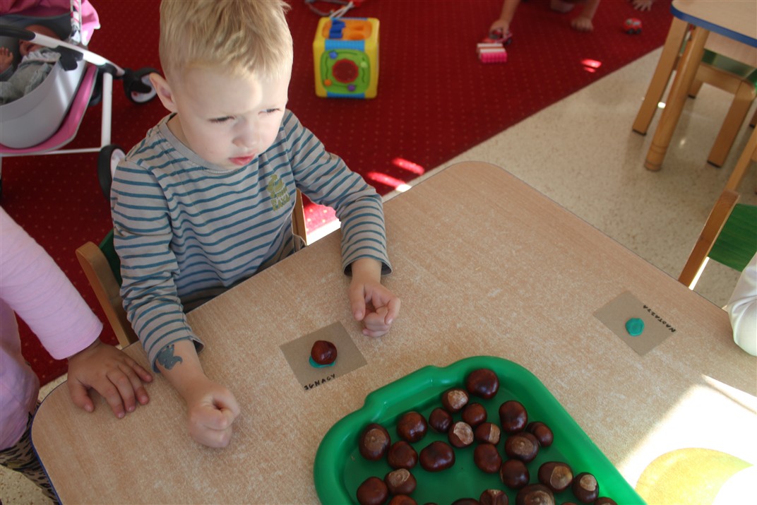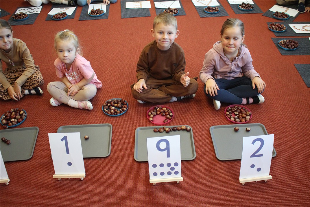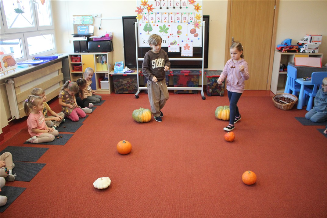 W naszym przedszkolu w piątek 3 października dzieci z grupy Myszek i Żabek obchodziły wyjątkowe święto – Dzień Kasztana. Już od rana w salach pojawiły się dekoracje w kolorach jesieni: brązowe, złote i pomarańczowe liście, a także kosze pełne kasztanów. Dzieci przyszły ubrane w odcieniach brązu, dzięki czemu wyglądały jak małe kasztanki. Świętowanie rozpoczęliśmy od wspólnych rozmów o tym, skąd biorą się kasztany i jak wyglądają drzewa kasztanowca. Następnie dzieci mogły dotykać, przesypywać i układać kasztany – ćwicząc spostrzegawczość oraz zdolności manualne. Nie zabrakło także zabaw ruchowych, takich jak: przenoszenie kasztanów łyżeczką na czas, turlanie kasztanków po wyznaczonej trasie. Podczas zajęć dzieci dowiedziały się także, że kasztany to nie tylko piękne dary jesieni, ale i pomoc w zabawach, ćwiczeniach oraz tworzeniu dekoracji. Dzień Kasztana był pełen uśmiechów, radości i jesiennej atmosfery, a kasztany na pewno jeszcze długo będą towarzyszyć dzieciom w zabawach.