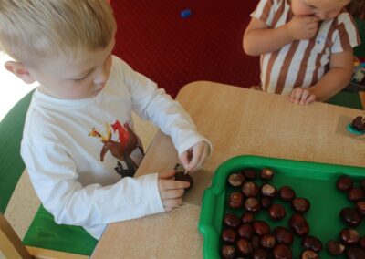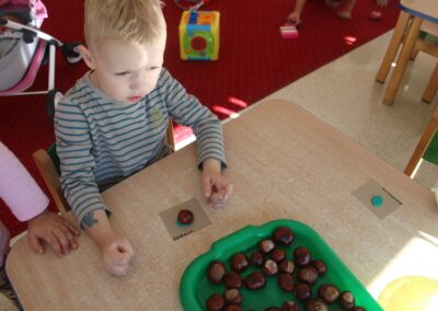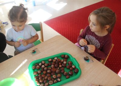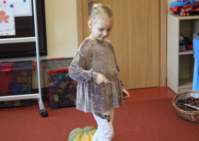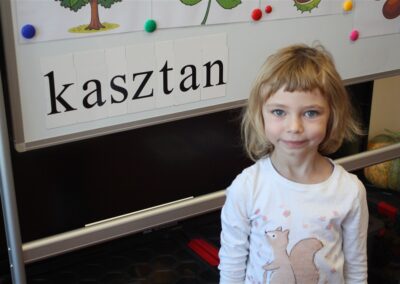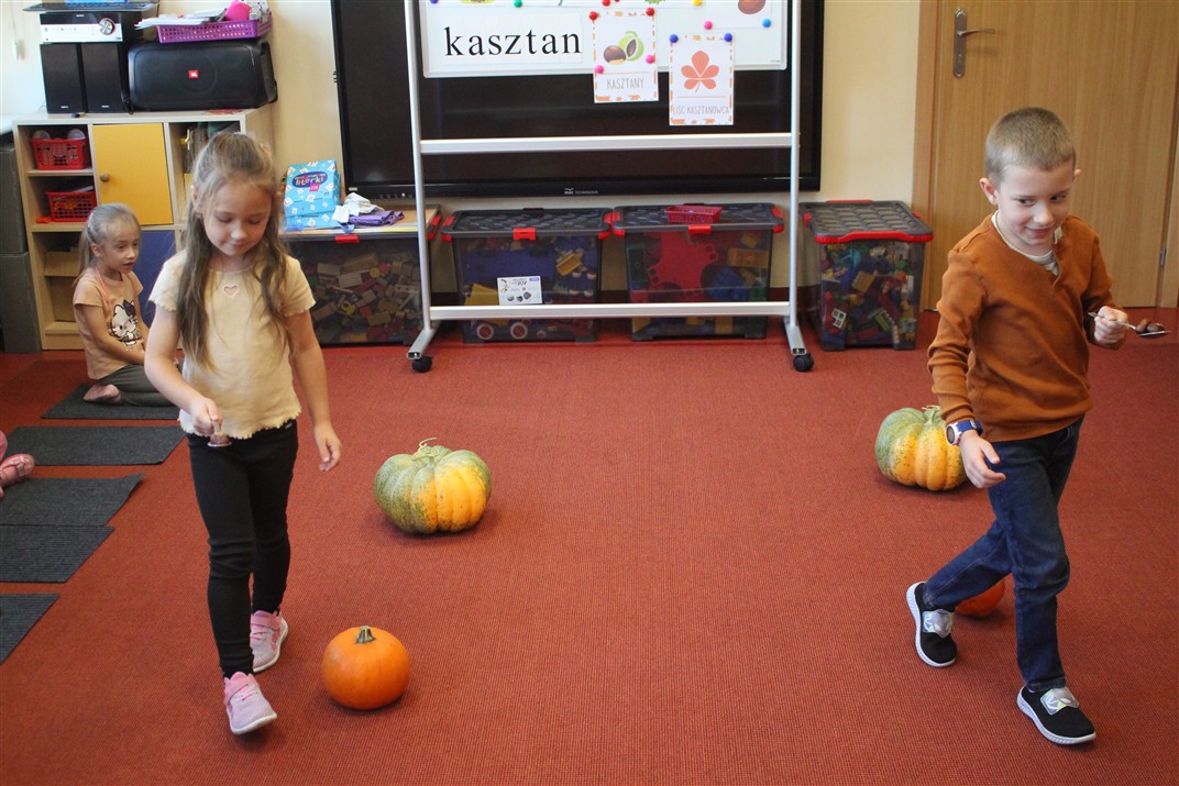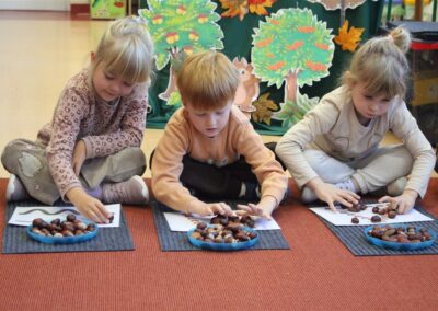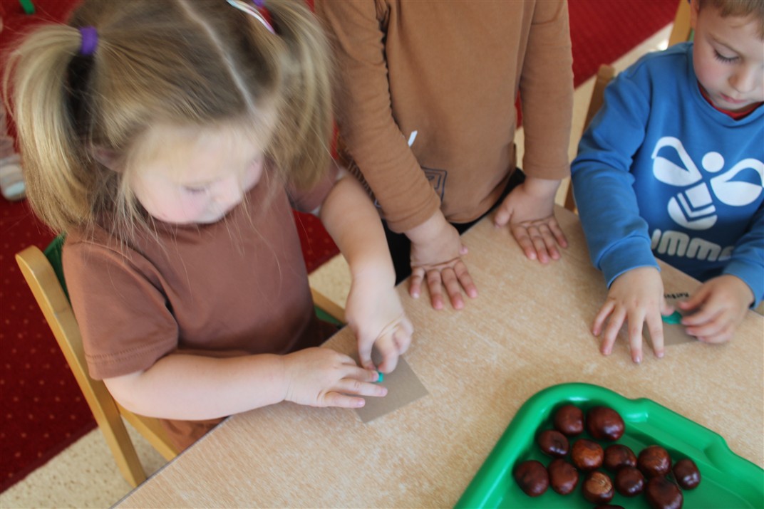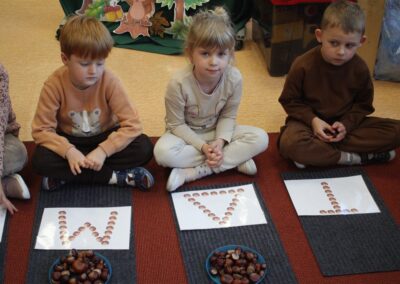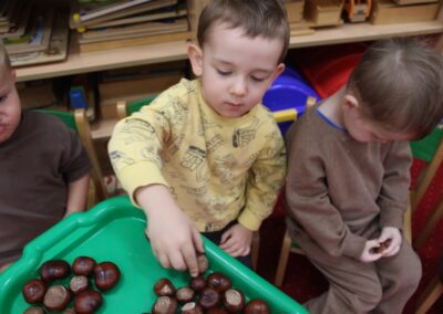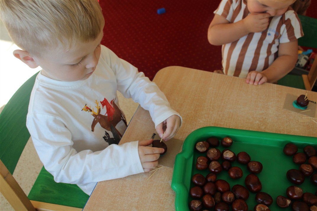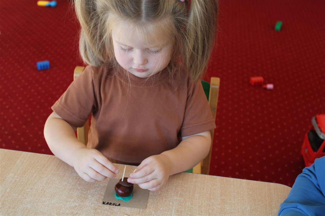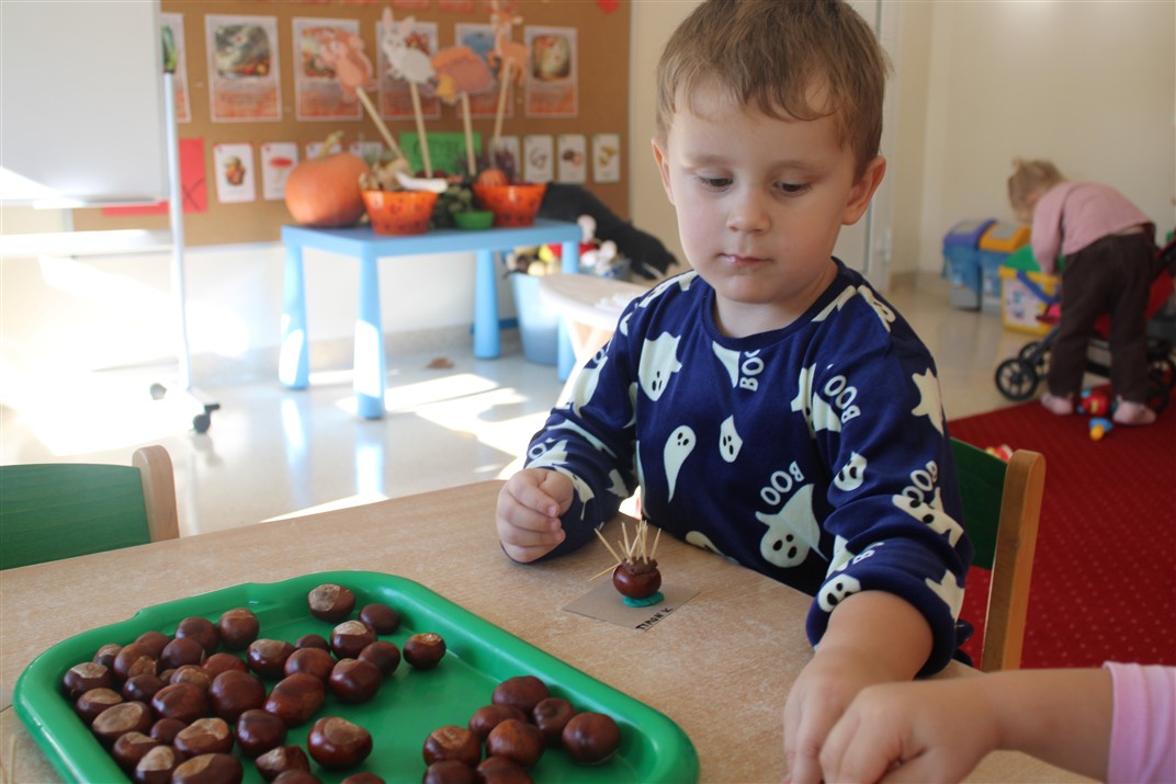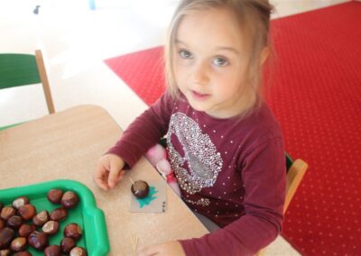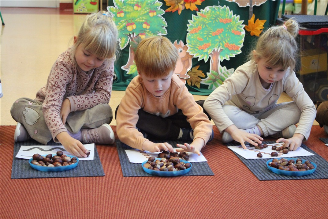 W naszym przedszkolu w piątek 3 października dzieci z grupy Myszek i Żabek obchodziły wyjątkowe święto – Dzień Kasztana. Już od rana w salach pojawiły się dekoracje w kolorach jesieni: brązowe, złote i pomarańczowe liście, a także kosze pełne kasztanów. Dzieci przyszły ubrane w odcieniach brązu, dzięki czemu wyglądały jak małe kasztanki. Świętowanie rozpoczęliśmy od wspólnych rozmów o tym, skąd biorą się kasztany i jak wyglądają drzewa kasztanowca. Następnie dzieci mogły dotykać, przesypywać i układać kasztany – ćwicząc spostrzegawczość oraz zdolności manualne. Nie zabrakło także zabaw ruchowych, takich jak: przenoszenie kasztanów łyżeczką na czas, turlanie kasztanków po wyznaczonej trasie. Podczas zajęć dzieci dowiedziały się także, że kasztany to nie tylko piękne dary jesieni, ale i pomoc w zabawach, ćwiczeniach oraz tworzeniu dekoracji. Dzień Kasztana był pełen uśmiechów, radości i jesiennej atmosfery, a kasztany na pewno jeszcze długo będą towarzyszyć dzieciom w zabawach.