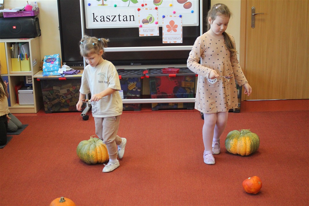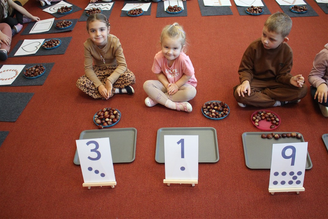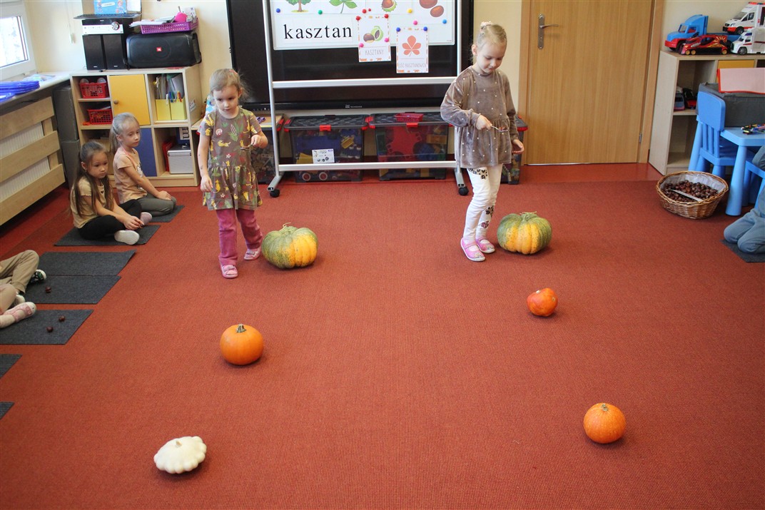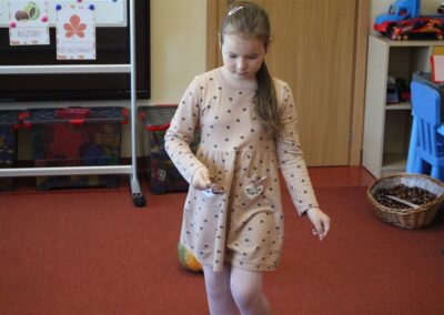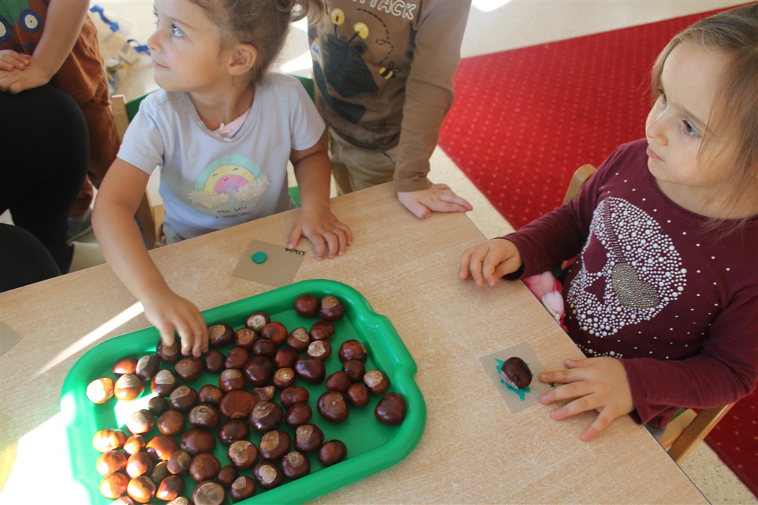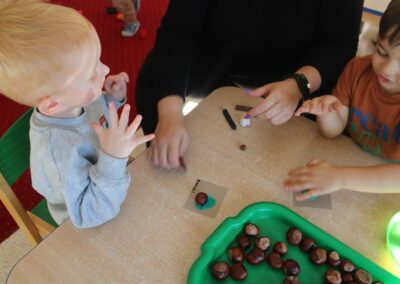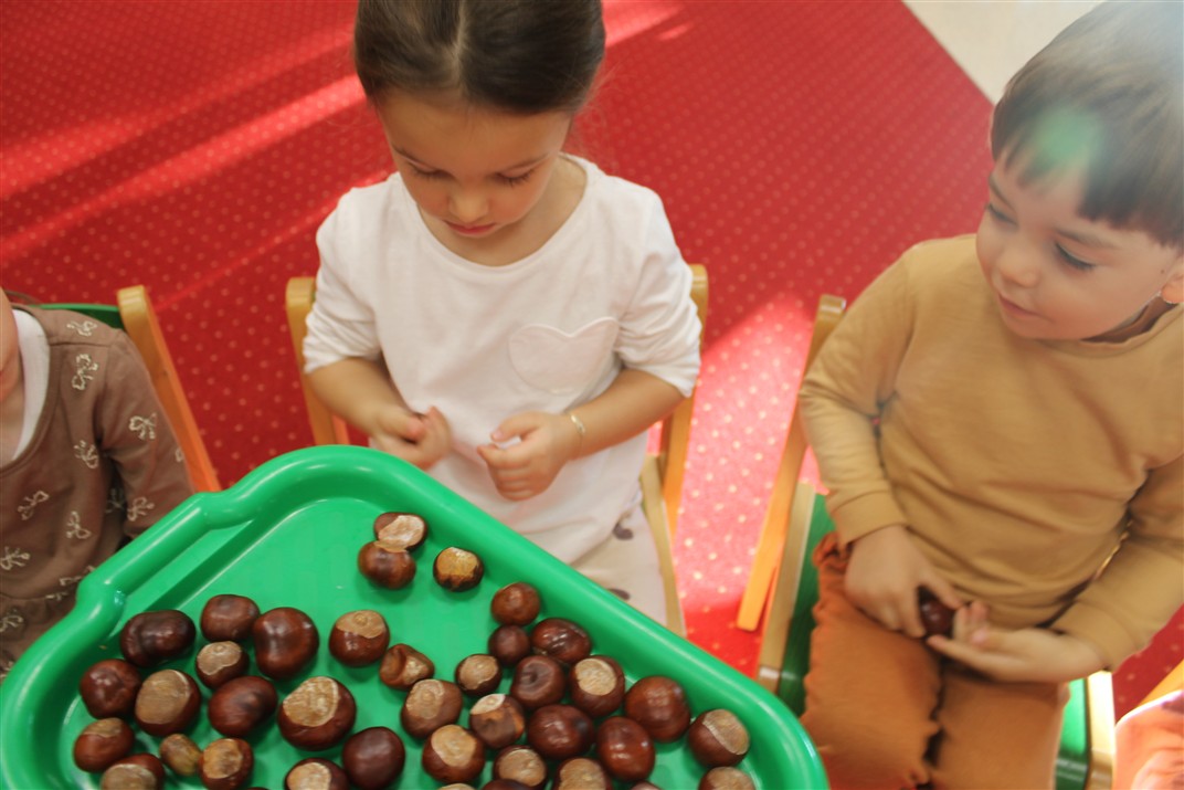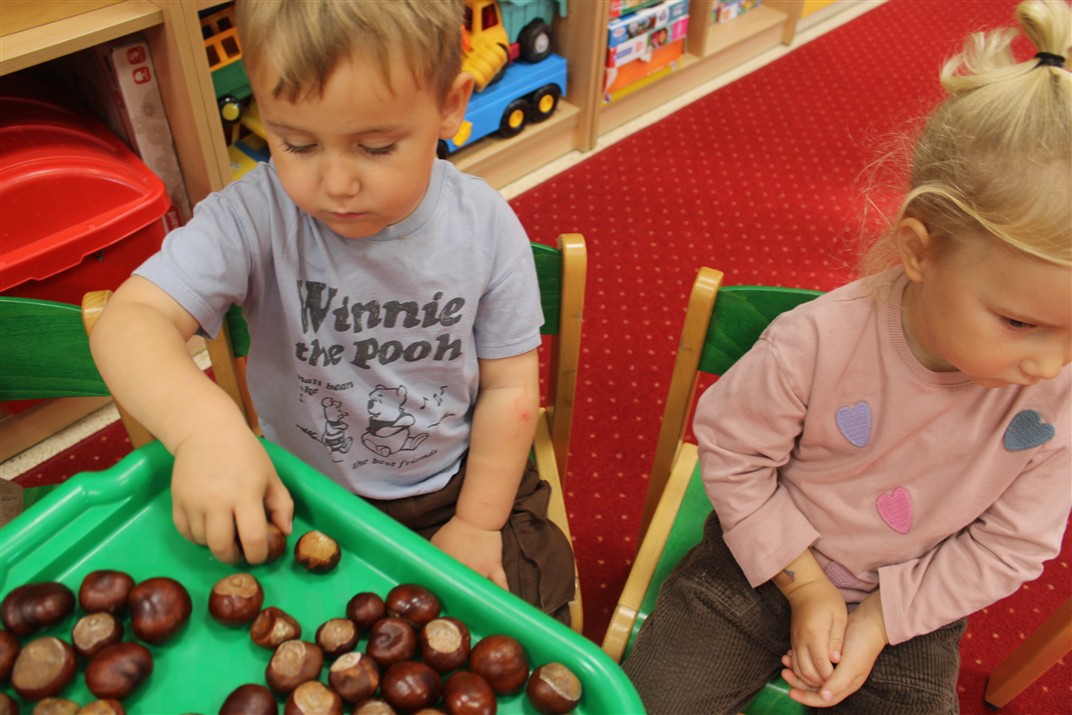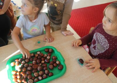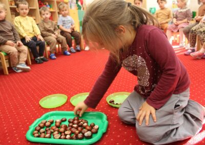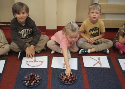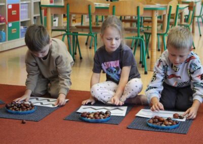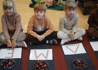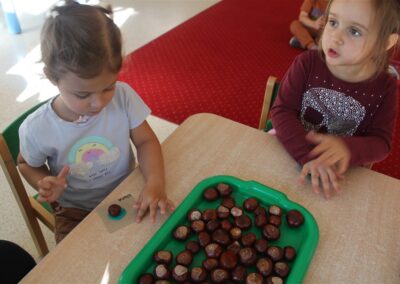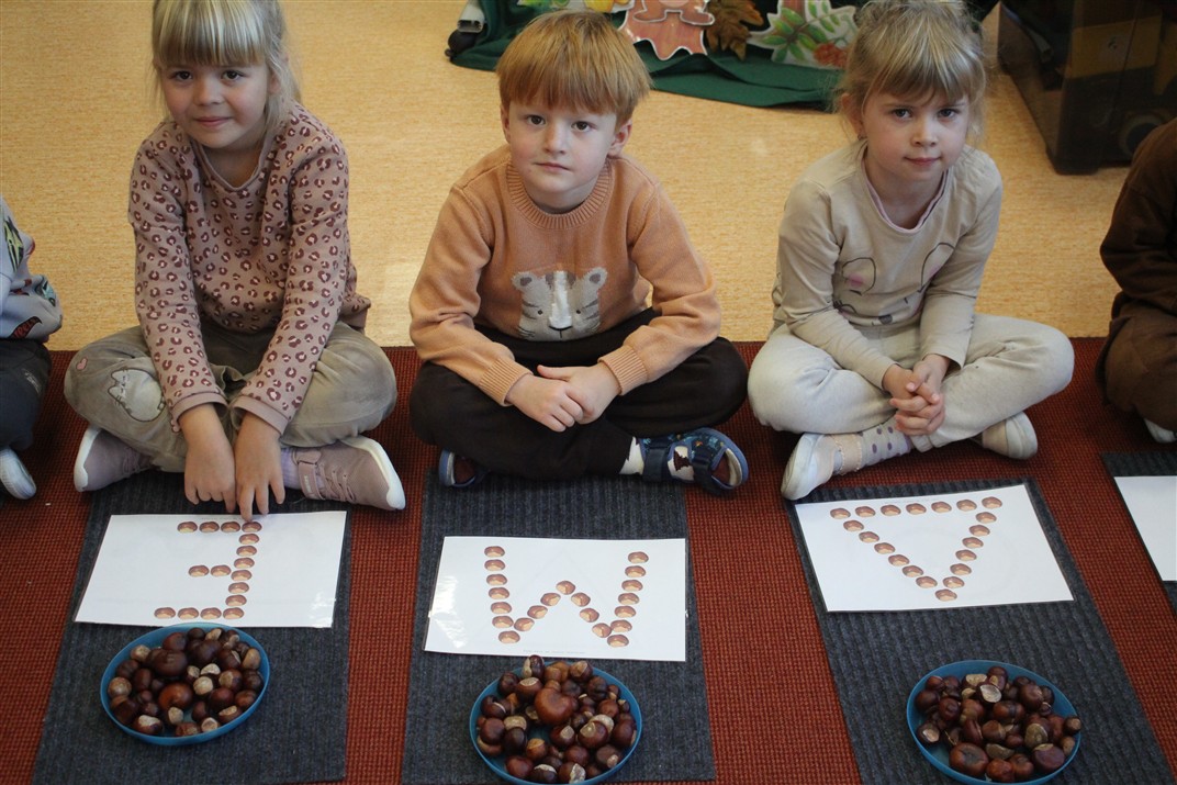 W naszym przedszkolu w piątek 3 października dzieci z grupy Myszek i Żabek obchodziły wyjątkowe święto – Dzień Kasztana. Już od rana w salach pojawiły się dekoracje w kolorach jesieni: brązowe, złote i pomarańczowe liście, a także kosze pełne kasztanów. Dzieci przyszły ubrane w odcieniach brązu, dzięki czemu wyglądały jak małe kasztanki. Świętowanie rozpoczęliśmy od wspólnych rozmów o tym, skąd biorą się kasztany i jak wyglądają drzewa kasztanowca. Następnie dzieci mogły dotykać, przesypywać i układać kasztany – ćwicząc spostrzegawczość oraz zdolności manualne. Nie zabrakło także zabaw ruchowych, takich jak: przenoszenie kasztanów łyżeczką na czas, turlanie kasztanków po wyznaczonej trasie. Podczas zajęć dzieci dowiedziały się także, że kasztany to nie tylko piękne dary jesieni, ale i pomoc w zabawach, ćwiczeniach oraz tworzeniu dekoracji. Dzień Kasztana był pełen uśmiechów, radości i jesiennej atmosfery, a kasztany na pewno jeszcze długo będą towarzyszyć dzieciom w zabawach.