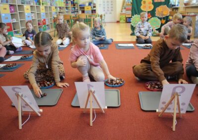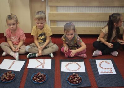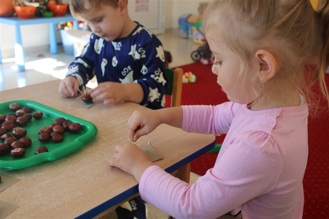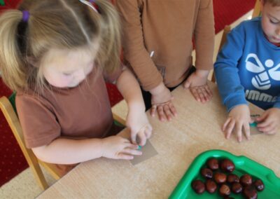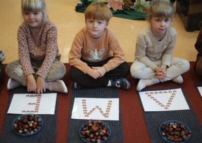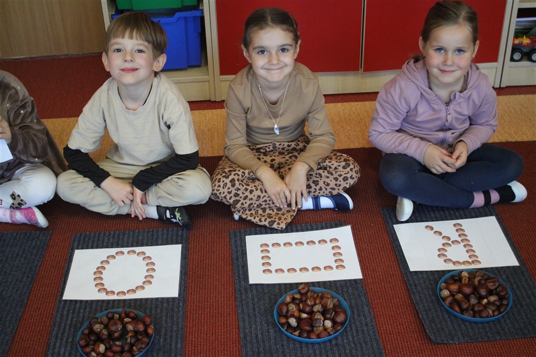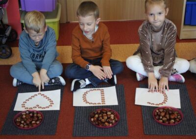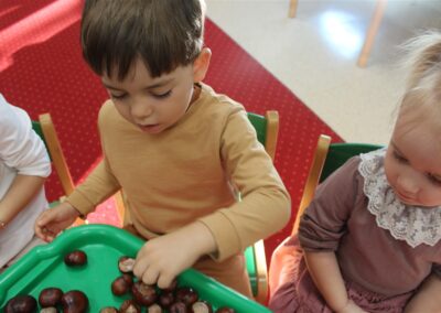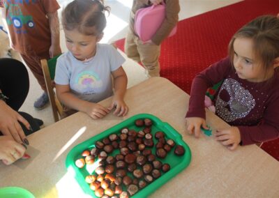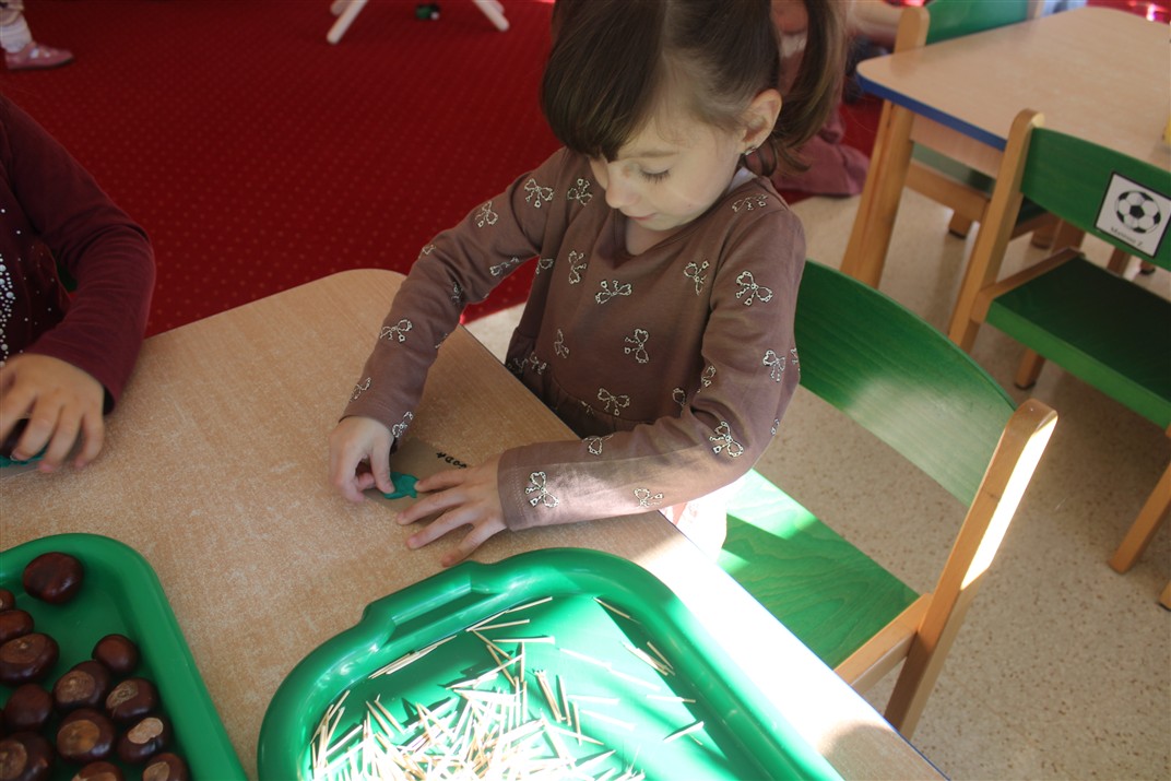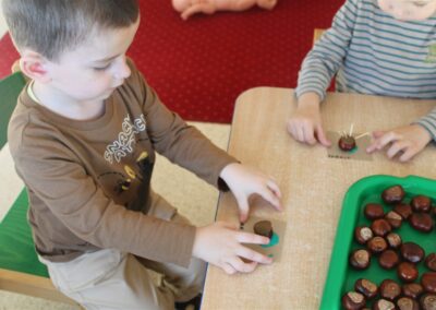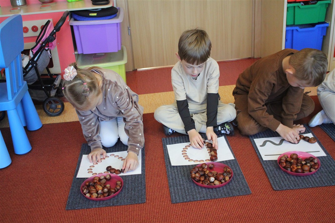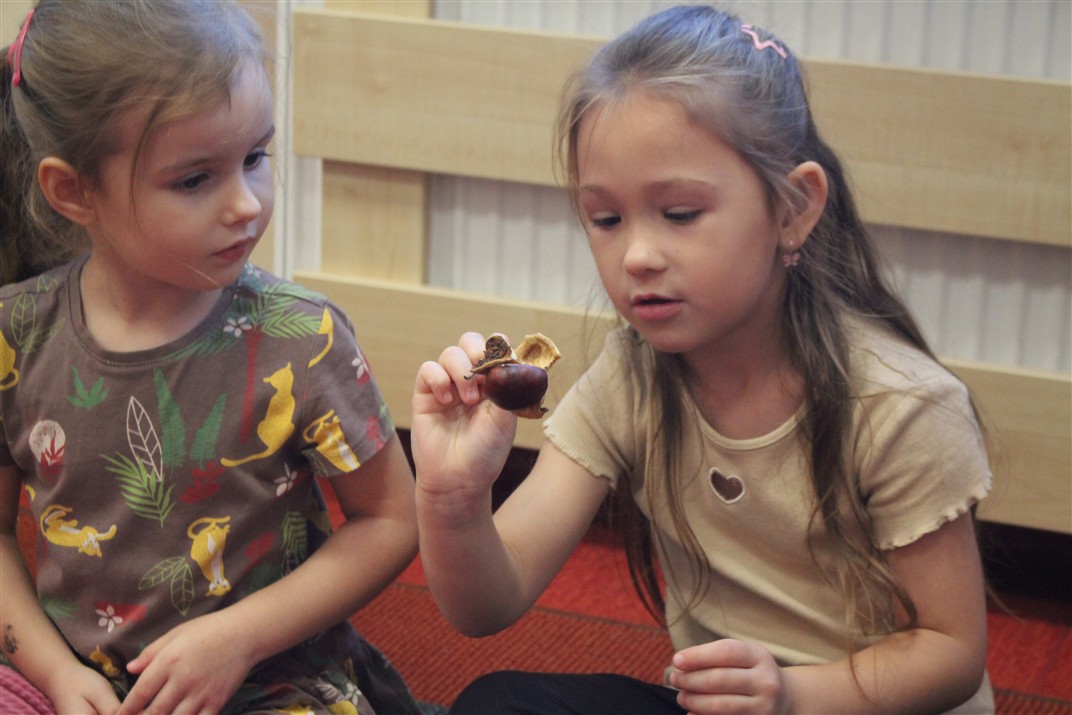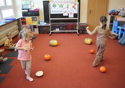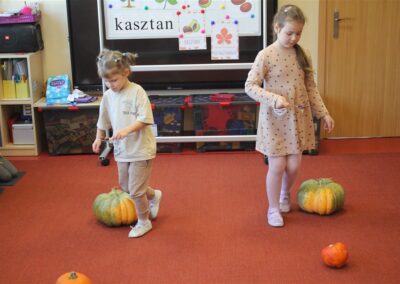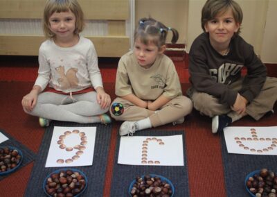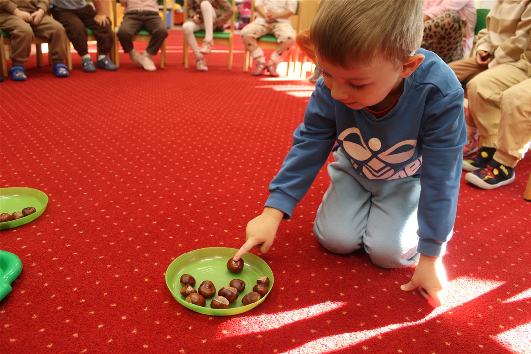 W naszym przedszkolu w piątek 3 października dzieci z grupy Myszek i Żabek obchodziły wyjątkowe święto – Dzień Kasztana. Już od rana w salach pojawiły się dekoracje w kolorach jesieni: brązowe, złote i pomarańczowe liście, a także kosze pełne kasztanów. Dzieci przyszły ubrane w odcieniach brązu, dzięki czemu wyglądały jak małe kasztanki. Świętowanie rozpoczęliśmy od wspólnych rozmów o tym, skąd biorą się kasztany i jak wyglądają drzewa kasztanowca. Następnie dzieci mogły dotykać, przesypywać i układać kasztany – ćwicząc spostrzegawczość oraz zdolności manualne. Nie zabrakło także zabaw ruchowych, takich jak: przenoszenie kasztanów łyżeczką na czas, turlanie kasztanków po wyznaczonej trasie. Podczas zajęć dzieci dowiedziały się także, że kasztany to nie tylko piękne dary jesieni, ale i pomoc w zabawach, ćwiczeniach oraz tworzeniu dekoracji. Dzień Kasztana był pełen uśmiechów, radości i jesiennej atmosfery, a kasztany na pewno jeszcze długo będą towarzyszyć dzieciom w zabawach.