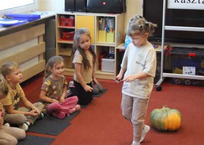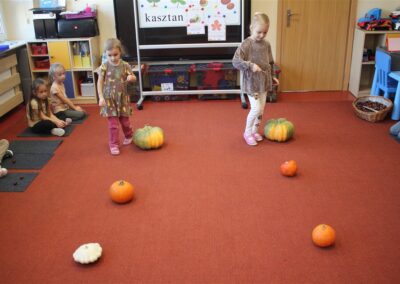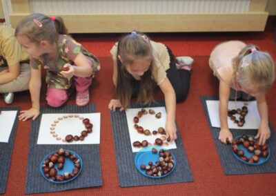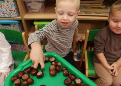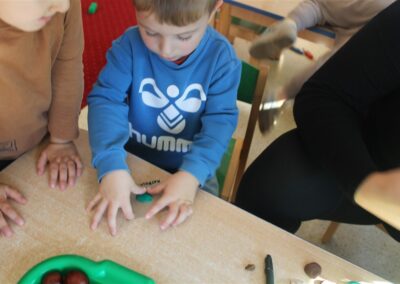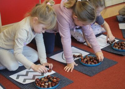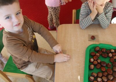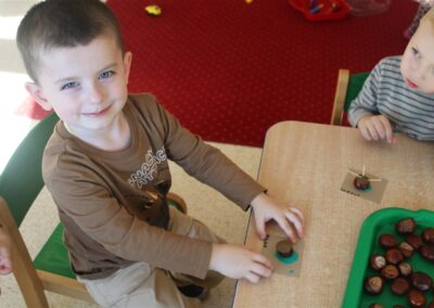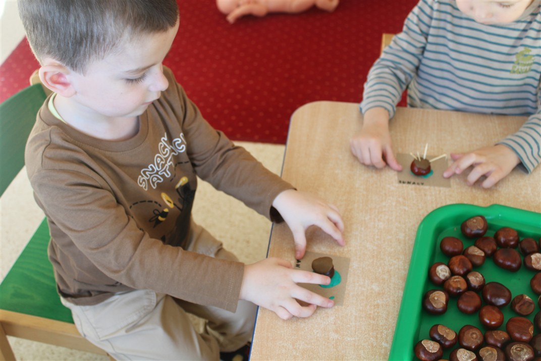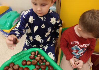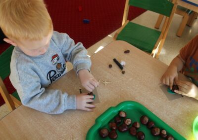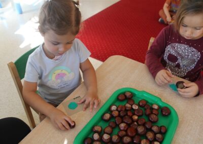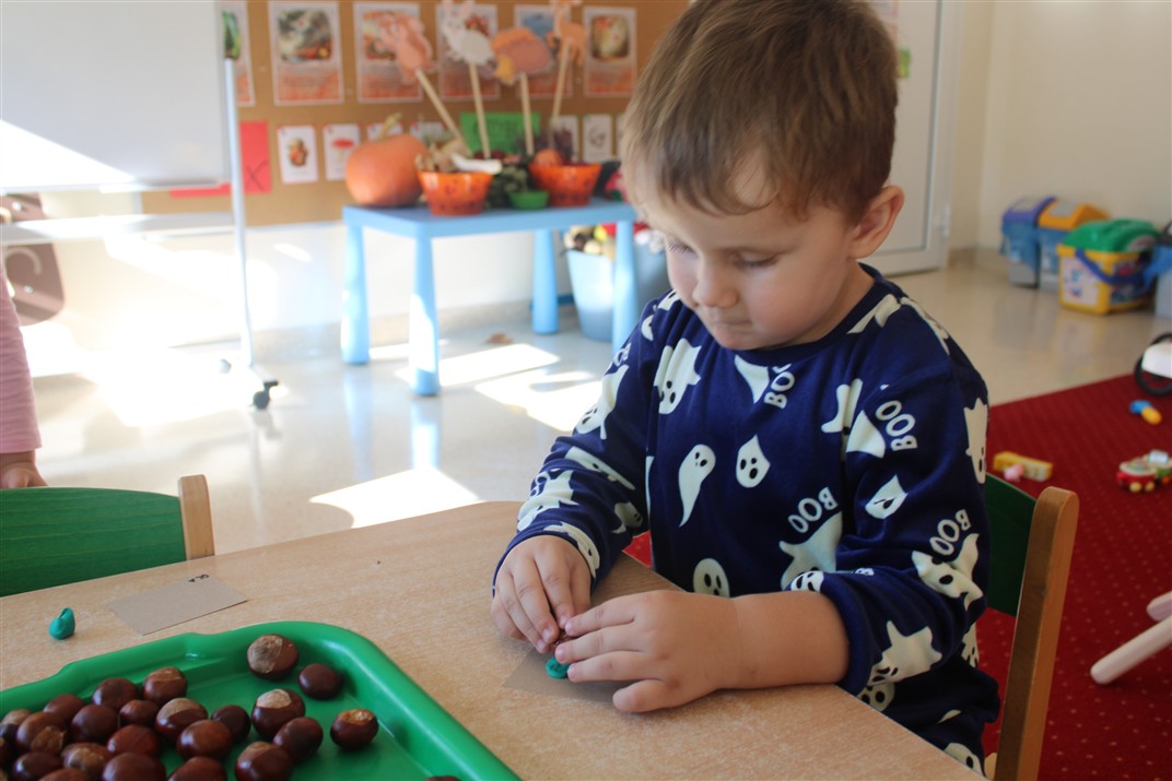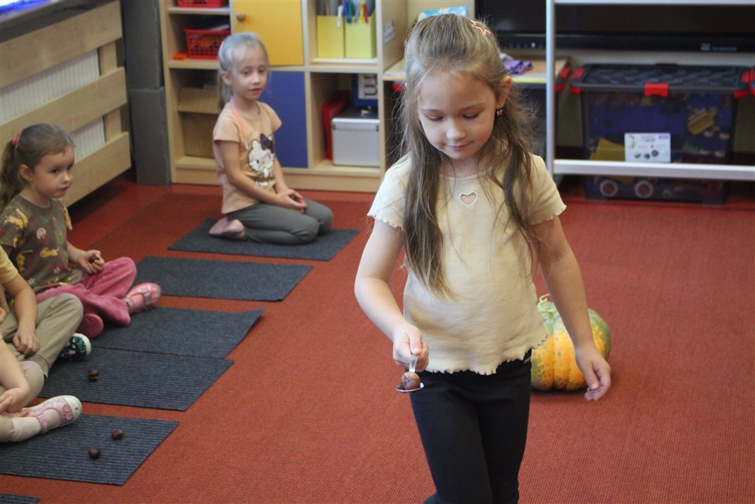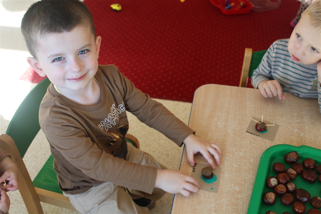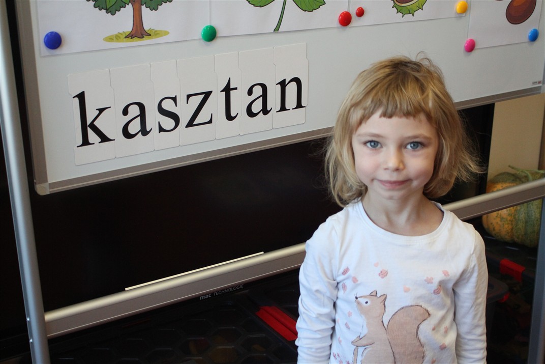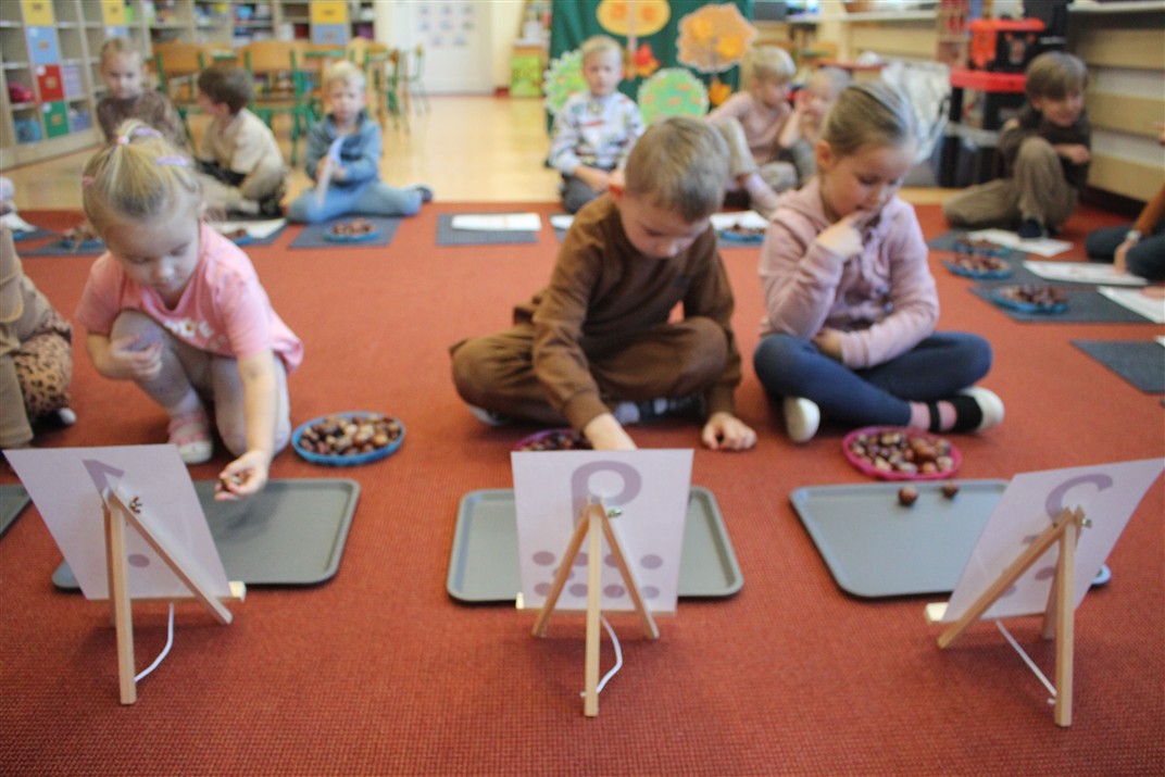 W naszym przedszkolu w piątek 3 października dzieci z grupy Myszek i Żabek obchodziły wyjątkowe święto – Dzień Kasztana. Już od rana w salach pojawiły się dekoracje w kolorach jesieni: brązowe, złote i pomarańczowe liście, a także kosze pełne kasztanów. Dzieci przyszły ubrane w odcieniach brązu, dzięki czemu wyglądały jak małe kasztanki. Świętowanie rozpoczęliśmy od wspólnych rozmów o tym, skąd biorą się kasztany i jak wyglądają drzewa kasztanowca. Następnie dzieci mogły dotykać, przesypywać i układać kasztany – ćwicząc spostrzegawczość oraz zdolności manualne. Nie zabrakło także zabaw ruchowych, takich jak: przenoszenie kasztanów łyżeczką na czas, turlanie kasztanków po wyznaczonej trasie. Podczas zajęć dzieci dowiedziały się także, że kasztany to nie tylko piękne dary jesieni, ale i pomoc w zabawach, ćwiczeniach oraz tworzeniu dekoracji. Dzień Kasztana był pełen uśmiechów, radości i jesiennej atmosfery, a kasztany na pewno jeszcze długo będą towarzyszyć dzieciom w zabawach.