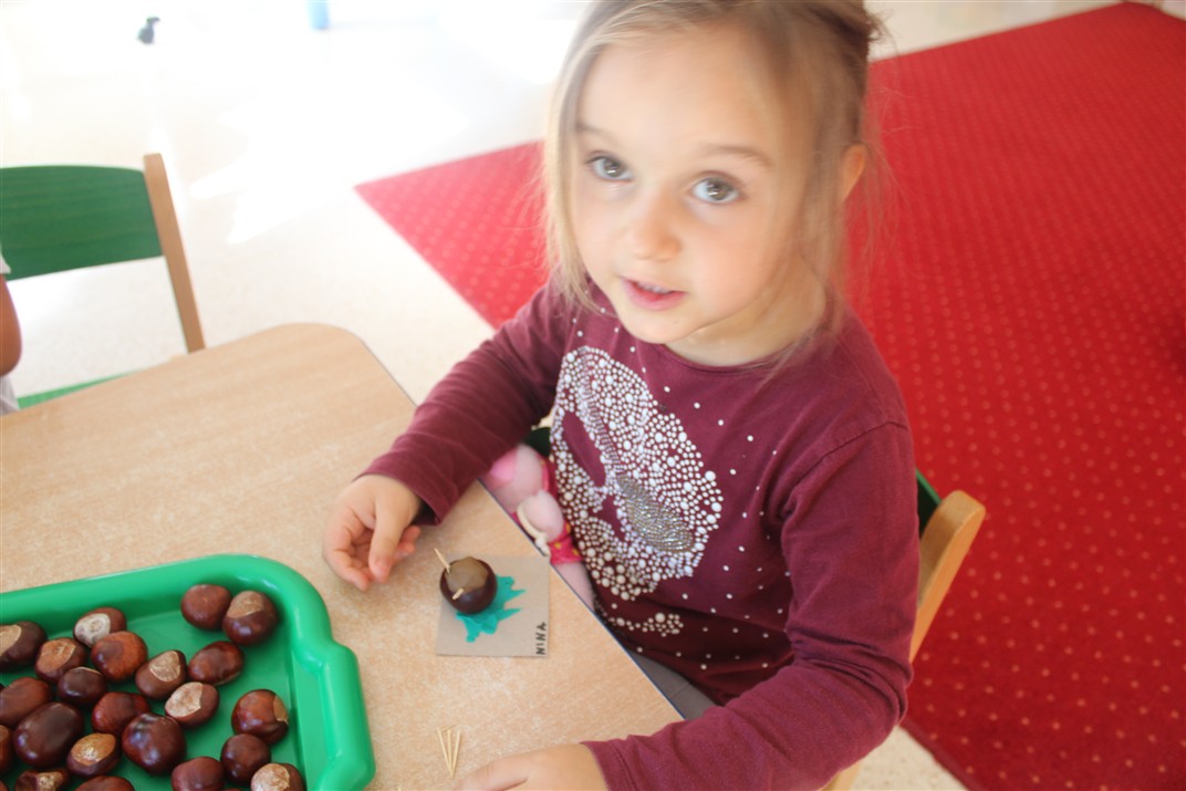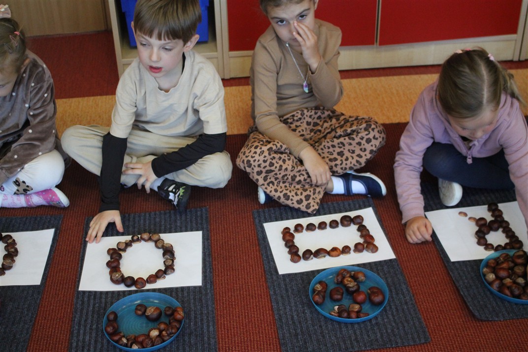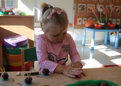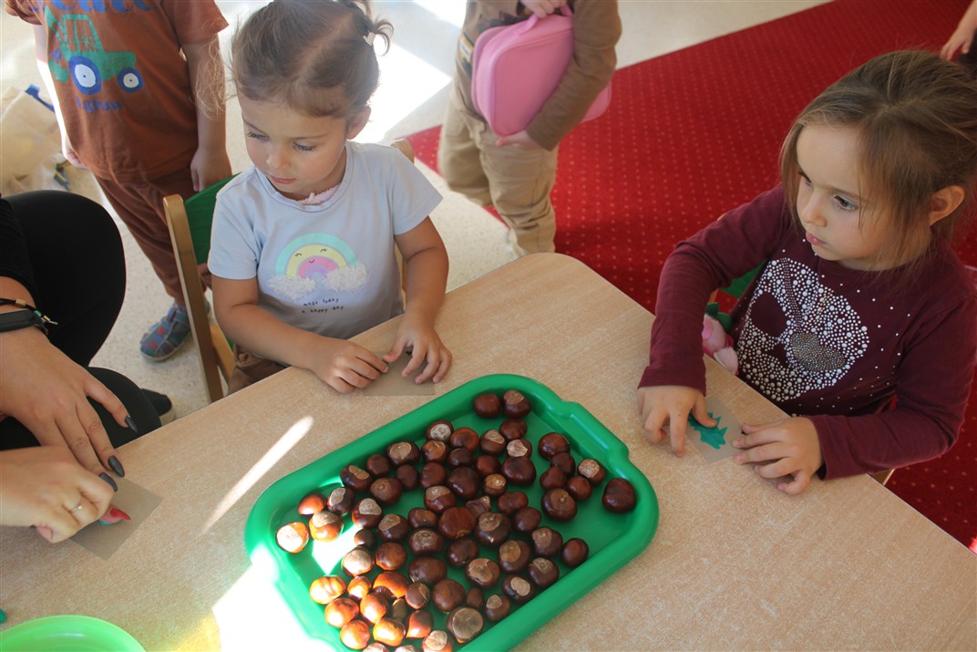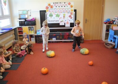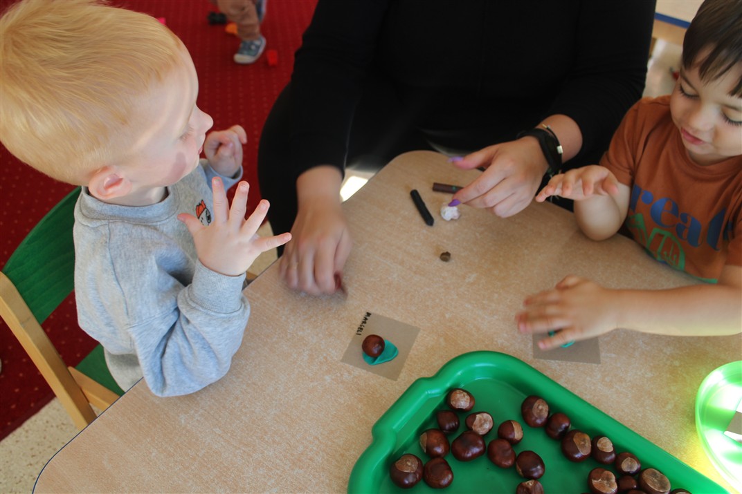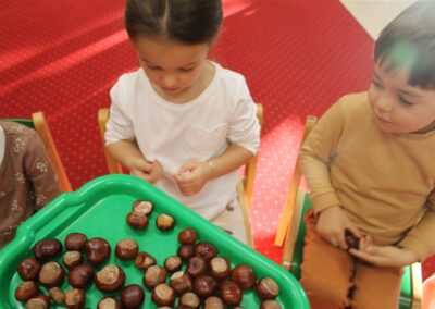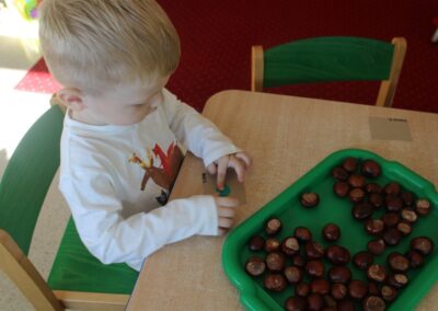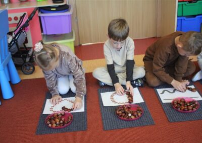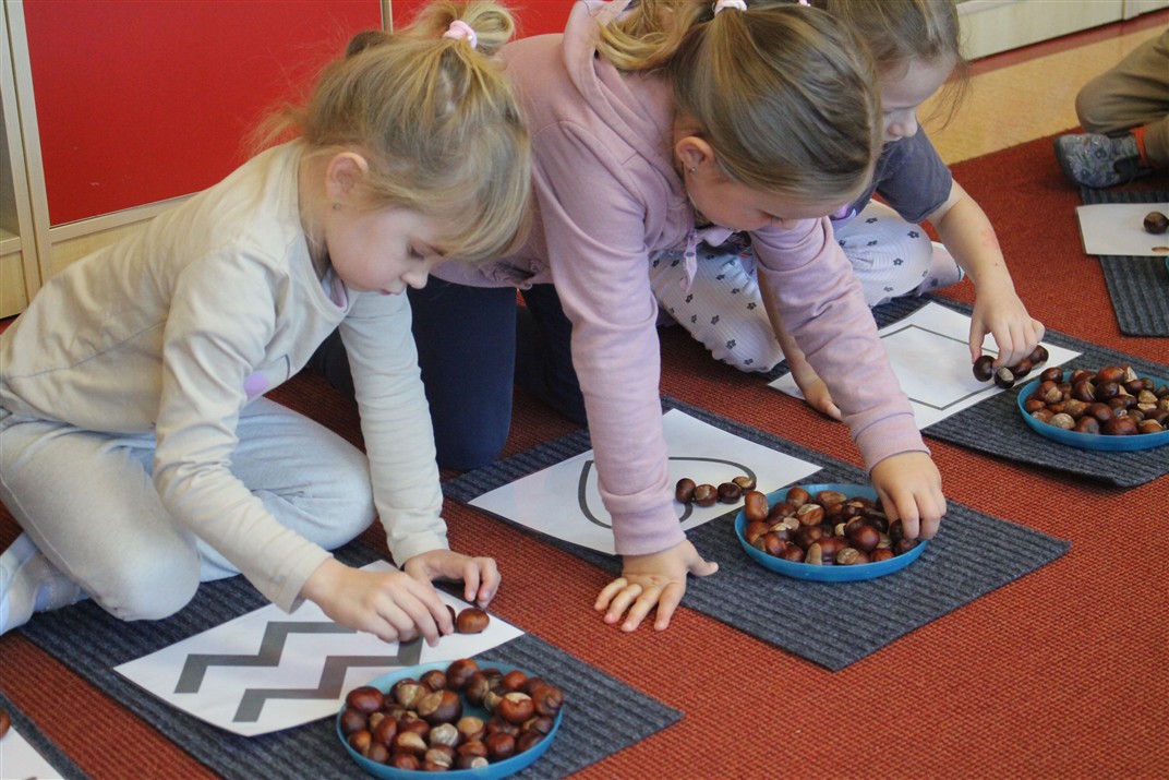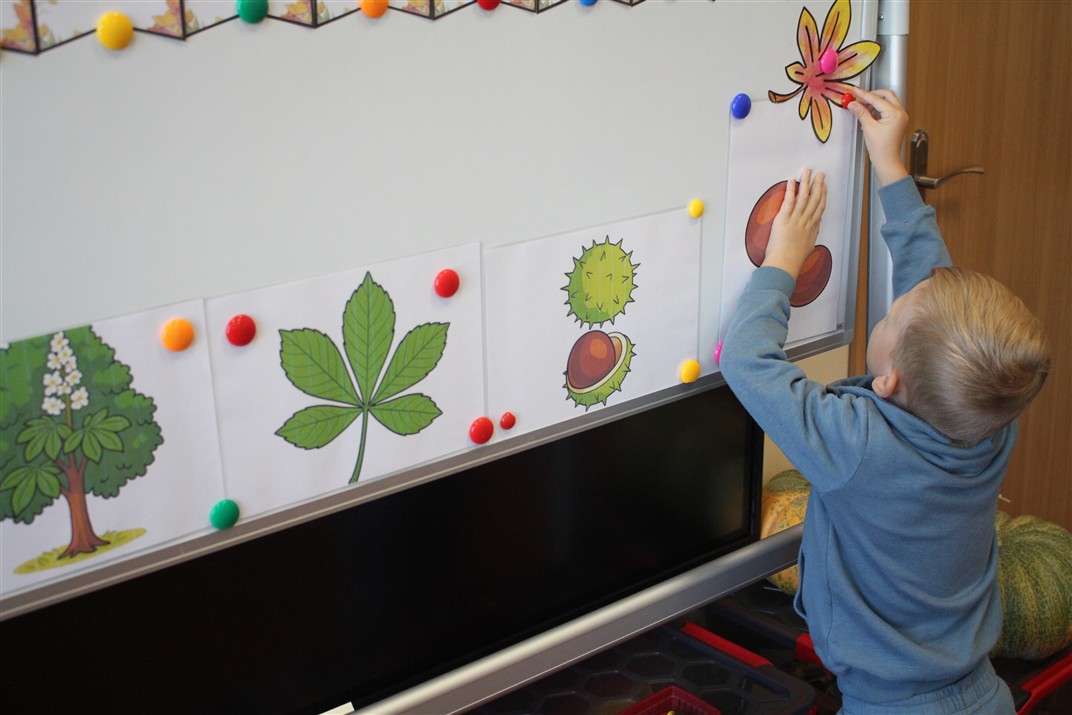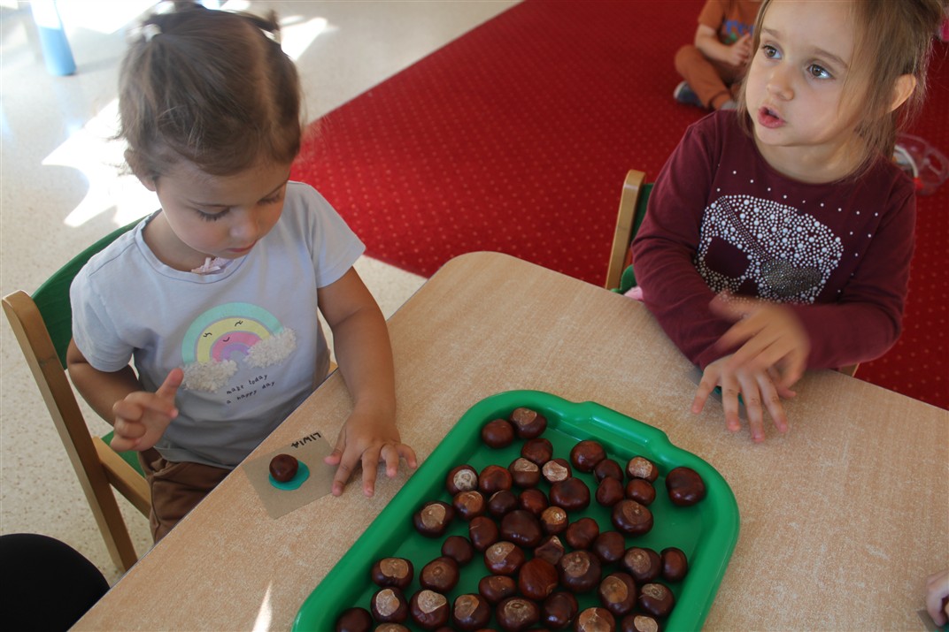 W naszym przedszkolu w piątek 3 października dzieci z grupy Myszek i Żabek obchodziły wyjątkowe święto – Dzień Kasztana. Już od rana w salach pojawiły się dekoracje w kolorach jesieni: brązowe, złote i pomarańczowe liście, a także kosze pełne kasztanów. Dzieci przyszły ubrane w odcieniach brązu, dzięki czemu wyglądały jak małe kasztanki. Świętowanie rozpoczęliśmy od wspólnych rozmów o tym, skąd biorą się kasztany i jak wyglądają drzewa kasztanowca. Następnie dzieci mogły dotykać, przesypywać i układać kasztany – ćwicząc spostrzegawczość oraz zdolności manualne. Nie zabrakło także zabaw ruchowych, takich jak: przenoszenie kasztanów łyżeczką na czas, turlanie kasztanków po wyznaczonej trasie. Podczas zajęć dzieci dowiedziały się także, że kasztany to nie tylko piękne dary jesieni, ale i pomoc w zabawach, ćwiczeniach oraz tworzeniu dekoracji. Dzień Kasztana był pełen uśmiechów, radości i jesiennej atmosfery, a kasztany na pewno jeszcze długo będą towarzyszyć dzieciom w zabawach.