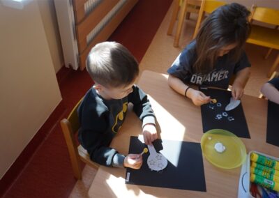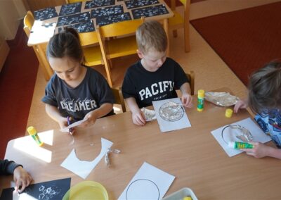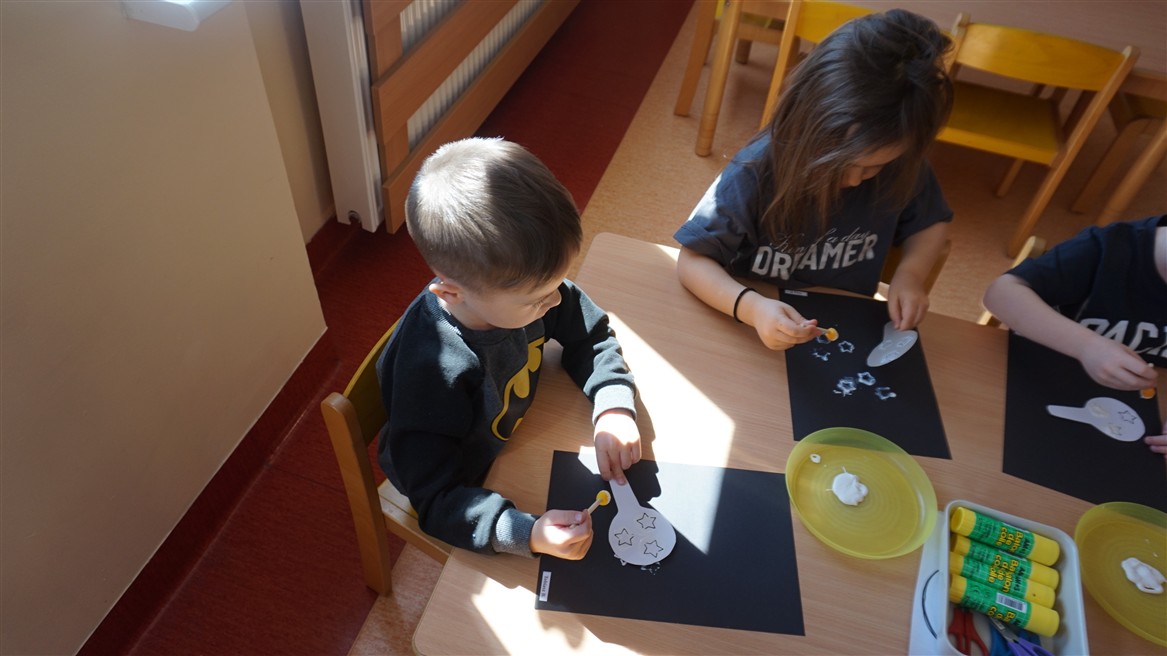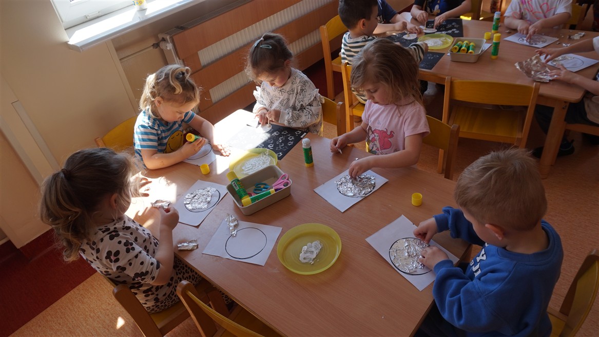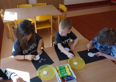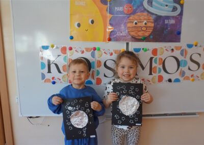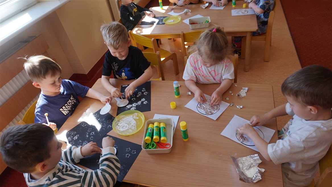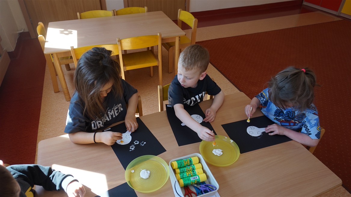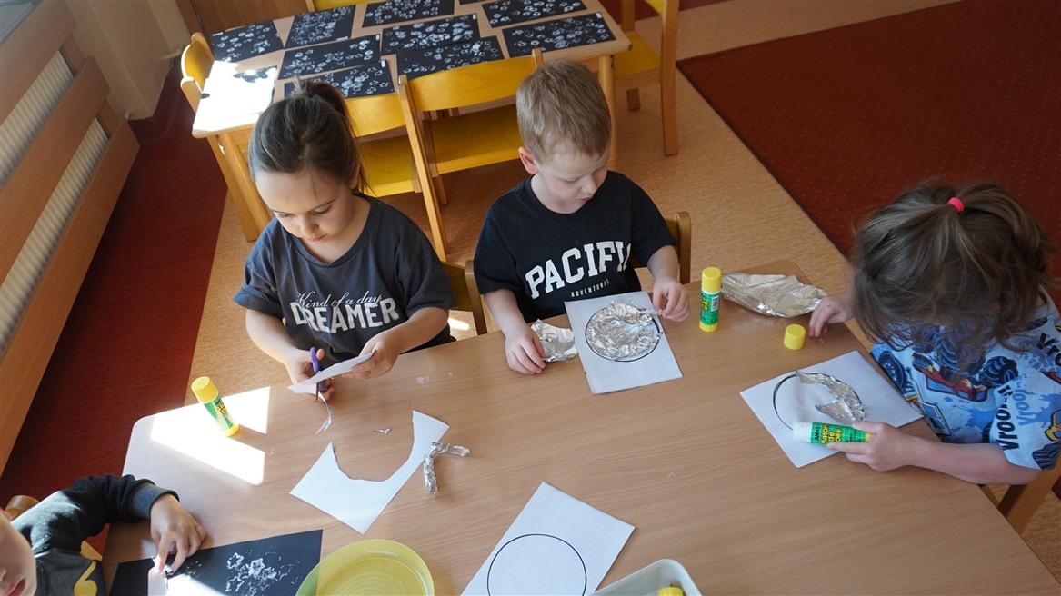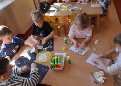 • Wykonały pracę plastyczną „Księżyc” stemplując kontury gwiazd, wyklejając koło folia aluminiową oraz doskonaliły motorykę małą wycinając je