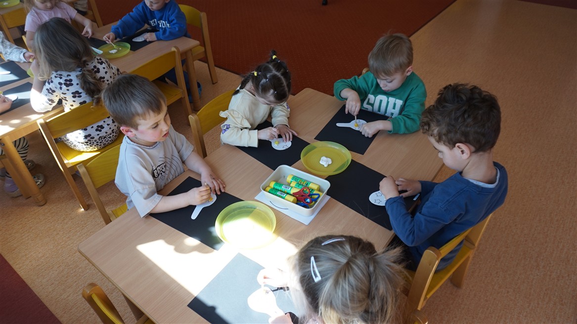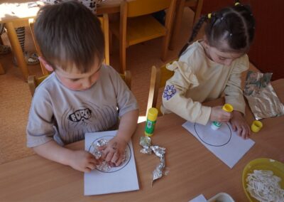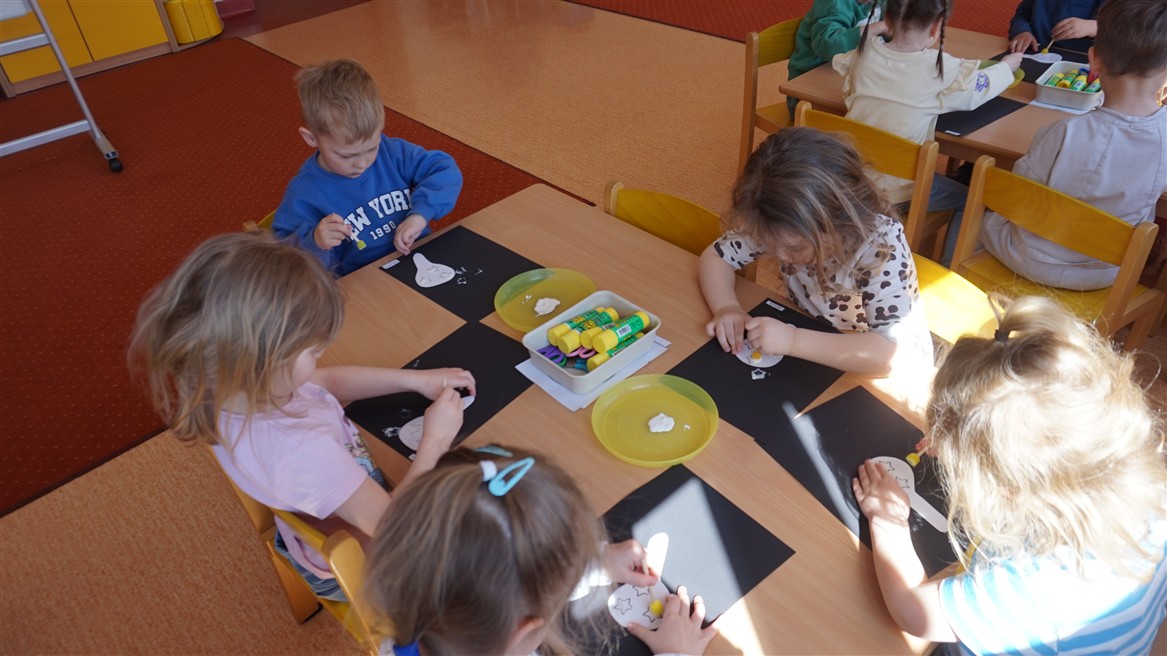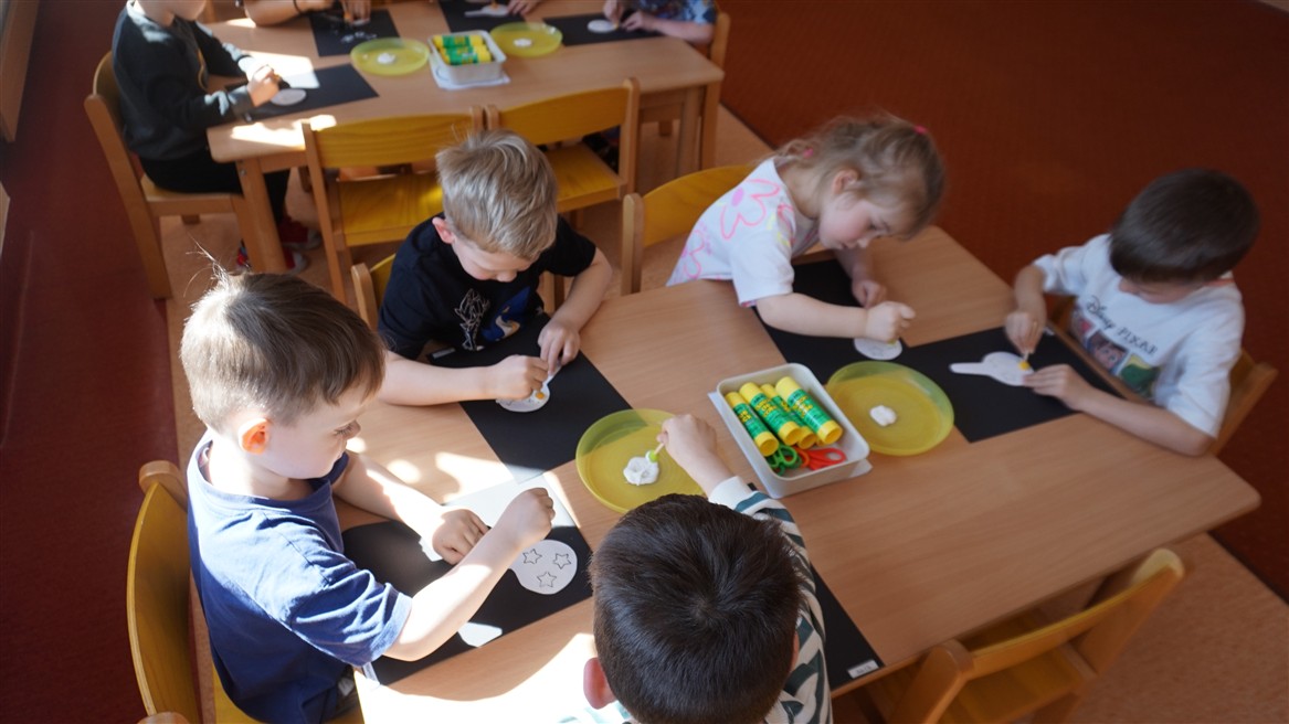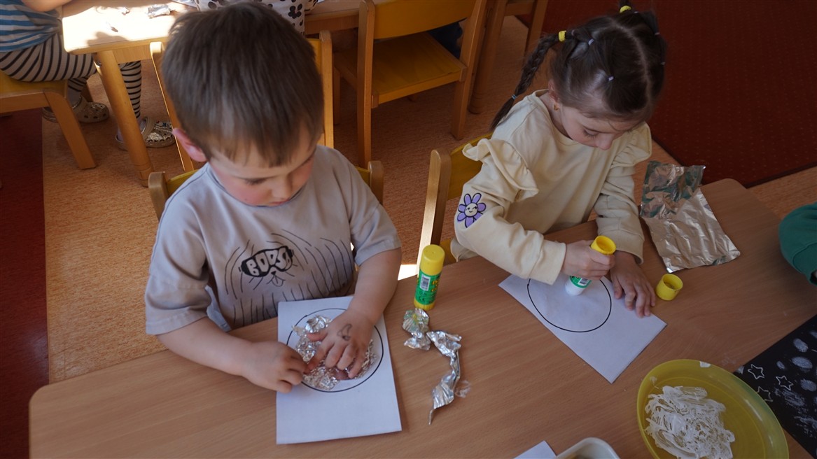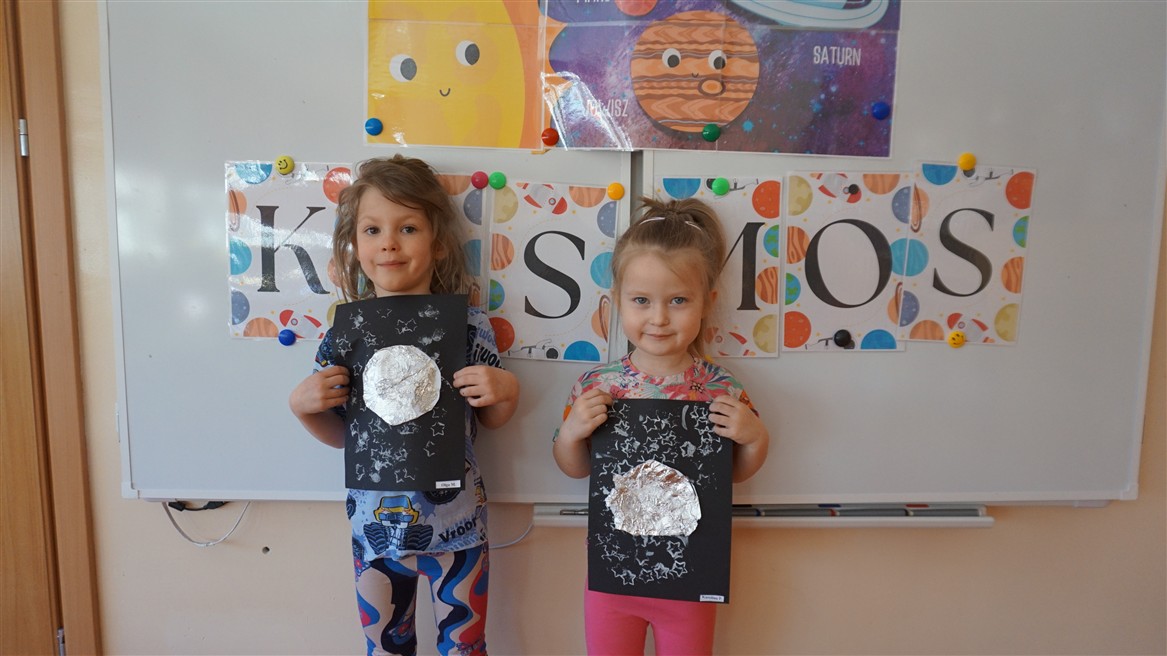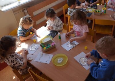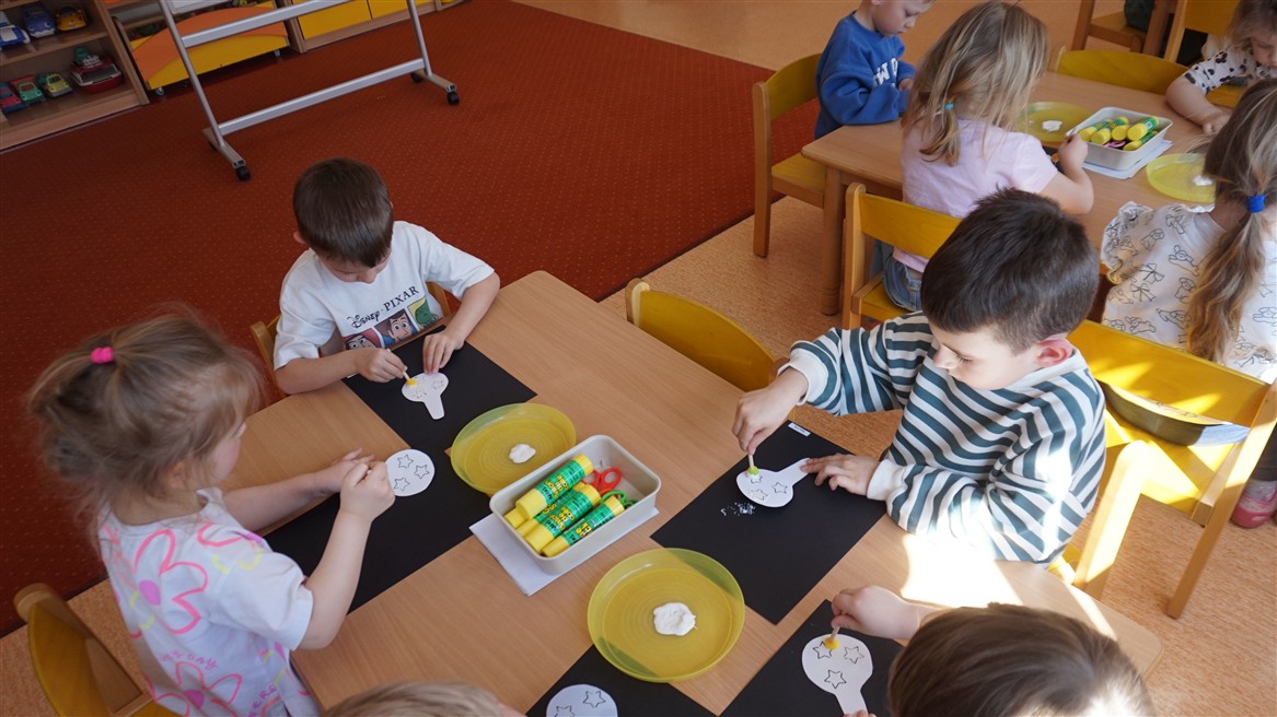 • Wykonały pracę plastyczną „Księżyc” stemplując kontury gwiazd, wyklejając koło folia aluminiową oraz doskonaliły motorykę małą wycinając je
