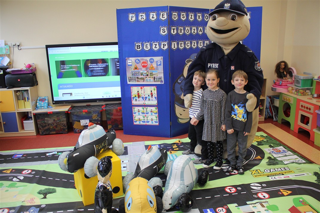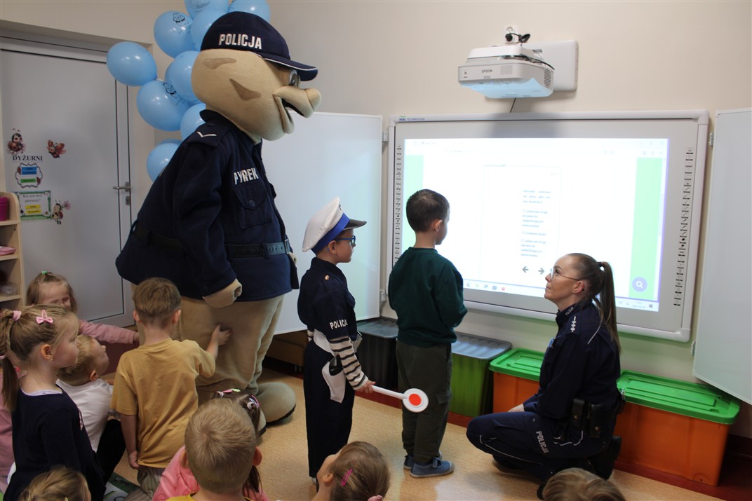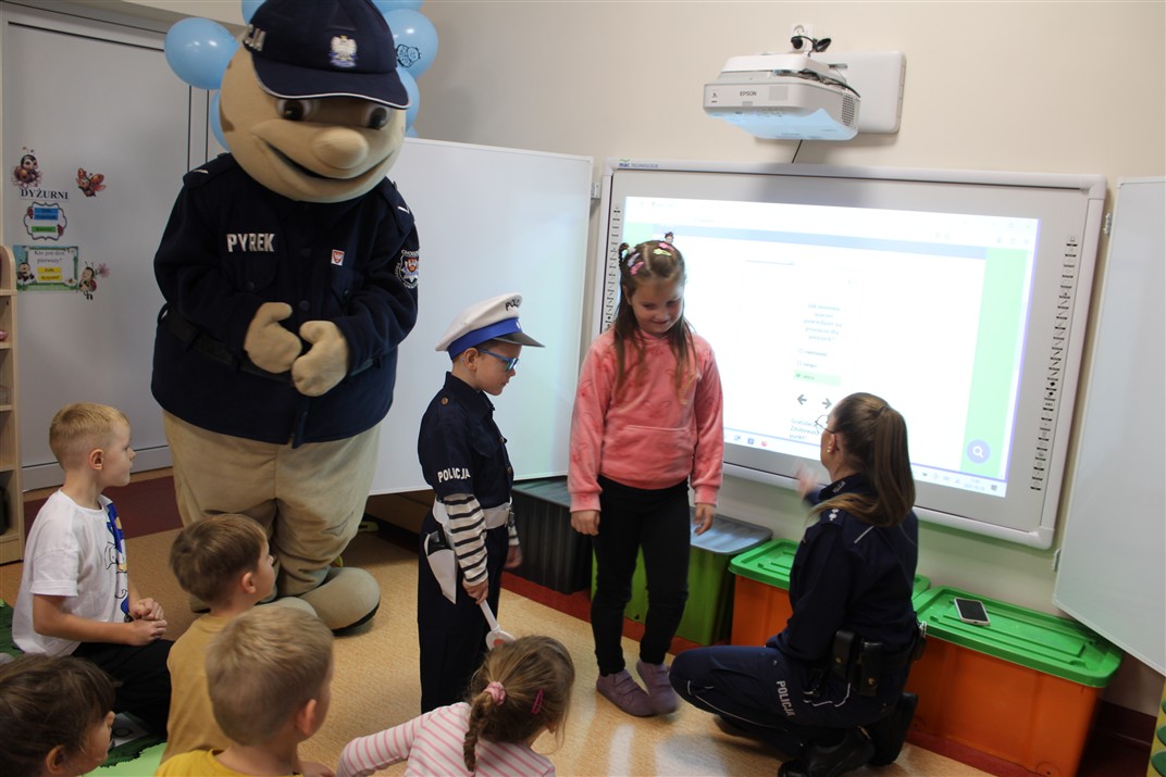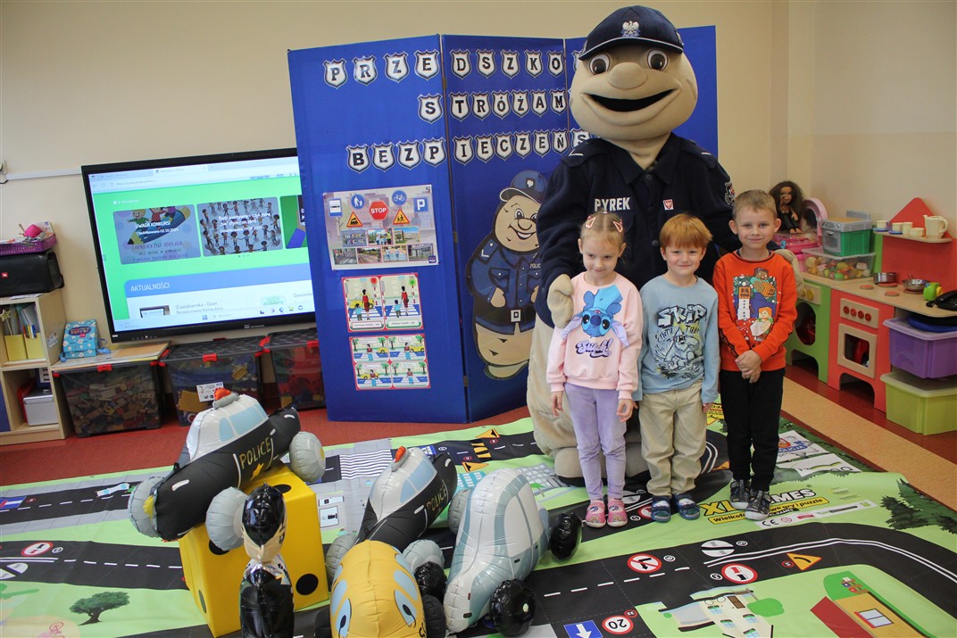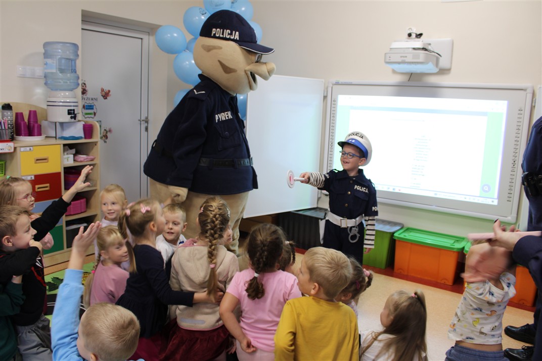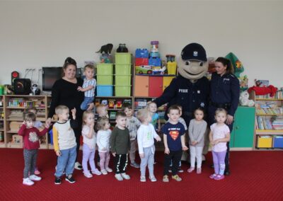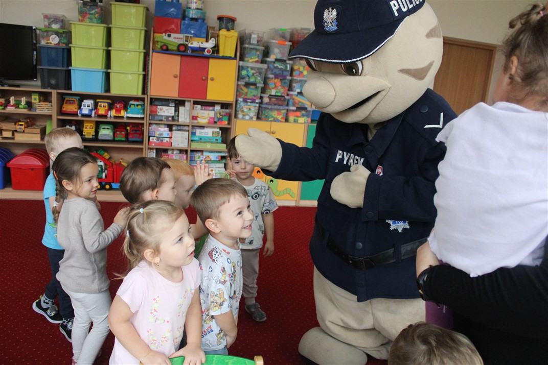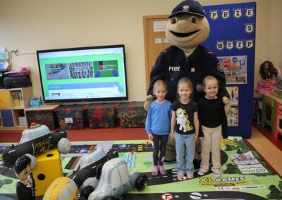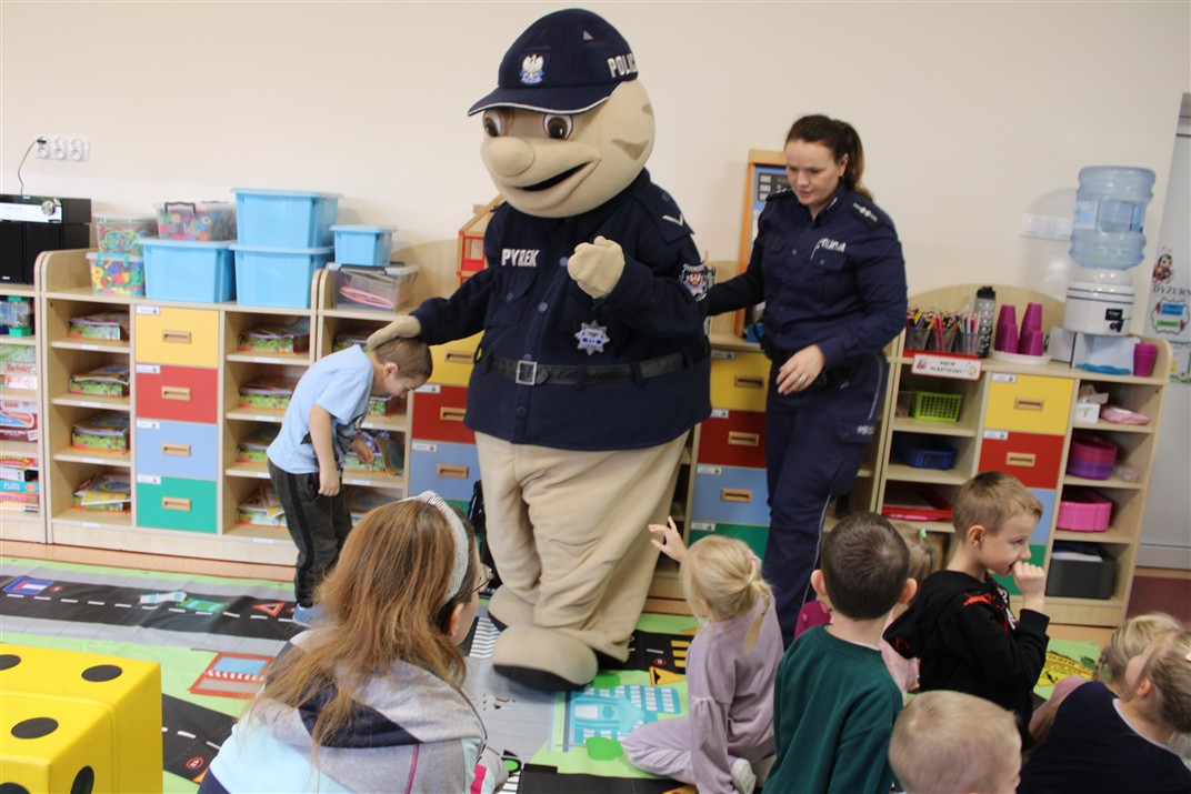 W dniu 16 października dzieci z grupy „Myszek” i „Biedronek” gościły przedstawicieli Komendy Powiatowej Policji w Chodzieży. Podczas spotkania dzieci wzbogaciły wiedzę na temat pracy policjantów, utrwaliły podstawowe zasady bezpiecznego poruszania się po chodniku i na przejściach dla pieszych. Na podstawie ciekawej zabawy zrozumiały także konieczność noszenia elementów odblaskowych. Wykorzystane przez gości rekwizyty, między innymi duża plansza z ulicami i przejściami dla pieszych oraz autka sprawiły, że dzieci z ochotą uczestniczyły w zabawach i nauce jednocześnie. Jednak największą atrakcją dla dzieci było spotkanie z gościem specjalnym, sierżantem Pyrkiem oraz gry edukacyjne z „Krainy Pyrka”. Kolejny raz przedszkolacy upewnili się, że policjant  jest osobą miłą, do której zawsze można zwrócić się o pomoc.