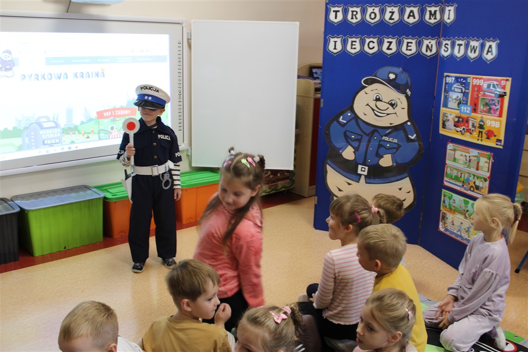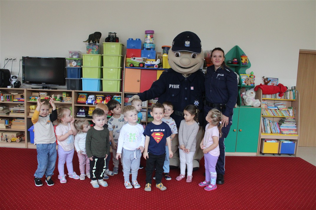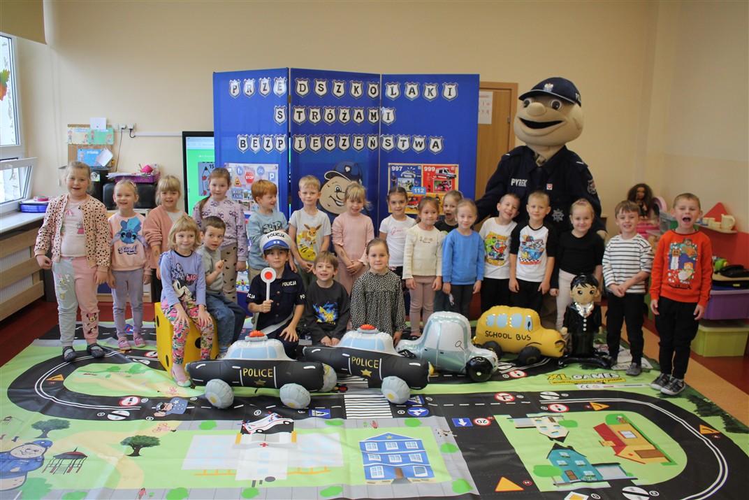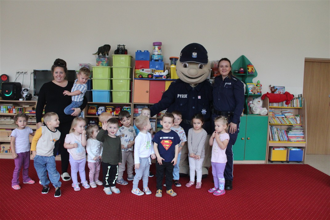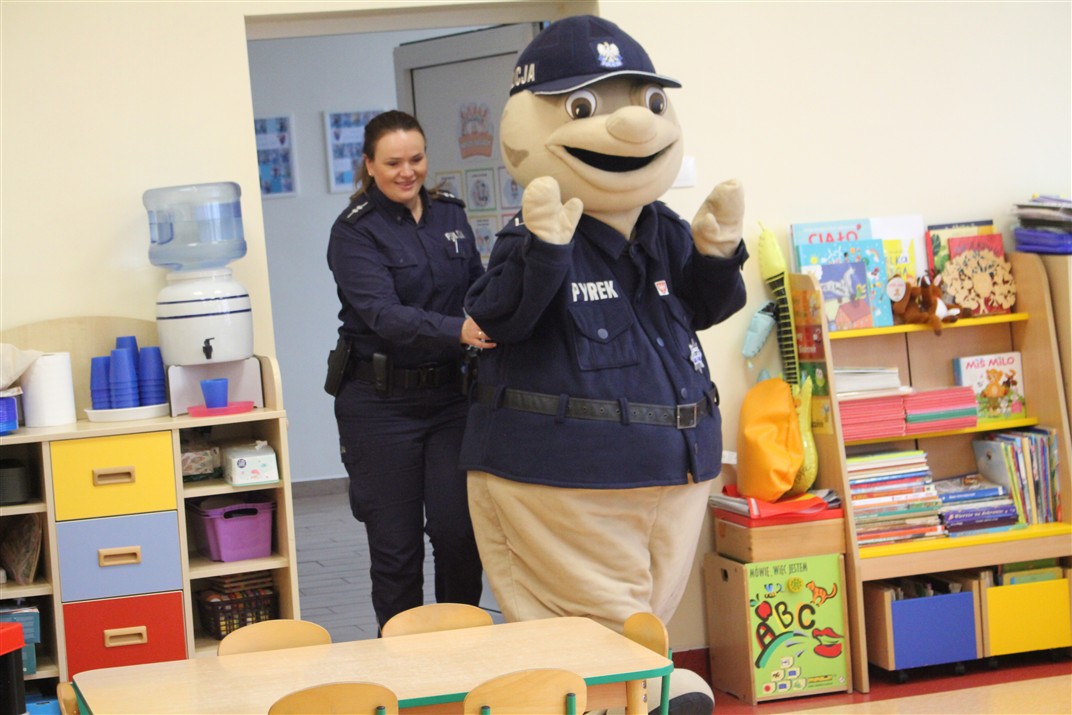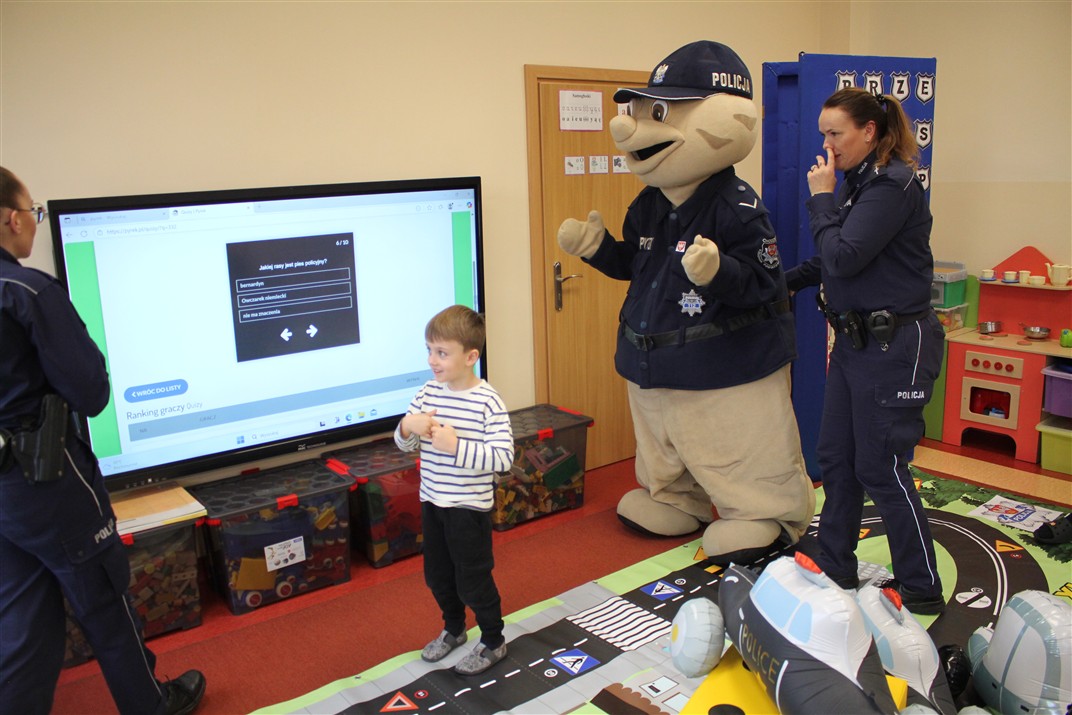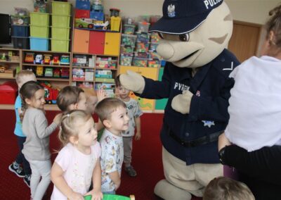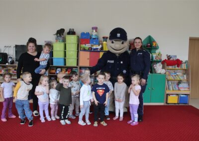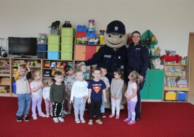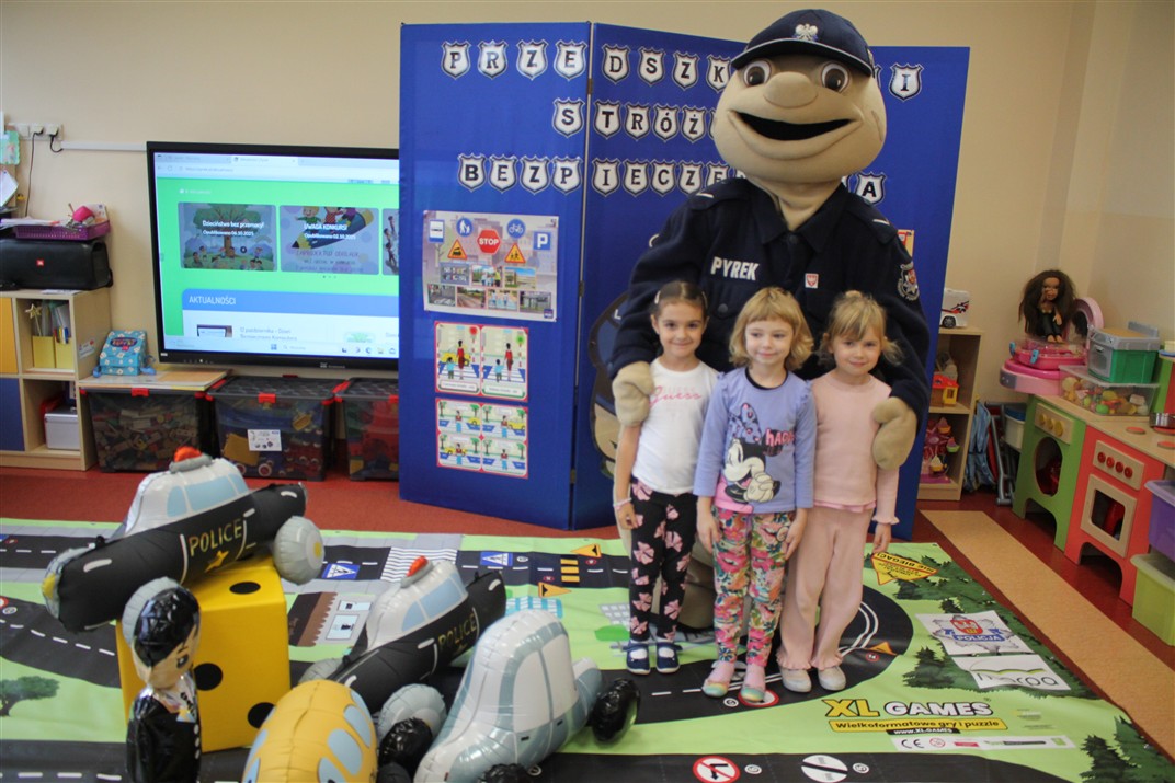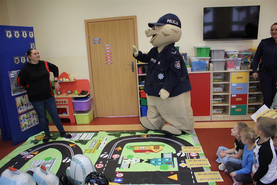 W dniu 16 października dzieci z grupy „Myszek” i „Biedronek” gościły przedstawicieli Komendy Powiatowej Policji w Chodzieży. Podczas spotkania dzieci wzbogaciły wiedzę na temat pracy policjantów, utrwaliły podstawowe zasady bezpiecznego poruszania się po chodniku i na przejściach dla pieszych. Na podstawie ciekawej zabawy zrozumiały także konieczność noszenia elementów odblaskowych. Wykorzystane przez gości rekwizyty, między innymi duża plansza z ulicami i przejściami dla pieszych oraz autka sprawiły, że dzieci z ochotą uczestniczyły w zabawach i nauce jednocześnie. Jednak największą atrakcją dla dzieci było spotkanie z gościem specjalnym, sierżantem Pyrkiem oraz gry edukacyjne z „Krainy Pyrka”. Kolejny raz przedszkolacy upewnili się, że policjant  jest osobą miłą, do której zawsze można zwrócić się o pomoc.