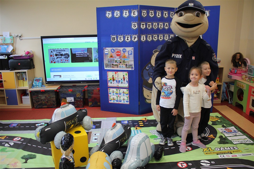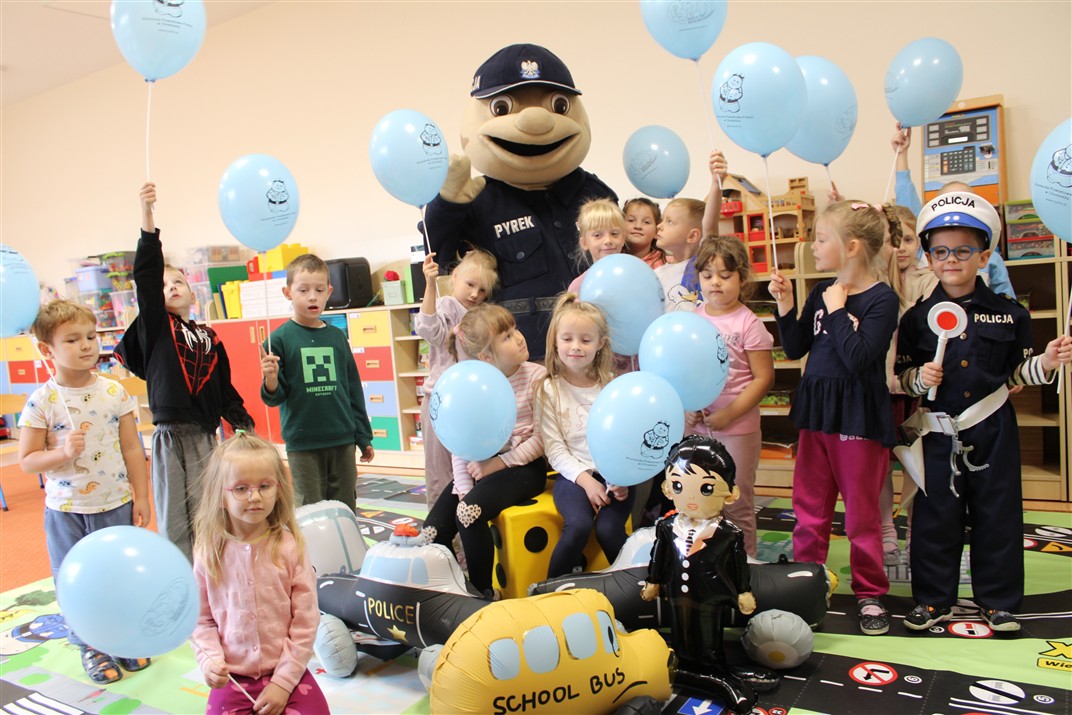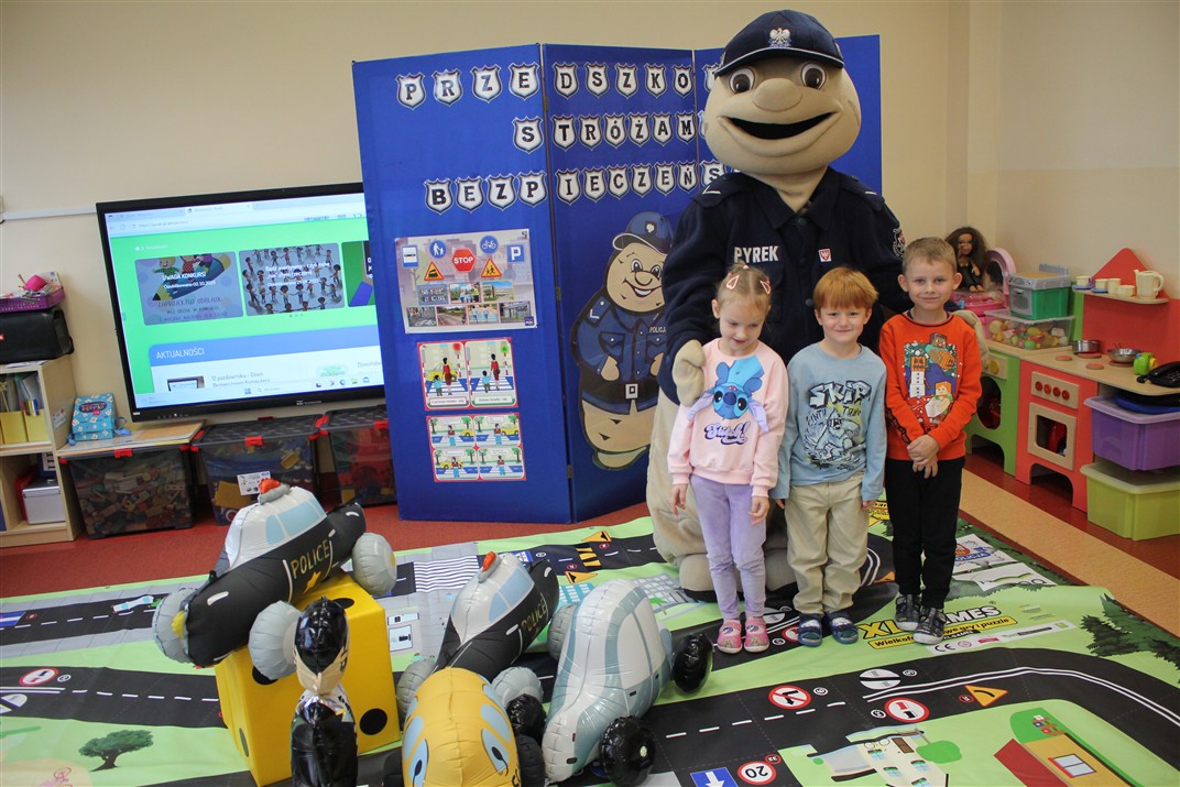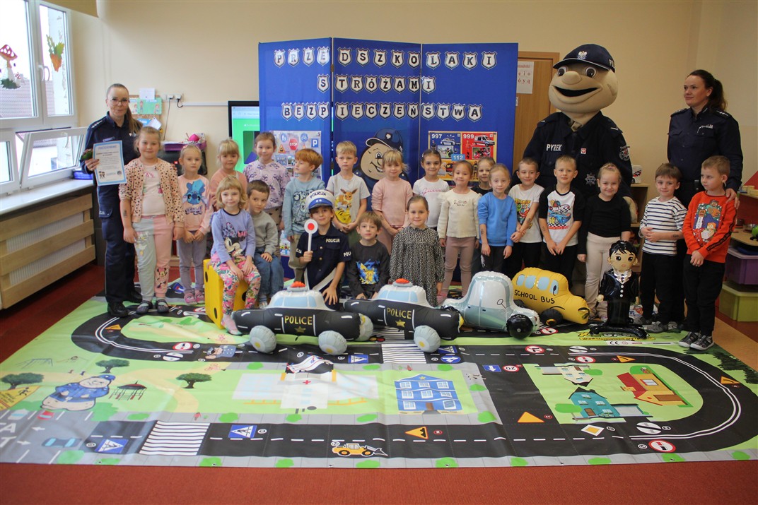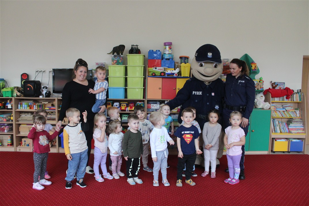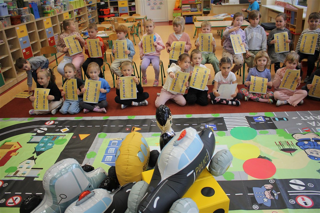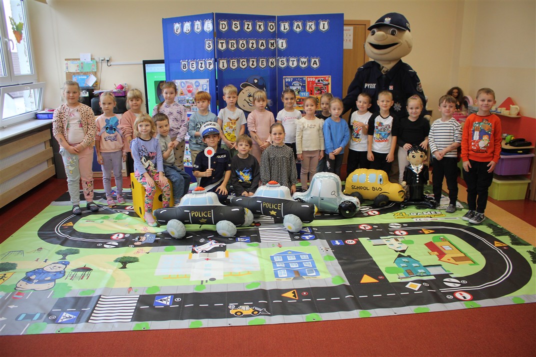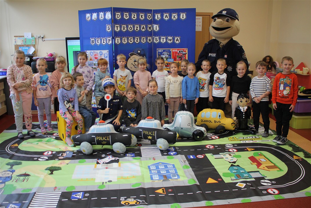 W dniu 16 października dzieci z grupy „Myszek” i „Biedronek” gościły przedstawicieli Komendy Powiatowej Policji w Chodzieży. Podczas spotkania dzieci wzbogaciły wiedzę na temat pracy policjantów, utrwaliły podstawowe zasady bezpiecznego poruszania się po chodniku i na przejściach dla pieszych. Na podstawie ciekawej zabawy zrozumiały także konieczność noszenia elementów odblaskowych. Wykorzystane przez gości rekwizyty, między innymi duża plansza z ulicami i przejściami dla pieszych oraz autka sprawiły, że dzieci z ochotą uczestniczyły w zabawach i nauce jednocześnie. Jednak największą atrakcją dla dzieci było spotkanie z gościem specjalnym, sierżantem Pyrkiem oraz gry edukacyjne z „Krainy Pyrka”. Kolejny raz przedszkolacy upewnili się, że policjant  jest osobą miłą, do której zawsze można zwrócić się o pomoc.