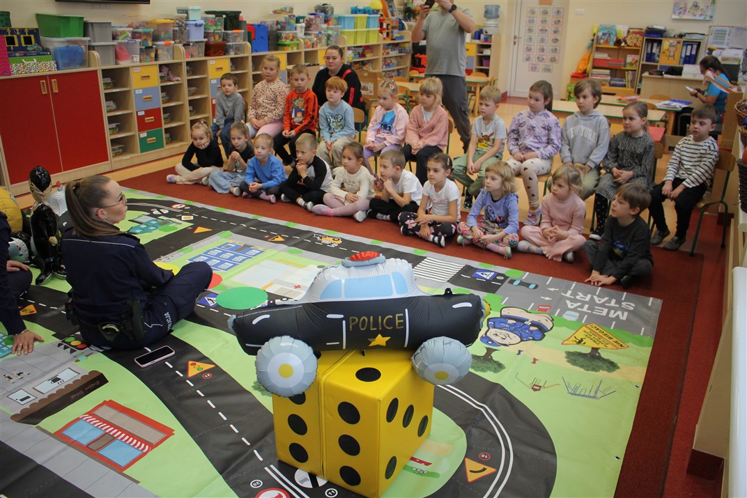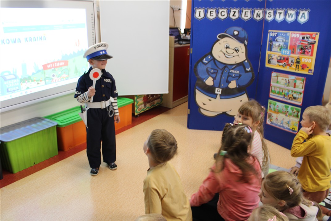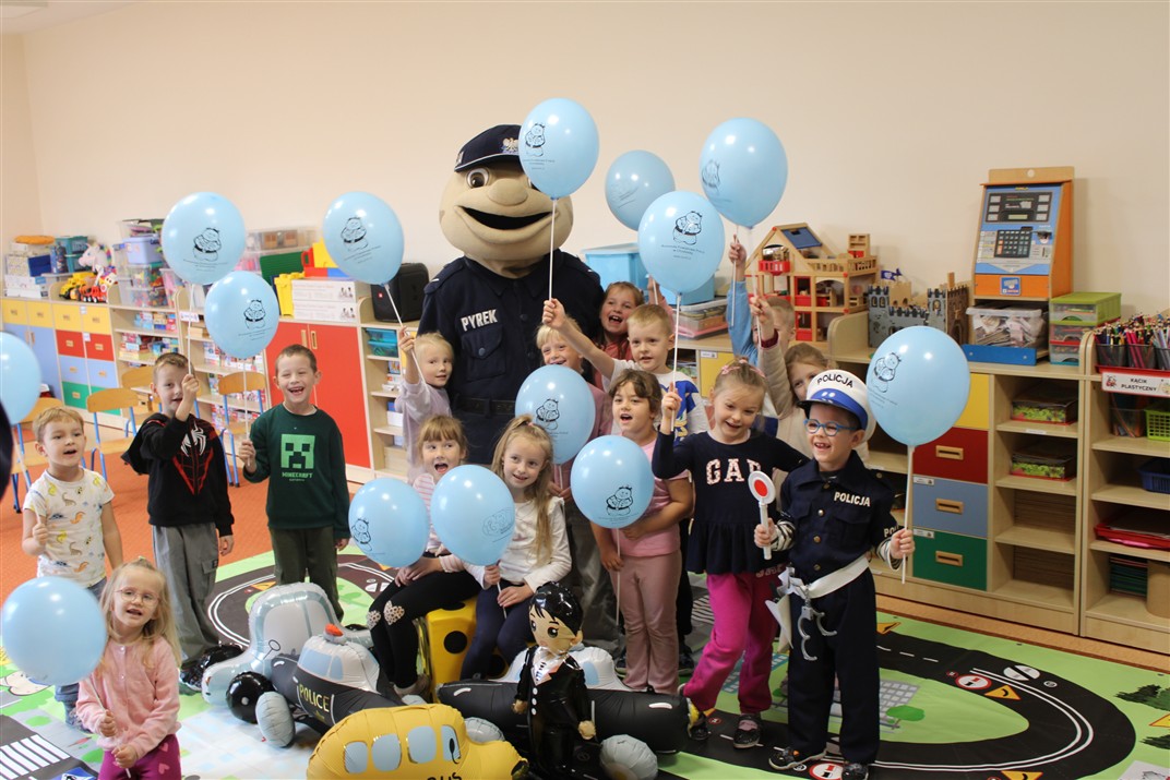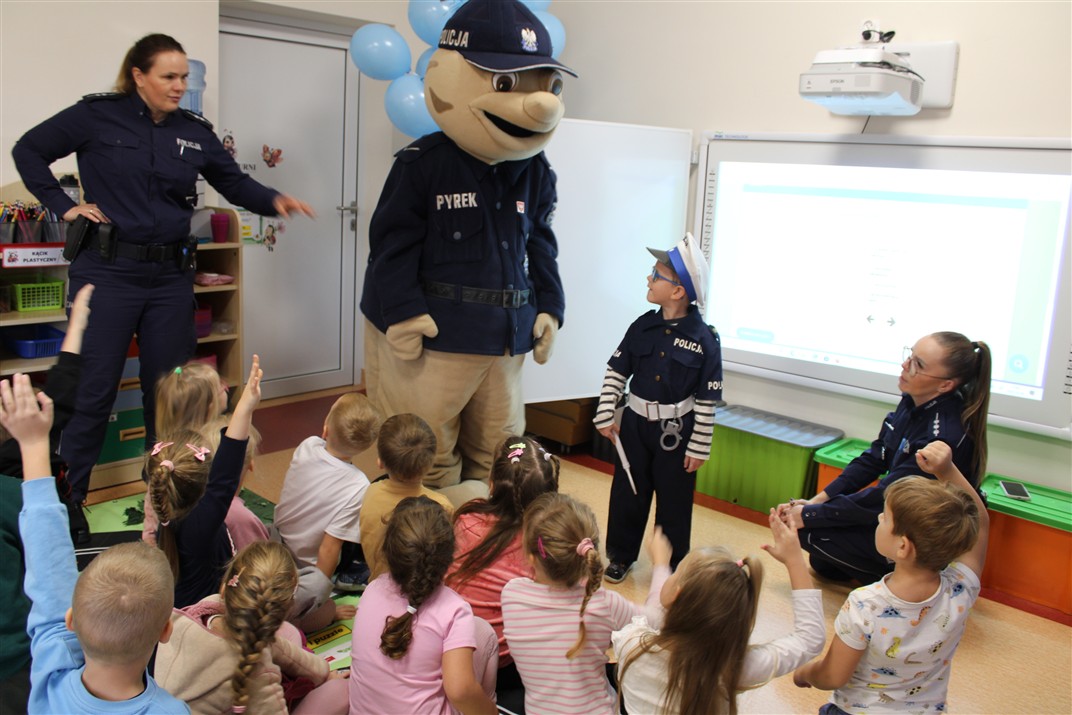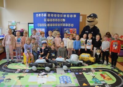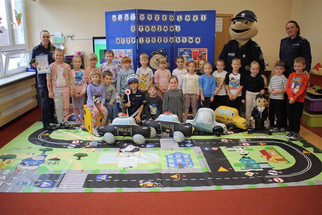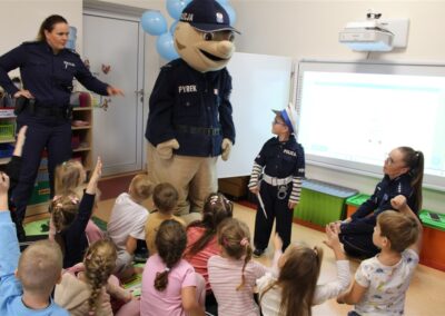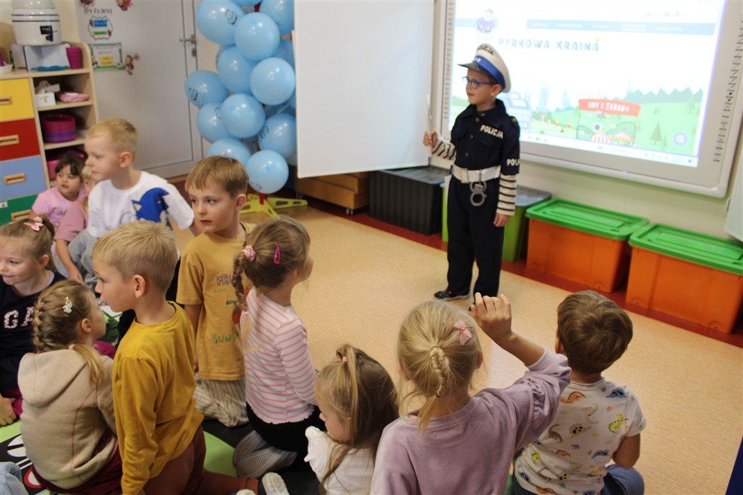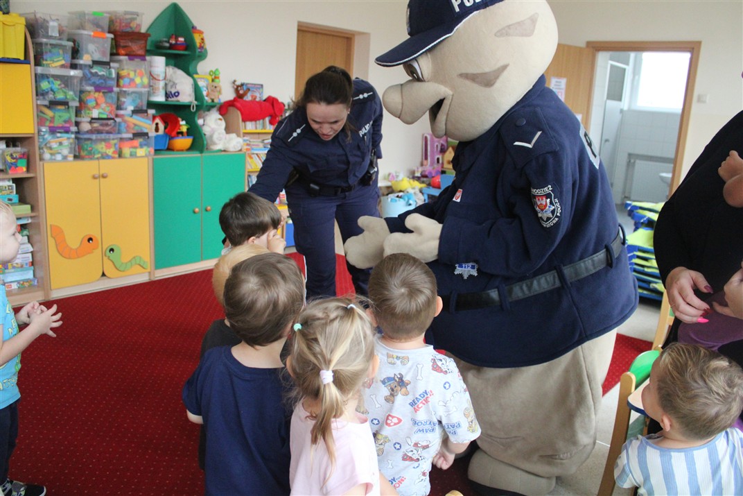 W dniu 16 października dzieci z grupy „Myszek” i „Biedronek” gościły przedstawicieli Komendy Powiatowej Policji w Chodzieży. Podczas spotkania dzieci wzbogaciły wiedzę na temat pracy policjantów, utrwaliły podstawowe zasady bezpiecznego poruszania się po chodniku i na przejściach dla pieszych. Na podstawie ciekawej zabawy zrozumiały także konieczność noszenia elementów odblaskowych. Wykorzystane przez gości rekwizyty, między innymi duża plansza z ulicami i przejściami dla pieszych oraz autka sprawiły, że dzieci z ochotą uczestniczyły w zabawach i nauce jednocześnie. Jednak największą atrakcją dla dzieci było spotkanie z gościem specjalnym, sierżantem Pyrkiem oraz gry edukacyjne z „Krainy Pyrka”. Kolejny raz przedszkolacy upewnili się, że policjant  jest osobą miłą, do której zawsze można zwrócić się o pomoc.