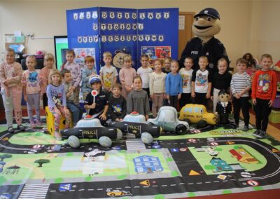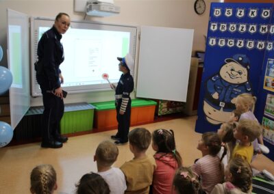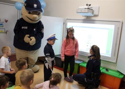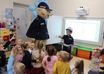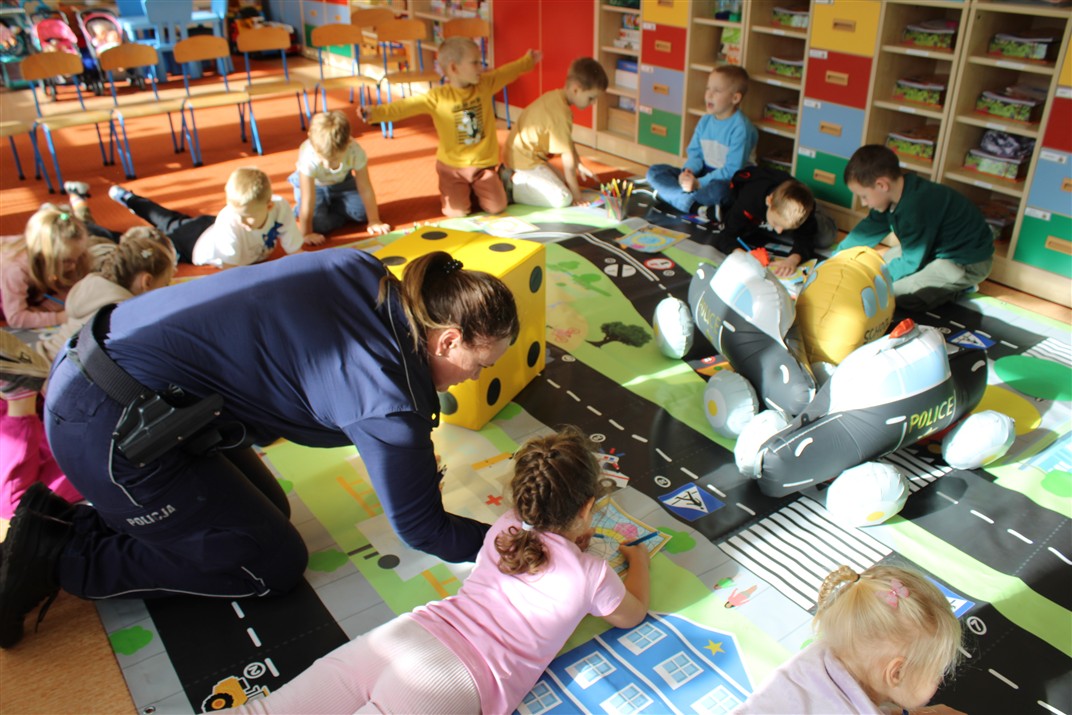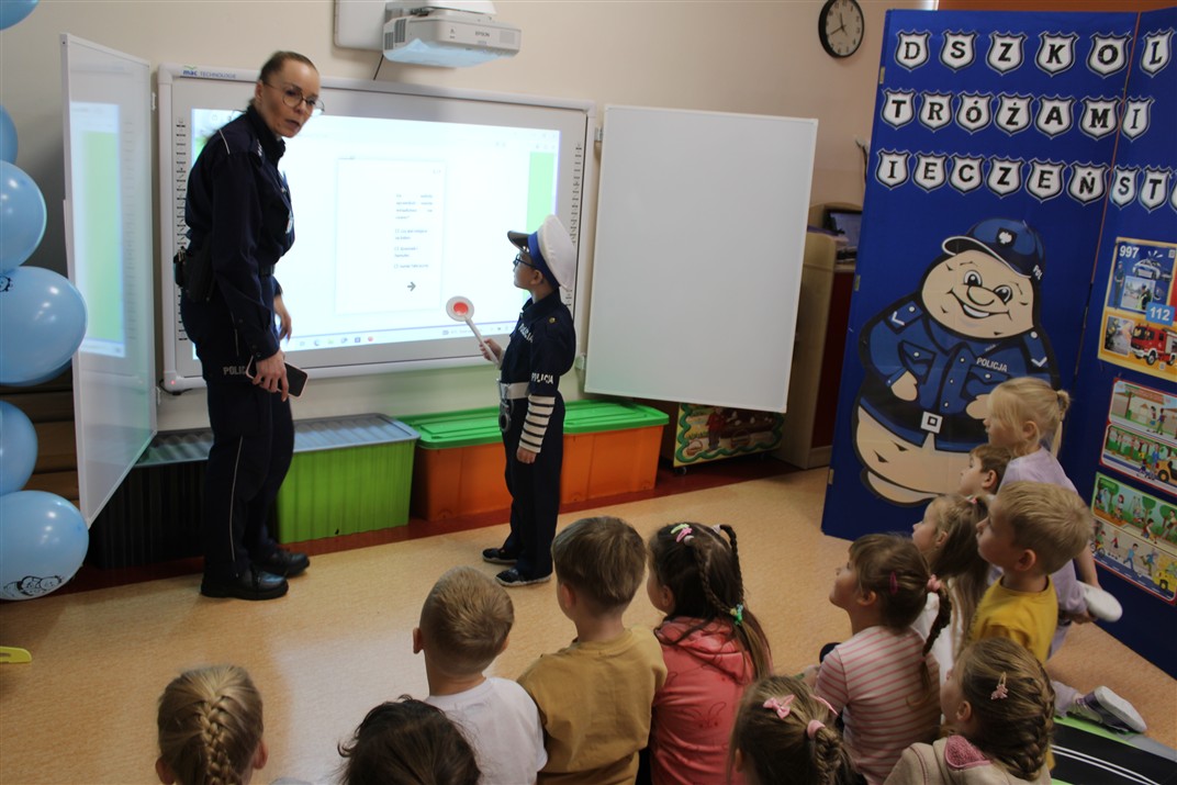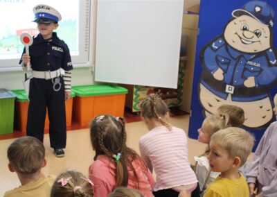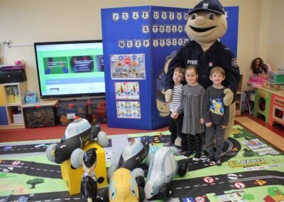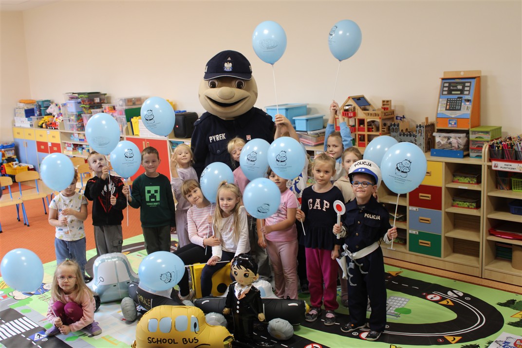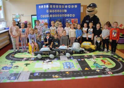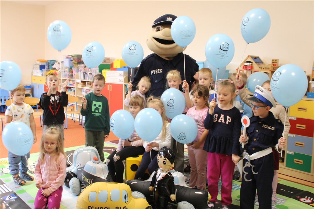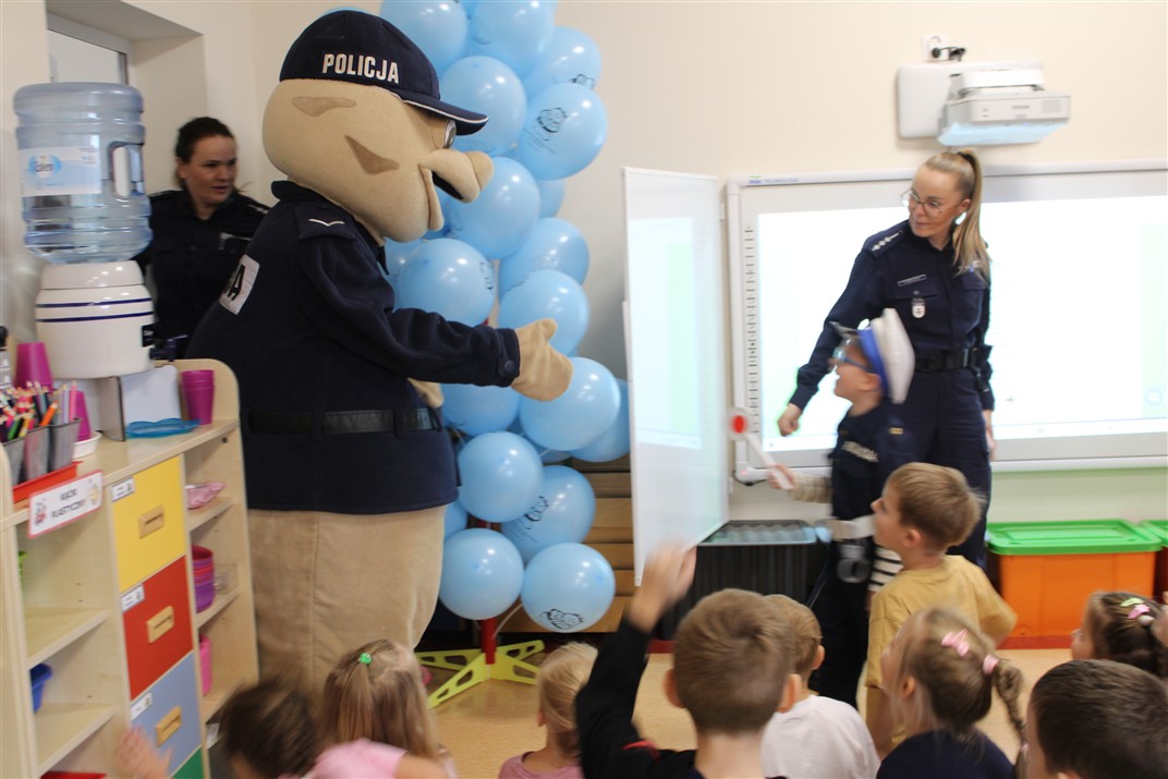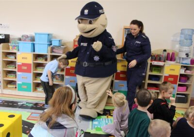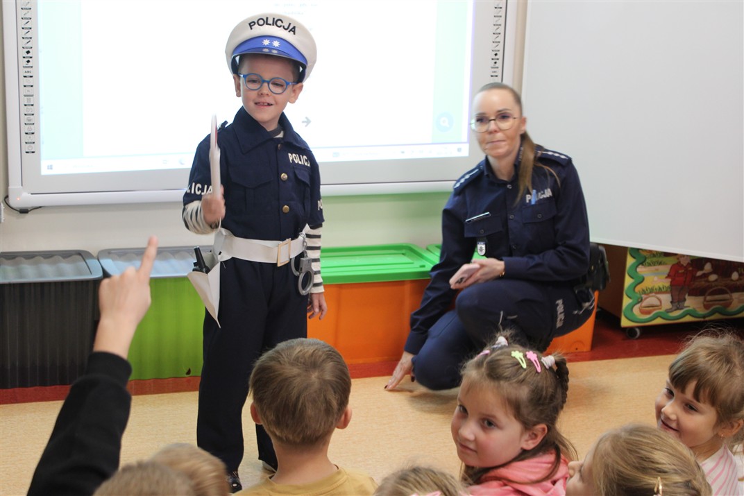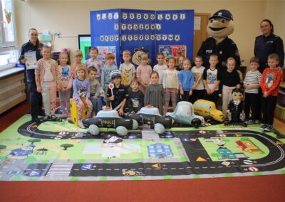 W dniu 16 października dzieci z grupy „Myszek” i „Biedronek” gościły przedstawicieli Komendy Powiatowej Policji w Chodzieży. Podczas spotkania dzieci wzbogaciły wiedzę na temat pracy policjantów, utrwaliły podstawowe zasady bezpiecznego poruszania się po chodniku i na przejściach dla pieszych. Na podstawie ciekawej zabawy zrozumiały także konieczność noszenia elementów odblaskowych. Wykorzystane przez gości rekwizyty, między innymi duża plansza z ulicami i przejściami dla pieszych oraz autka sprawiły, że dzieci z ochotą uczestniczyły w zabawach i nauce jednocześnie. Jednak największą atrakcją dla dzieci było spotkanie z gościem specjalnym, sierżantem Pyrkiem oraz gry edukacyjne z „Krainy Pyrka”. Kolejny raz przedszkolacy upewnili się, że policjant  jest osobą miłą, do której zawsze można zwrócić się o pomoc.
