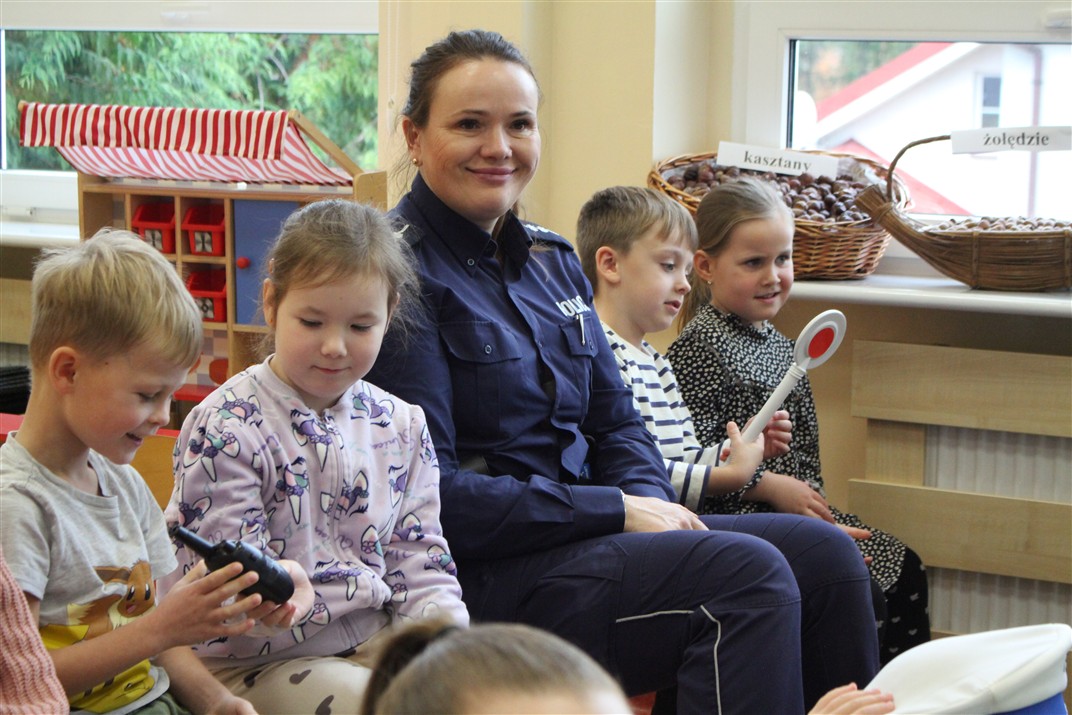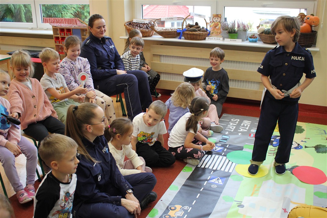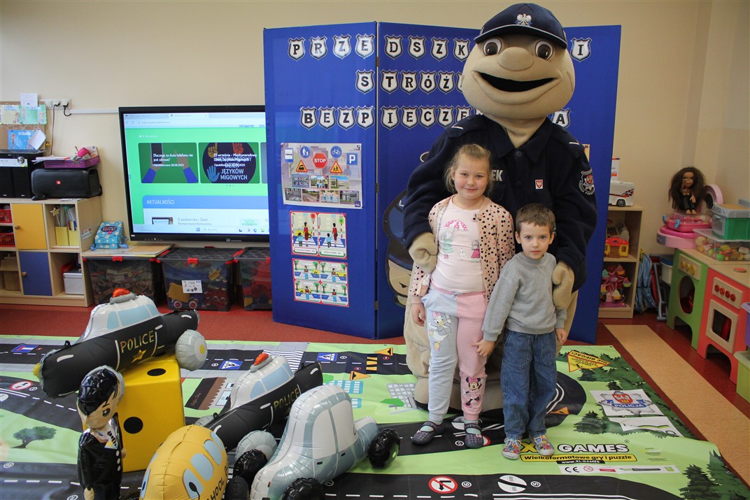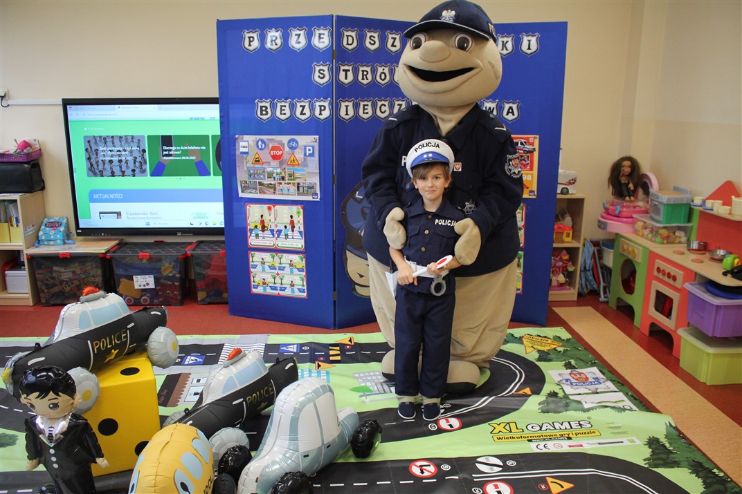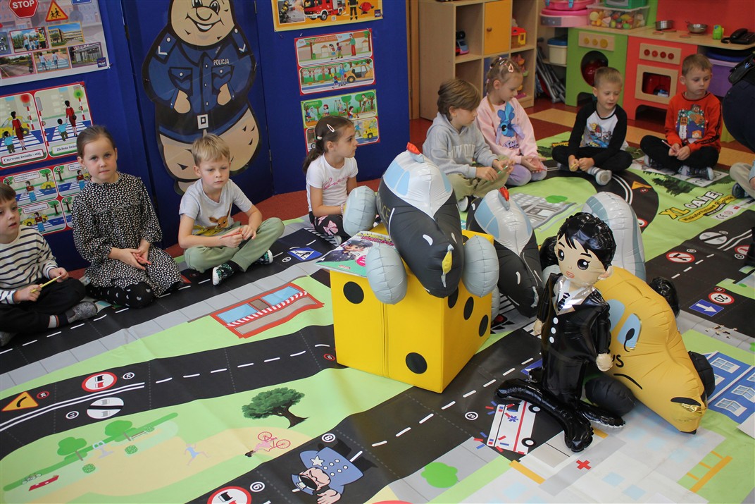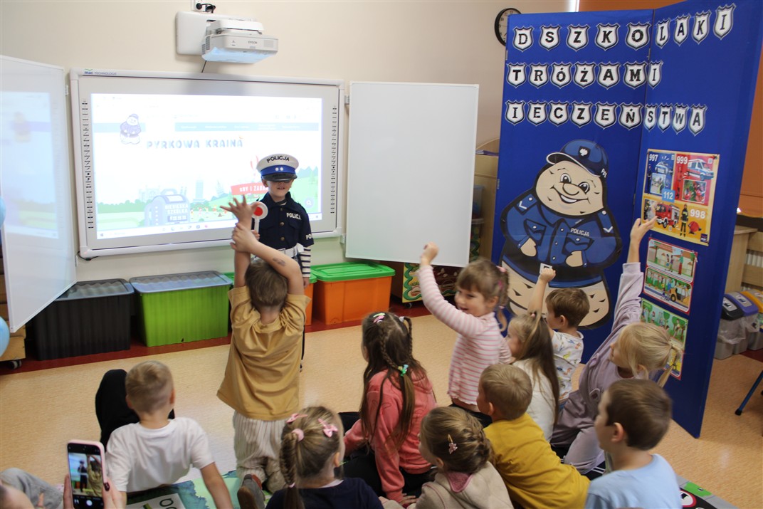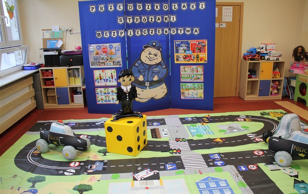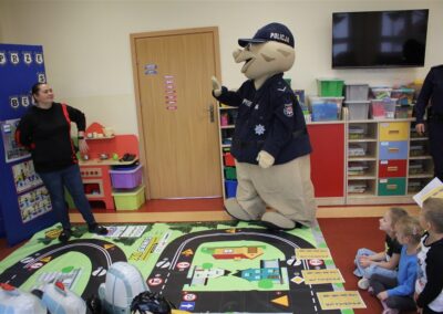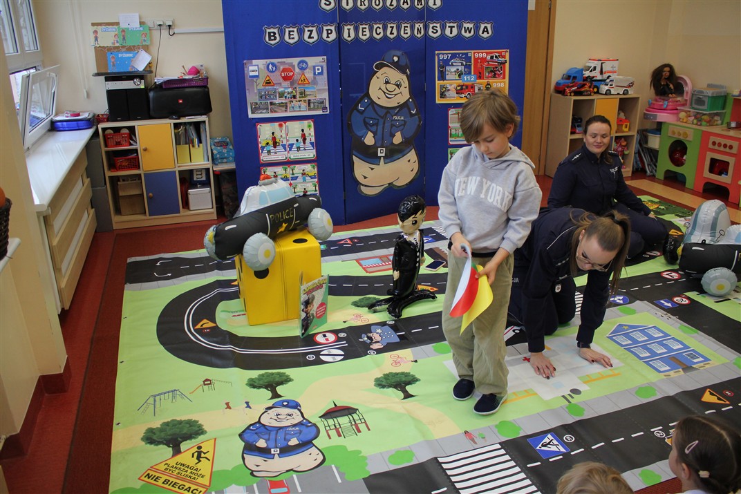 W dniu 16 października dzieci z grupy „Myszek” i „Biedronek” gościły przedstawicieli Komendy Powiatowej Policji w Chodzieży. Podczas spotkania dzieci wzbogaciły wiedzę na temat pracy policjantów, utrwaliły podstawowe zasady bezpiecznego poruszania się po chodniku i na przejściach dla pieszych. Na podstawie ciekawej zabawy zrozumiały także konieczność noszenia elementów odblaskowych. Wykorzystane przez gości rekwizyty, między innymi duża plansza z ulicami i przejściami dla pieszych oraz autka sprawiły, że dzieci z ochotą uczestniczyły w zabawach i nauce jednocześnie. Jednak największą atrakcją dla dzieci było spotkanie z gościem specjalnym, sierżantem Pyrkiem oraz gry edukacyjne z „Krainy Pyrka”. Kolejny raz przedszkolacy upewnili się, że policjant  jest osobą miłą, do której zawsze można zwrócić się o pomoc.