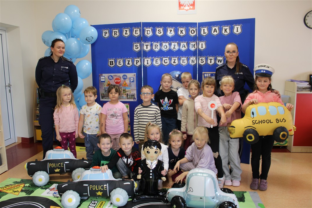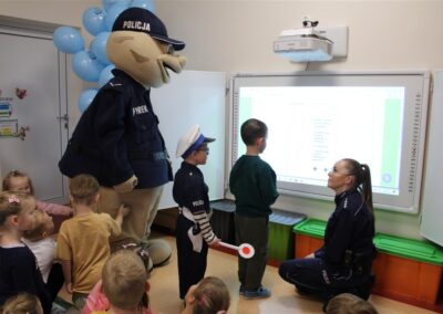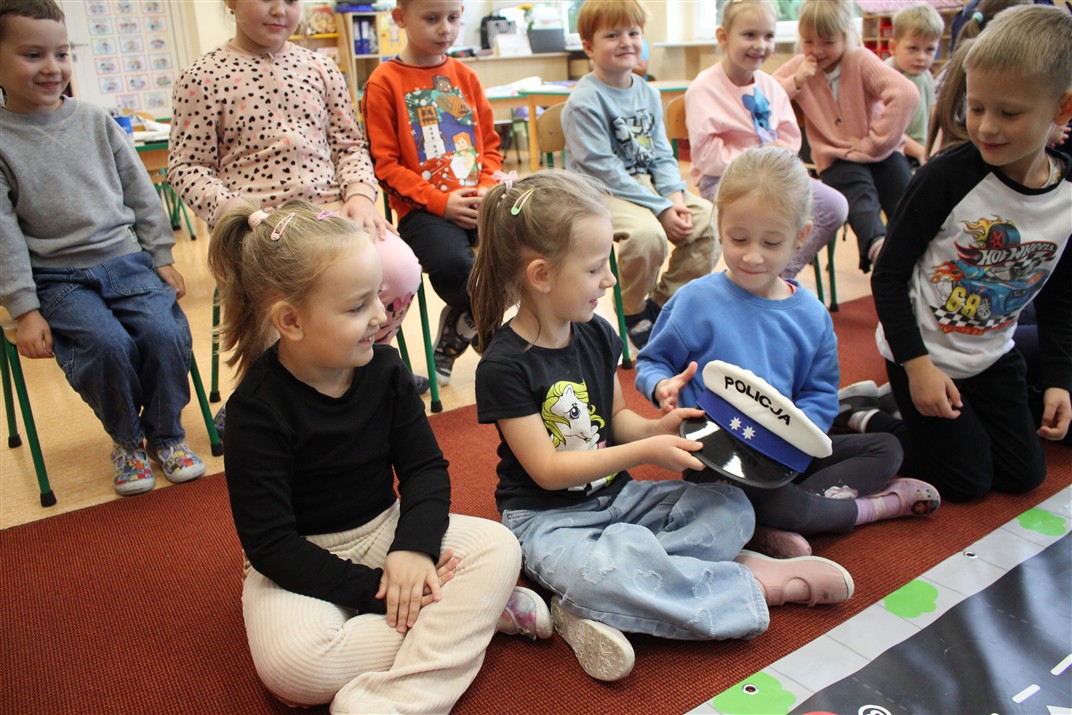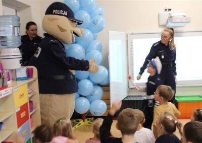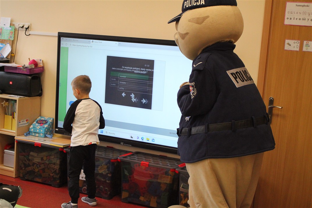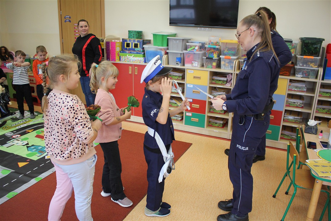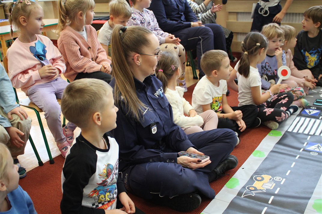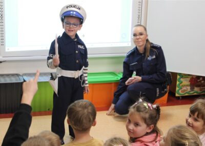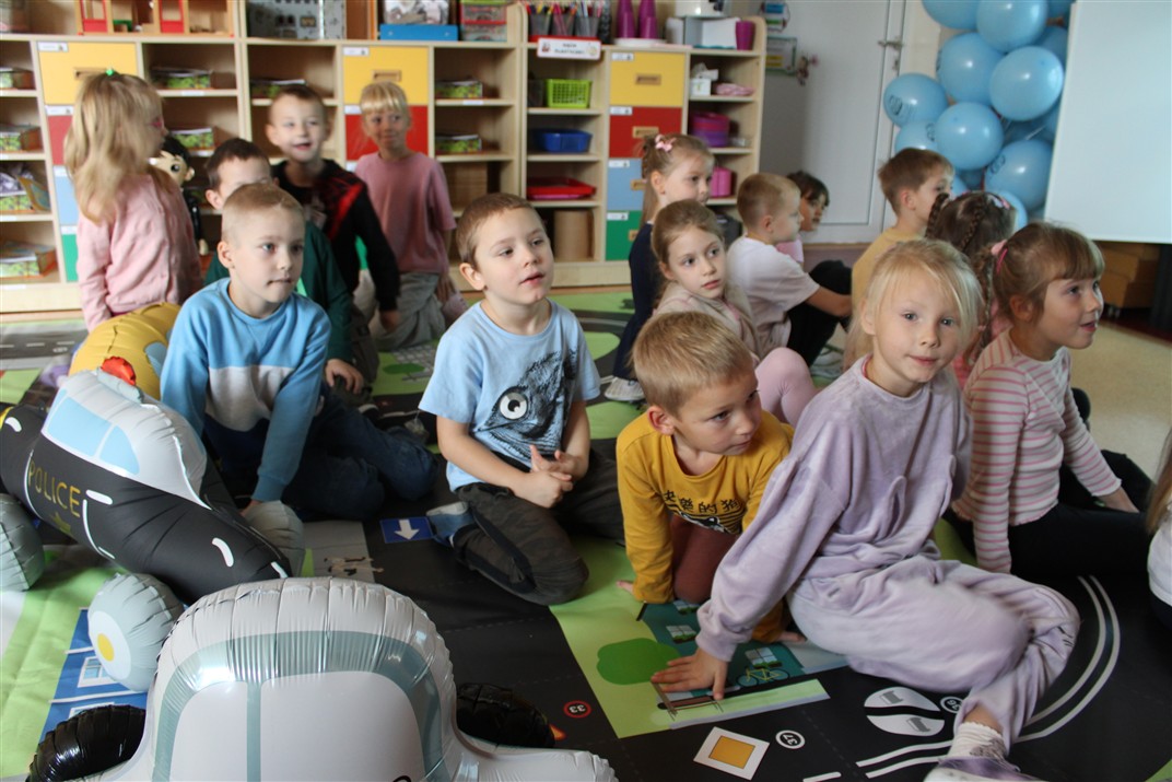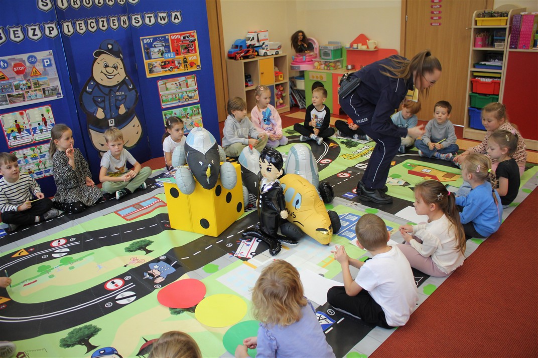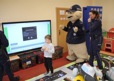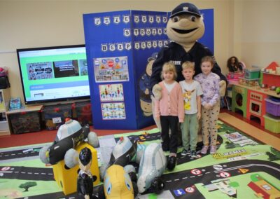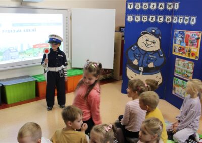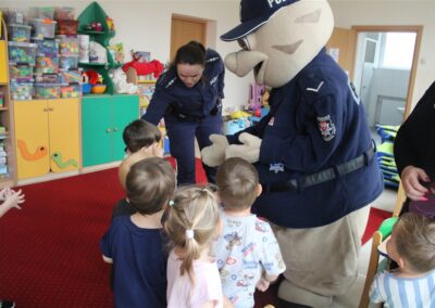 W dniu 16 października dzieci z grupy „Myszek” i „Biedronek” gościły przedstawicieli Komendy Powiatowej Policji w Chodzieży. Podczas spotkania dzieci wzbogaciły wiedzę na temat pracy policjantów, utrwaliły podstawowe zasady bezpiecznego poruszania się po chodniku i na przejściach dla pieszych. Na podstawie ciekawej zabawy zrozumiały także konieczność noszenia elementów odblaskowych. Wykorzystane przez gości rekwizyty, między innymi duża plansza z ulicami i przejściami dla pieszych oraz autka sprawiły, że dzieci z ochotą uczestniczyły w zabawach i nauce jednocześnie. Jednak największą atrakcją dla dzieci było spotkanie z gościem specjalnym, sierżantem Pyrkiem oraz gry edukacyjne z „Krainy Pyrka”. Kolejny raz przedszkolacy upewnili się, że policjant  jest osobą miłą, do której zawsze można zwrócić się o pomoc.