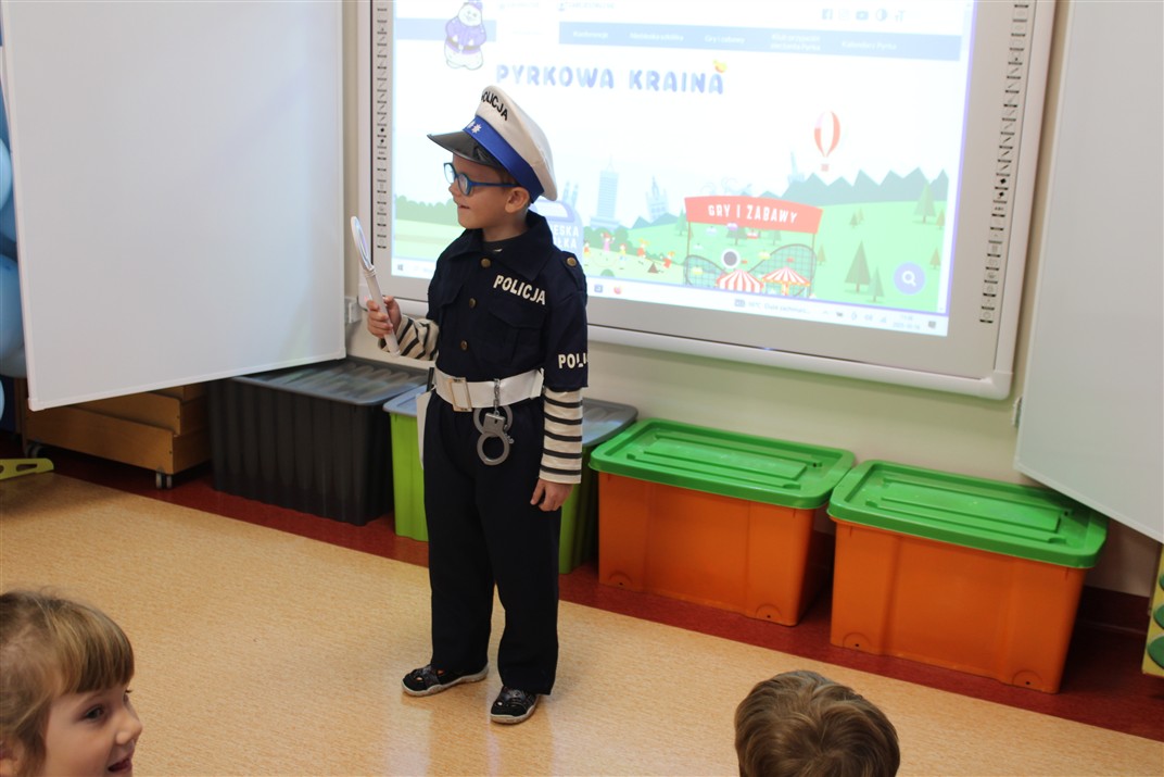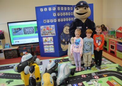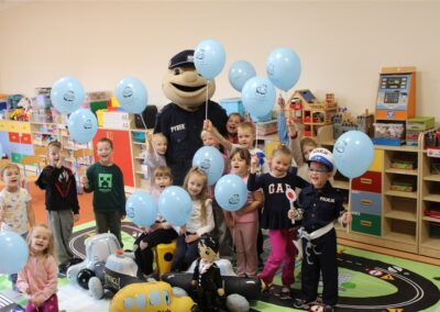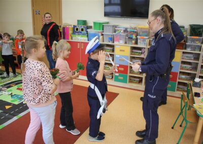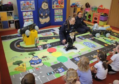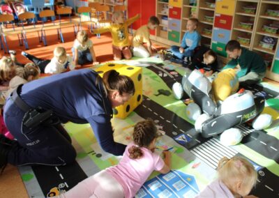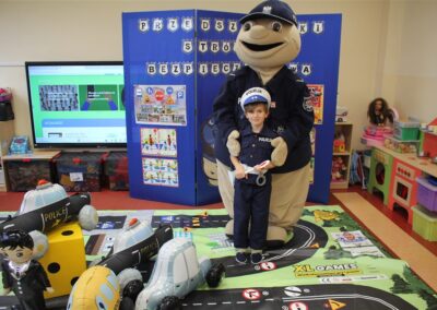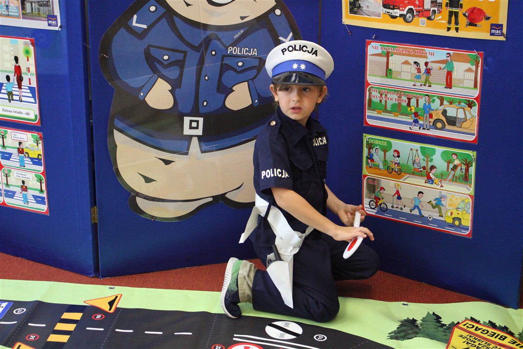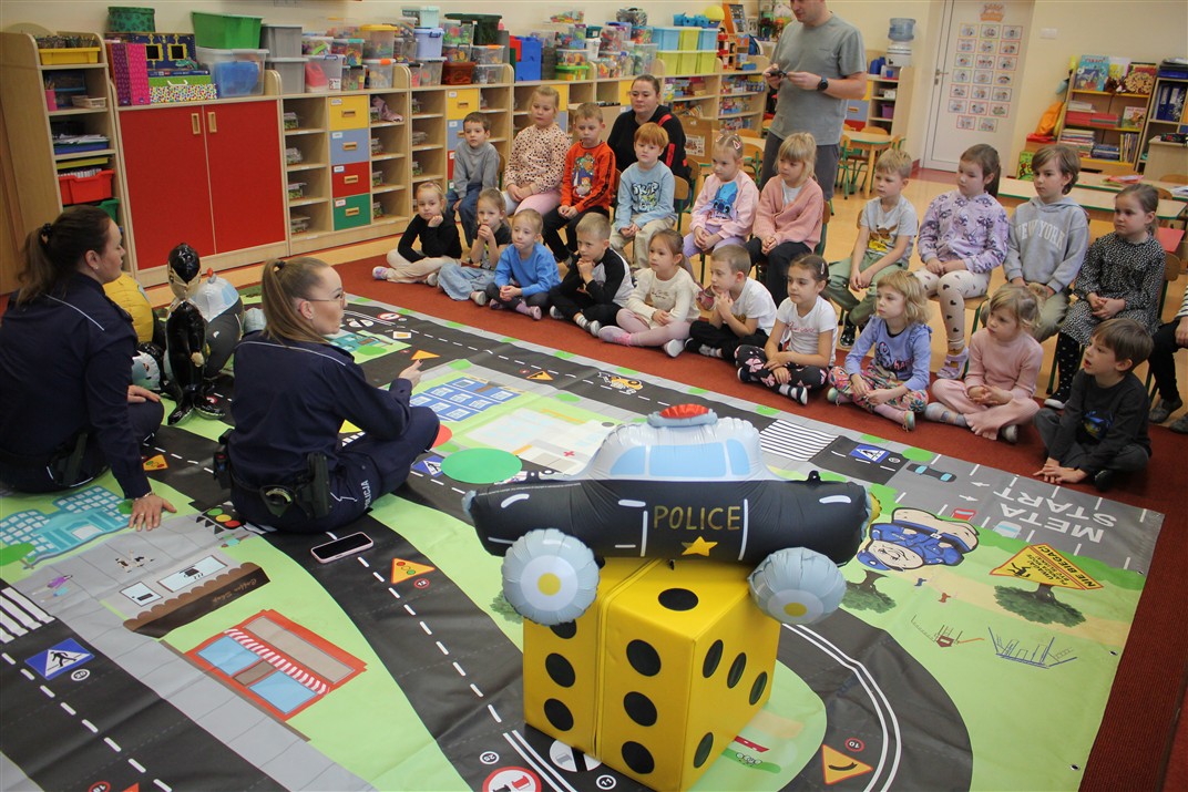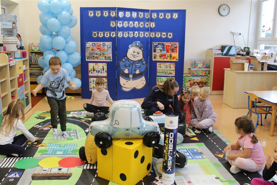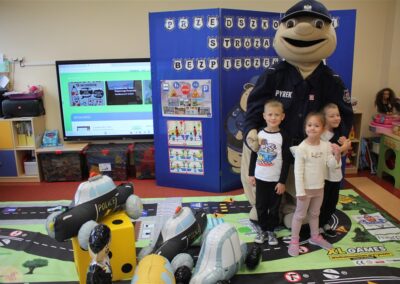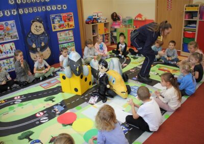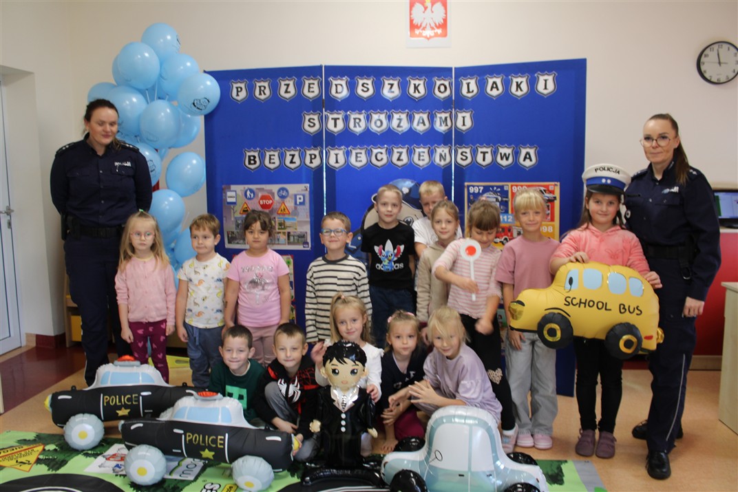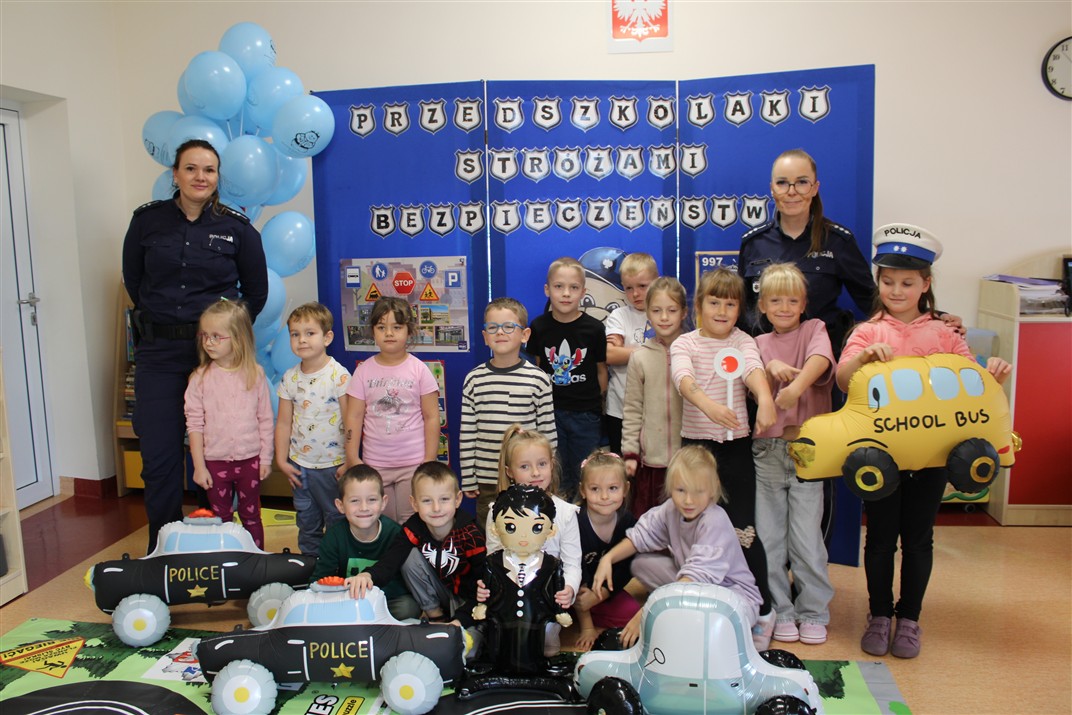 W dniu 16 października dzieci z grupy „Myszek” i „Biedronek” gościły przedstawicieli Komendy Powiatowej Policji w Chodzieży. Podczas spotkania dzieci wzbogaciły wiedzę na temat pracy policjantów, utrwaliły podstawowe zasady bezpiecznego poruszania się po chodniku i na przejściach dla pieszych. Na podstawie ciekawej zabawy zrozumiały także konieczność noszenia elementów odblaskowych. Wykorzystane przez gości rekwizyty, między innymi duża plansza z ulicami i przejściami dla pieszych oraz autka sprawiły, że dzieci z ochotą uczestniczyły w zabawach i nauce jednocześnie. Jednak największą atrakcją dla dzieci było spotkanie z gościem specjalnym, sierżantem Pyrkiem oraz gry edukacyjne z „Krainy Pyrka”. Kolejny raz przedszkolacy upewnili się, że policjant  jest osobą miłą, do której zawsze można zwrócić się o pomoc.