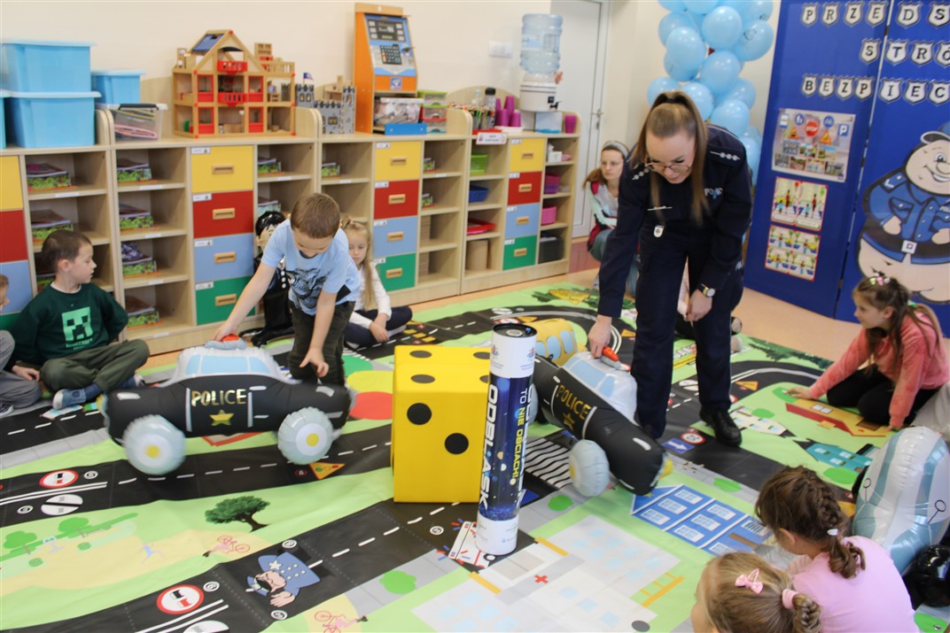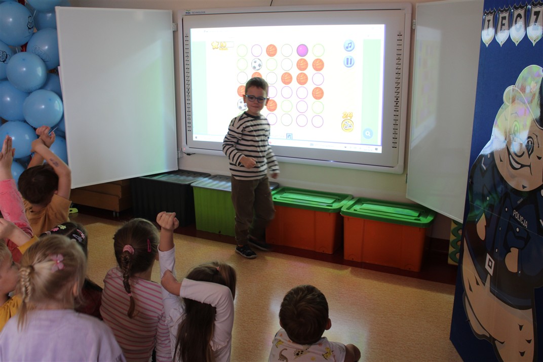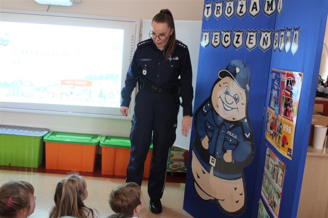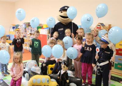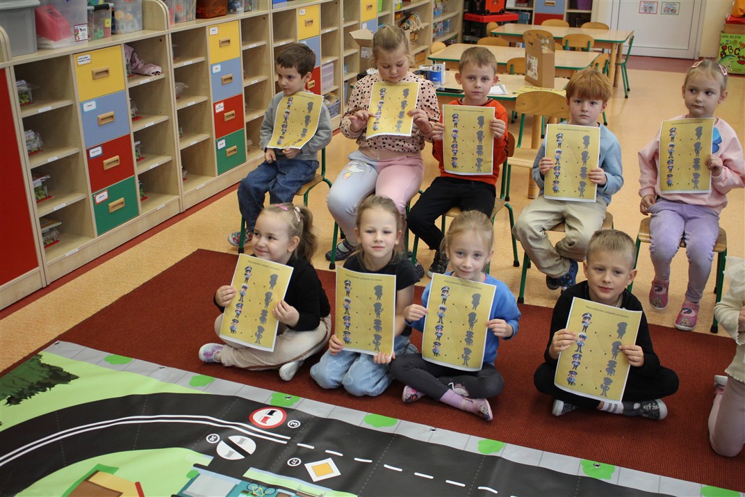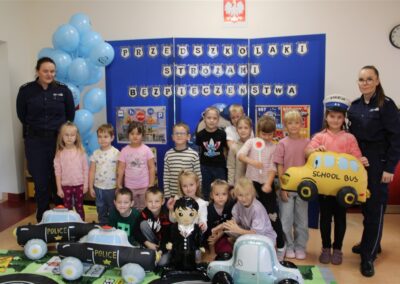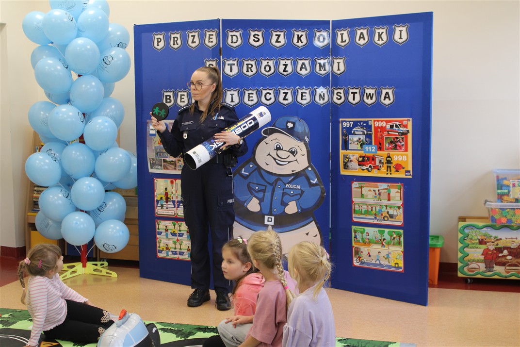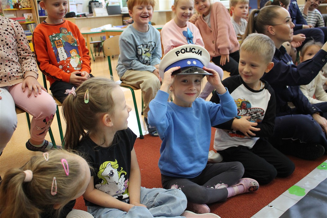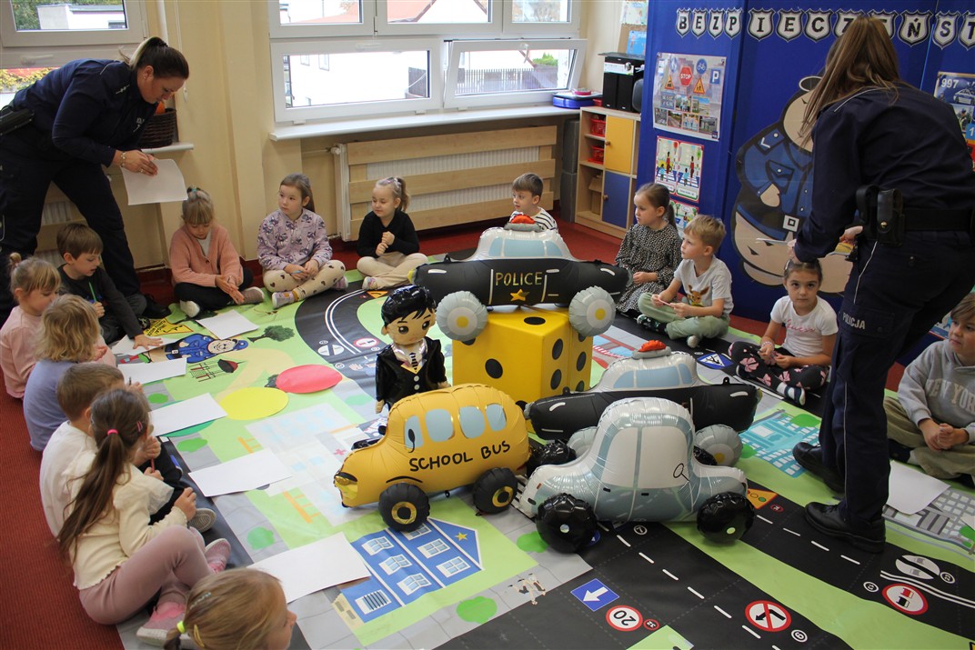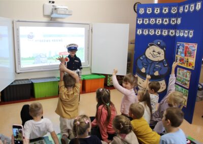 W dniu 16 października dzieci z grupy „Myszek” i „Biedronek” gościły przedstawicieli Komendy Powiatowej Policji w Chodzieży. Podczas spotkania dzieci wzbogaciły wiedzę na temat pracy policjantów, utrwaliły podstawowe zasady bezpiecznego poruszania się po chodniku i na przejściach dla pieszych. Na podstawie ciekawej zabawy zrozumiały także konieczność noszenia elementów odblaskowych. Wykorzystane przez gości rekwizyty, między innymi duża plansza z ulicami i przejściami dla pieszych oraz autka sprawiły, że dzieci z ochotą uczestniczyły w zabawach i nauce jednocześnie. Jednak największą atrakcją dla dzieci było spotkanie z gościem specjalnym, sierżantem Pyrkiem oraz gry edukacyjne z „Krainy Pyrka”. Kolejny raz przedszkolacy upewnili się, że policjant  jest osobą miłą, do której zawsze można zwrócić się o pomoc.