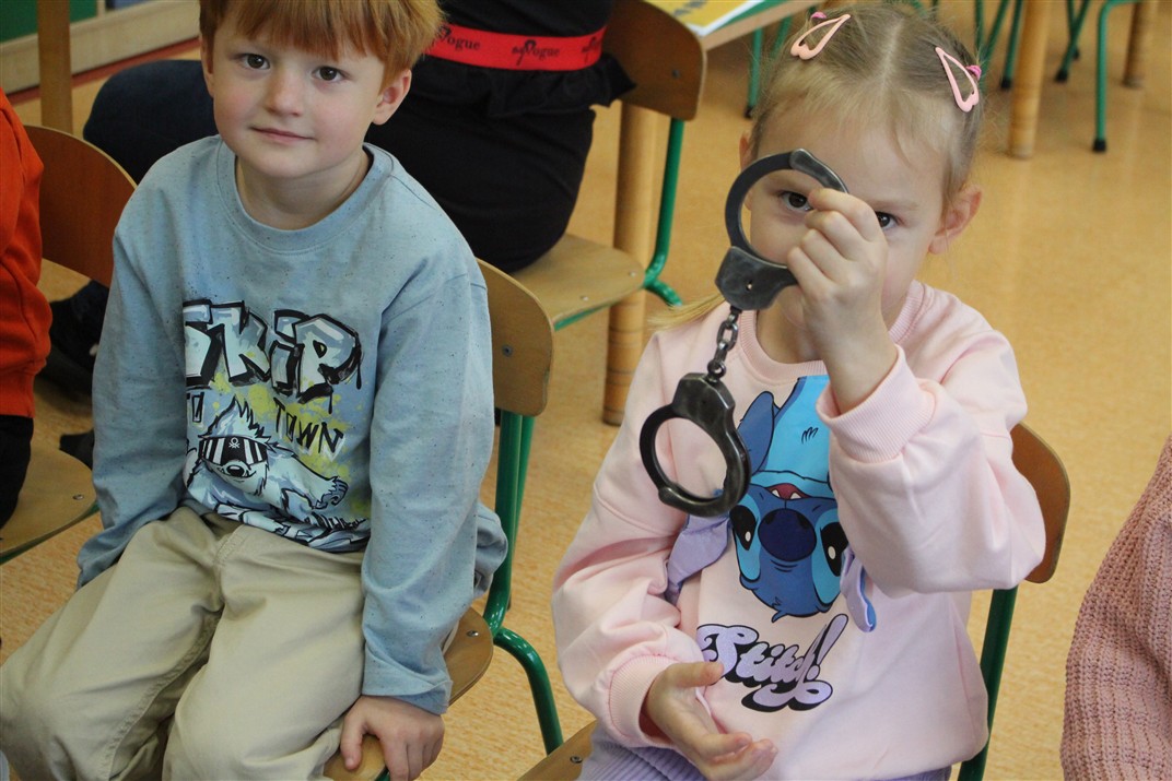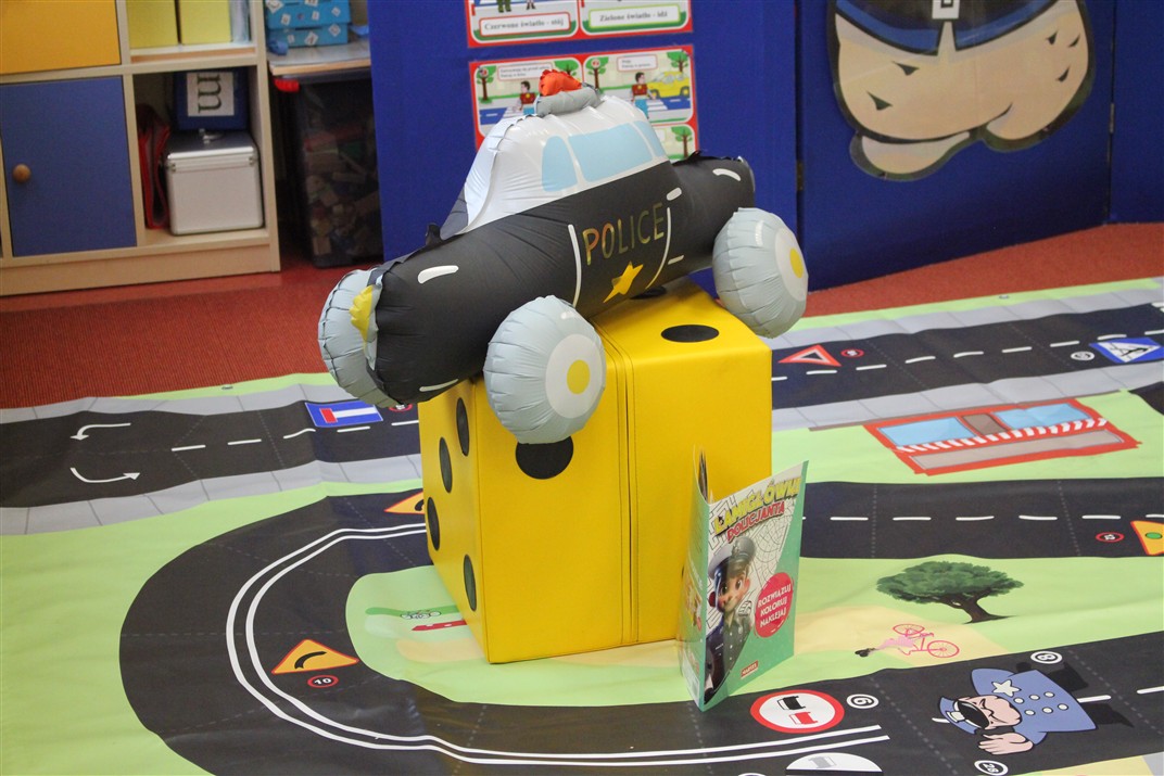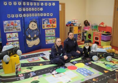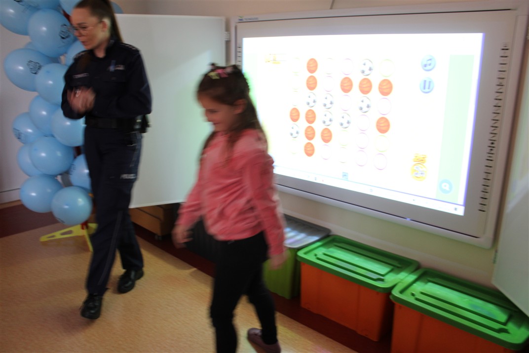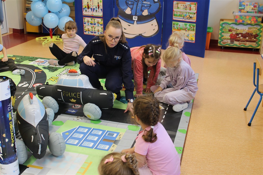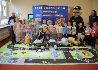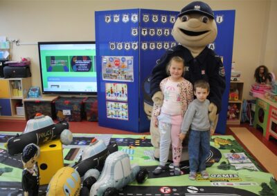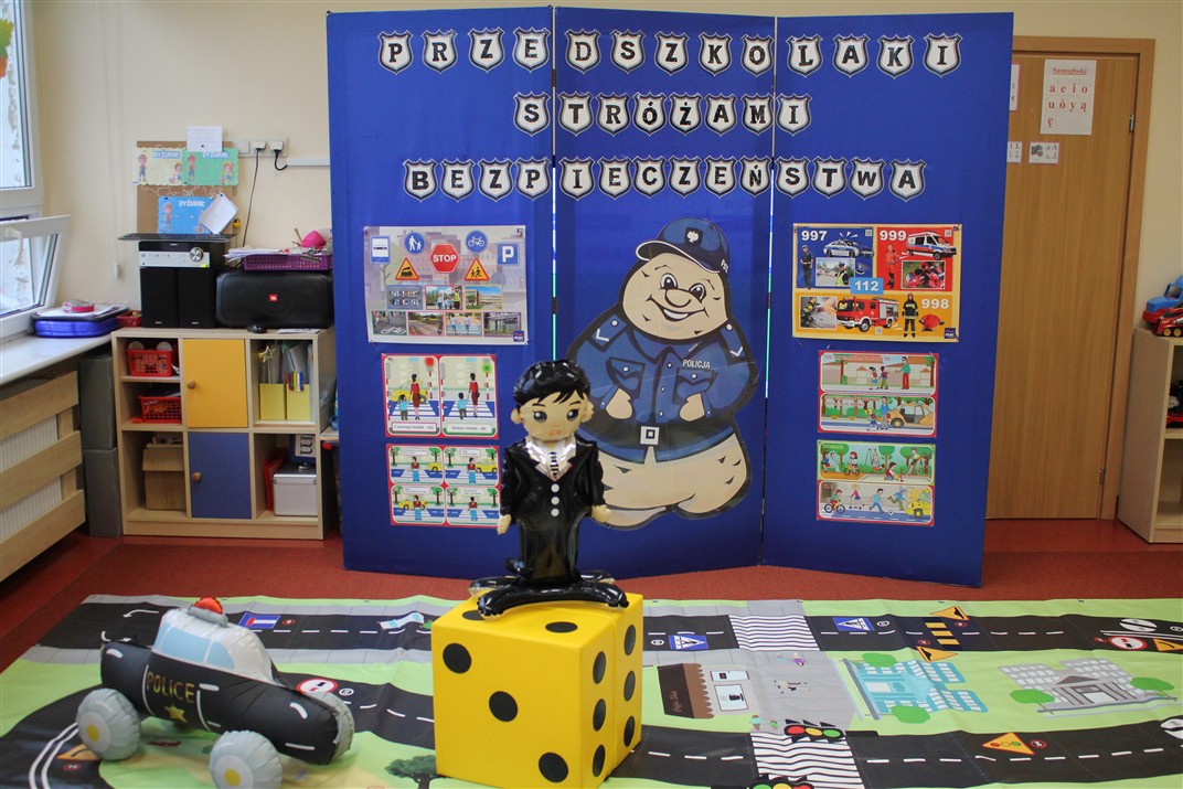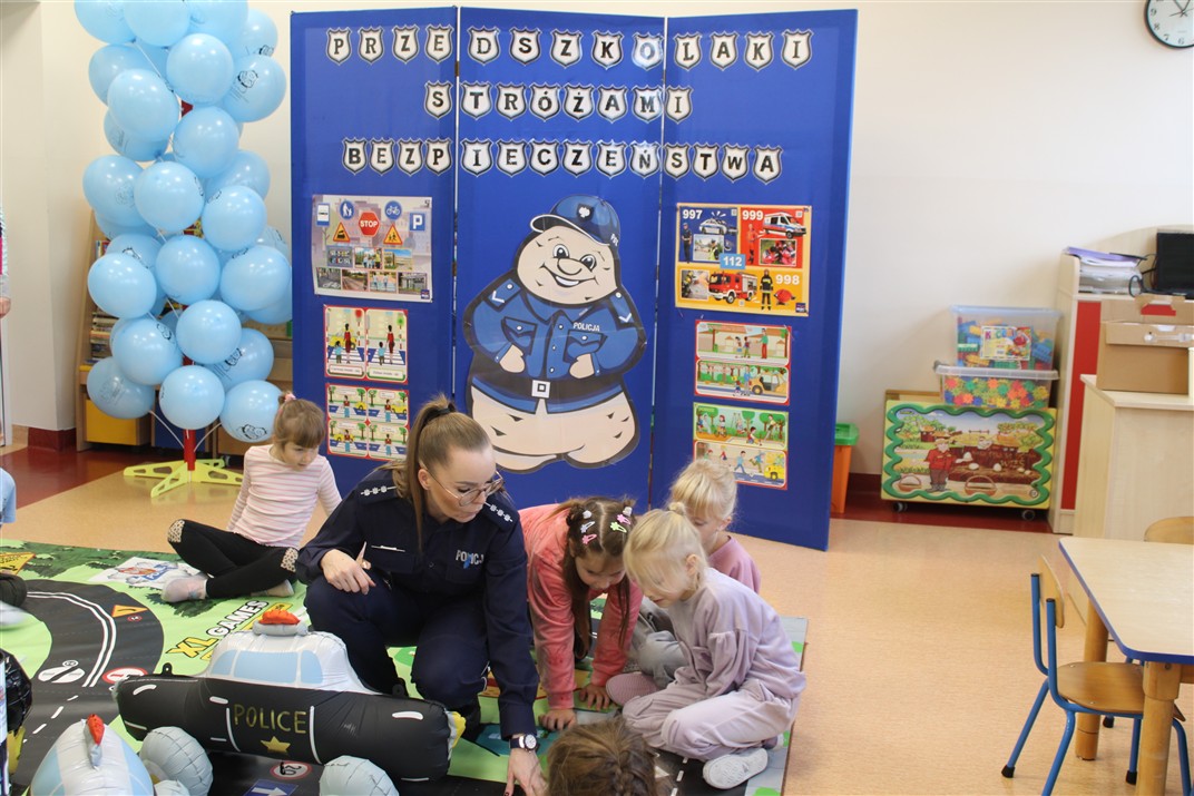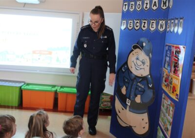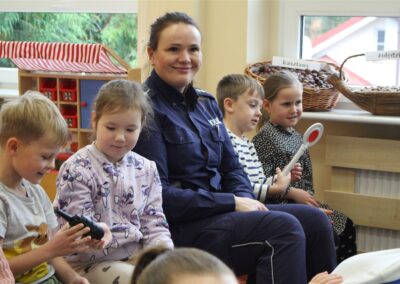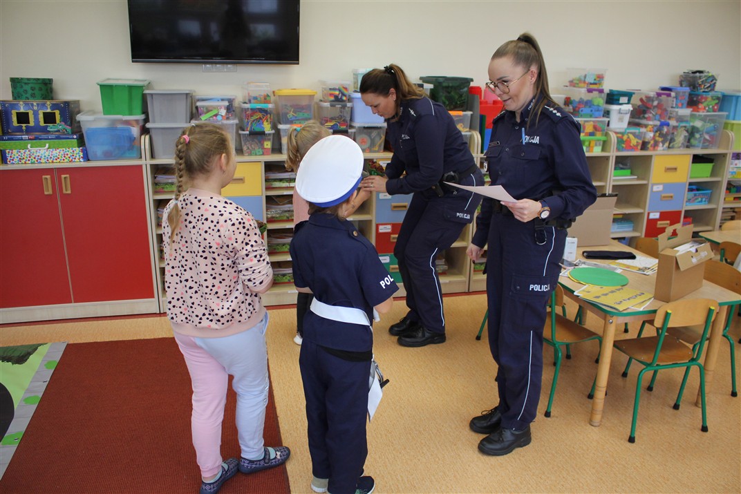 W dniu 16 października dzieci z grupy „Myszek” i „Biedronek” gościły przedstawicieli Komendy Powiatowej Policji w Chodzieży. Podczas spotkania dzieci wzbogaciły wiedzę na temat pracy policjantów, utrwaliły podstawowe zasady bezpiecznego poruszania się po chodniku i na przejściach dla pieszych. Na podstawie ciekawej zabawy zrozumiały także konieczność noszenia elementów odblaskowych. Wykorzystane przez gości rekwizyty, między innymi duża plansza z ulicami i przejściami dla pieszych oraz autka sprawiły, że dzieci z ochotą uczestniczyły w zabawach i nauce jednocześnie. Jednak największą atrakcją dla dzieci było spotkanie z gościem specjalnym, sierżantem Pyrkiem oraz gry edukacyjne z „Krainy Pyrka”. Kolejny raz przedszkolacy upewnili się, że policjant  jest osobą miłą, do której zawsze można zwrócić się o pomoc.