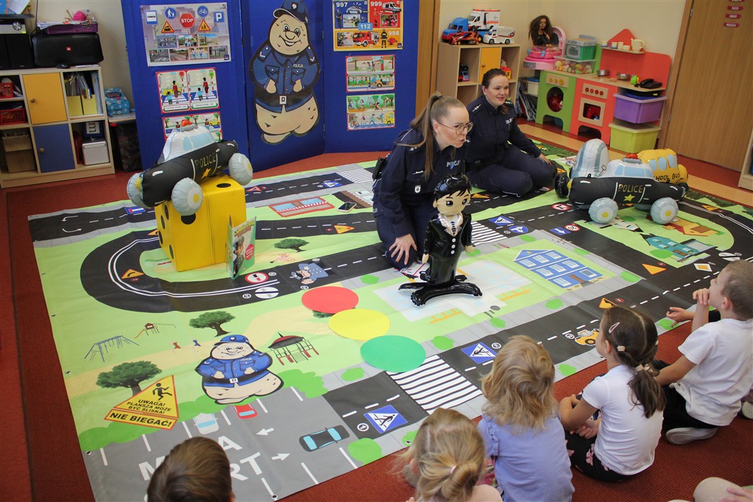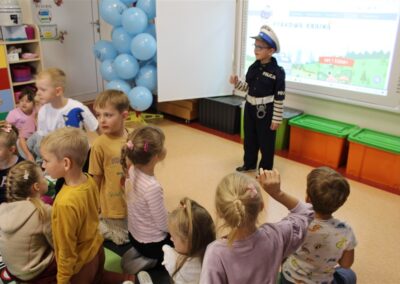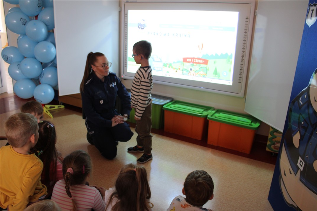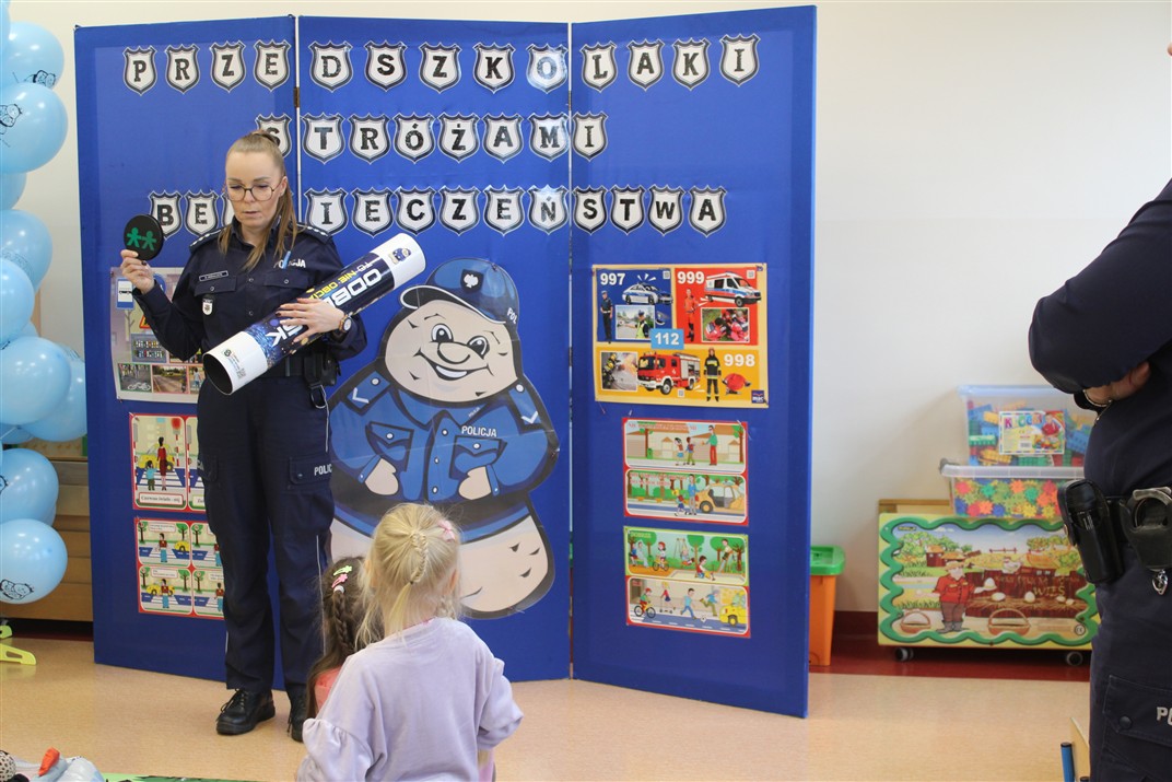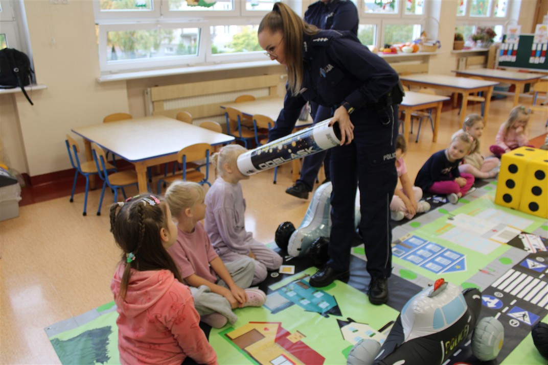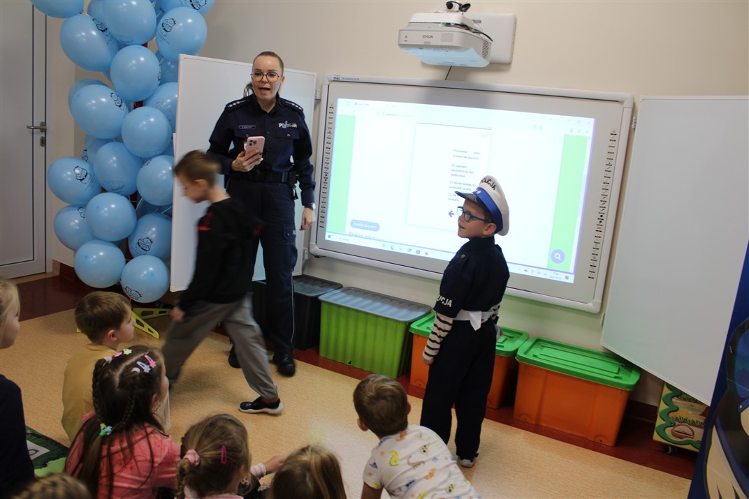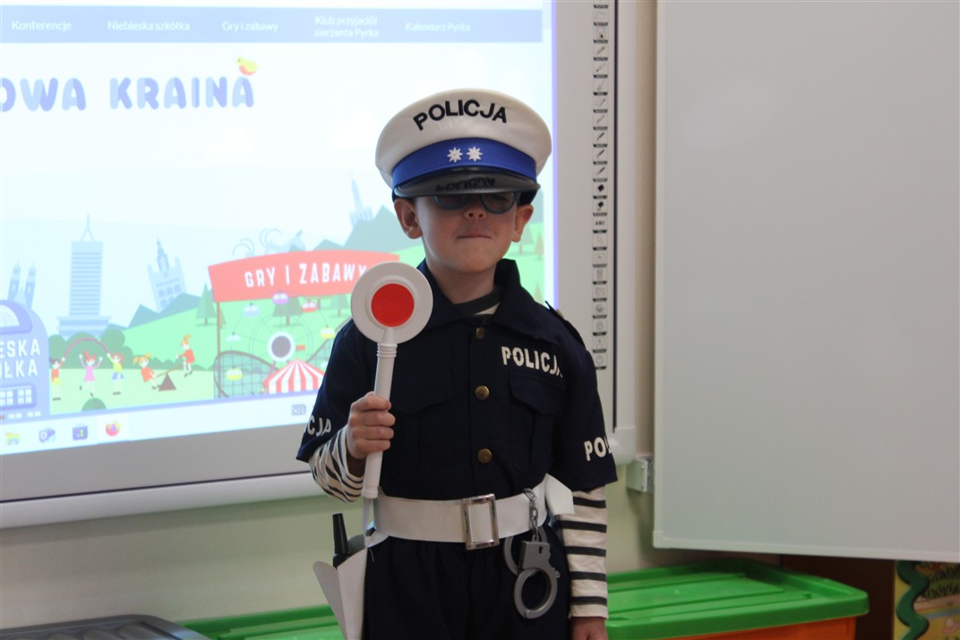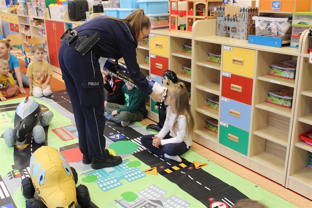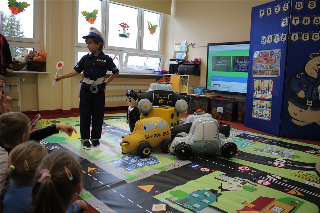 W dniu 16 października dzieci z grupy „Myszek” i „Biedronek” gościły przedstawicieli Komendy Powiatowej Policji w Chodzieży. Podczas spotkania dzieci wzbogaciły wiedzę na temat pracy policjantów, utrwaliły podstawowe zasady bezpiecznego poruszania się po chodniku i na przejściach dla pieszych. Na podstawie ciekawej zabawy zrozumiały także konieczność noszenia elementów odblaskowych. Wykorzystane przez gości rekwizyty, między innymi duża plansza z ulicami i przejściami dla pieszych oraz autka sprawiły, że dzieci z ochotą uczestniczyły w zabawach i nauce jednocześnie. Jednak największą atrakcją dla dzieci było spotkanie z gościem specjalnym, sierżantem Pyrkiem oraz gry edukacyjne z „Krainy Pyrka”. Kolejny raz przedszkolacy upewnili się, że policjant  jest osobą miłą, do której zawsze można zwrócić się o pomoc.