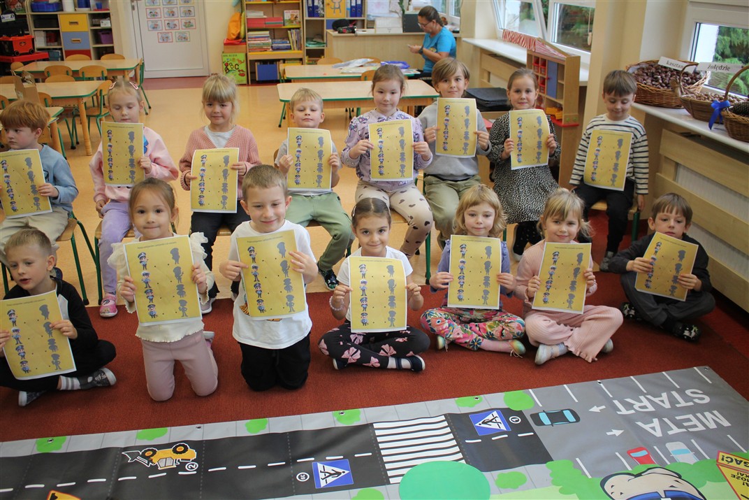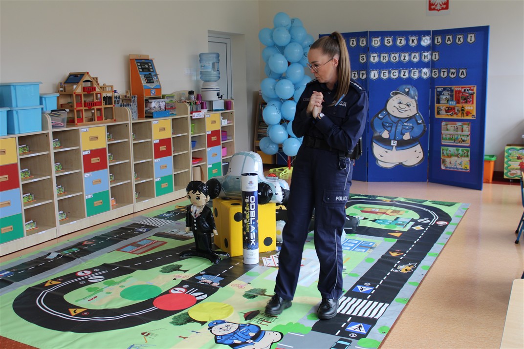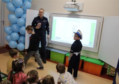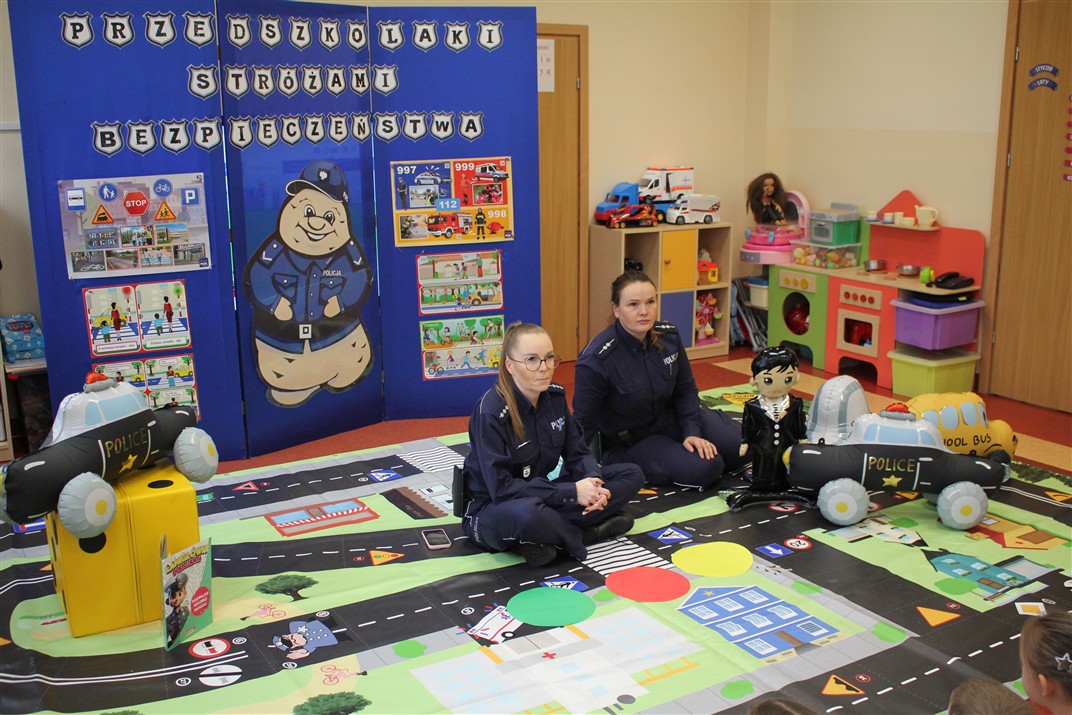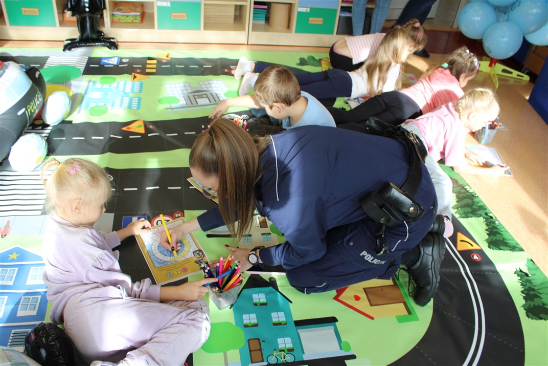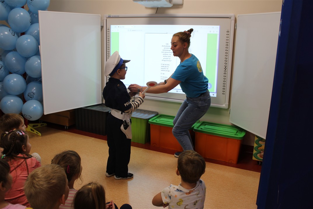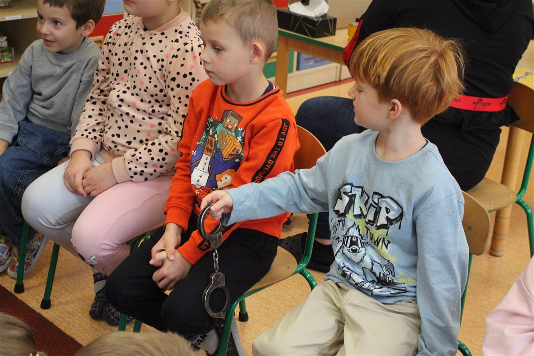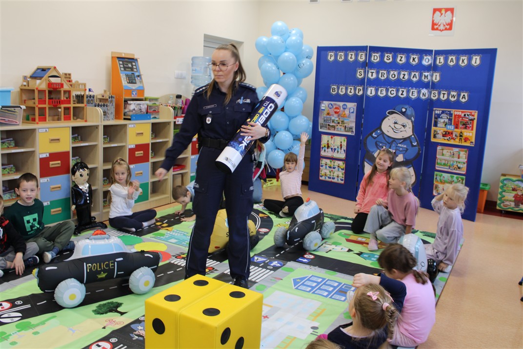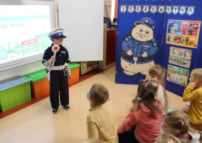 W dniu 16 października dzieci z grupy „Myszek” i „Biedronek” gościły przedstawicieli Komendy Powiatowej Policji w Chodzieży. Podczas spotkania dzieci wzbogaciły wiedzę na temat pracy policjantów, utrwaliły podstawowe zasady bezpiecznego poruszania się po chodniku i na przejściach dla pieszych. Na podstawie ciekawej zabawy zrozumiały także konieczność noszenia elementów odblaskowych. Wykorzystane przez gości rekwizyty, między innymi duża plansza z ulicami i przejściami dla pieszych oraz autka sprawiły, że dzieci z ochotą uczestniczyły w zabawach i nauce jednocześnie. Jednak największą atrakcją dla dzieci było spotkanie z gościem specjalnym, sierżantem Pyrkiem oraz gry edukacyjne z „Krainy Pyrka”. Kolejny raz przedszkolacy upewnili się, że policjant  jest osobą miłą, do której zawsze można zwrócić się o pomoc.