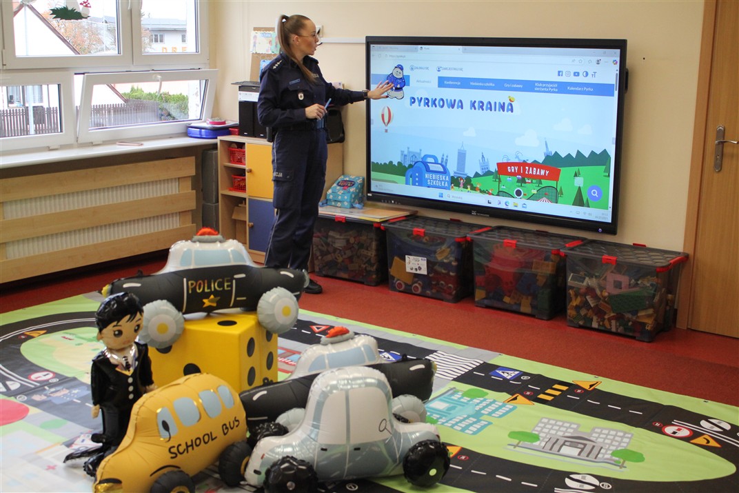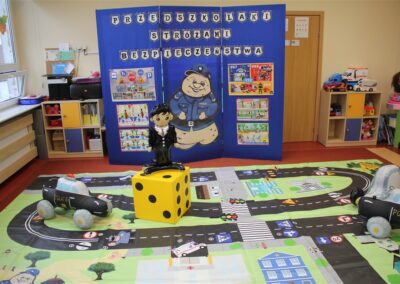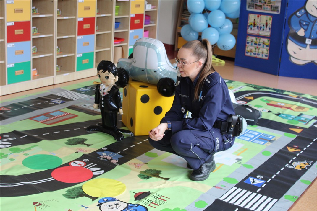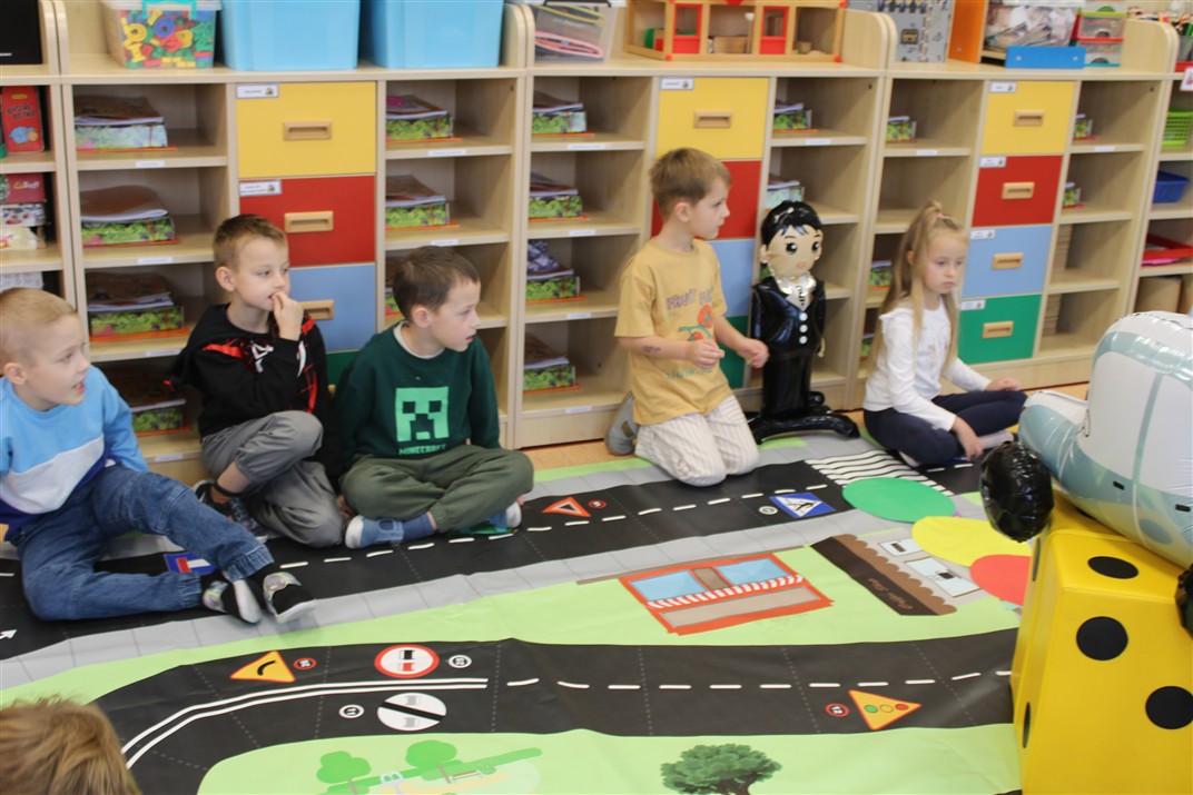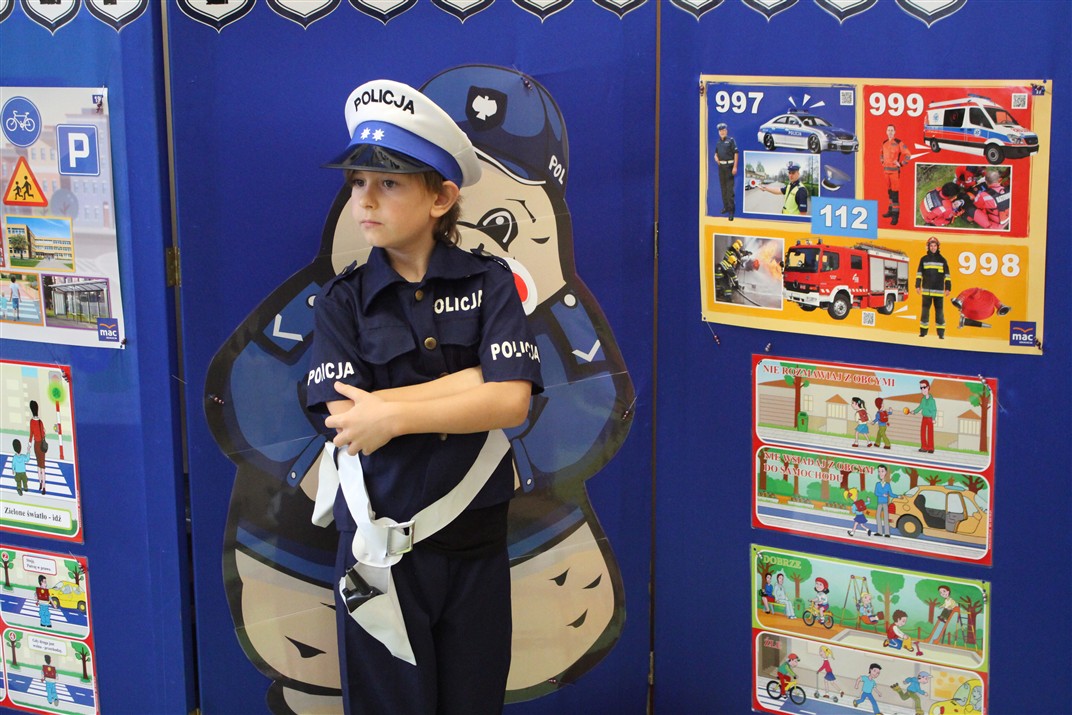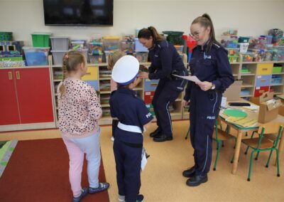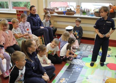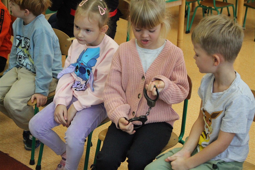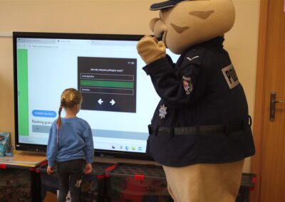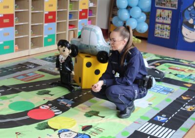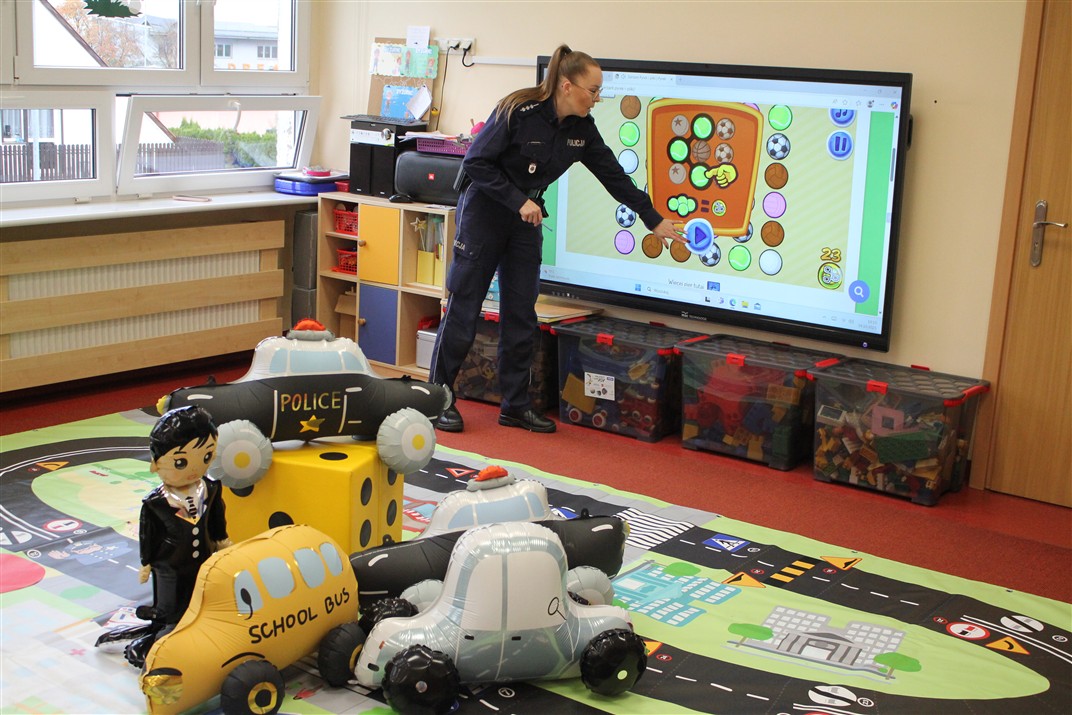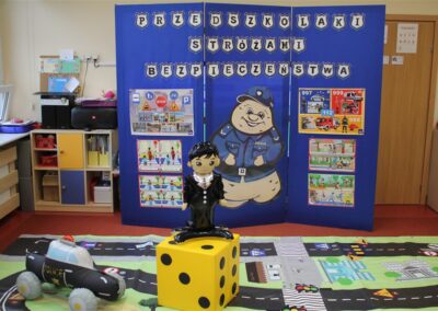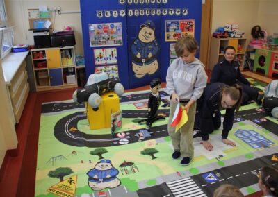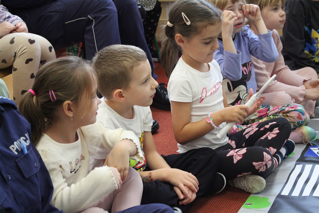 W dniu 16 października dzieci z grupy „Myszek” i „Biedronek” gościły przedstawicieli Komendy Powiatowej Policji w Chodzieży. Podczas spotkania dzieci wzbogaciły wiedzę na temat pracy policjantów, utrwaliły podstawowe zasady bezpiecznego poruszania się po chodniku i na przejściach dla pieszych. Na podstawie ciekawej zabawy zrozumiały także konieczność noszenia elementów odblaskowych. Wykorzystane przez gości rekwizyty, między innymi duża plansza z ulicami i przejściami dla pieszych oraz autka sprawiły, że dzieci z ochotą uczestniczyły w zabawach i nauce jednocześnie. Jednak największą atrakcją dla dzieci było spotkanie z gościem specjalnym, sierżantem Pyrkiem oraz gry edukacyjne z „Krainy Pyrka”. Kolejny raz przedszkolacy upewnili się, że policjant  jest osobą miłą, do której zawsze można zwrócić się o pomoc.