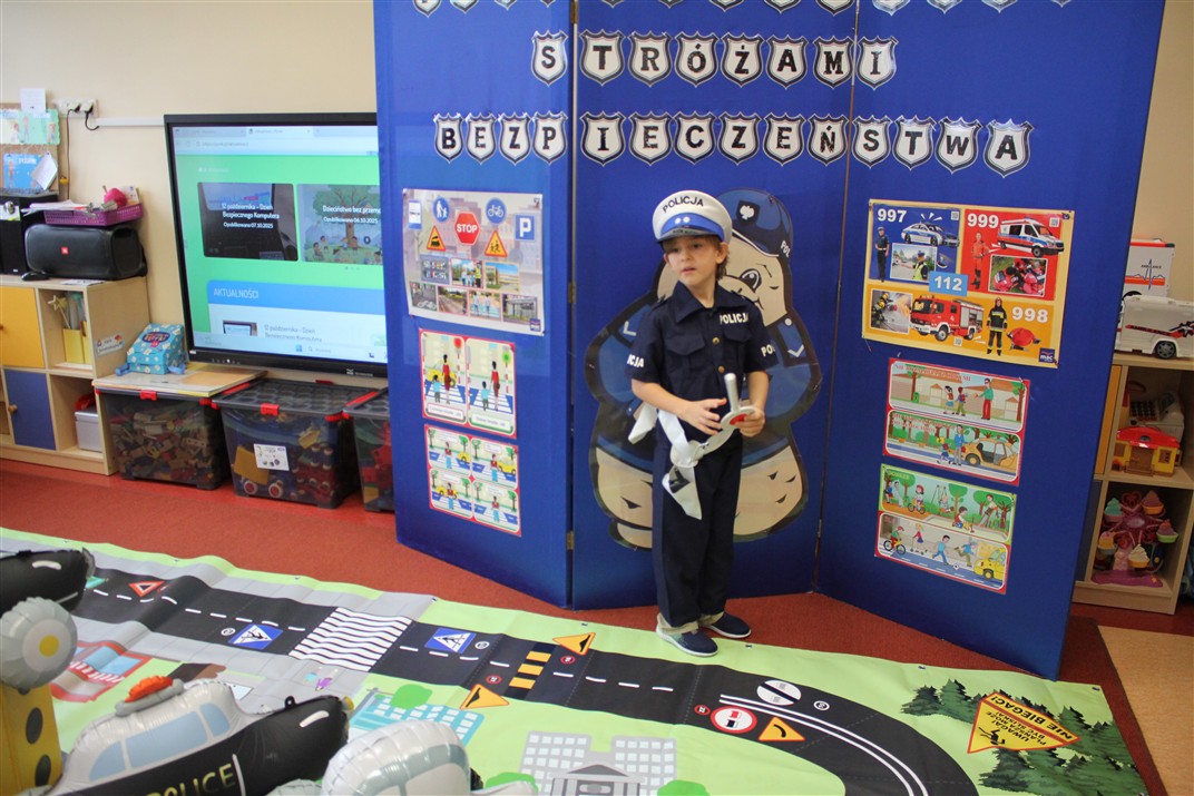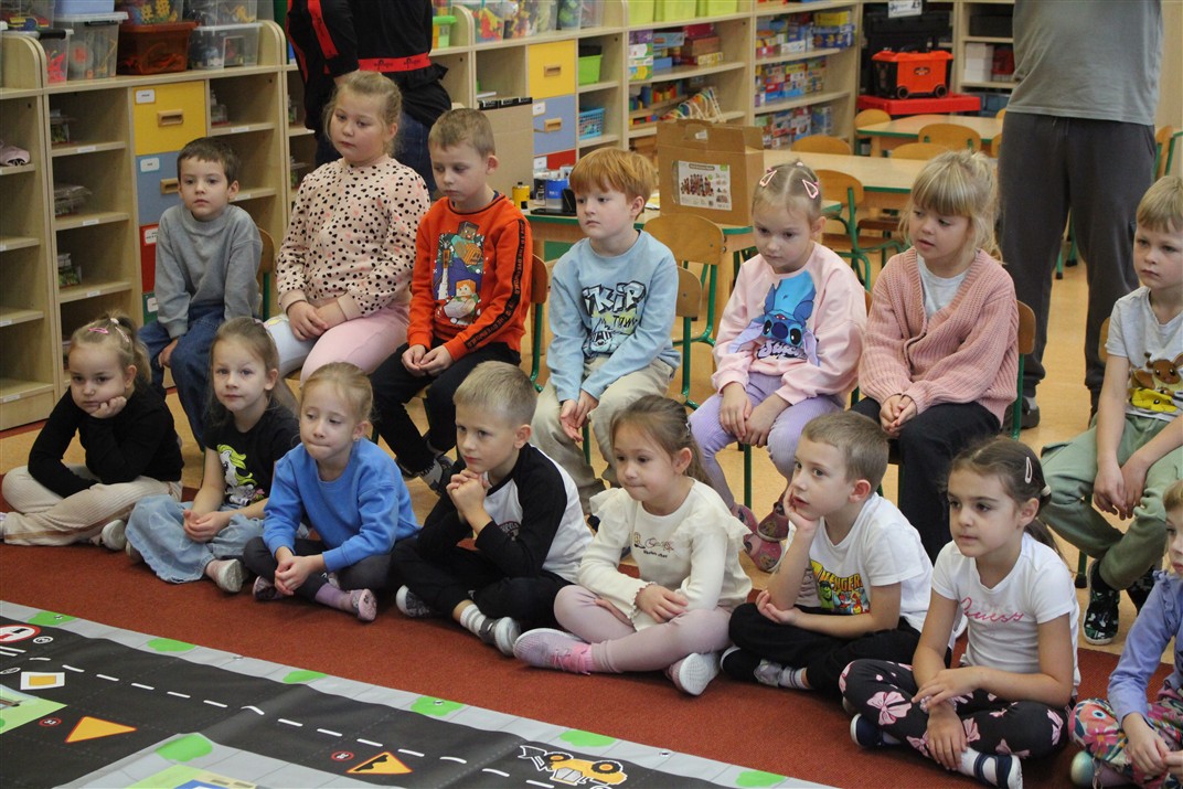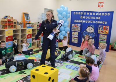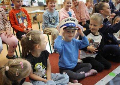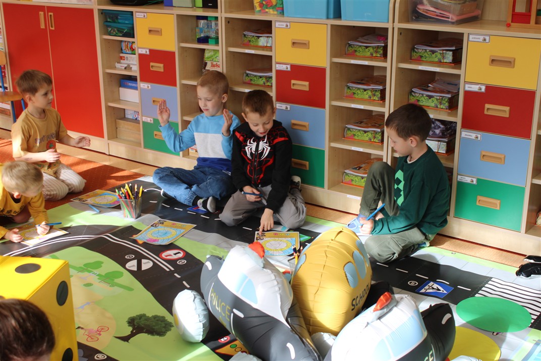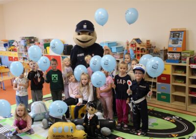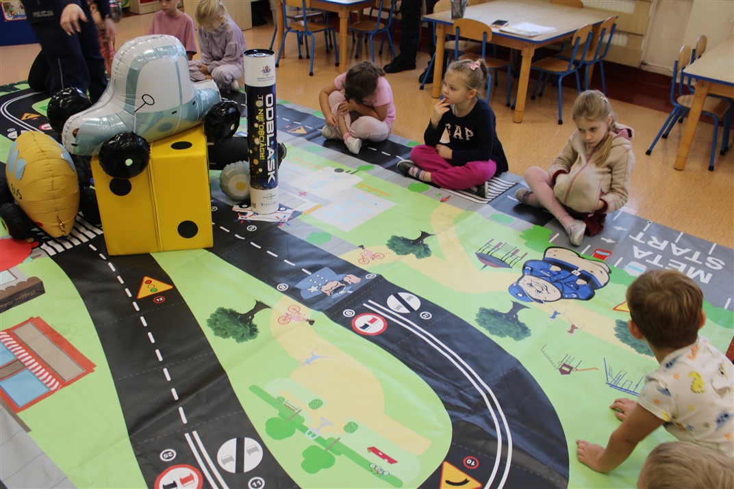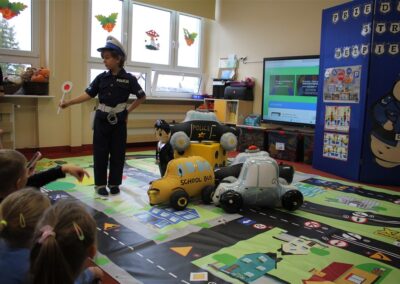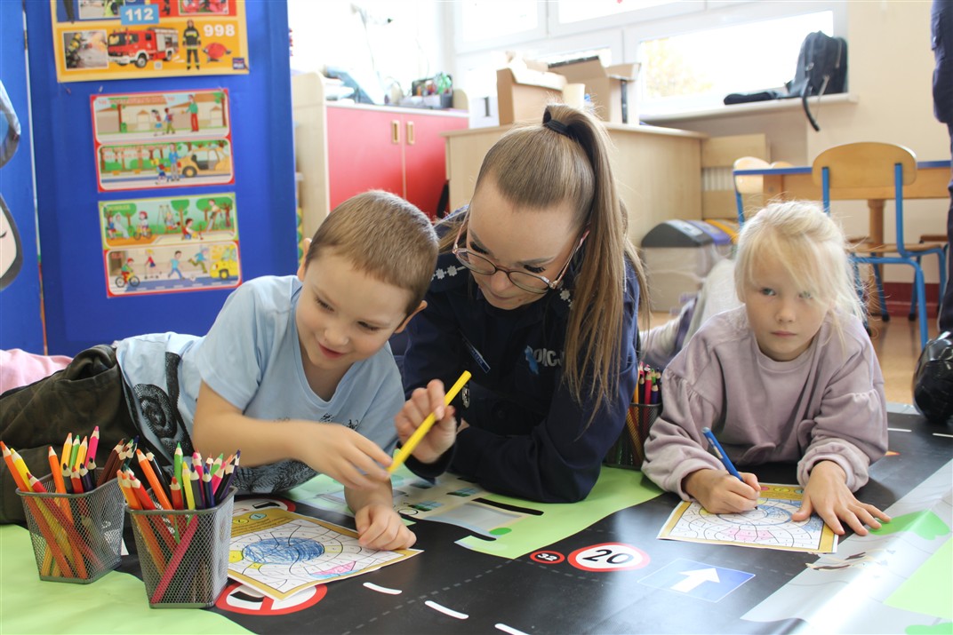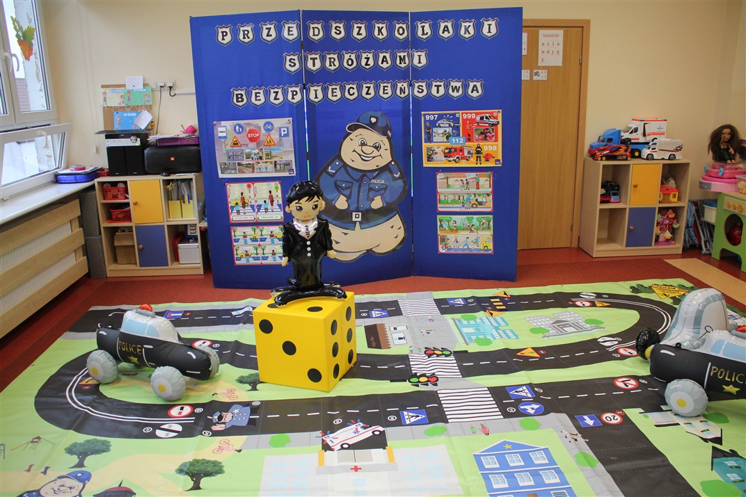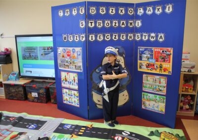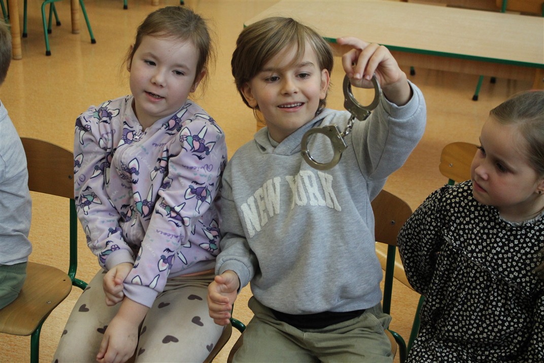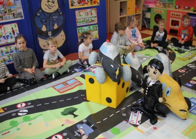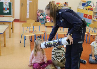 W dniu 16 października dzieci z grupy „Myszek” i „Biedronek” gościły przedstawicieli Komendy Powiatowej Policji w Chodzieży. Podczas spotkania dzieci wzbogaciły wiedzę na temat pracy policjantów, utrwaliły podstawowe zasady bezpiecznego poruszania się po chodniku i na przejściach dla pieszych. Na podstawie ciekawej zabawy zrozumiały także konieczność noszenia elementów odblaskowych. Wykorzystane przez gości rekwizyty, między innymi duża plansza z ulicami i przejściami dla pieszych oraz autka sprawiły, że dzieci z ochotą uczestniczyły w zabawach i nauce jednocześnie. Jednak największą atrakcją dla dzieci było spotkanie z gościem specjalnym, sierżantem Pyrkiem oraz gry edukacyjne z „Krainy Pyrka”. Kolejny raz przedszkolacy upewnili się, że policjant  jest osobą miłą, do której zawsze można zwrócić się o pomoc.