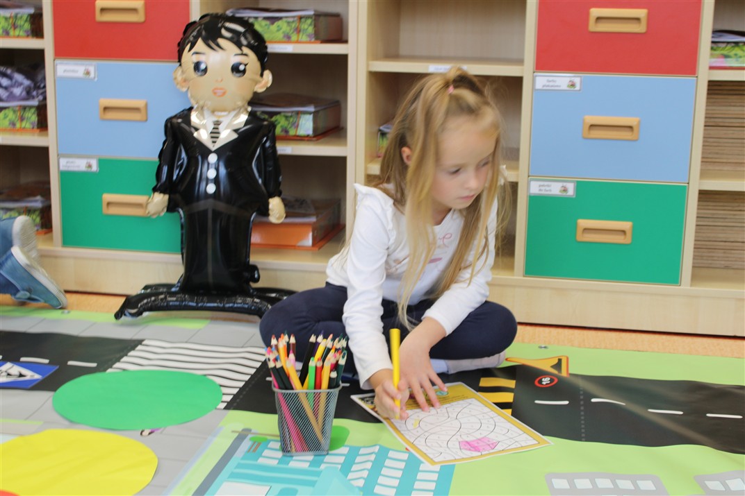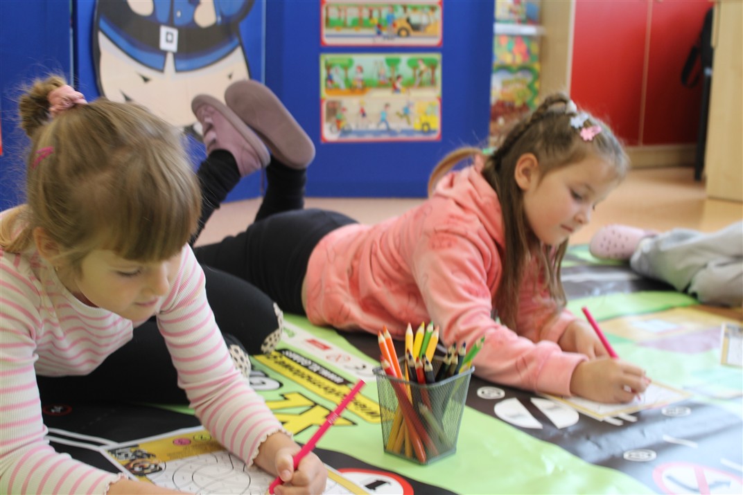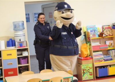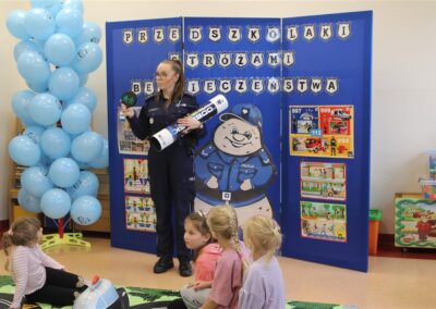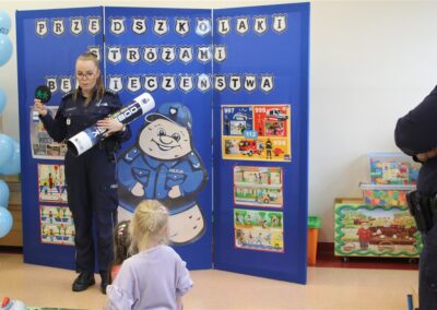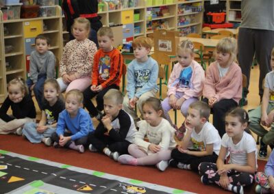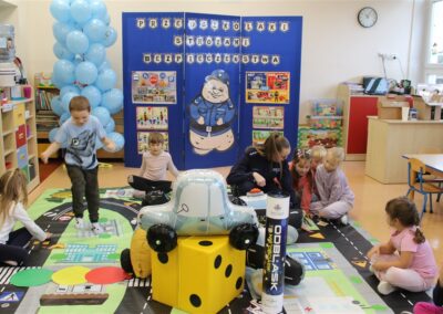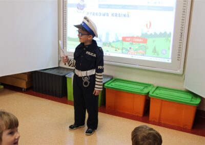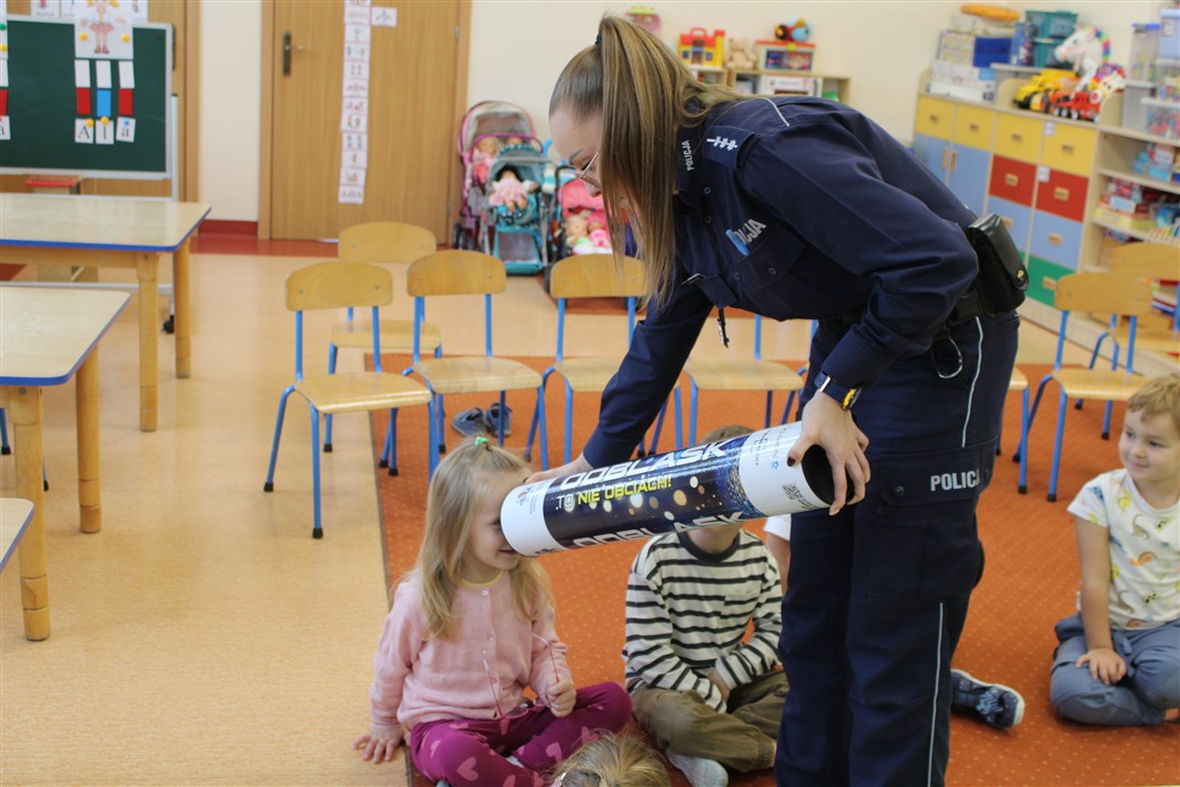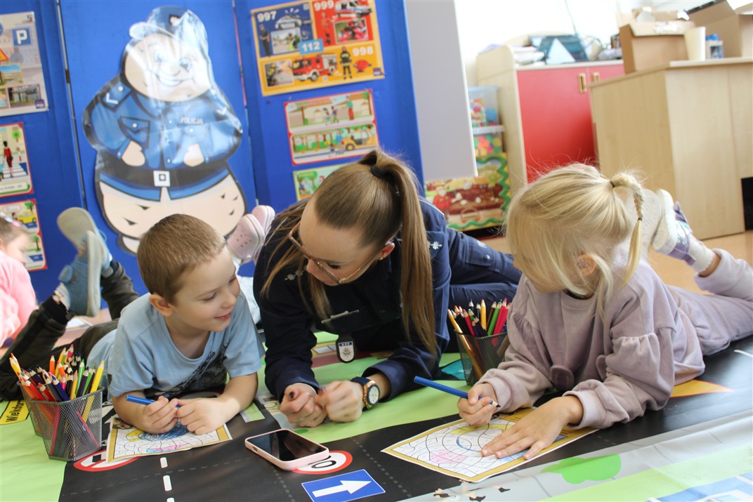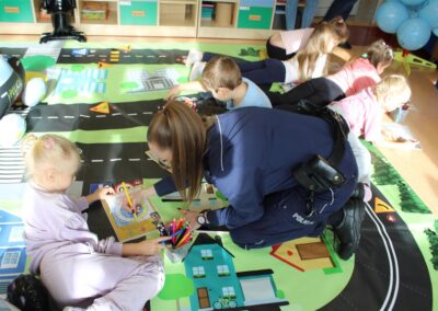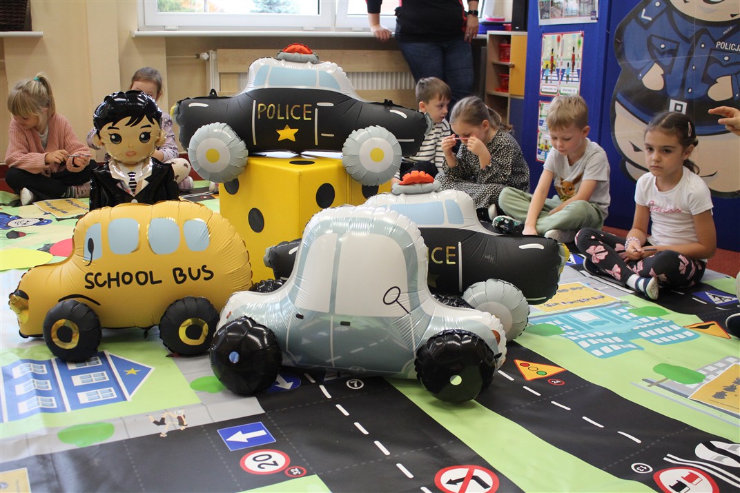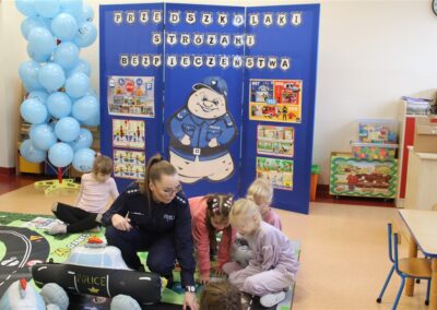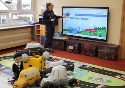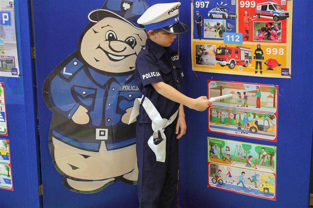 W dniu 16 października dzieci z grupy „Myszek” i „Biedronek” gościły przedstawicieli Komendy Powiatowej Policji w Chodzieży. Podczas spotkania dzieci wzbogaciły wiedzę na temat pracy policjantów, utrwaliły podstawowe zasady bezpiecznego poruszania się po chodniku i na przejściach dla pieszych. Na podstawie ciekawej zabawy zrozumiały także konieczność noszenia elementów odblaskowych. Wykorzystane przez gości rekwizyty, między innymi duża plansza z ulicami i przejściami dla pieszych oraz autka sprawiły, że dzieci z ochotą uczestniczyły w zabawach i nauce jednocześnie. Jednak największą atrakcją dla dzieci było spotkanie z gościem specjalnym, sierżantem Pyrkiem oraz gry edukacyjne z „Krainy Pyrka”. Kolejny raz przedszkolacy upewnili się, że policjant  jest osobą miłą, do której zawsze można zwrócić się o pomoc.