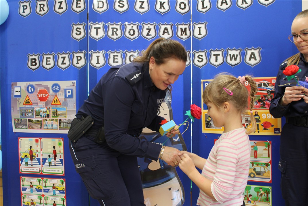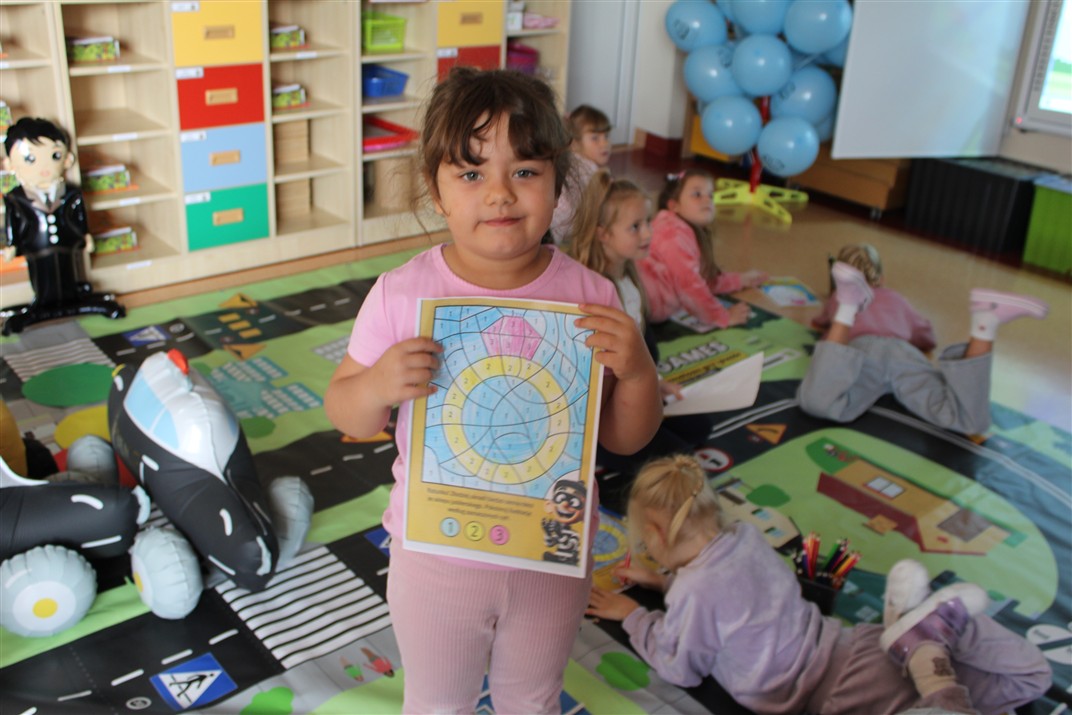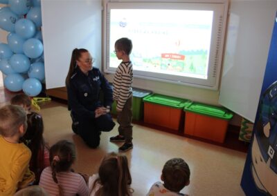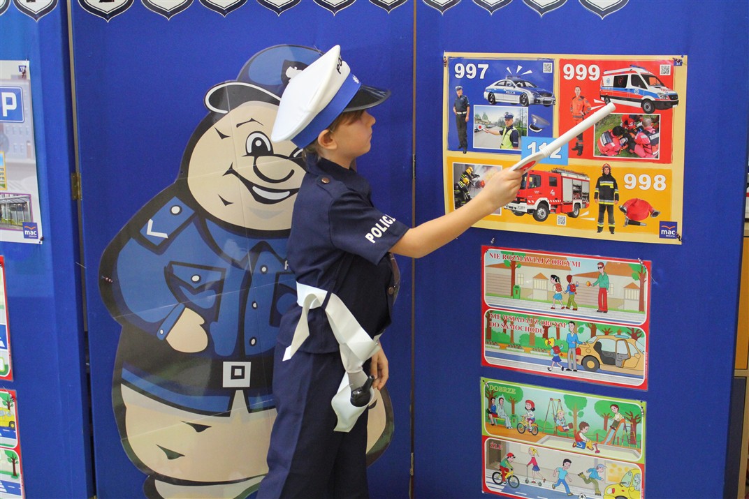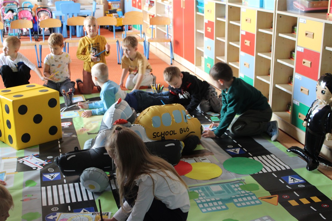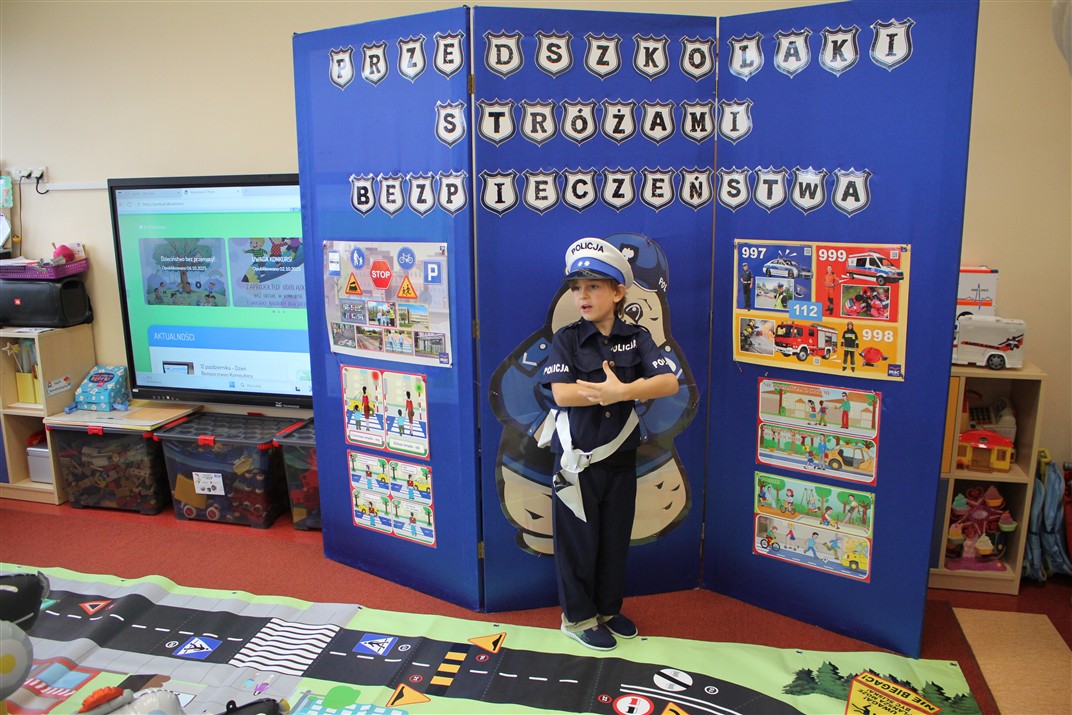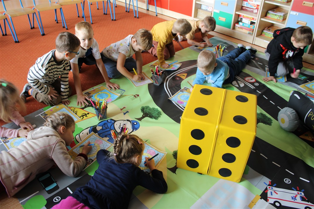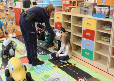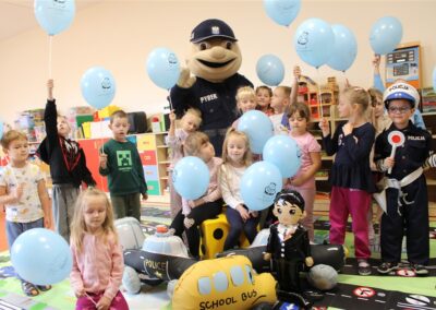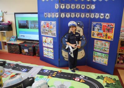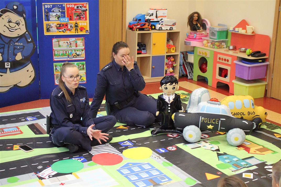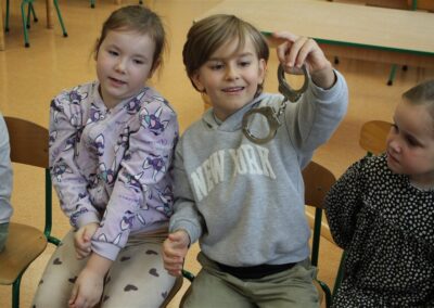 W dniu 16 października dzieci z grupy „Myszek” i „Biedronek” gościły przedstawicieli Komendy Powiatowej Policji w Chodzieży. Podczas spotkania dzieci wzbogaciły wiedzę na temat pracy policjantów, utrwaliły podstawowe zasady bezpiecznego poruszania się po chodniku i na przejściach dla pieszych. Na podstawie ciekawej zabawy zrozumiały także konieczność noszenia elementów odblaskowych. Wykorzystane przez gości rekwizyty, między innymi duża plansza z ulicami i przejściami dla pieszych oraz autka sprawiły, że dzieci z ochotą uczestniczyły w zabawach i nauce jednocześnie. Jednak największą atrakcją dla dzieci było spotkanie z gościem specjalnym, sierżantem Pyrkiem oraz gry edukacyjne z „Krainy Pyrka”. Kolejny raz przedszkolacy upewnili się, że policjant  jest osobą miłą, do której zawsze można zwrócić się o pomoc.