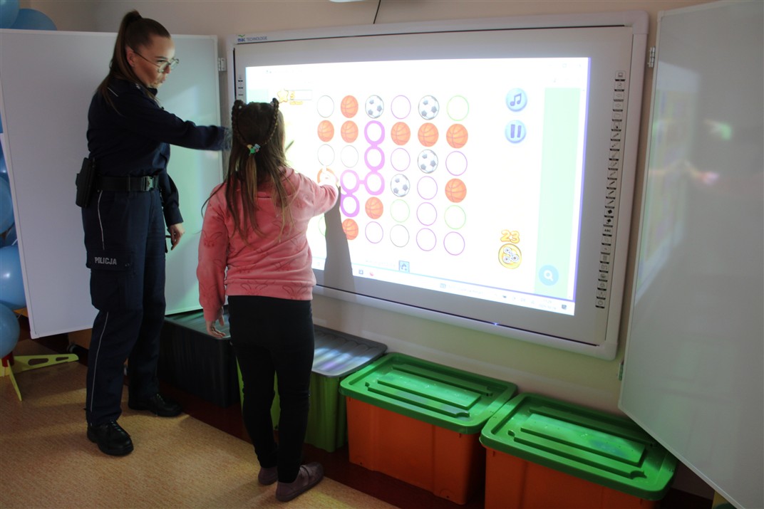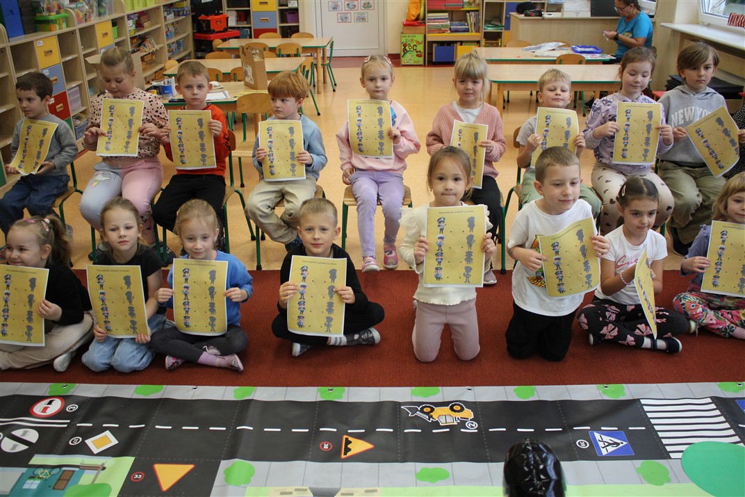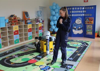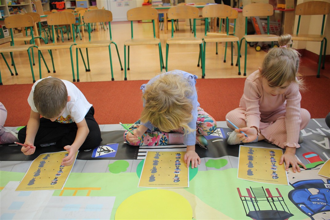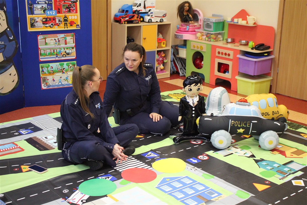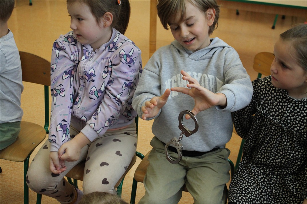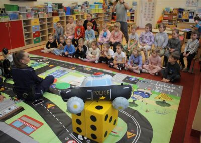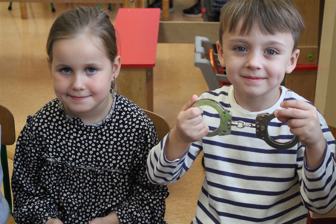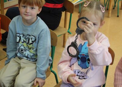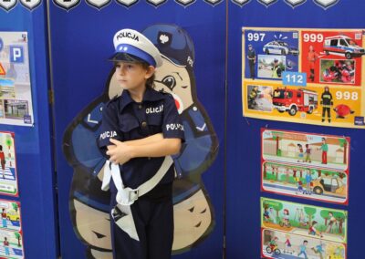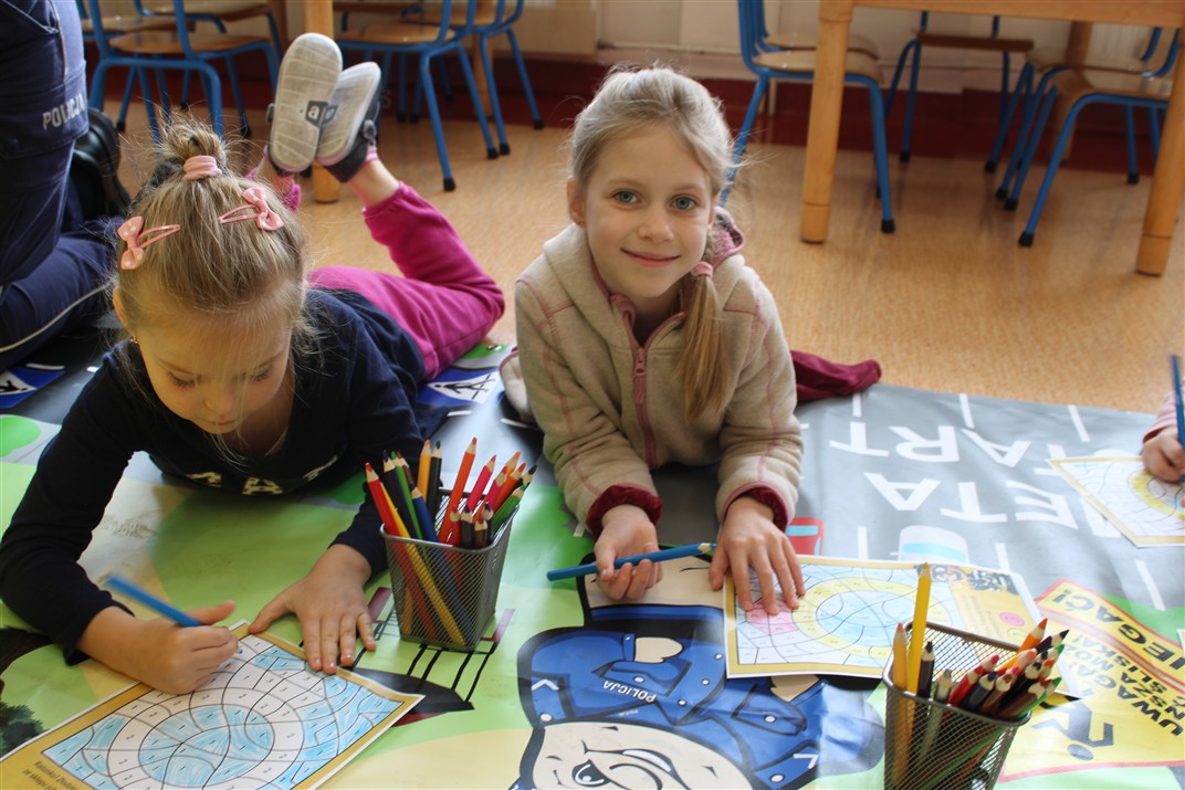 W dniu 16 października dzieci z grupy „Myszek” i „Biedronek” gościły przedstawicieli Komendy Powiatowej Policji w Chodzieży. Podczas spotkania dzieci wzbogaciły wiedzę na temat pracy policjantów, utrwaliły podstawowe zasady bezpiecznego poruszania się po chodniku i na przejściach dla pieszych. Na podstawie ciekawej zabawy zrozumiały także konieczność noszenia elementów odblaskowych. Wykorzystane przez gości rekwizyty, między innymi duża plansza z ulicami i przejściami dla pieszych oraz autka sprawiły, że dzieci z ochotą uczestniczyły w zabawach i nauce jednocześnie. Jednak największą atrakcją dla dzieci było spotkanie z gościem specjalnym, sierżantem Pyrkiem oraz gry edukacyjne z „Krainy Pyrka”. Kolejny raz przedszkolacy upewnili się, że policjant  jest osobą miłą, do której zawsze można zwrócić się o pomoc.