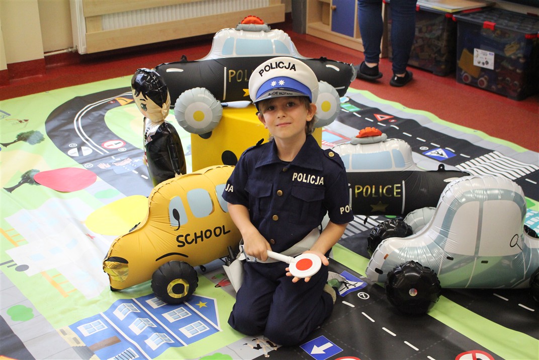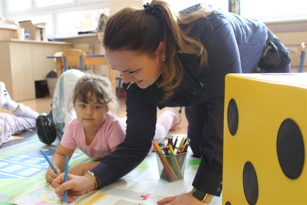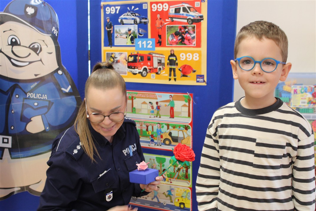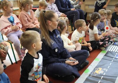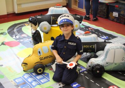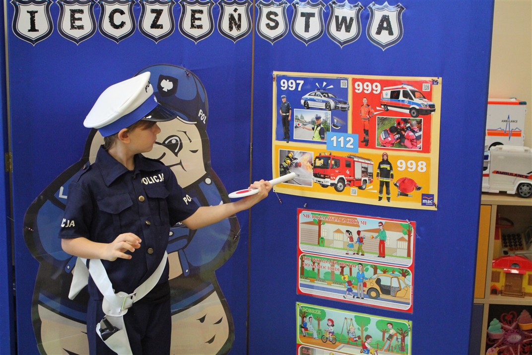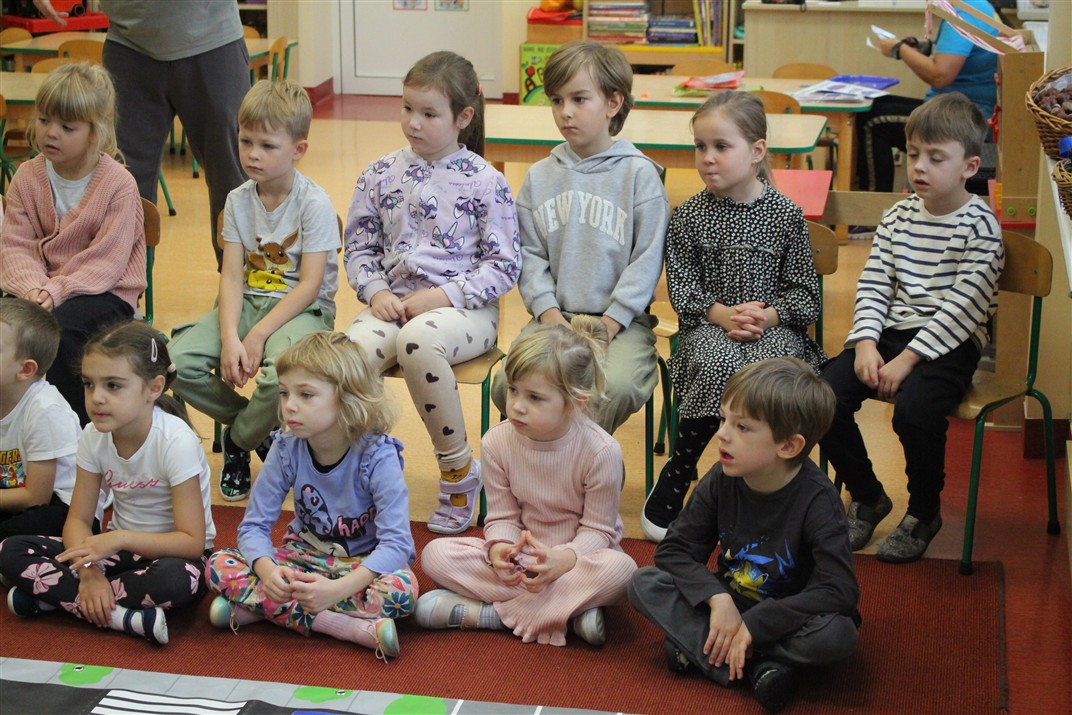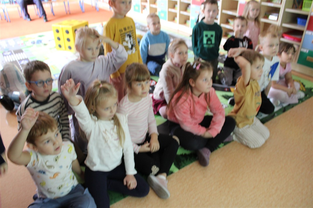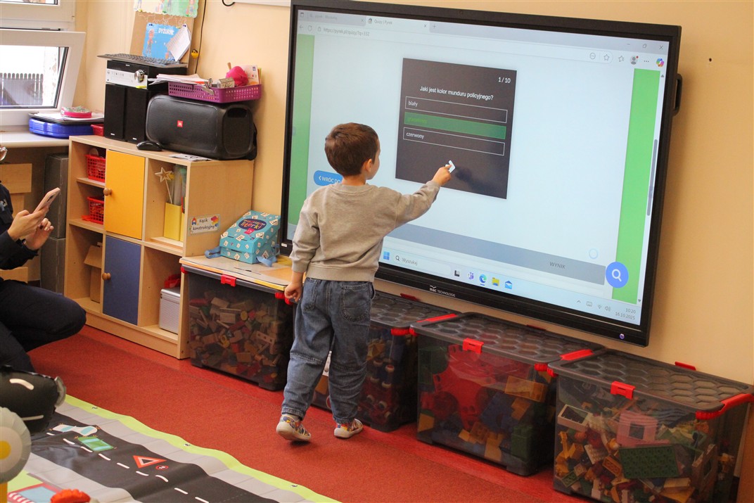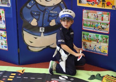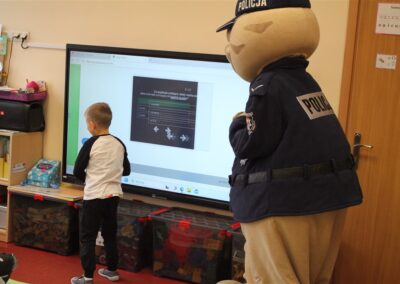 W dniu 16 października dzieci z grupy „Myszek” i „Biedronek” gościły przedstawicieli Komendy Powiatowej Policji w Chodzieży. Podczas spotkania dzieci wzbogaciły wiedzę na temat pracy policjantów, utrwaliły podstawowe zasady bezpiecznego poruszania się po chodniku i na przejściach dla pieszych. Na podstawie ciekawej zabawy zrozumiały także konieczność noszenia elementów odblaskowych. Wykorzystane przez gości rekwizyty, między innymi duża plansza z ulicami i przejściami dla pieszych oraz autka sprawiły, że dzieci z ochotą uczestniczyły w zabawach i nauce jednocześnie. Jednak największą atrakcją dla dzieci było spotkanie z gościem specjalnym, sierżantem Pyrkiem oraz gry edukacyjne z „Krainy Pyrka”. Kolejny raz przedszkolacy upewnili się, że policjant  jest osobą miłą, do której zawsze można zwrócić się o pomoc.