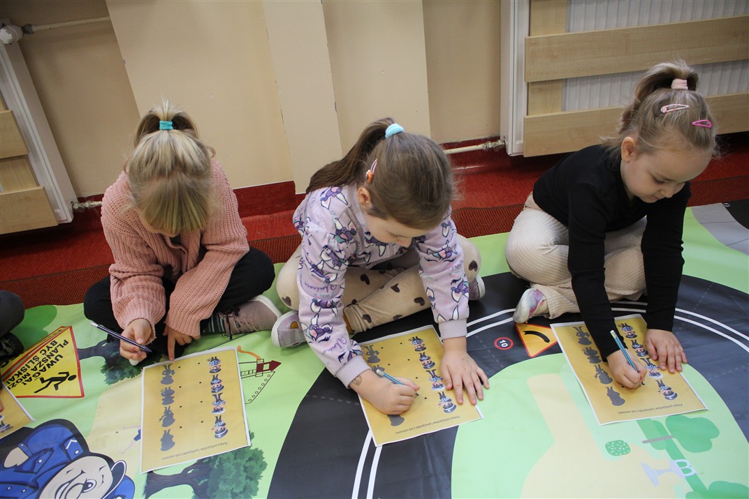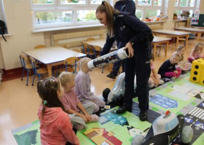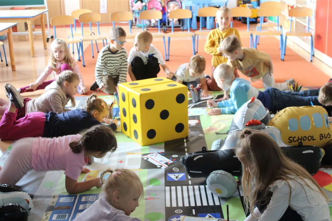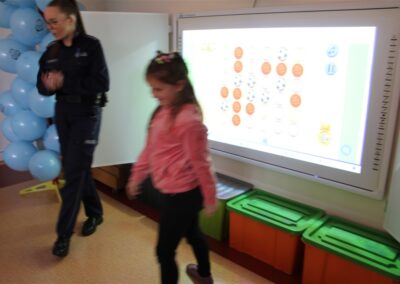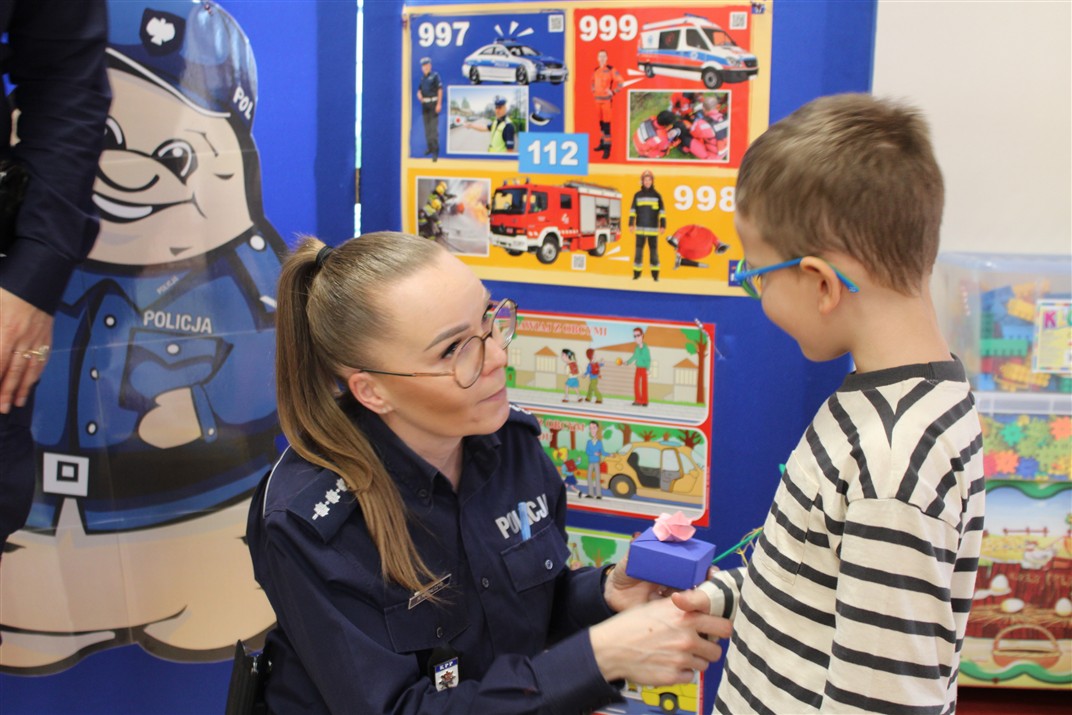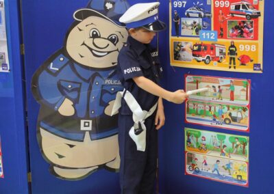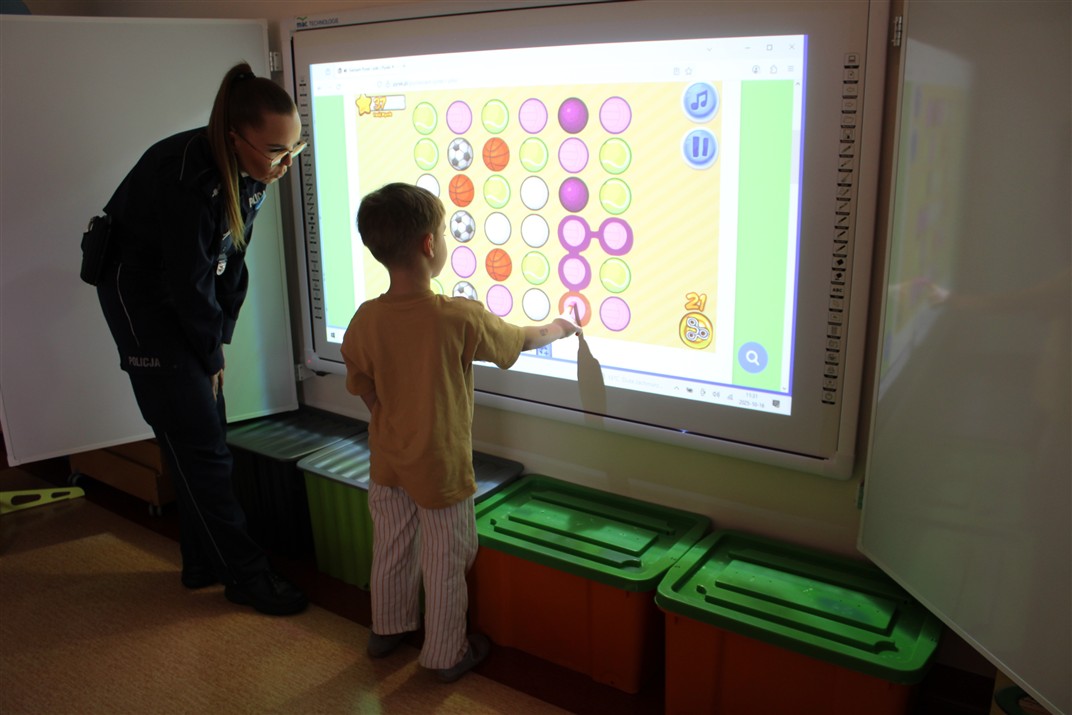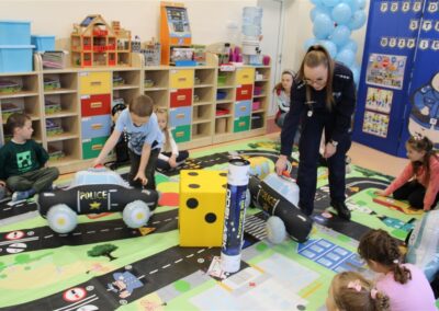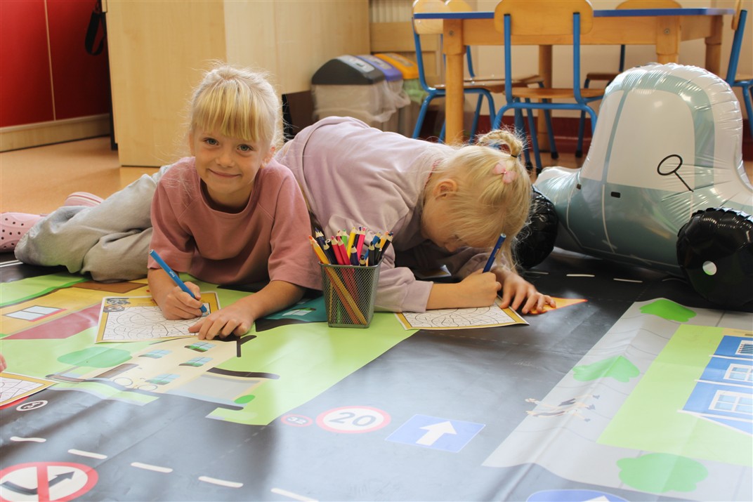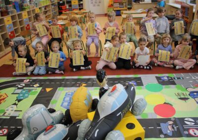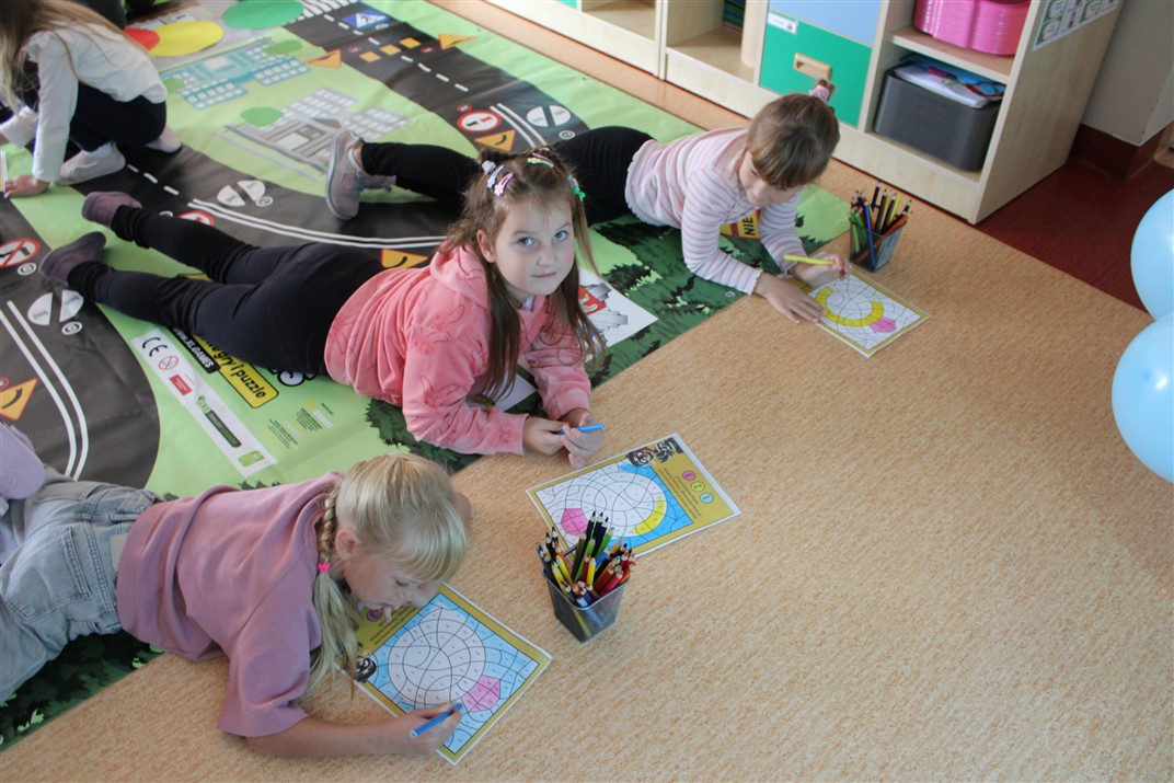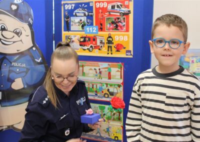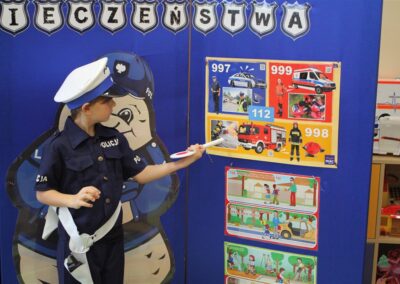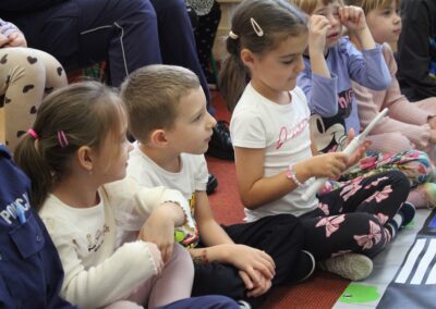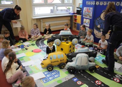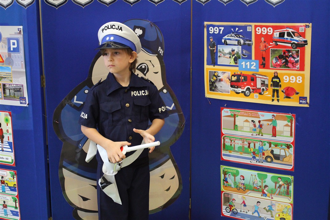 W dniu 16 października dzieci z grupy „Myszek” i „Biedronek” gościły przedstawicieli Komendy Powiatowej Policji w Chodzieży. Podczas spotkania dzieci wzbogaciły wiedzę na temat pracy policjantów, utrwaliły podstawowe zasady bezpiecznego poruszania się po chodniku i na przejściach dla pieszych. Na podstawie ciekawej zabawy zrozumiały także konieczność noszenia elementów odblaskowych. Wykorzystane przez gości rekwizyty, między innymi duża plansza z ulicami i przejściami dla pieszych oraz autka sprawiły, że dzieci z ochotą uczestniczyły w zabawach i nauce jednocześnie. Jednak największą atrakcją dla dzieci było spotkanie z gościem specjalnym, sierżantem Pyrkiem oraz gry edukacyjne z „Krainy Pyrka”. Kolejny raz przedszkolacy upewnili się, że policjant  jest osobą miłą, do której zawsze można zwrócić się o pomoc.