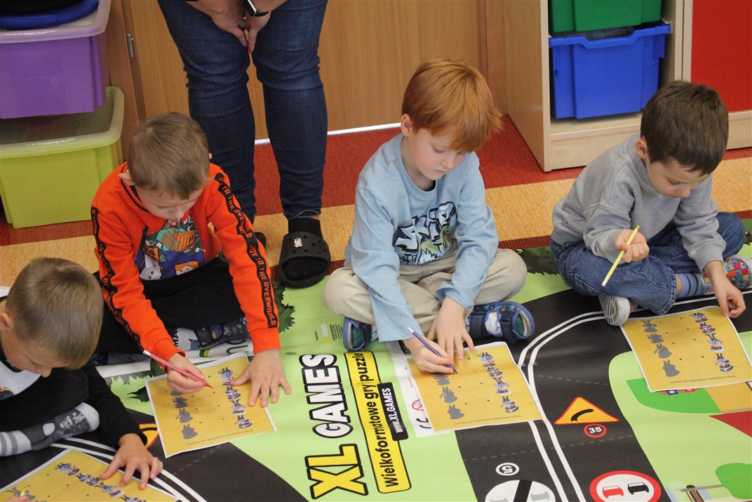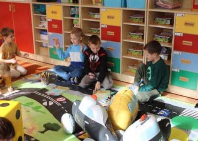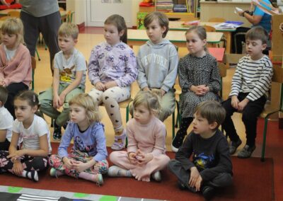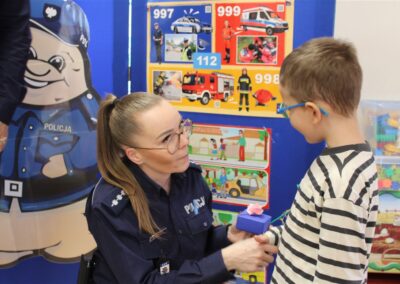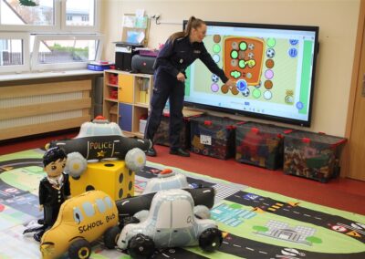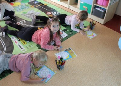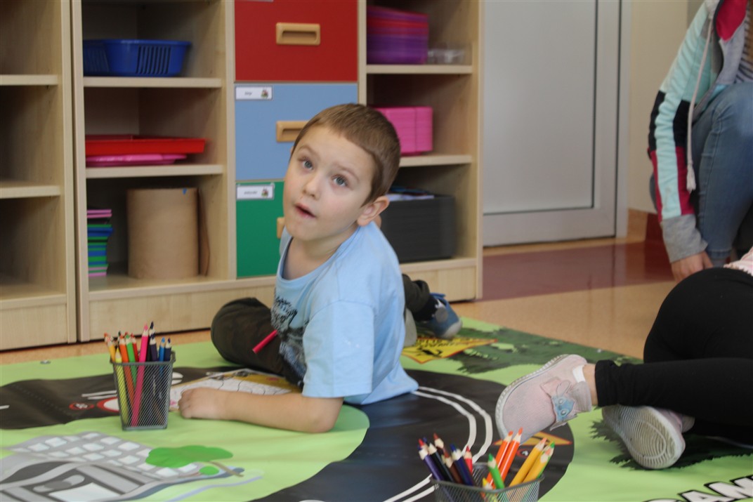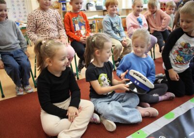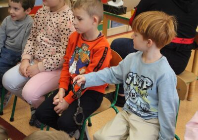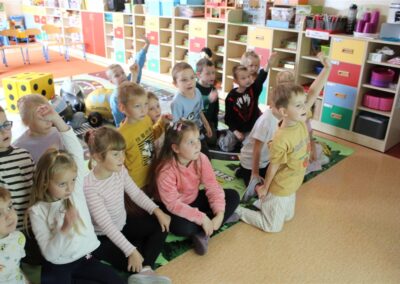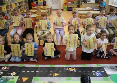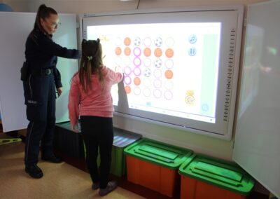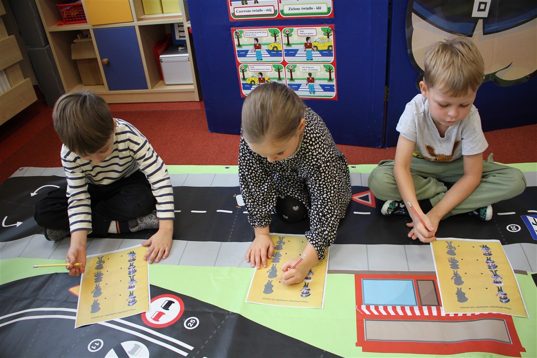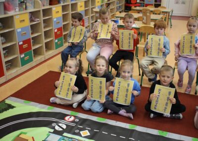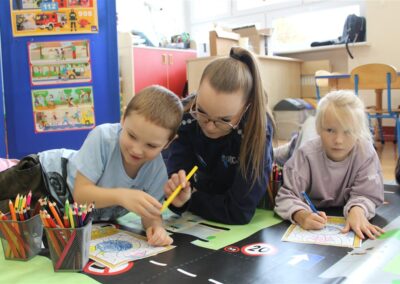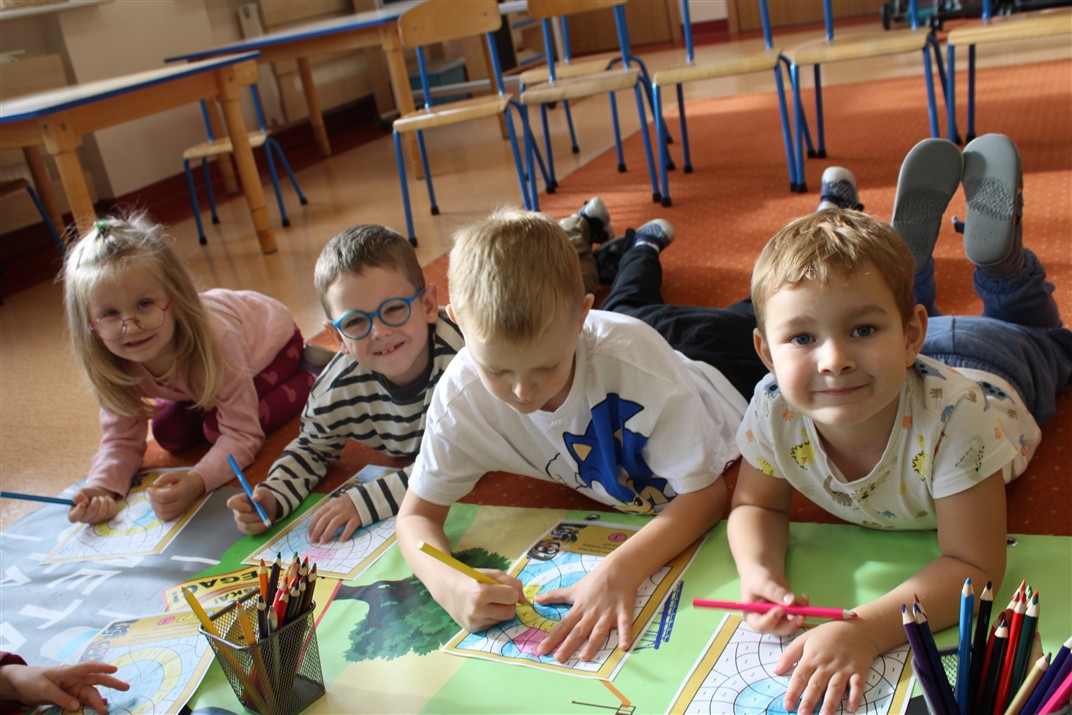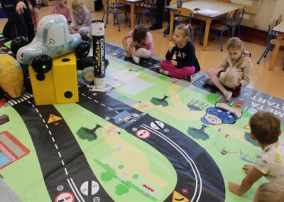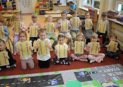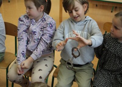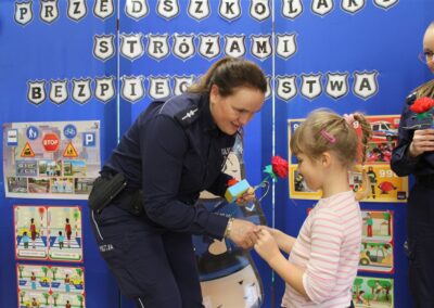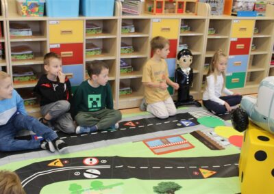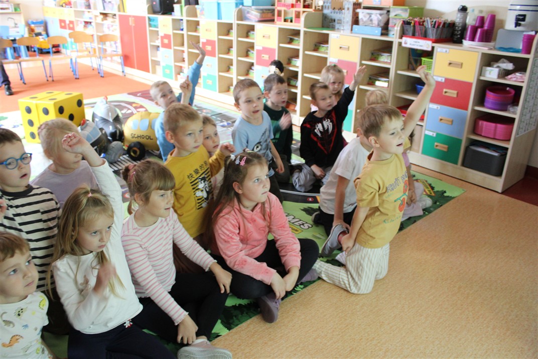 W dniu 16 października dzieci z grupy „Myszek” i „Biedronek” gościły przedstawicieli Komendy Powiatowej Policji w Chodzieży. Podczas spotkania dzieci wzbogaciły wiedzę na temat pracy policjantów, utrwaliły podstawowe zasady bezpiecznego poruszania się po chodniku i na przejściach dla pieszych. Na podstawie ciekawej zabawy zrozumiały także konieczność noszenia elementów odblaskowych. Wykorzystane przez gości rekwizyty, między innymi duża plansza z ulicami i przejściami dla pieszych oraz autka sprawiły, że dzieci z ochotą uczestniczyły w zabawach i nauce jednocześnie. Jednak największą atrakcją dla dzieci było spotkanie z gościem specjalnym, sierżantem Pyrkiem oraz gry edukacyjne z „Krainy Pyrka”. Kolejny raz przedszkolacy upewnili się, że policjant  jest osobą miłą, do której zawsze można zwrócić się o pomoc.