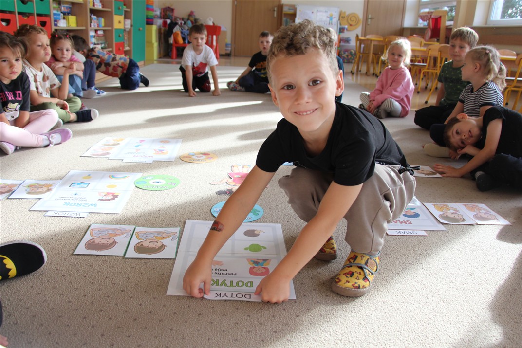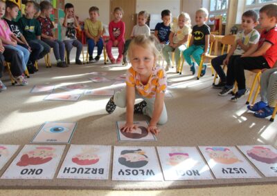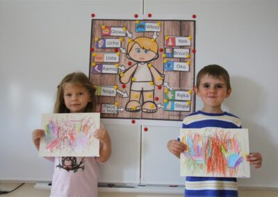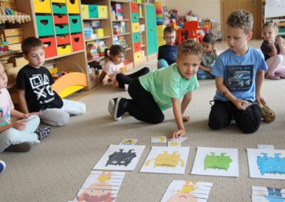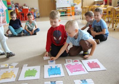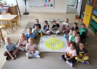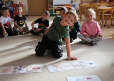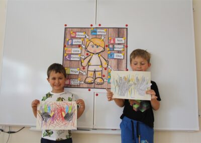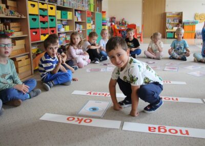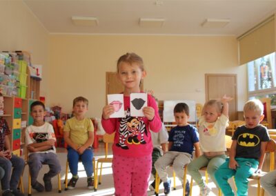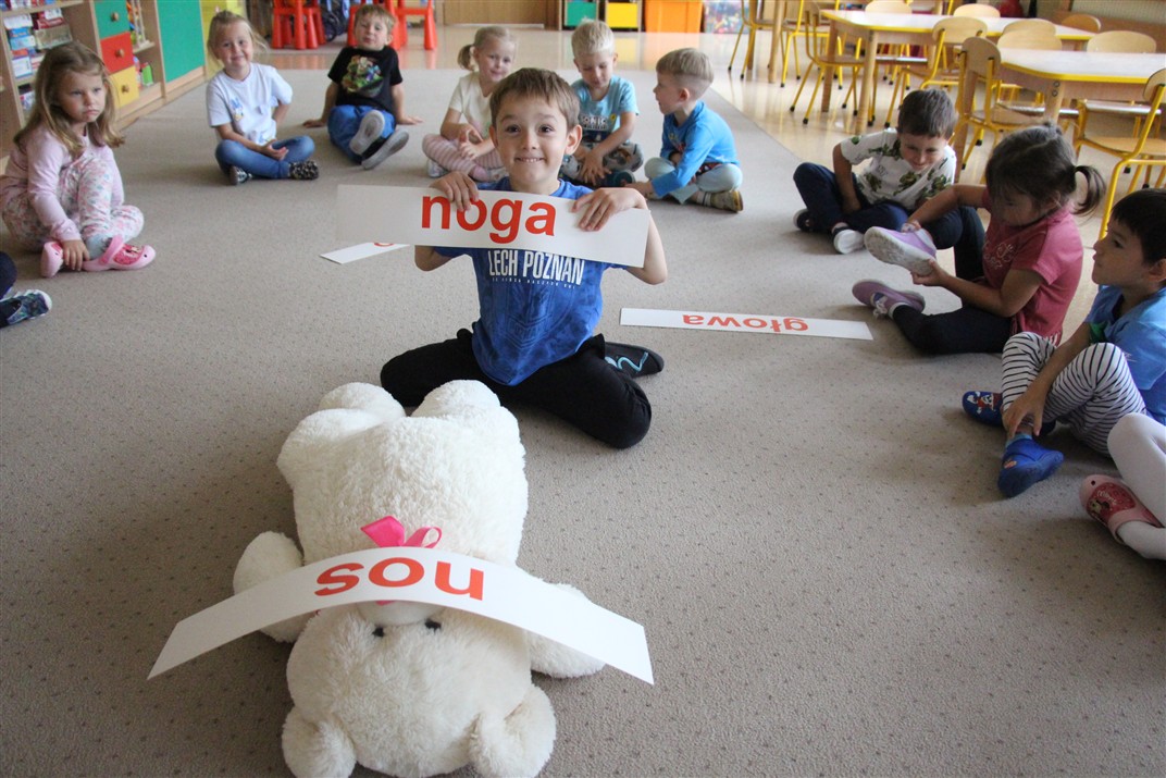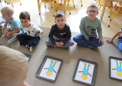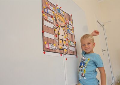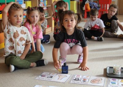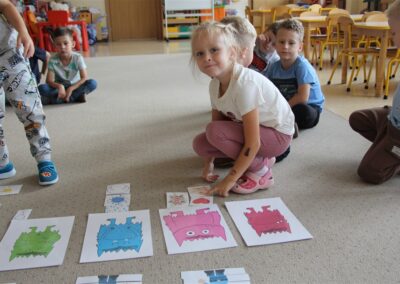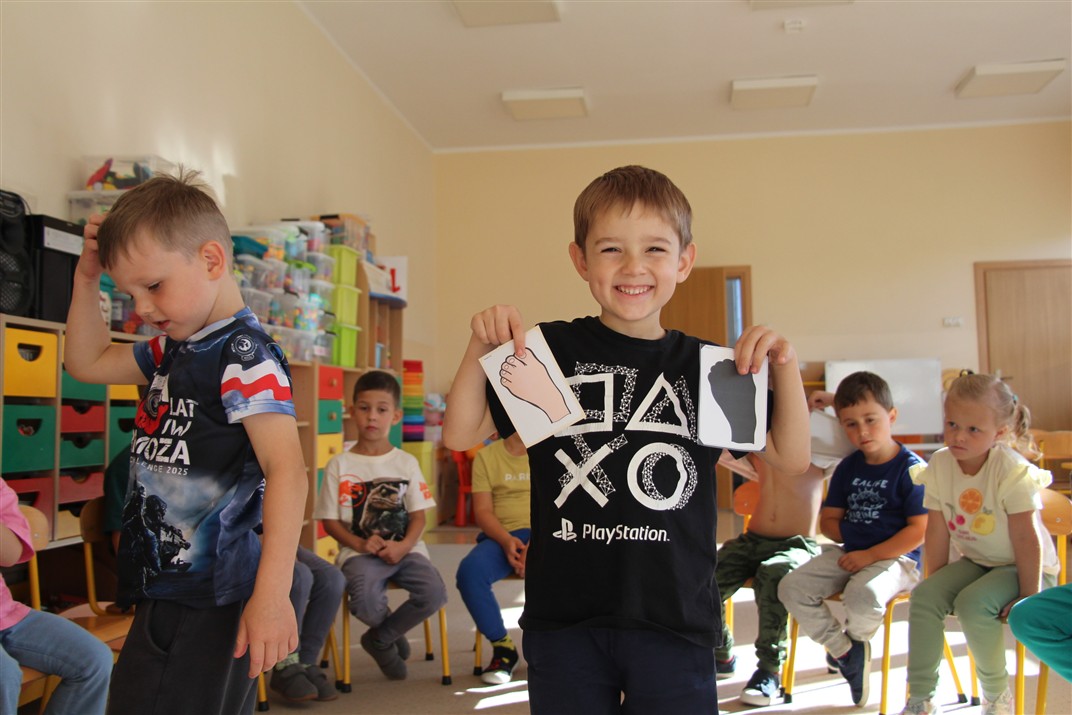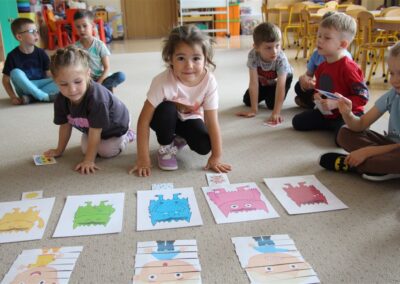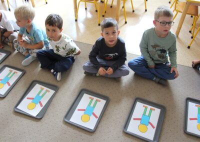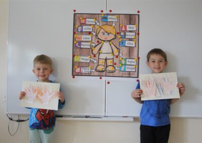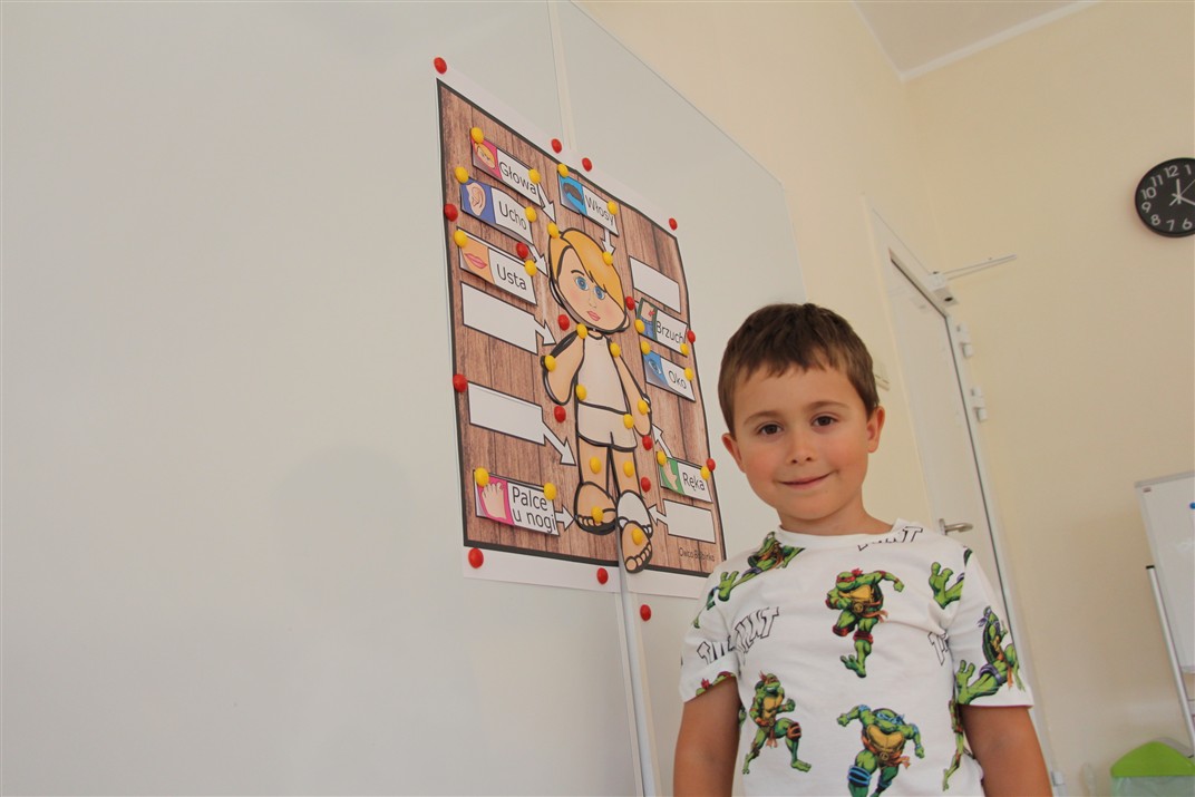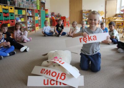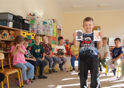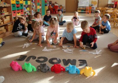 W minionym tygodniu 15-19 września, dzieci z grupy Motyli odkrywały swoje supermoce, a dokładniej swoje ciało, zmysły i emocje. Podczas codziennych zajęć i zabaw, poznaliśmy części ciała, których nazwy utrwalaliśmy z wykorzystaniem metody Globalnego Czytania Domanna. Rozwijaliśmy umiejętności orientacji w schemacie ciała oraz utrwalaliśmy figury geometryczne podczas zabaw matematycznych. Wykonaliśmy pracę plastyczną „nasze rączki” z wykorzystaniem elementów metody Edukacji przez Ruch. Poznawaliśmy nasze zmysły podczas zabaw badawczo-sensorycznych. Poznaliśmy również podstawowe emocje towarzyszące nam codziennie z pomocą powieści „Kolorowy potwór” oraz zabaw z tym związanych. Nie zabrakło zabaw ruchowych oraz kodowania na dywanie z matą i kolorowymi kubeczkami.