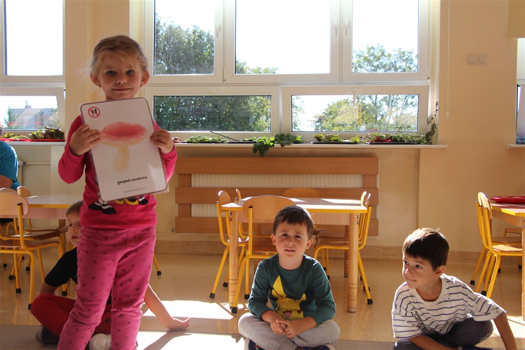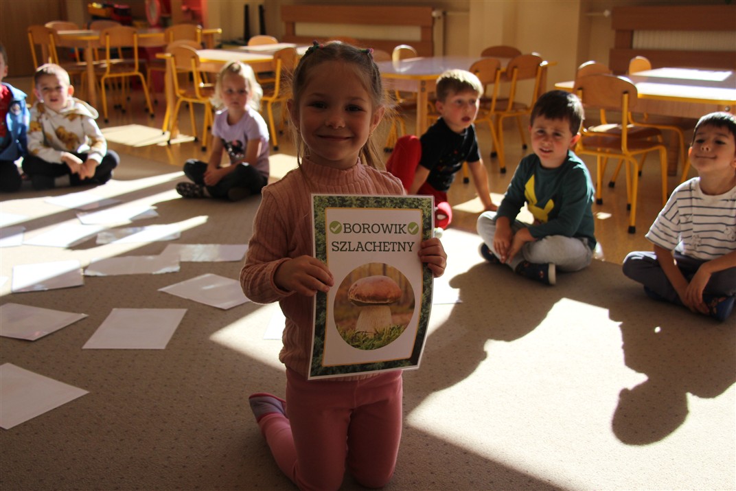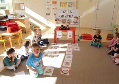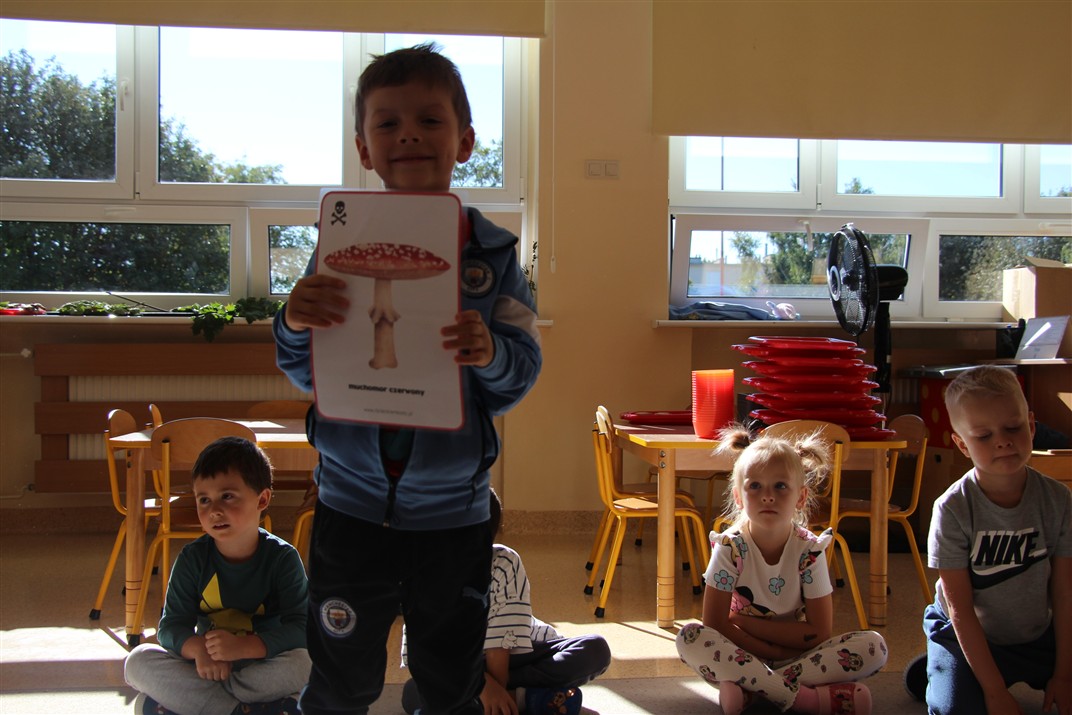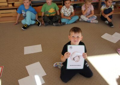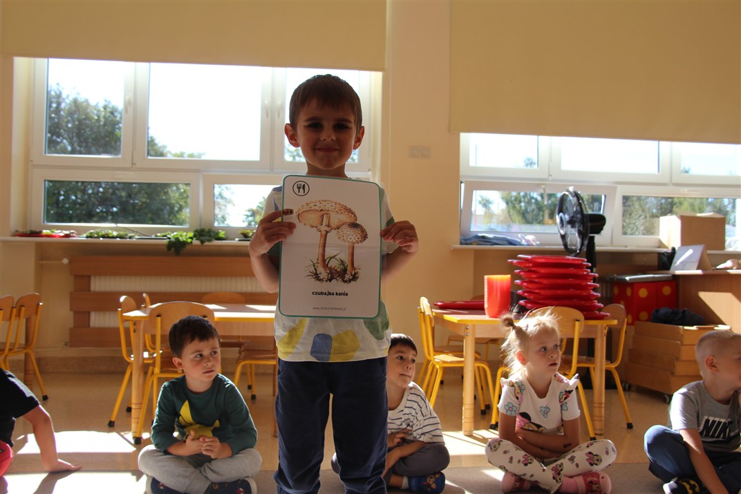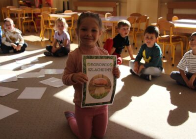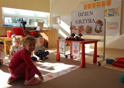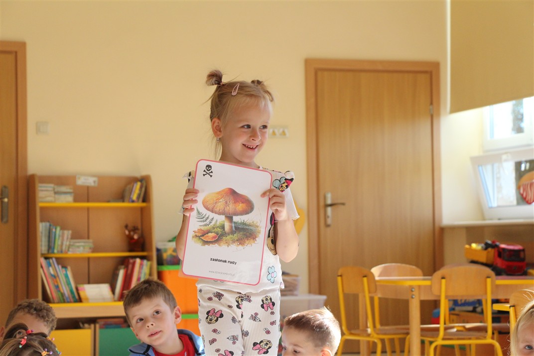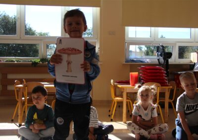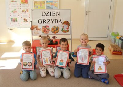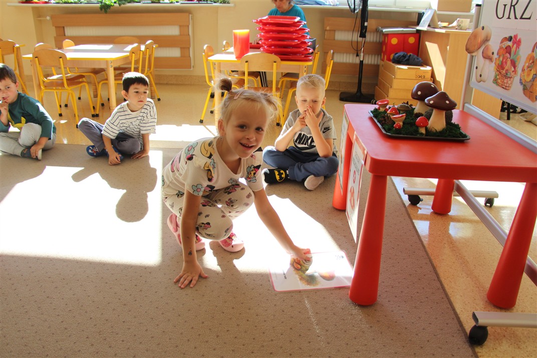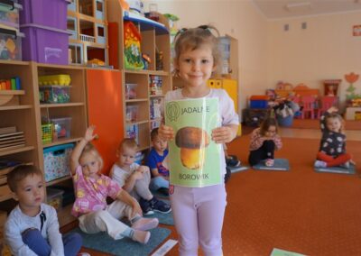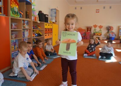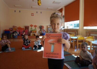 Przedszkolaki wzięły udział w ciekawych zajęciach, podczas których, rozpoznawały różne gatunki grzybów – jadalnych i niejadalnych, dowiedziały się, dlaczego nie wszystkie grzyby można zbierać, układały tematyczne zagadki i wierszyki, bawiły się w rytmie piosenek o jesieni i lesie.