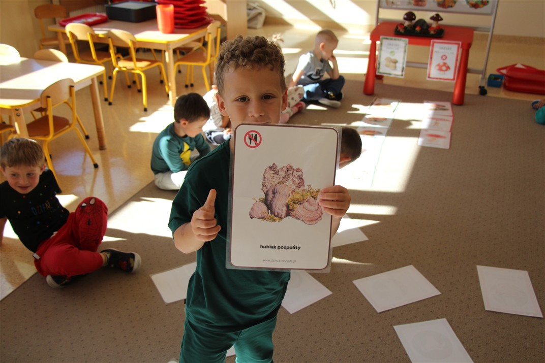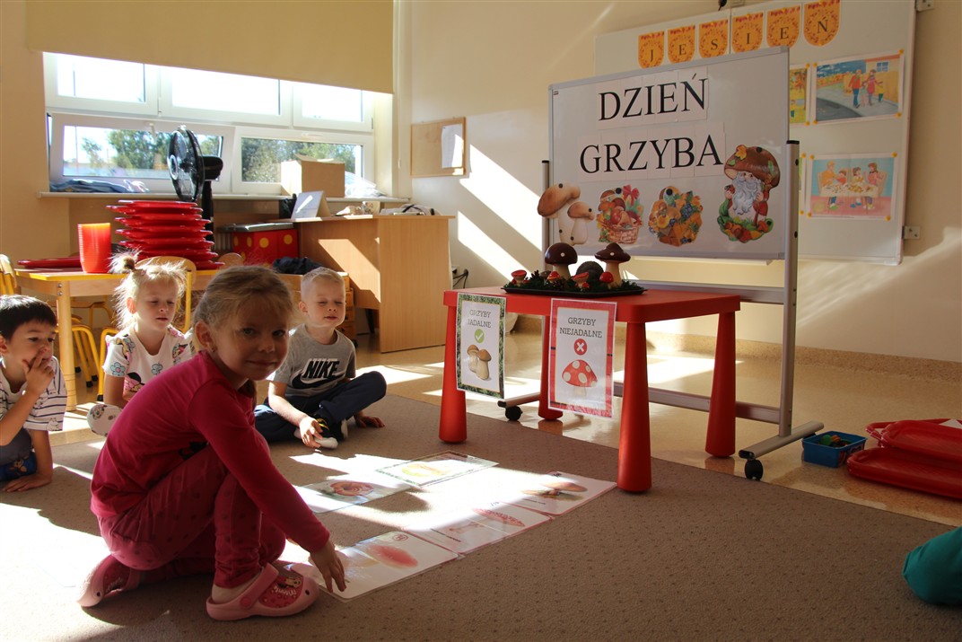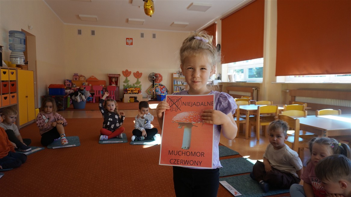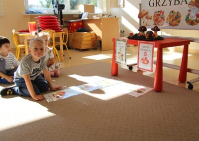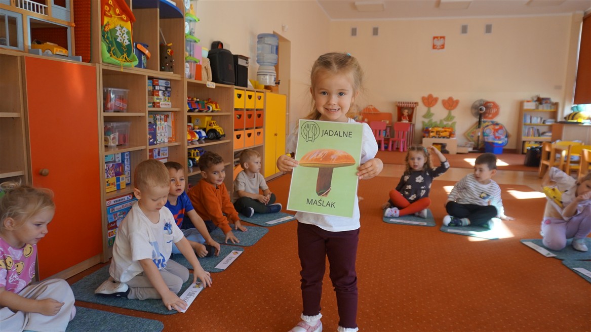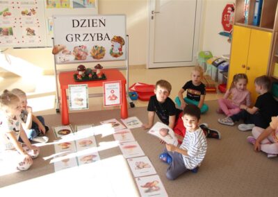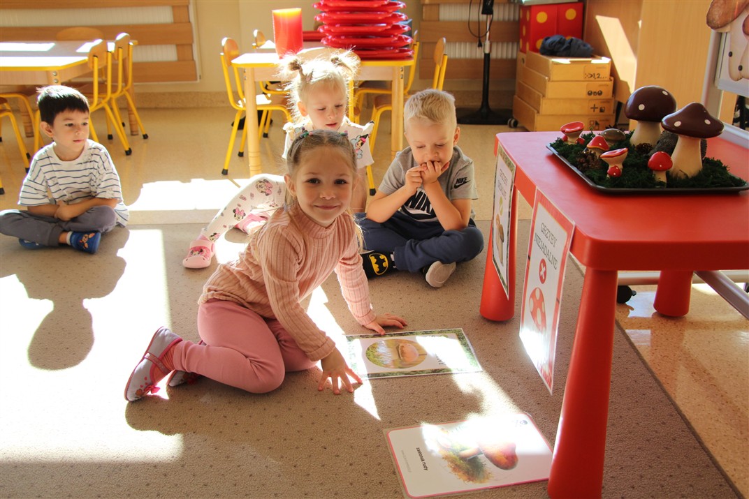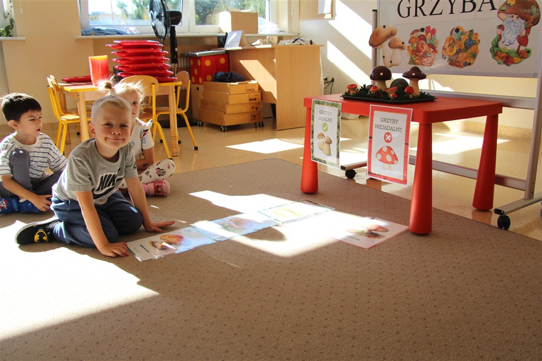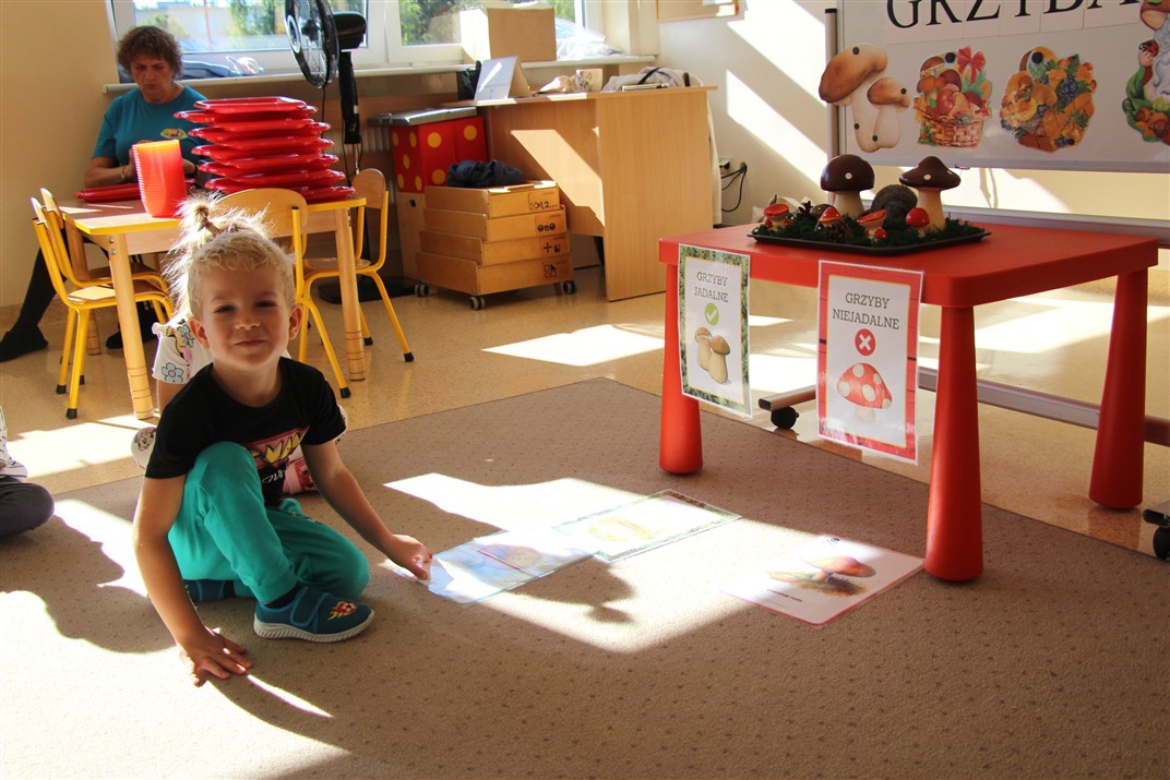 Przedszkolaki wzięły udział w ciekawych zajęciach, podczas których, rozpoznawały różne gatunki grzybów – jadalnych i niejadalnych, dowiedziały się, dlaczego nie wszystkie grzyby można zbierać, układały tematyczne zagadki i wierszyki, bawiły się w rytmie piosenek o jesieni i lesie.