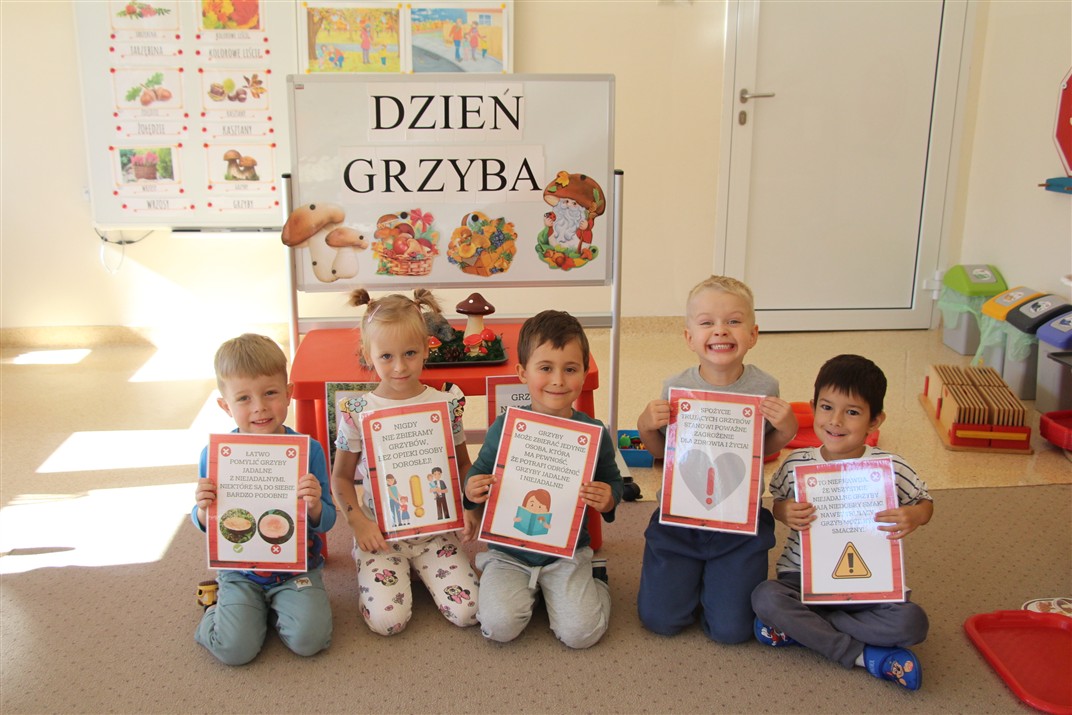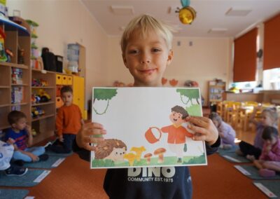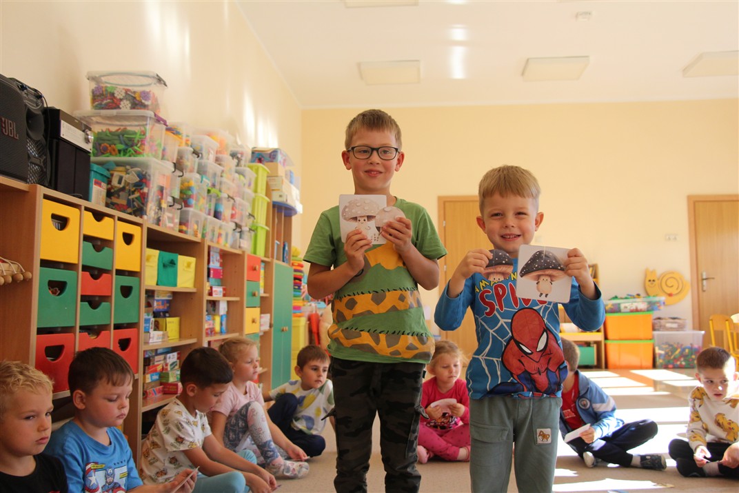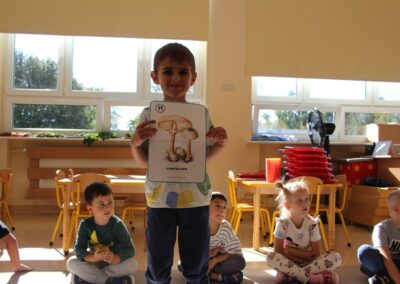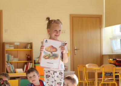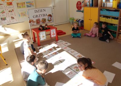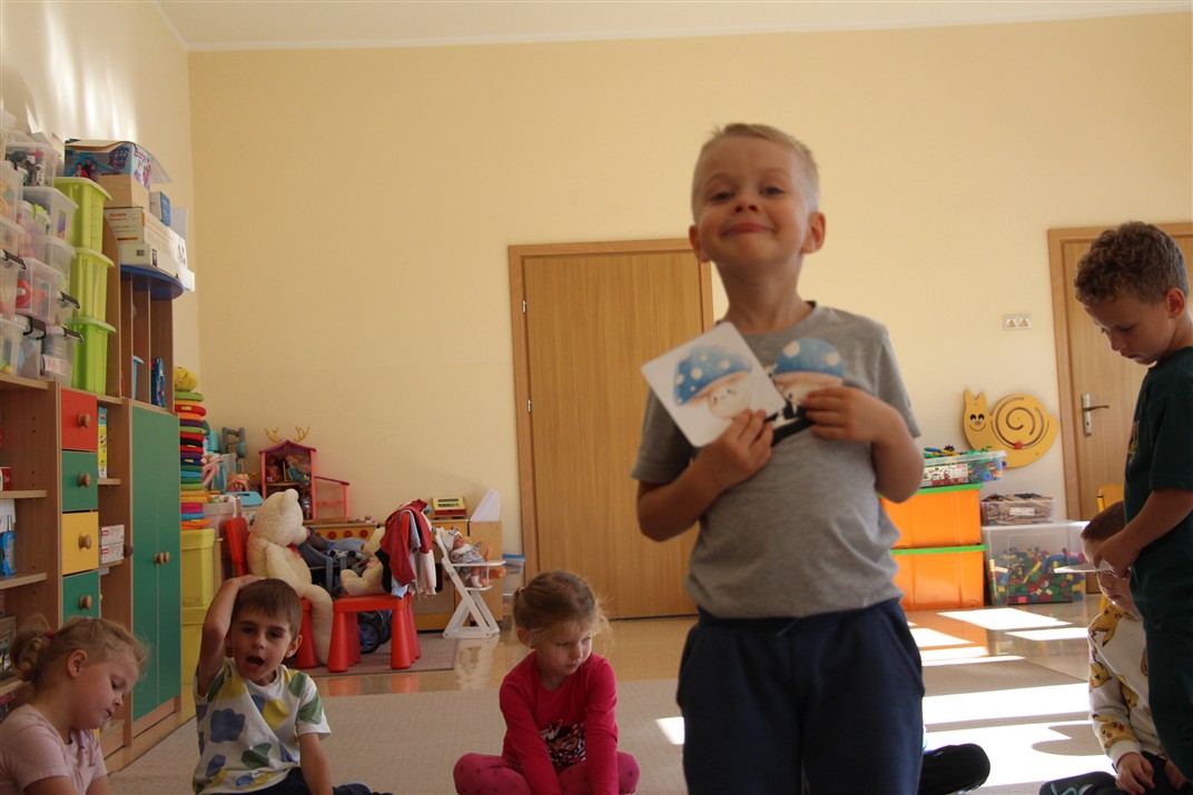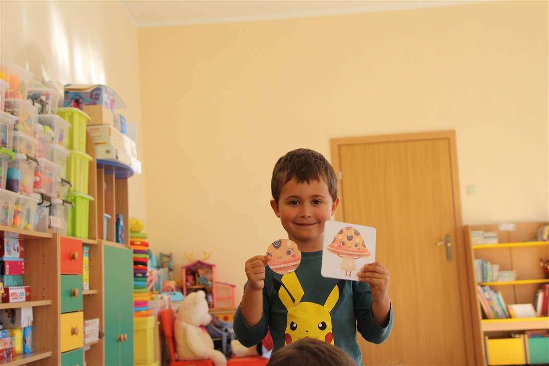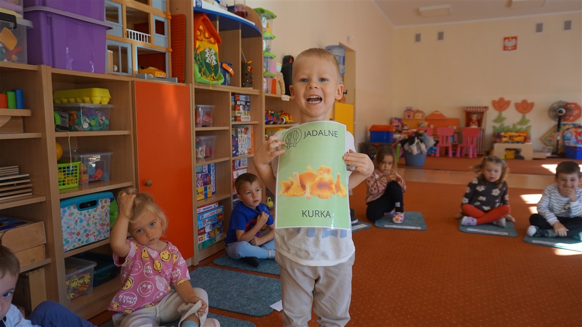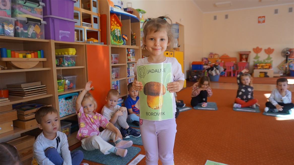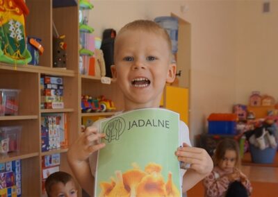 Przedszkolaki wzięły udział w ciekawych zajęciach, podczas których, rozpoznawały różne gatunki grzybów – jadalnych i niejadalnych, dowiedziały się, dlaczego nie wszystkie grzyby można zbierać, układały tematyczne zagadki i wierszyki, bawiły się w rytmie piosenek o jesieni i lesie.