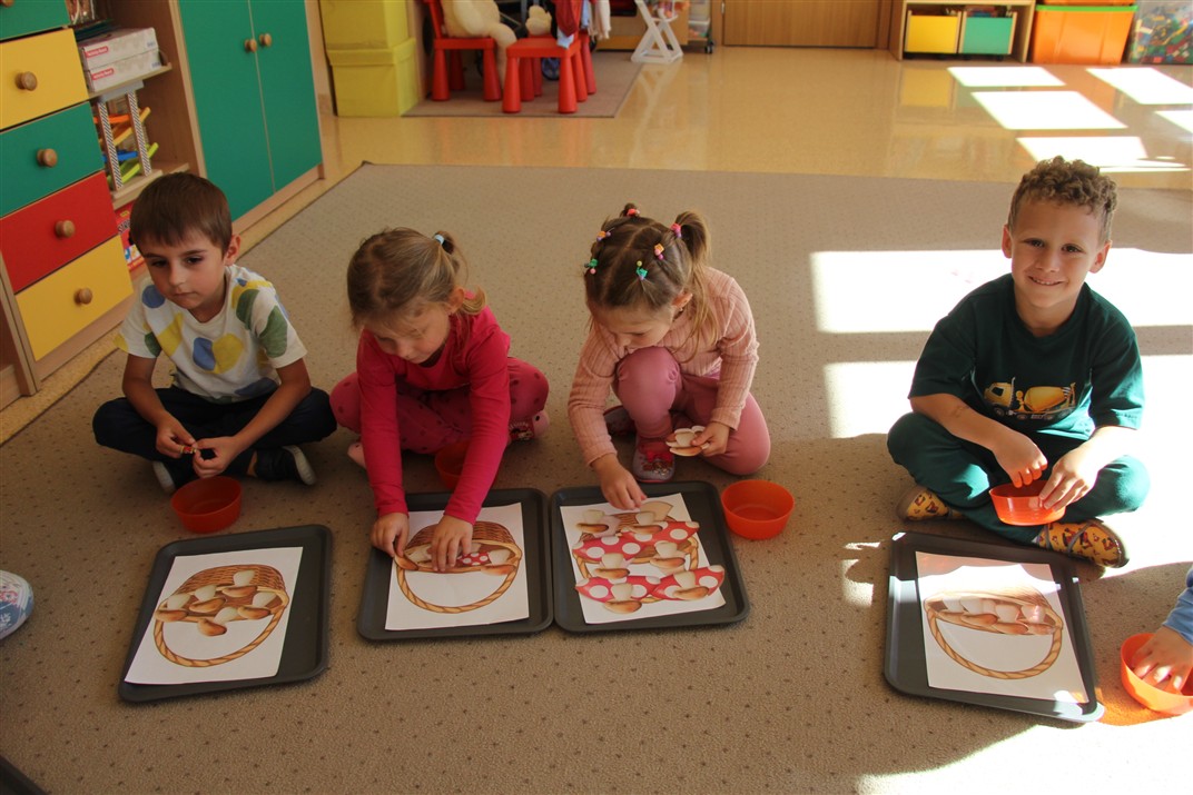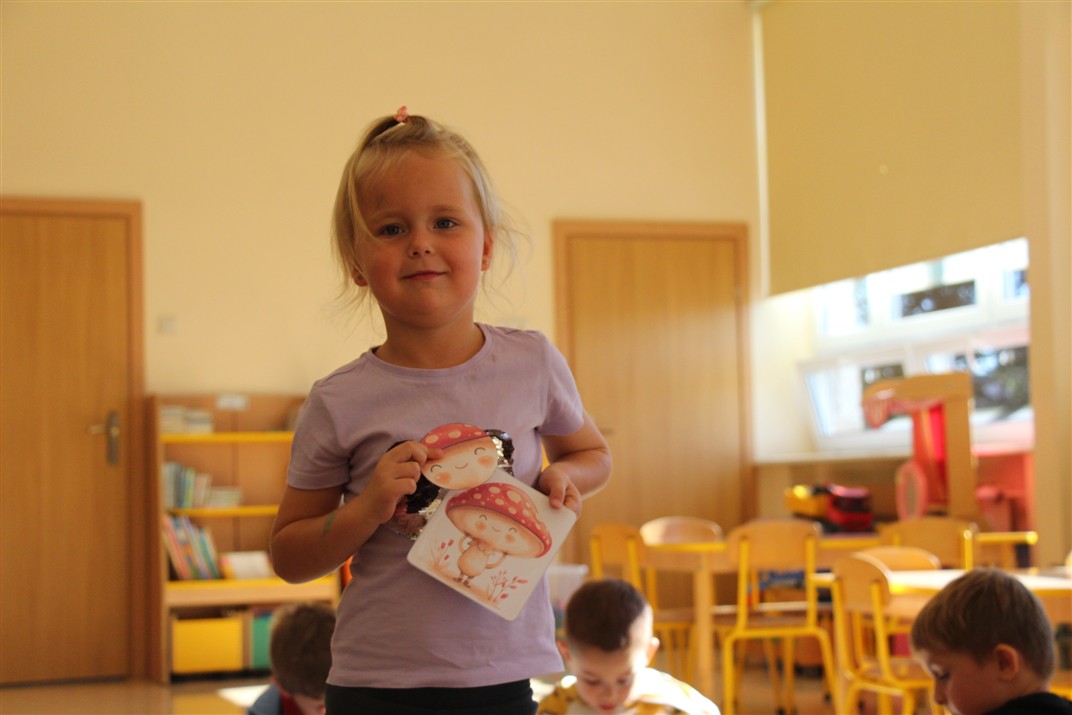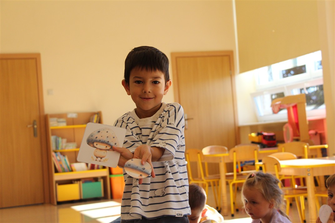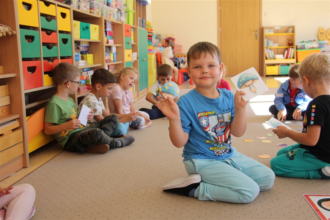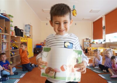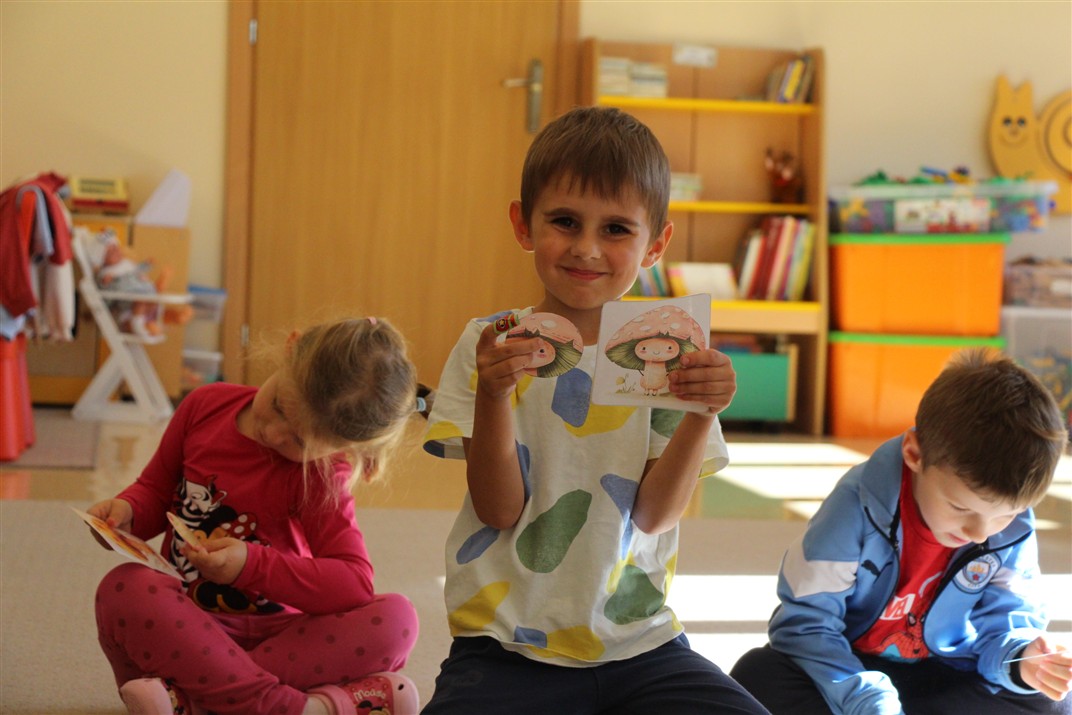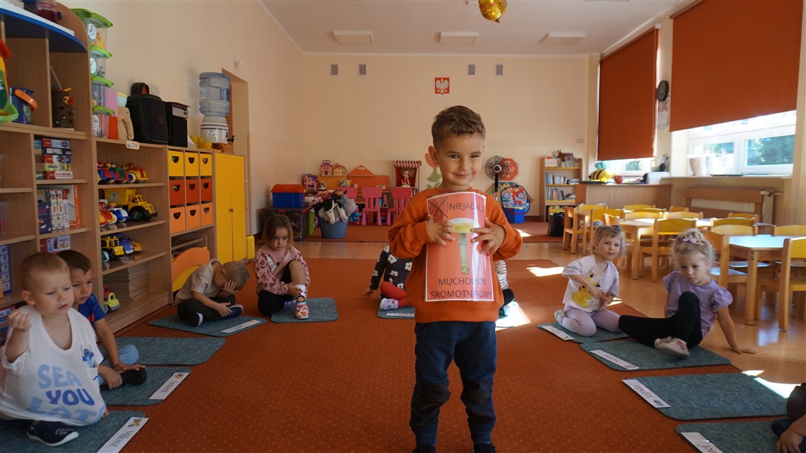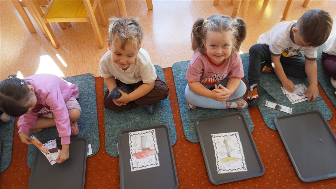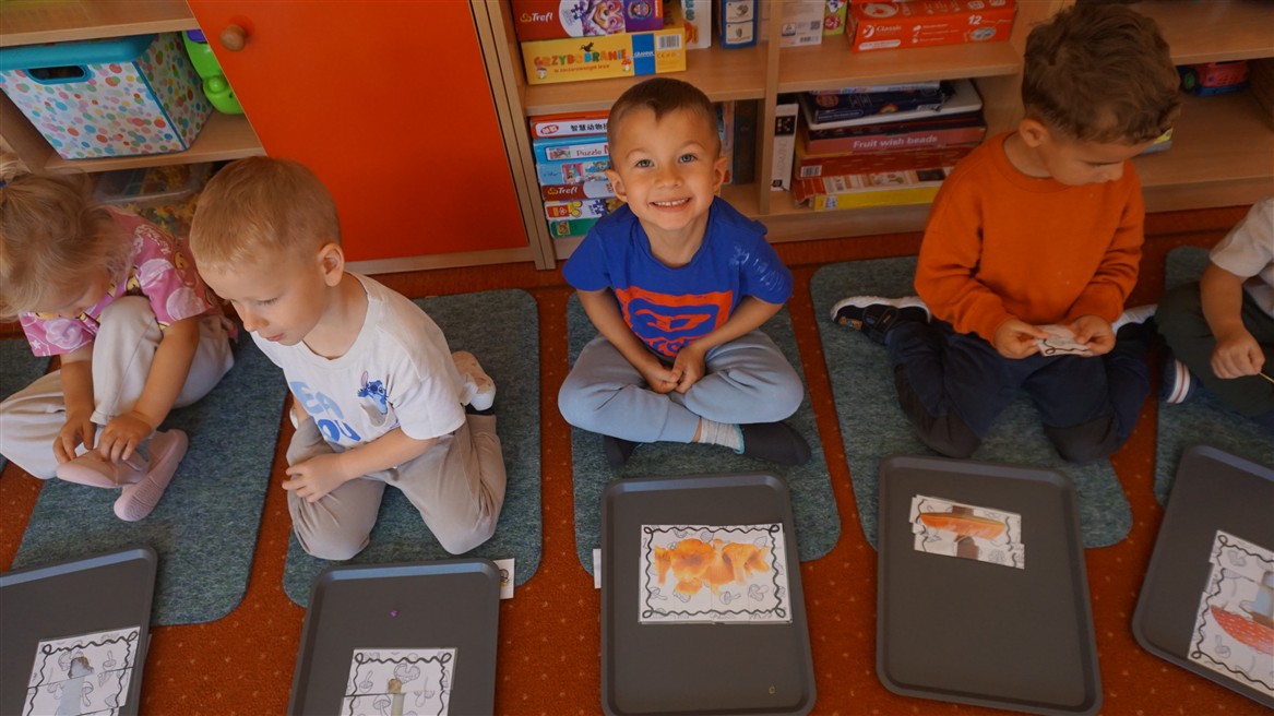 Przedszkolaki wzięły udział w ciekawych zajęciach, podczas których, rozpoznawały różne gatunki grzybów – jadalnych i niejadalnych, dowiedziały się, dlaczego nie wszystkie grzyby można zbierać, układały tematyczne zagadki i wierszyki, bawiły się w rytmie piosenek o jesieni i lesie.