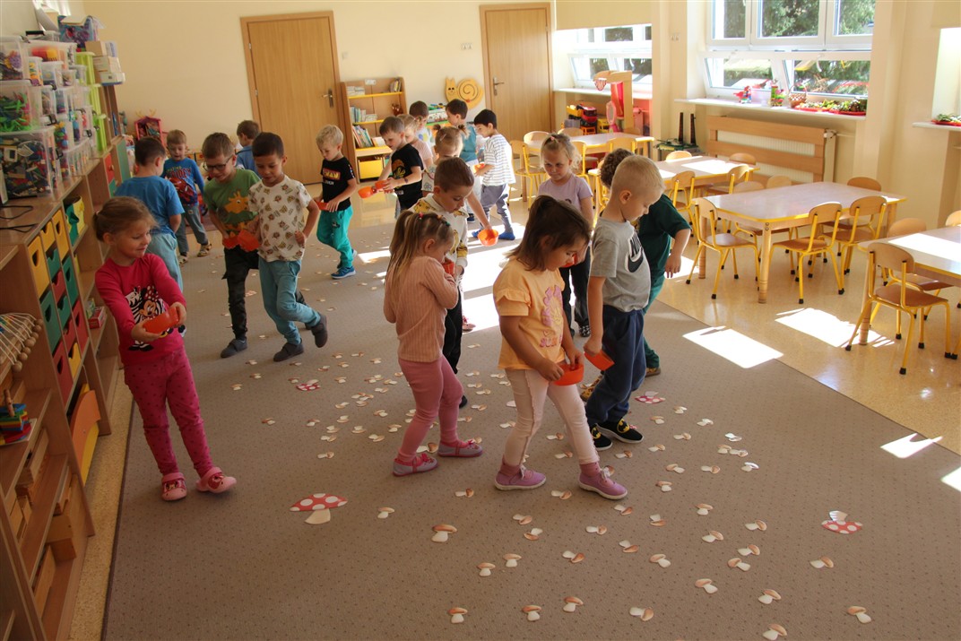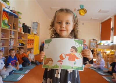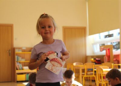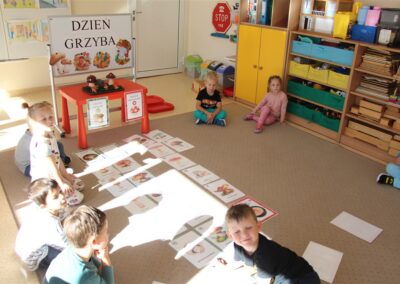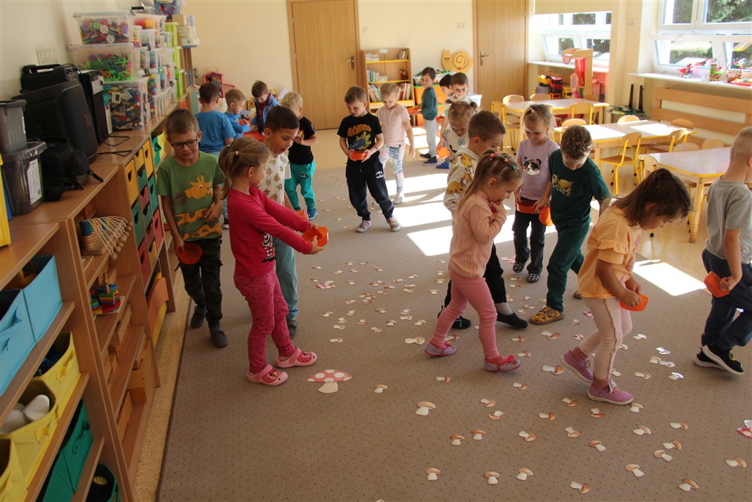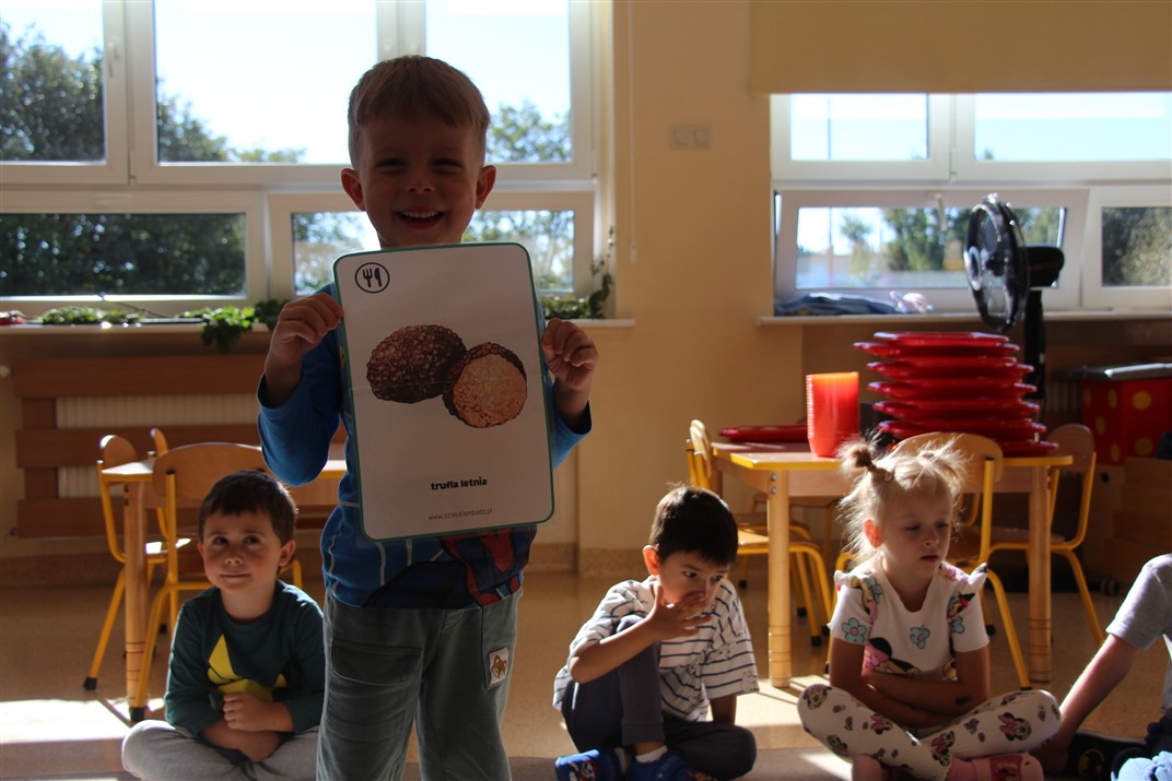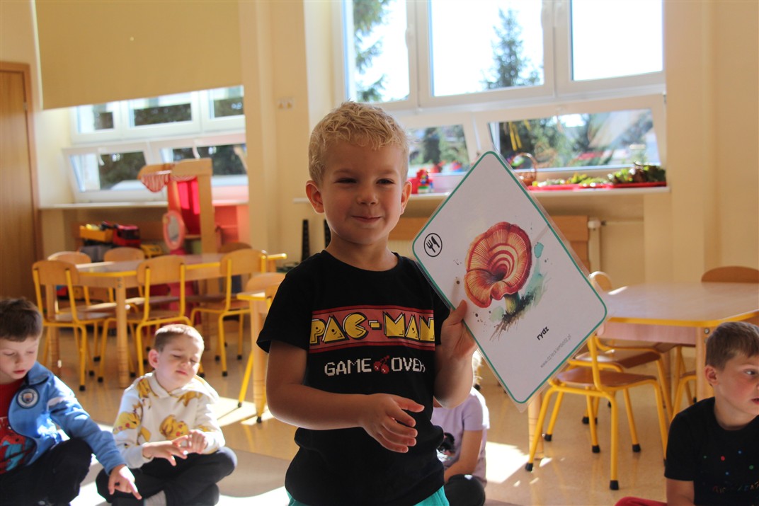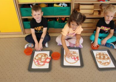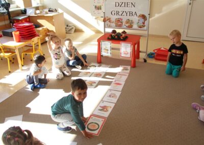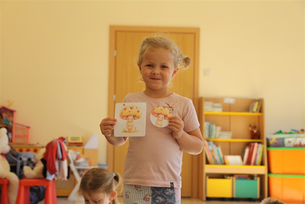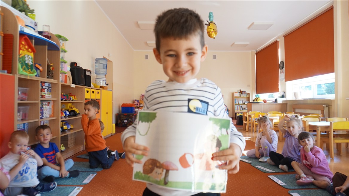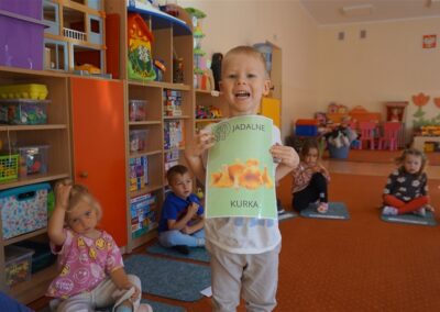 Przedszkolaki wzięły udział w ciekawych zajęciach, podczas których, rozpoznawały różne gatunki grzybów – jadalnych i niejadalnych, dowiedziały się, dlaczego nie wszystkie grzyby można zbierać, układały tematyczne zagadki i wierszyki, bawiły się w rytmie piosenek o jesieni i lesie.