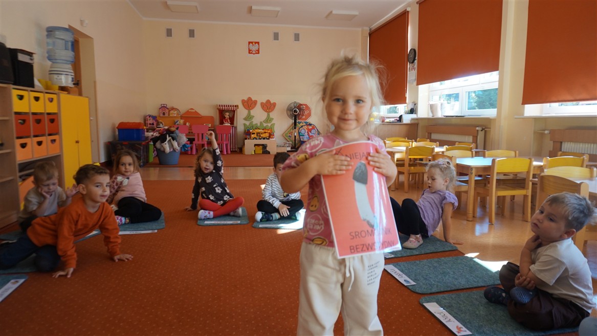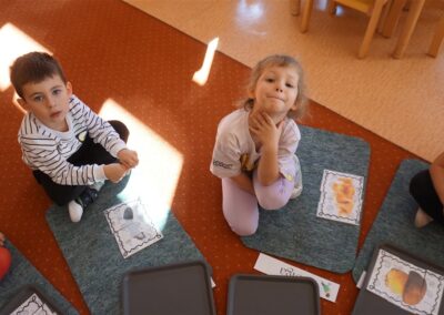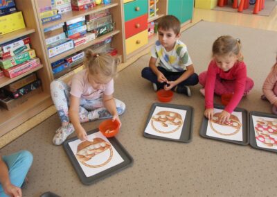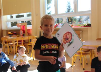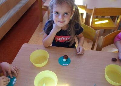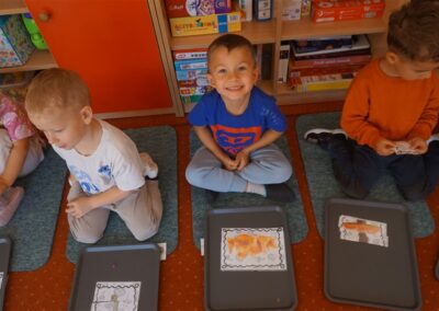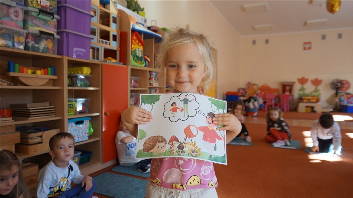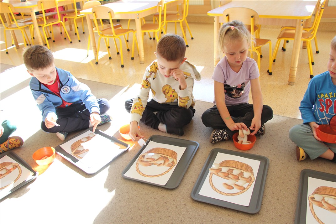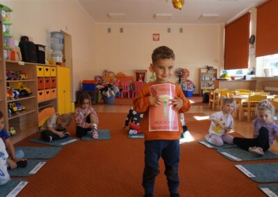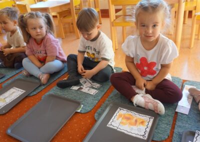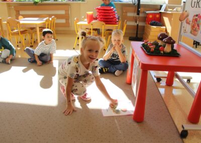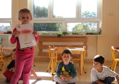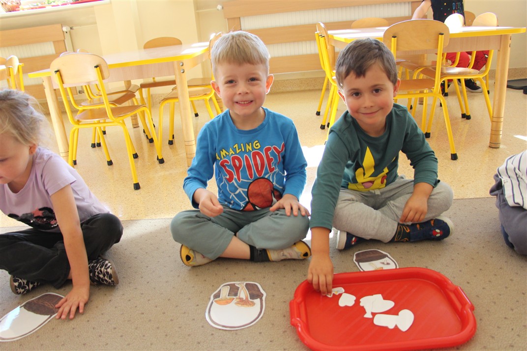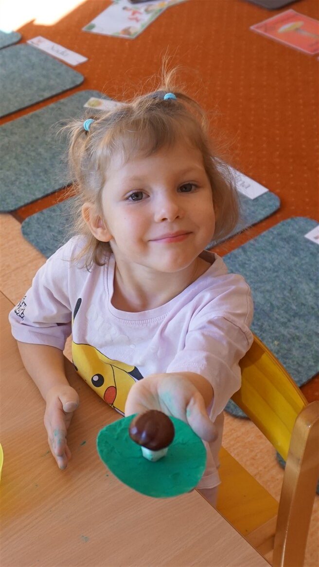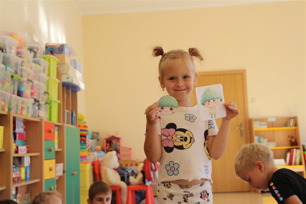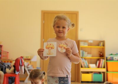 Przedszkolaki wzięły udział w ciekawych zajęciach, podczas których, rozpoznawały różne gatunki grzybów – jadalnych i niejadalnych, dowiedziały się, dlaczego nie wszystkie grzyby można zbierać, układały tematyczne zagadki i wierszyki, bawiły się w rytmie piosenek o jesieni i lesie.